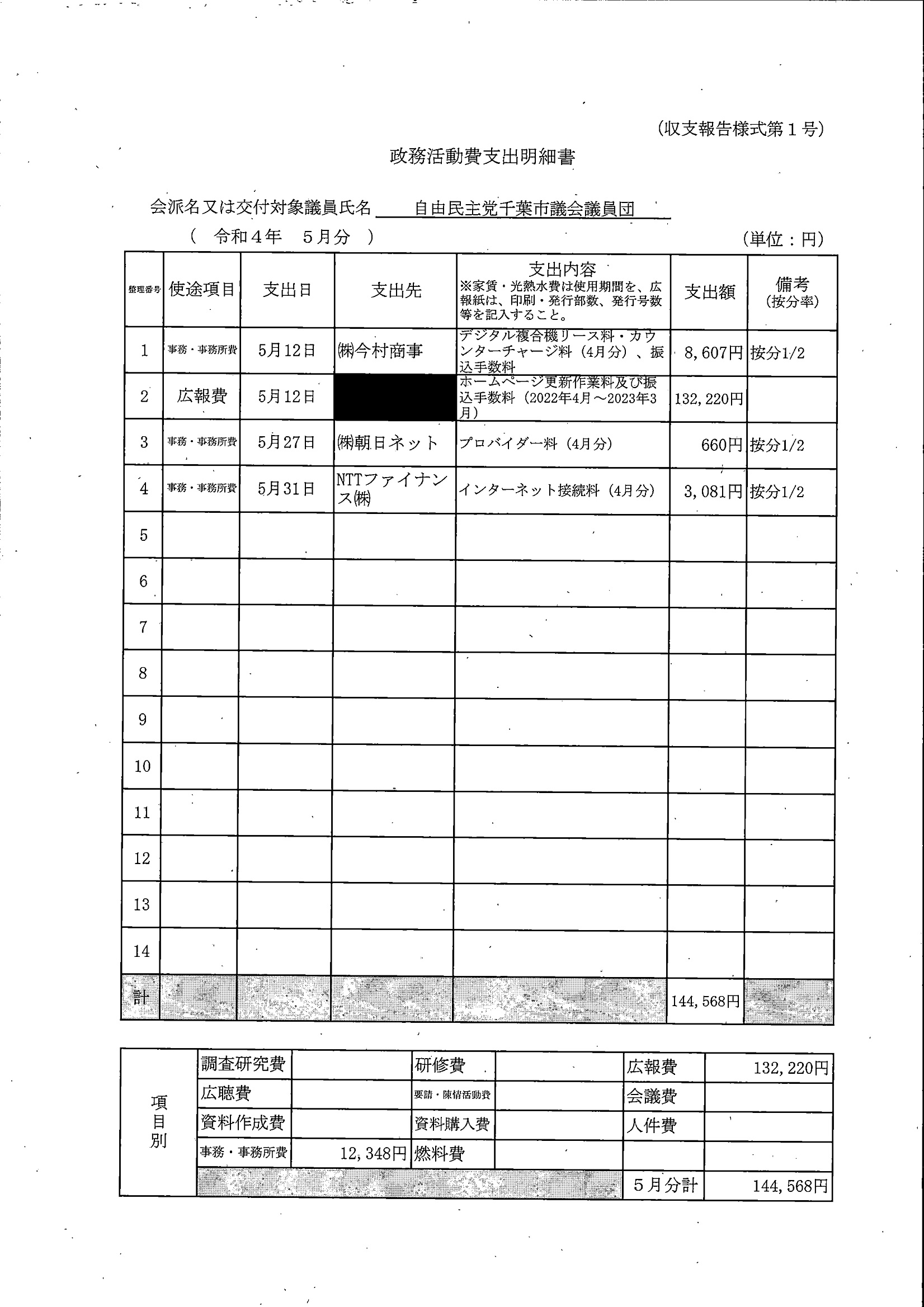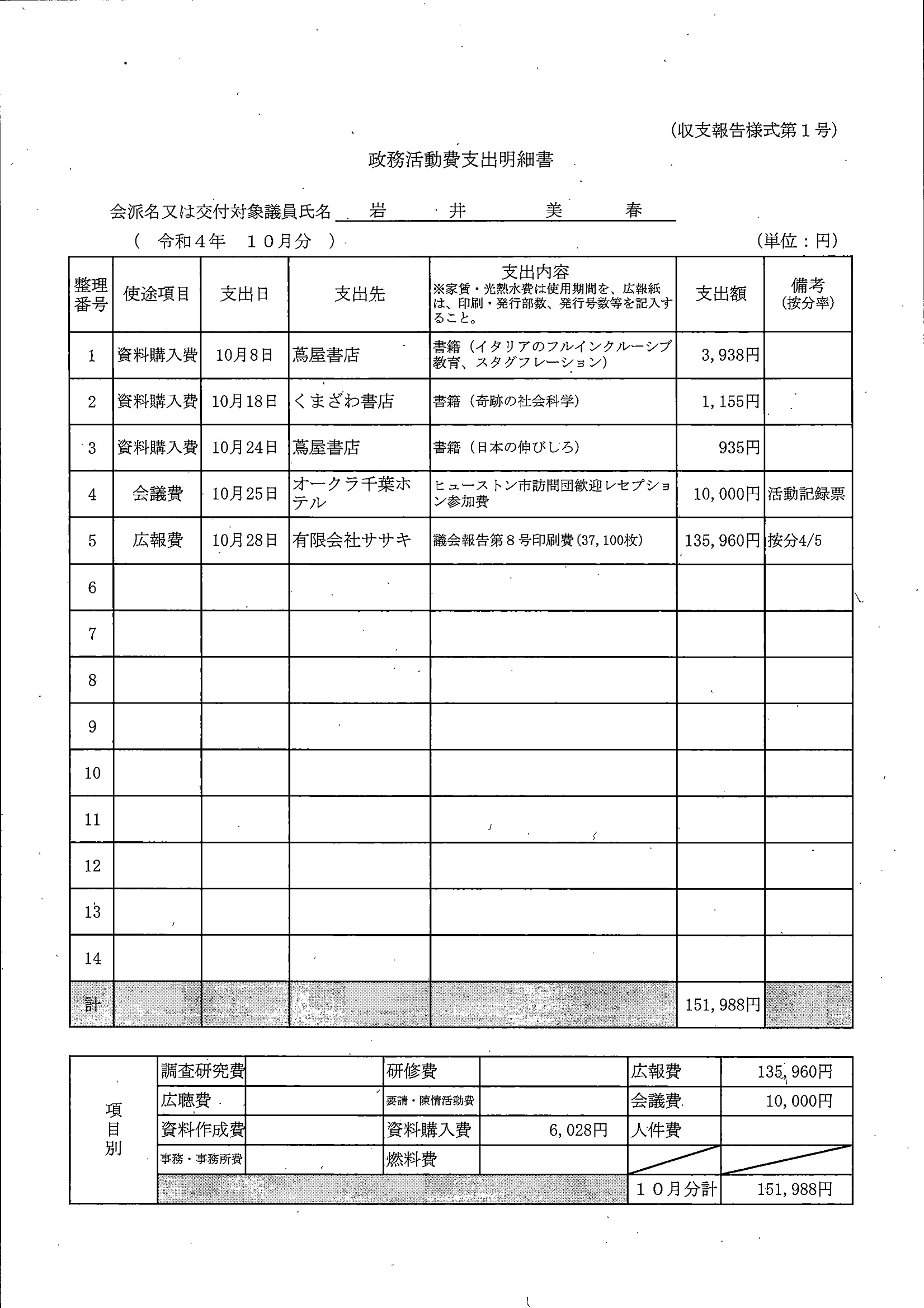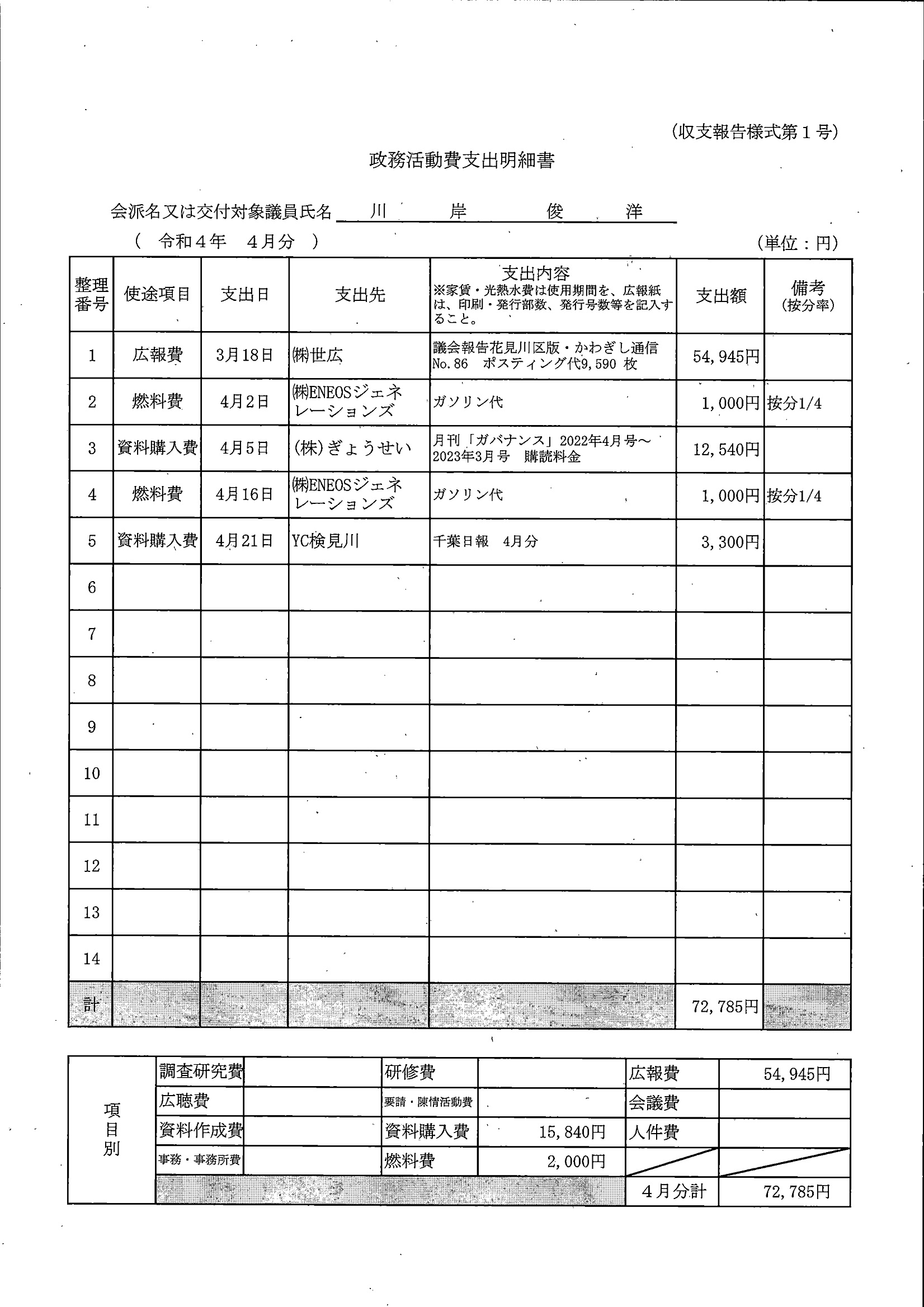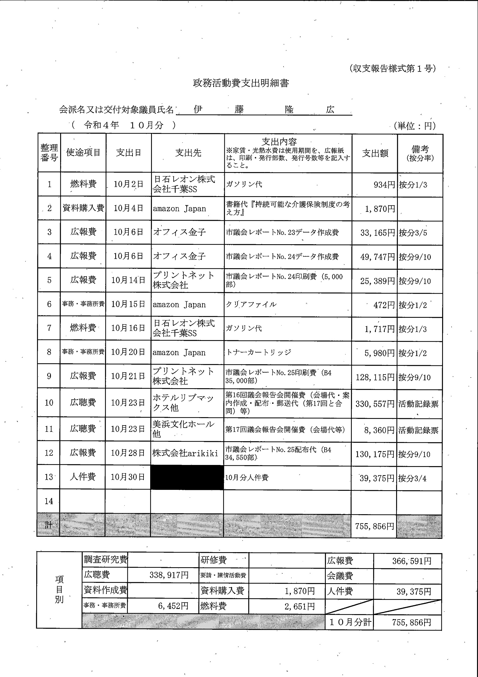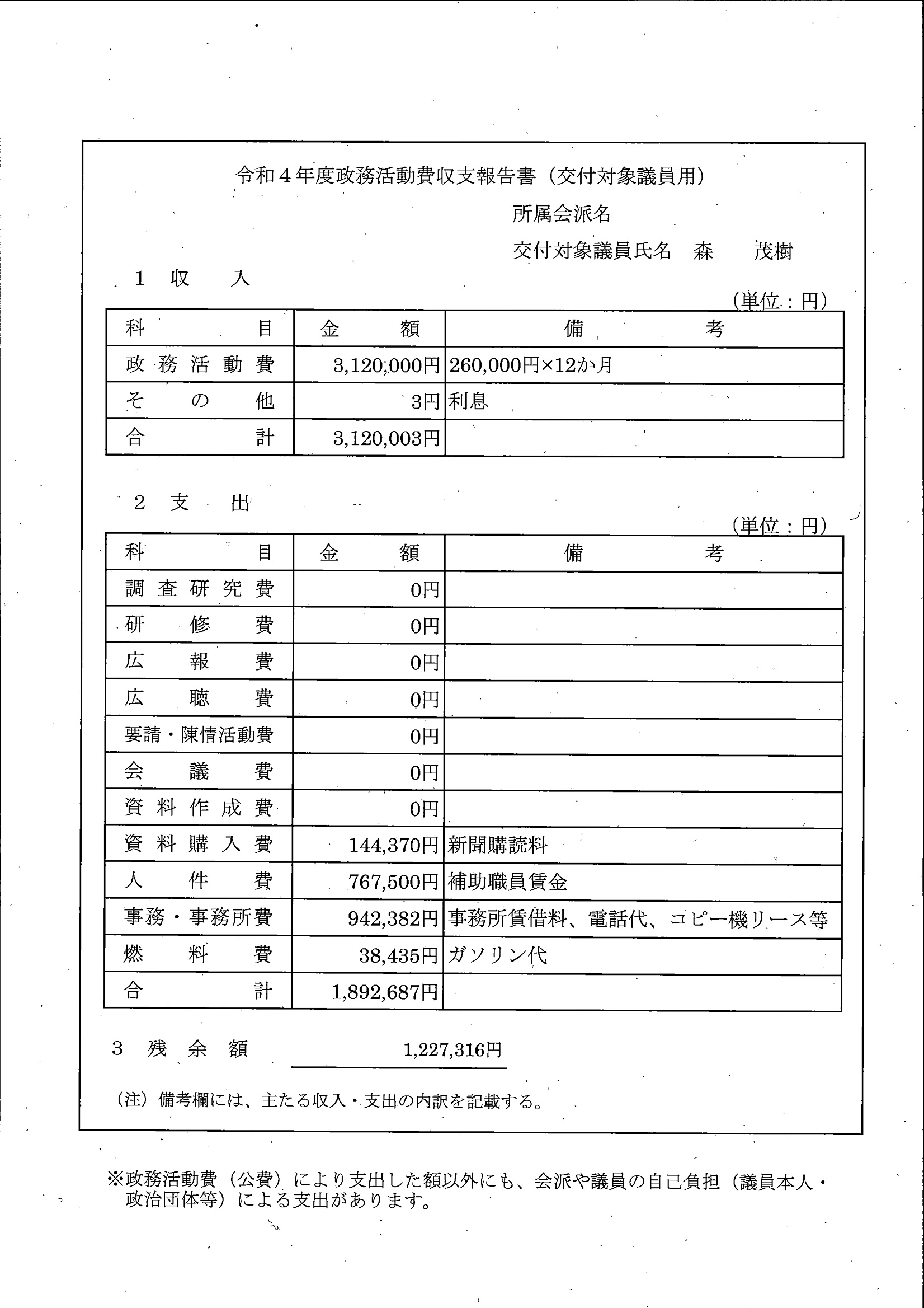 千葉市議会トップページ > 広報・情報公開 > 政務活動費 > 令和4年度交付分(政務活動費収支報告書)