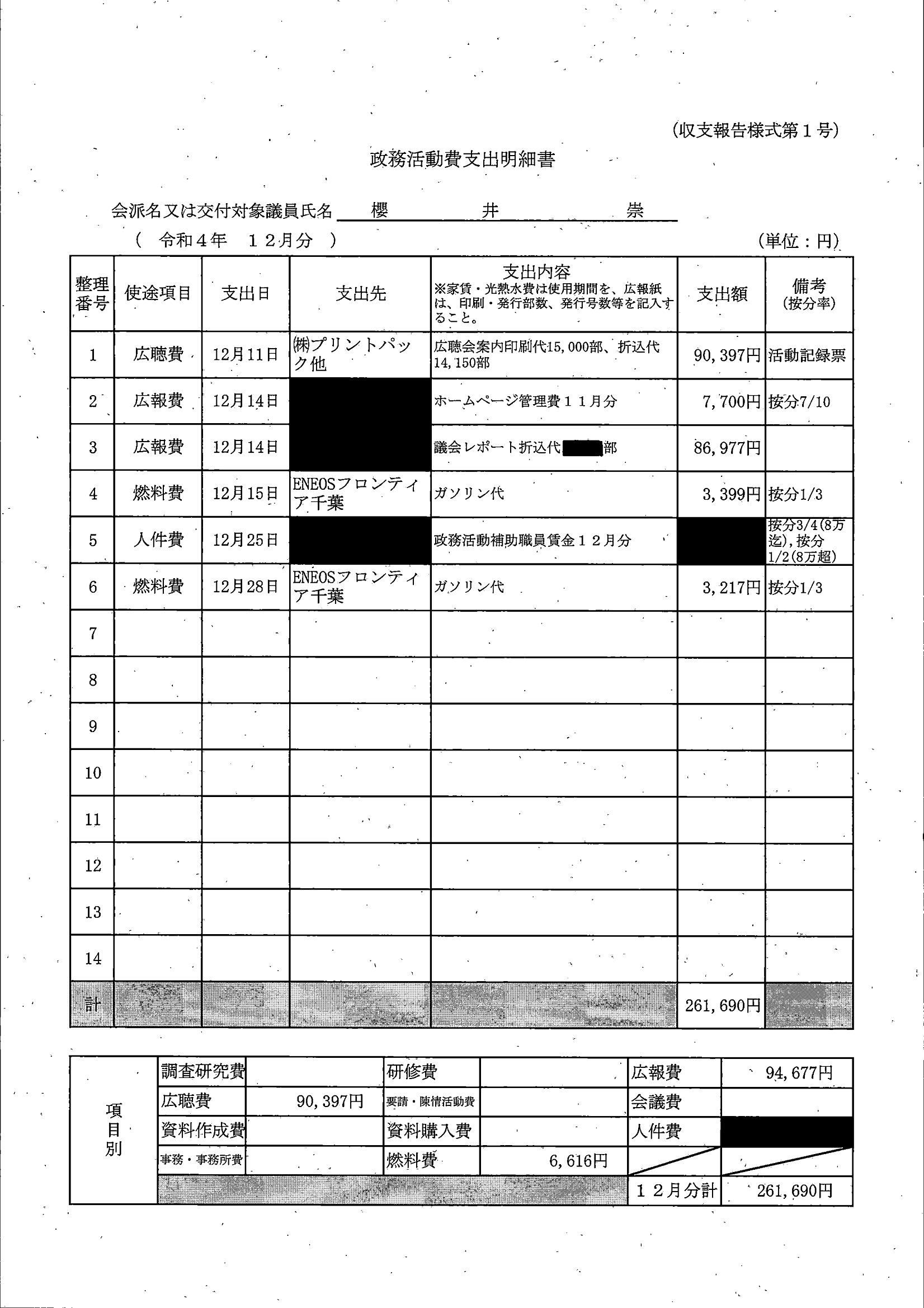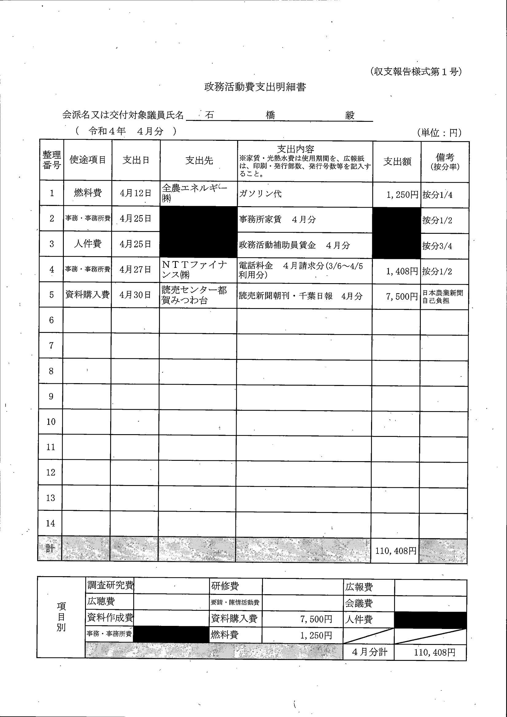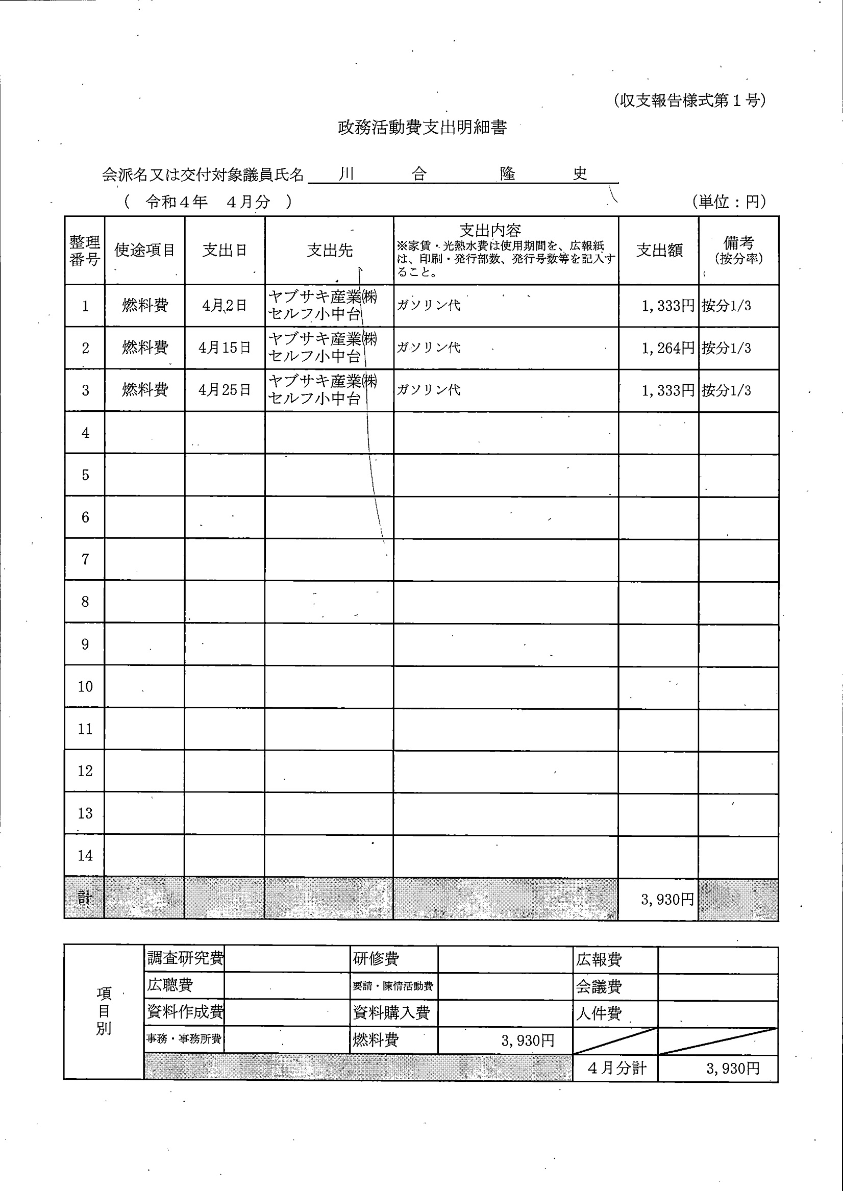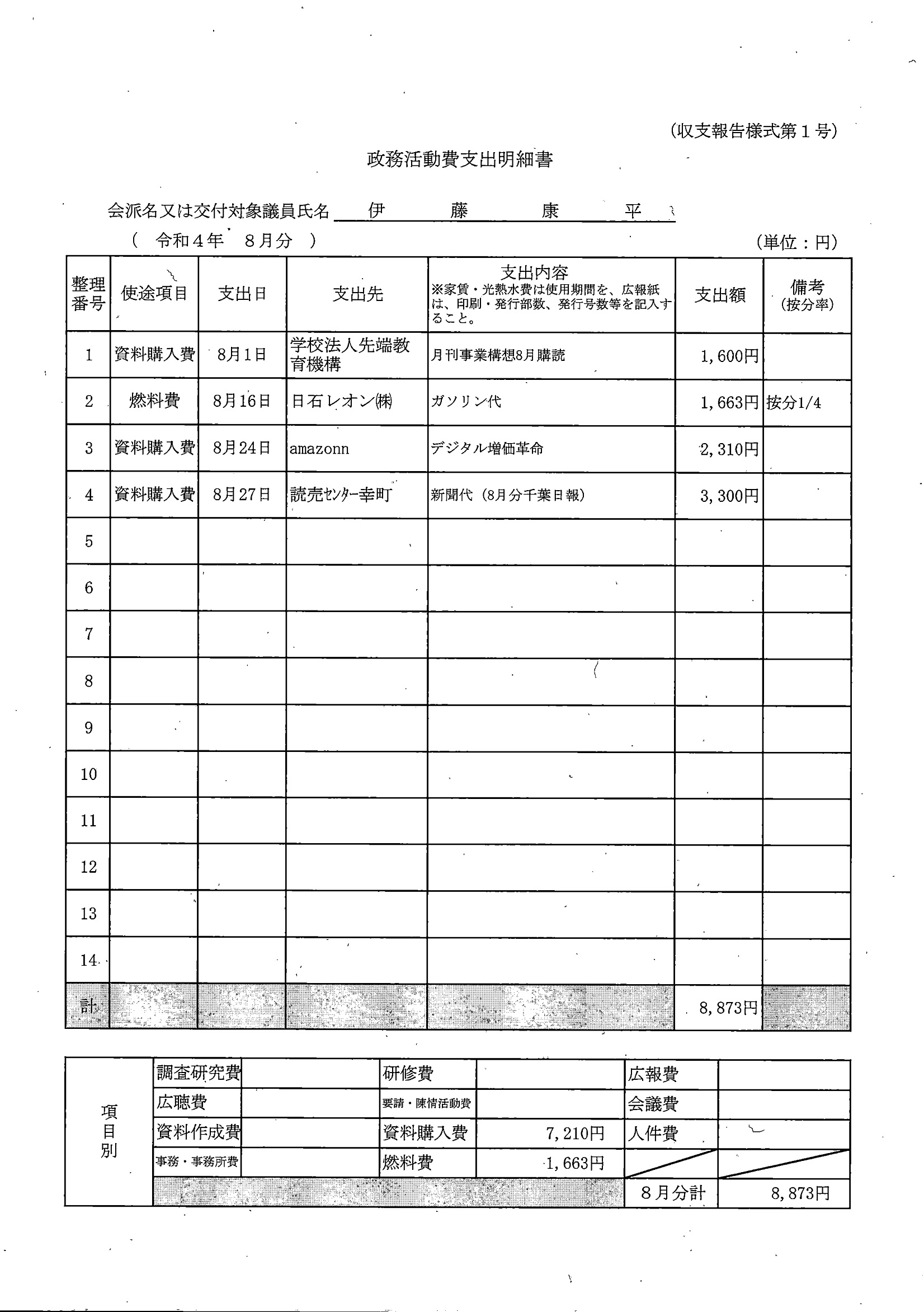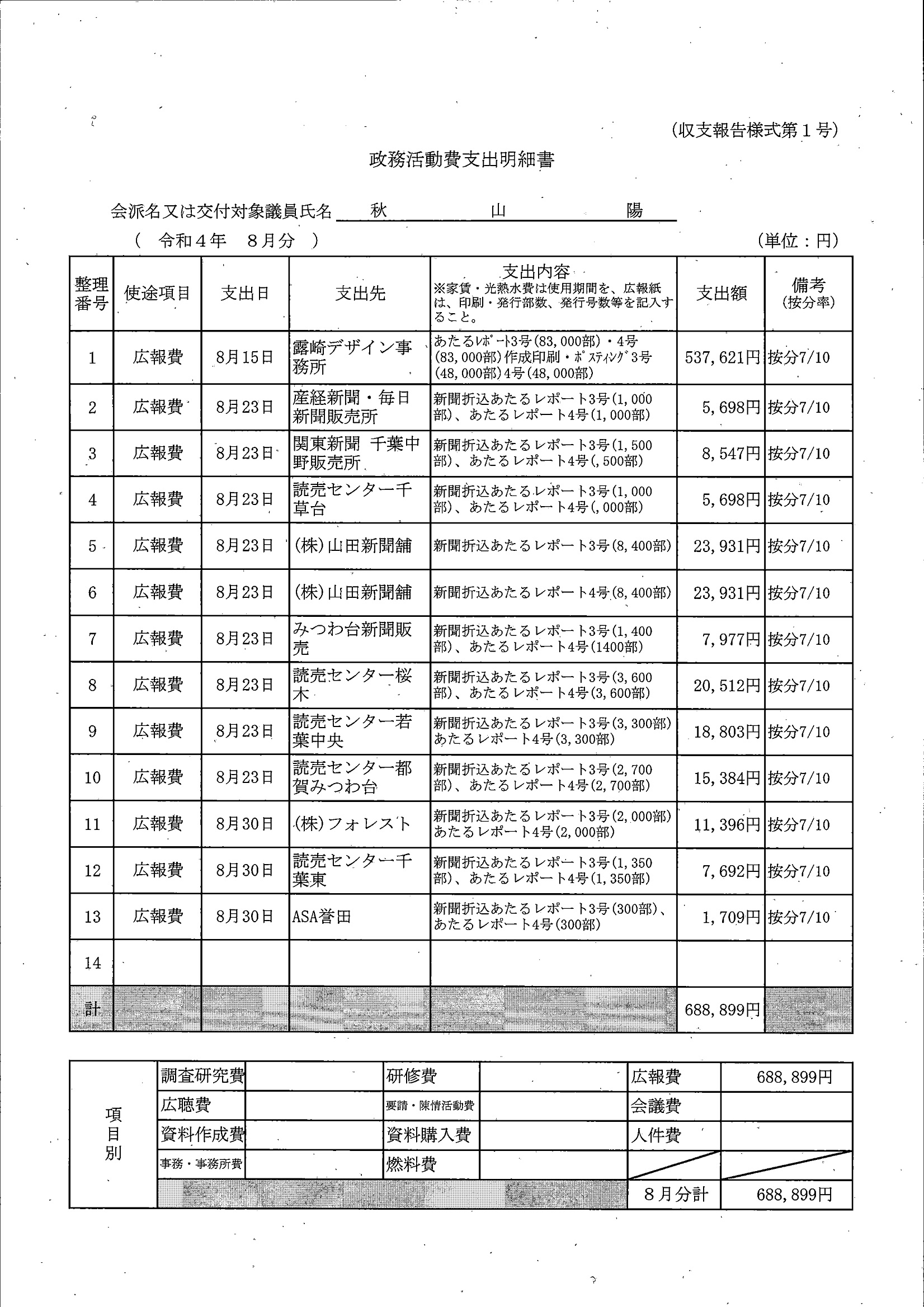 千葉市議会トップページ > 広報・情報公開 > 政務活動費 > 令和4年度交付分(政務活動費収支報告書)