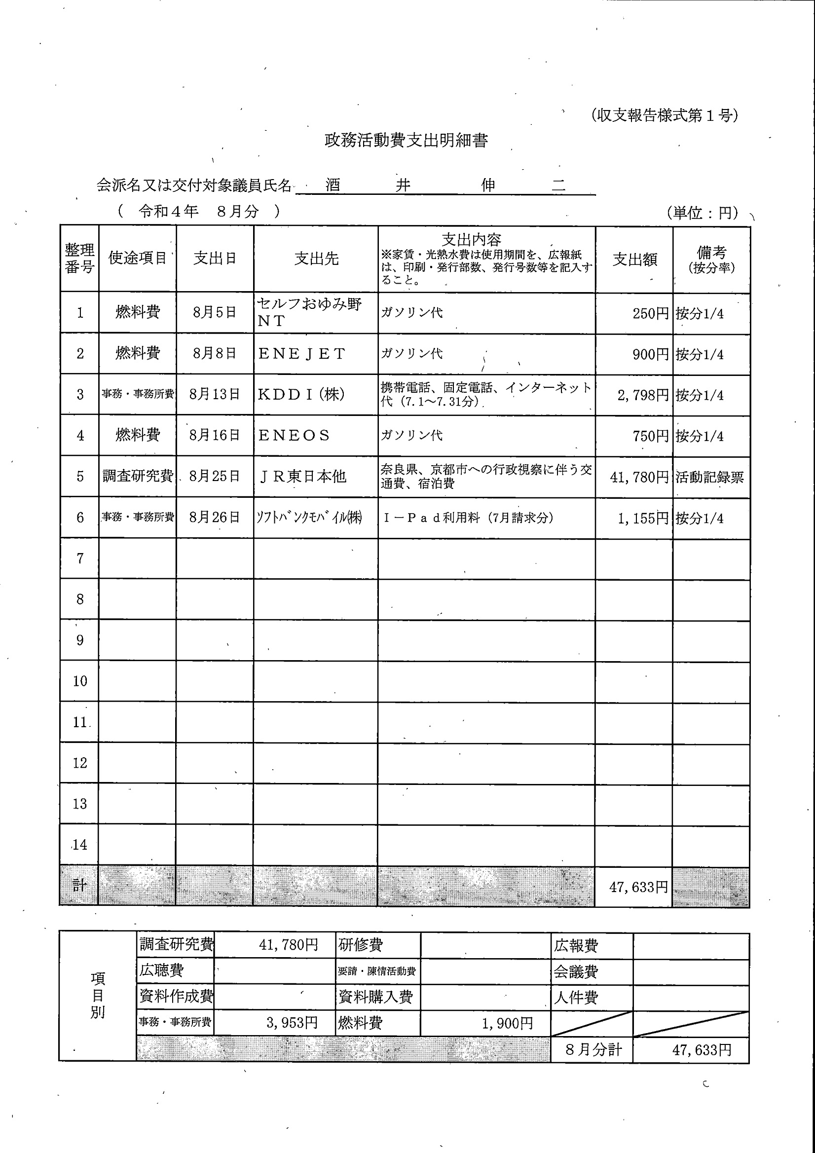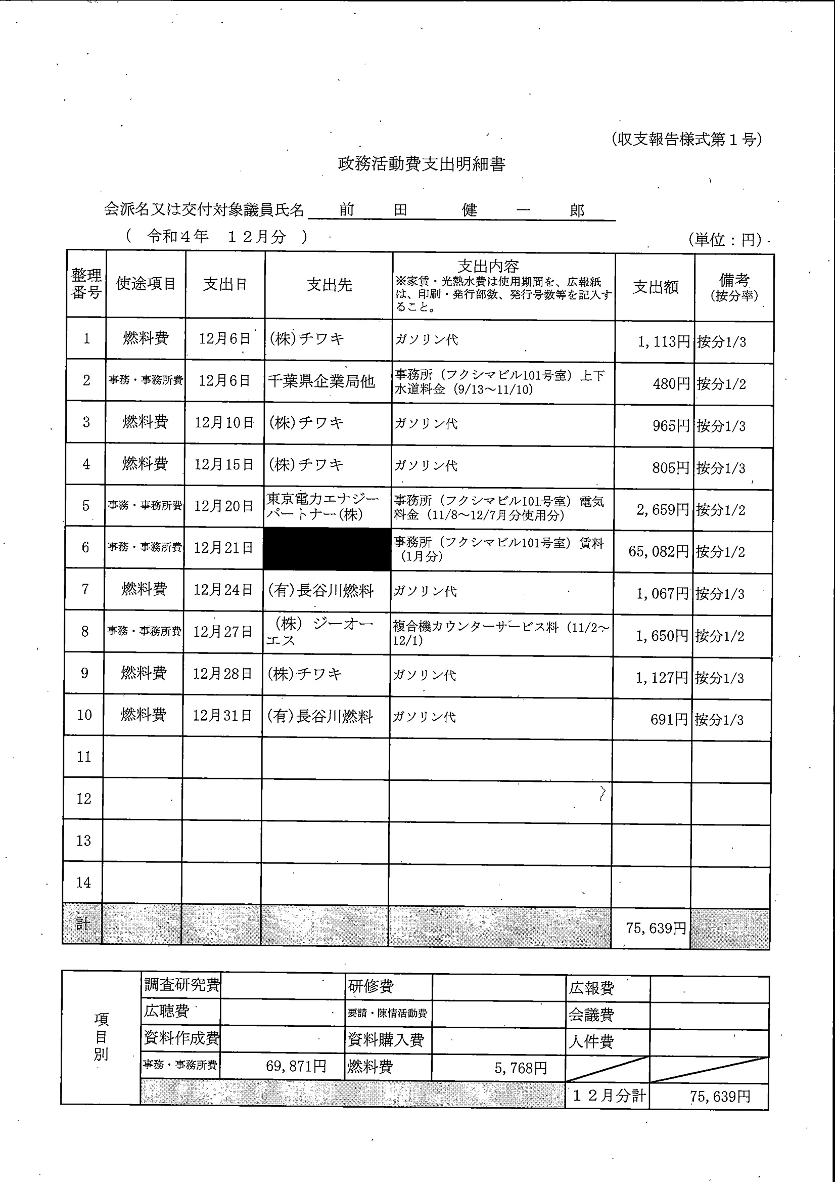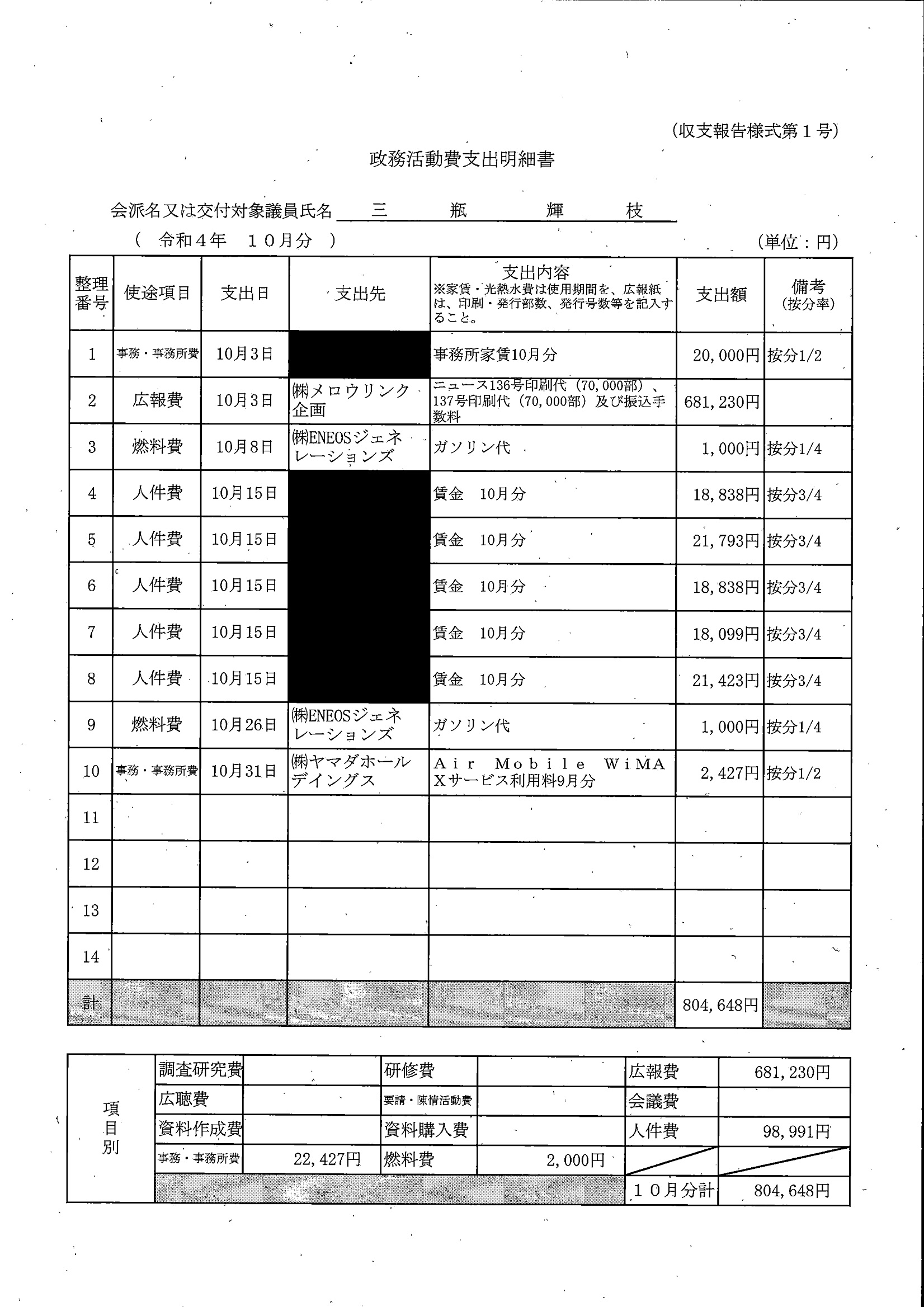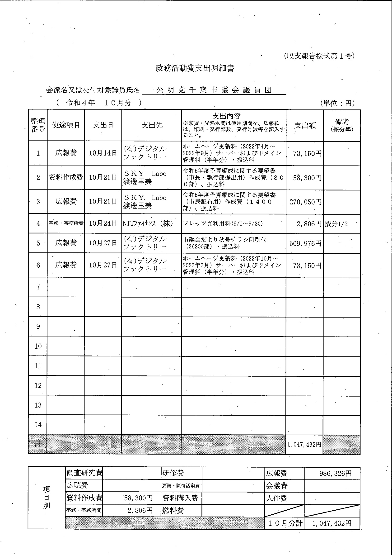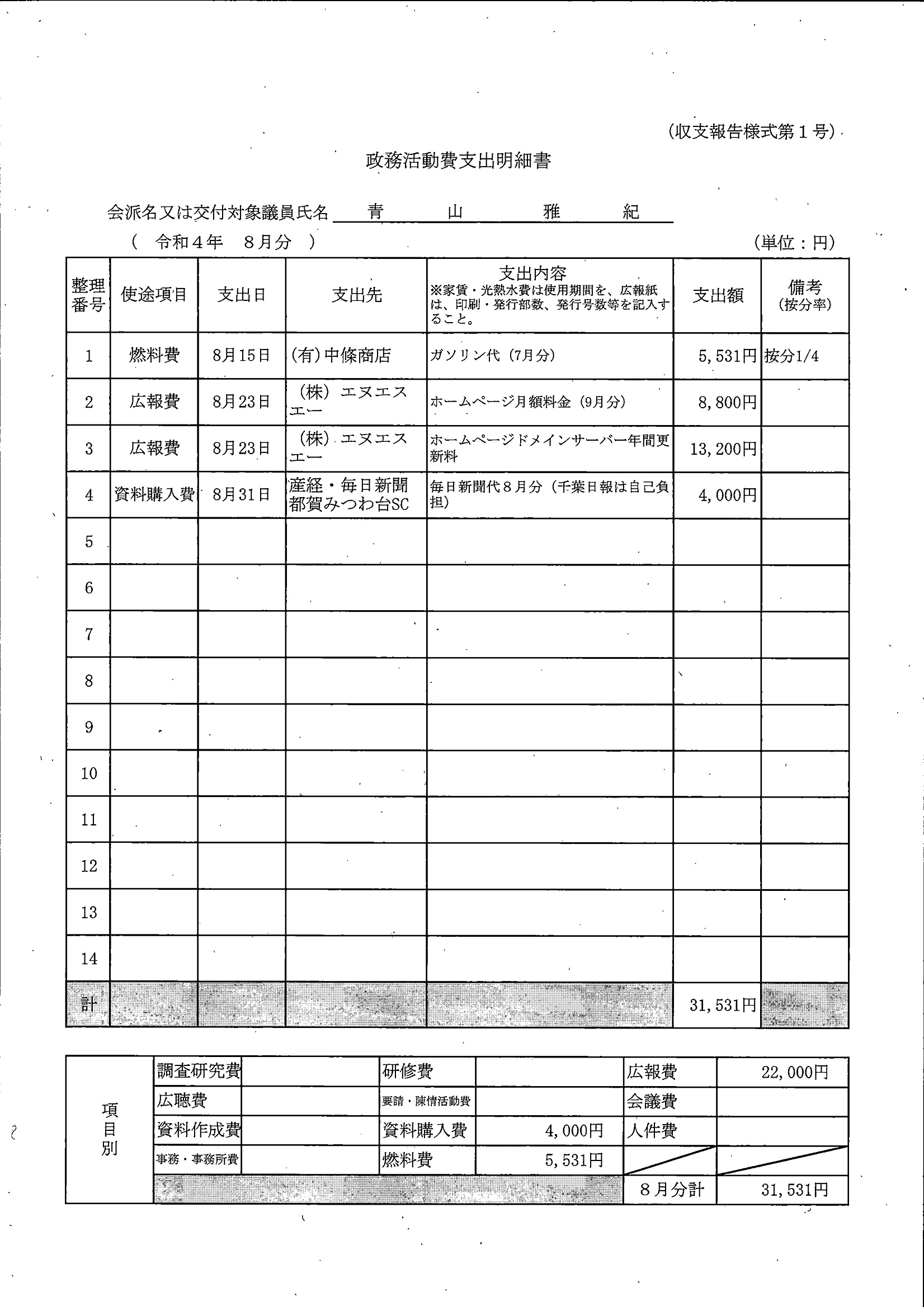 千葉市議会トップページ > 広報・情報公開 > 政務活動費 > 令和4年度交付分(政務活動費収支報告書)