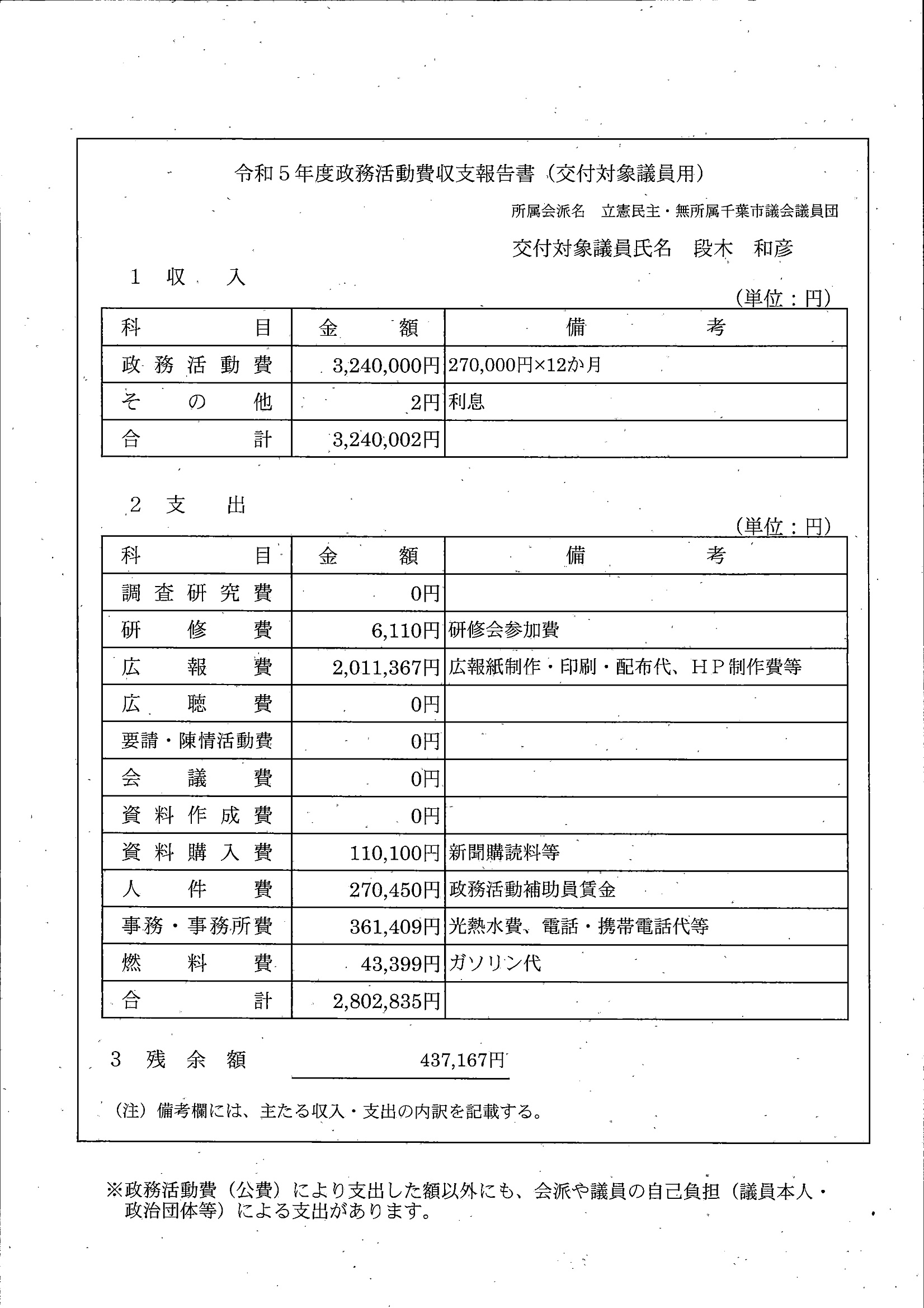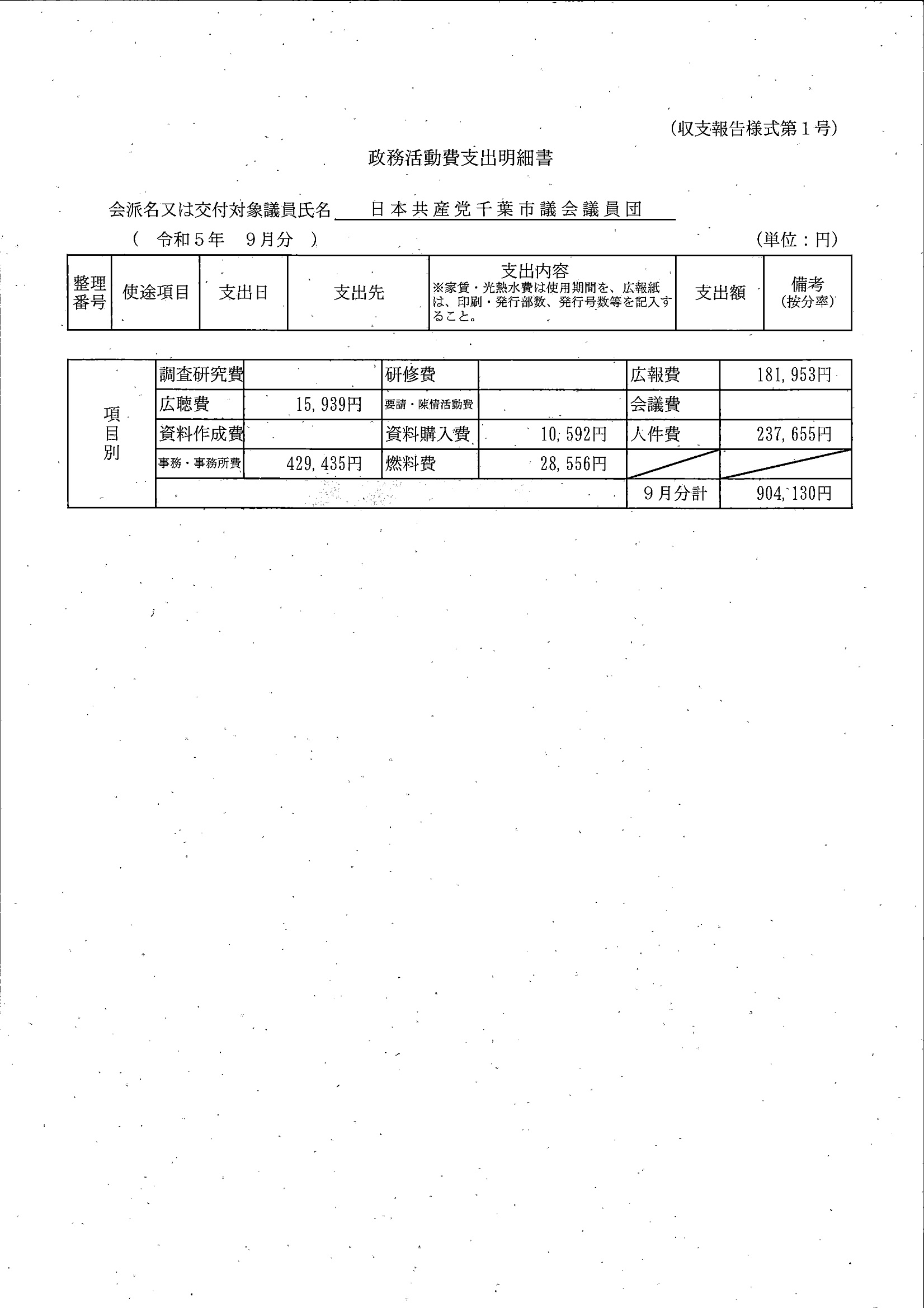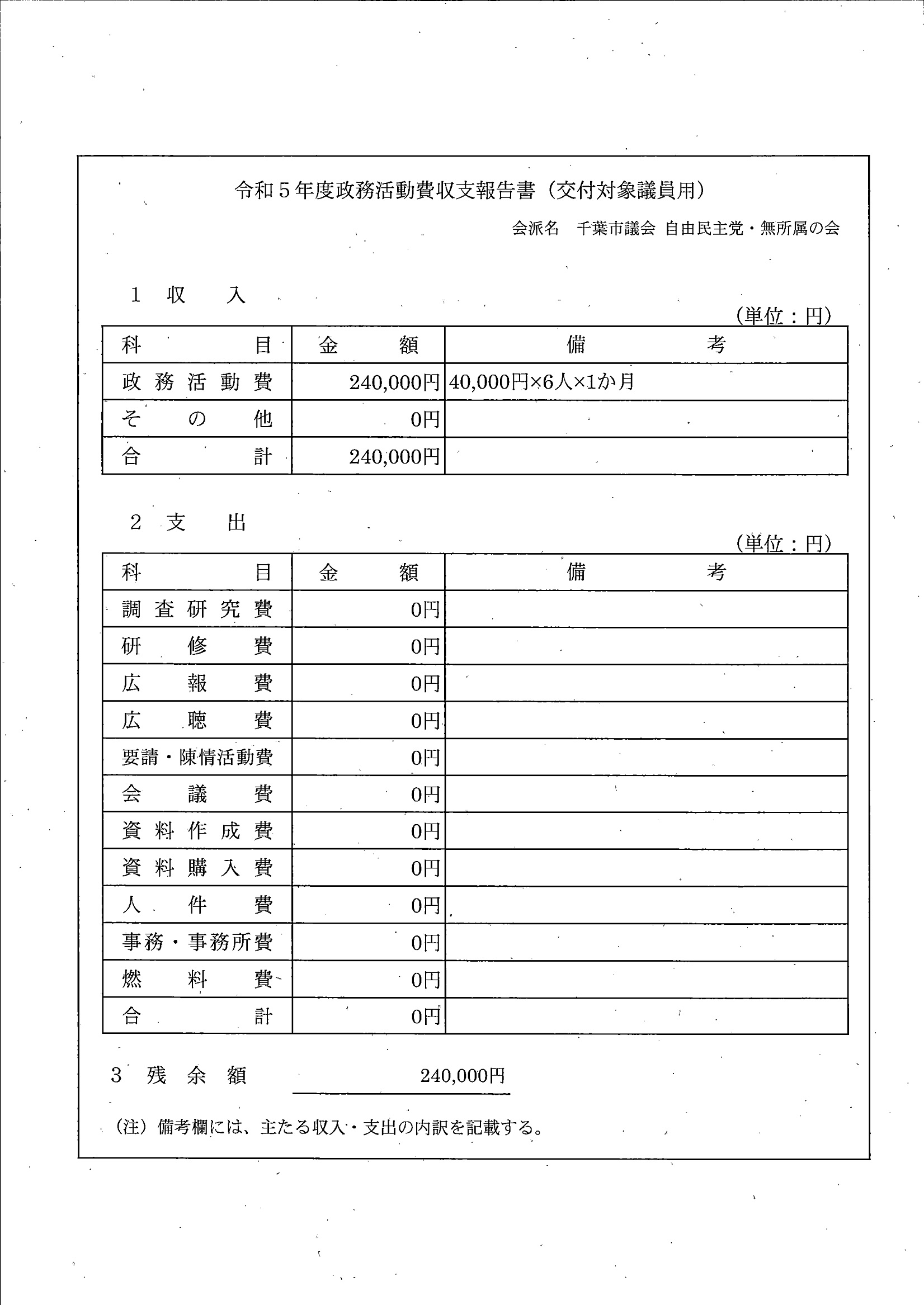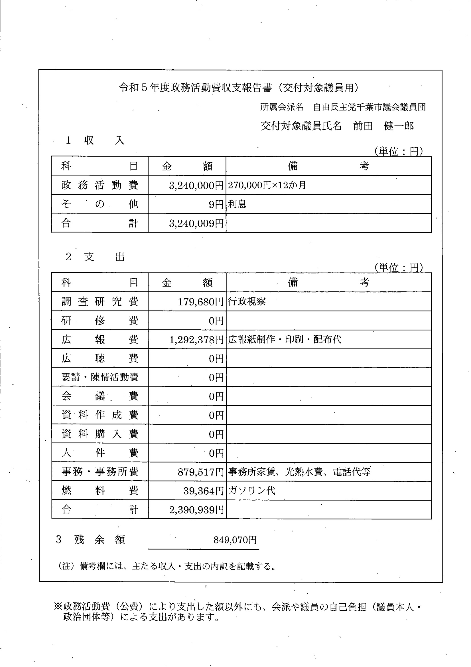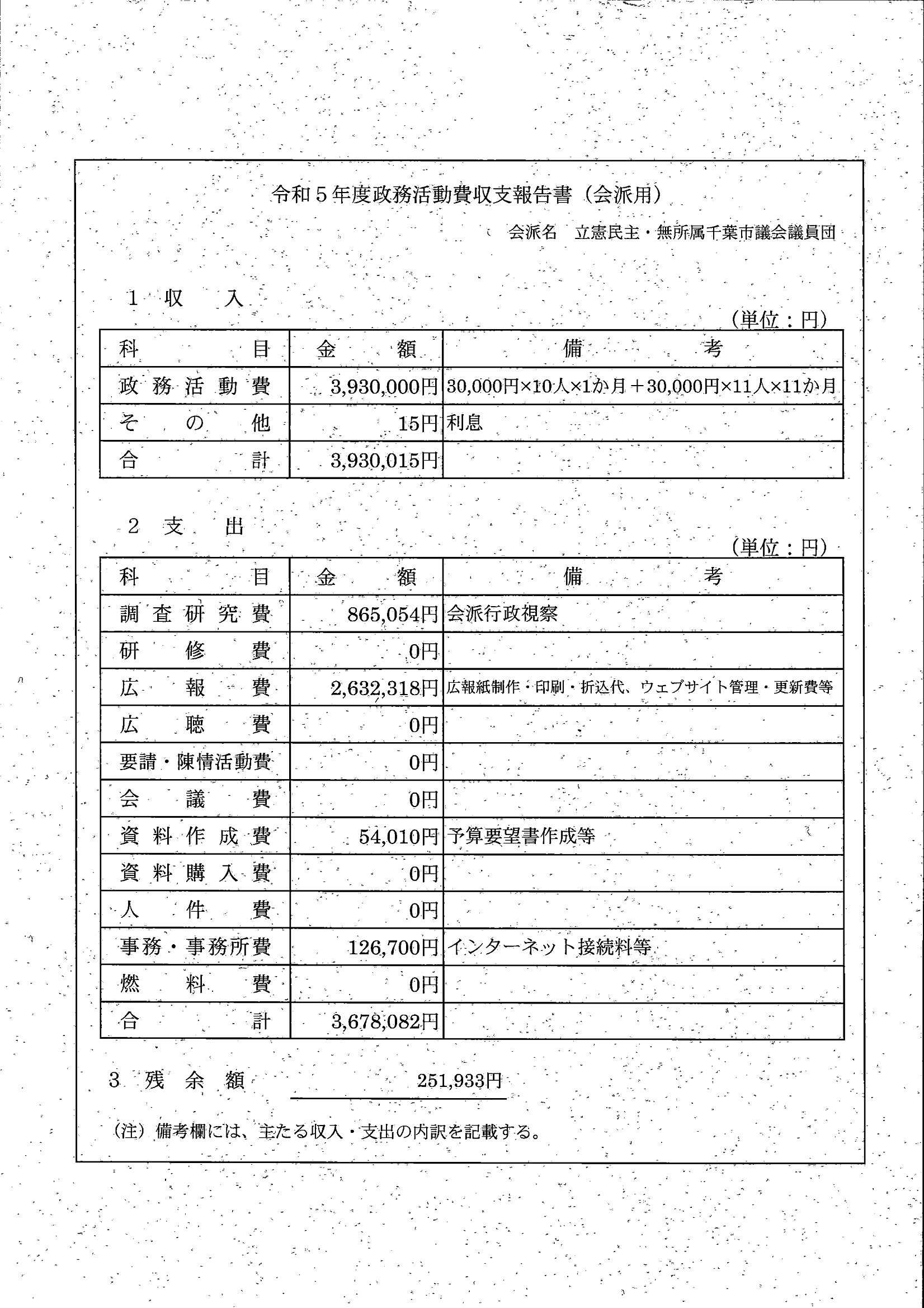 千葉市議会トップページ > 広報・情報公開 > 政務活動費 > 令和5年度交付分(政務活動費収支報告書)