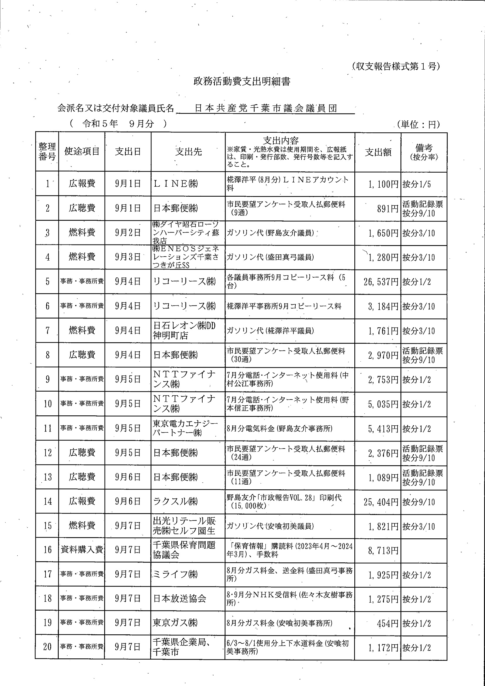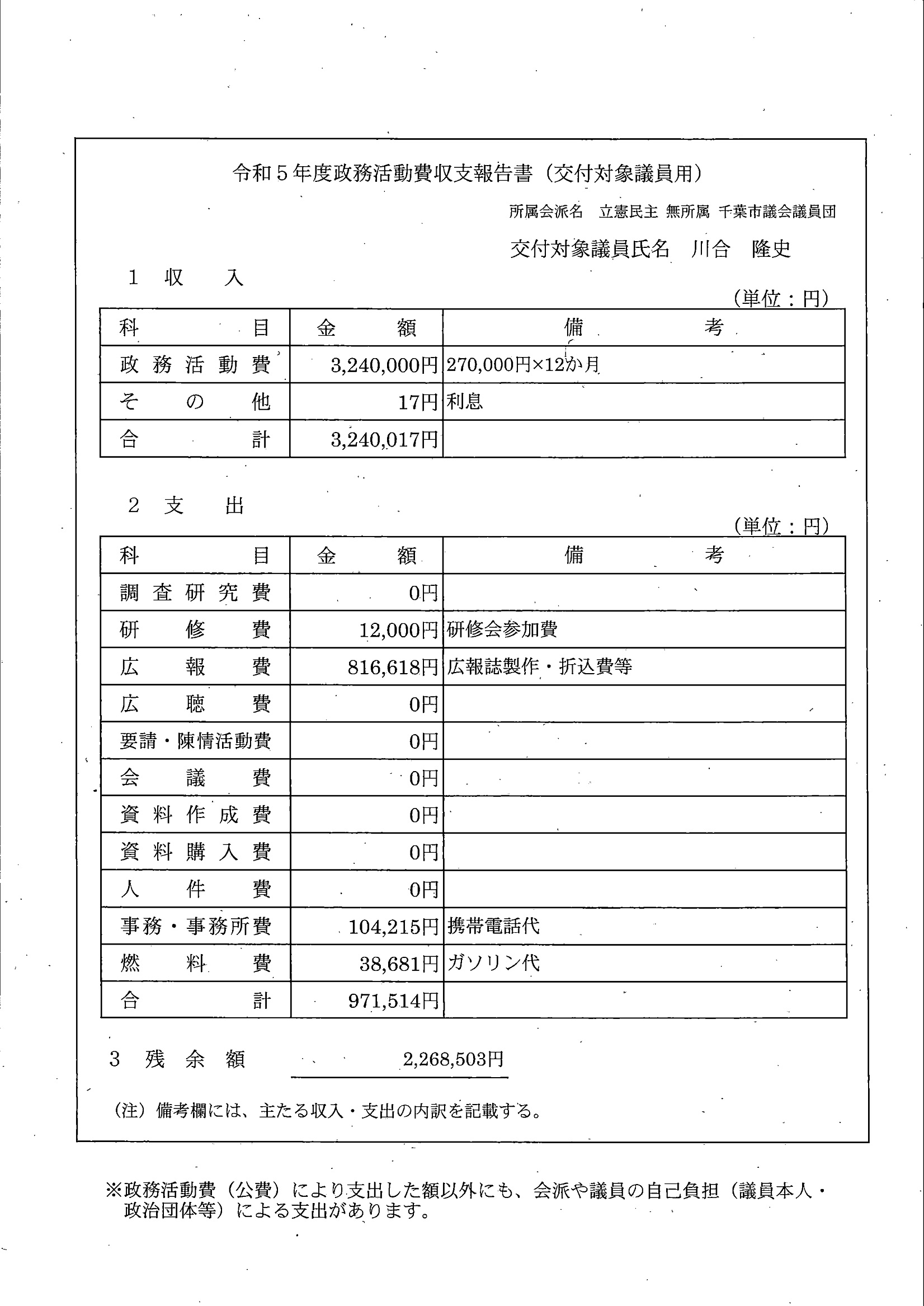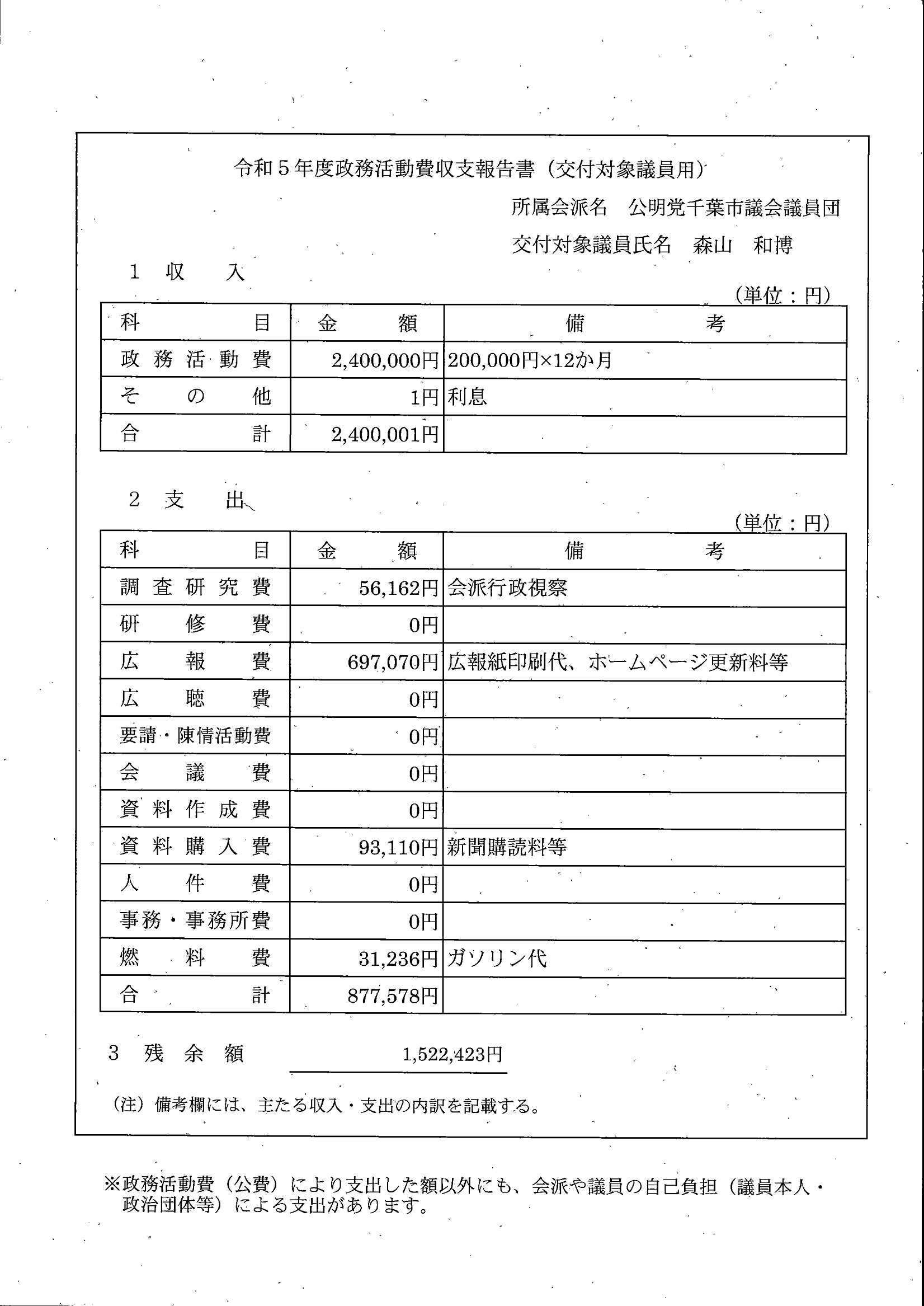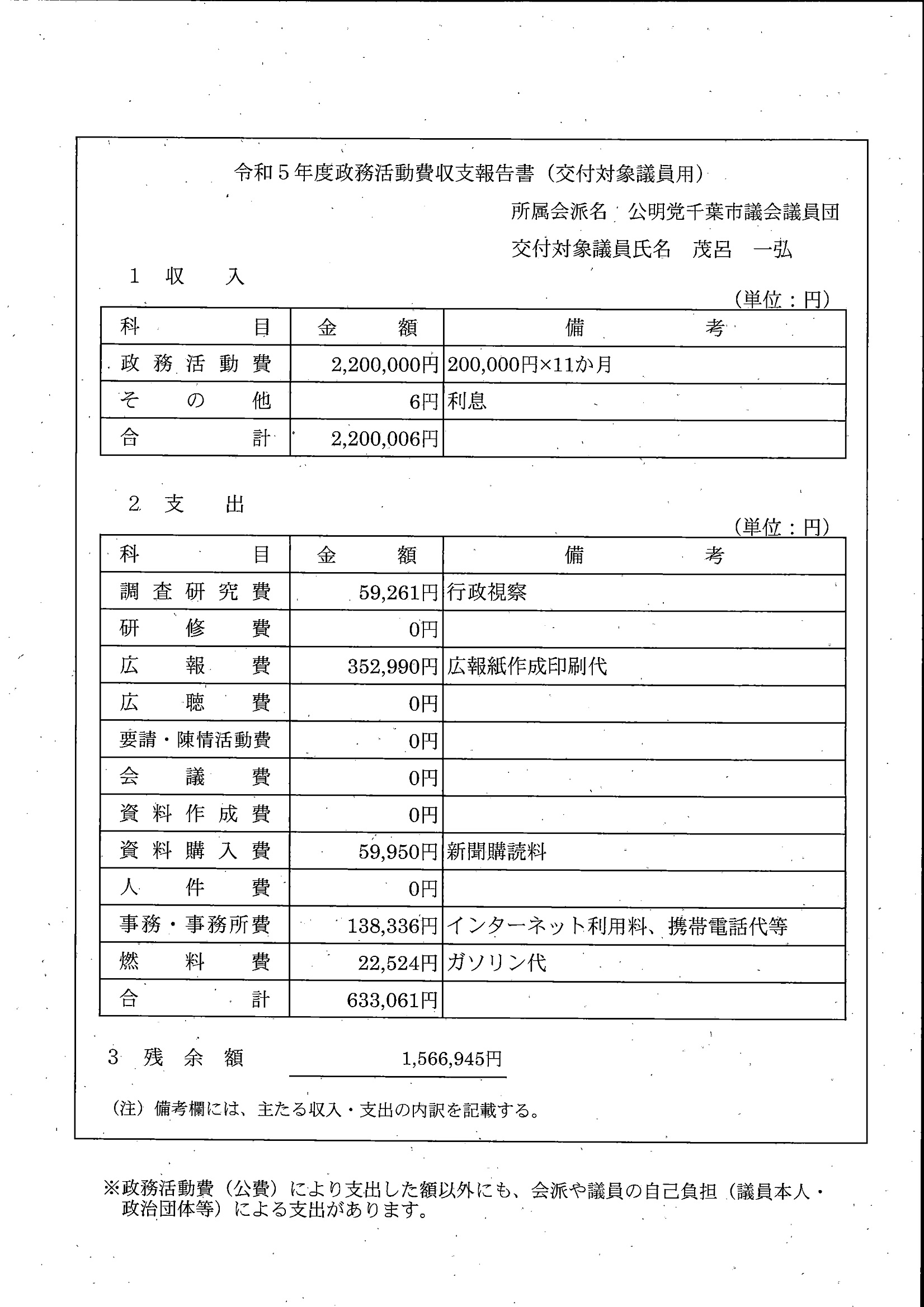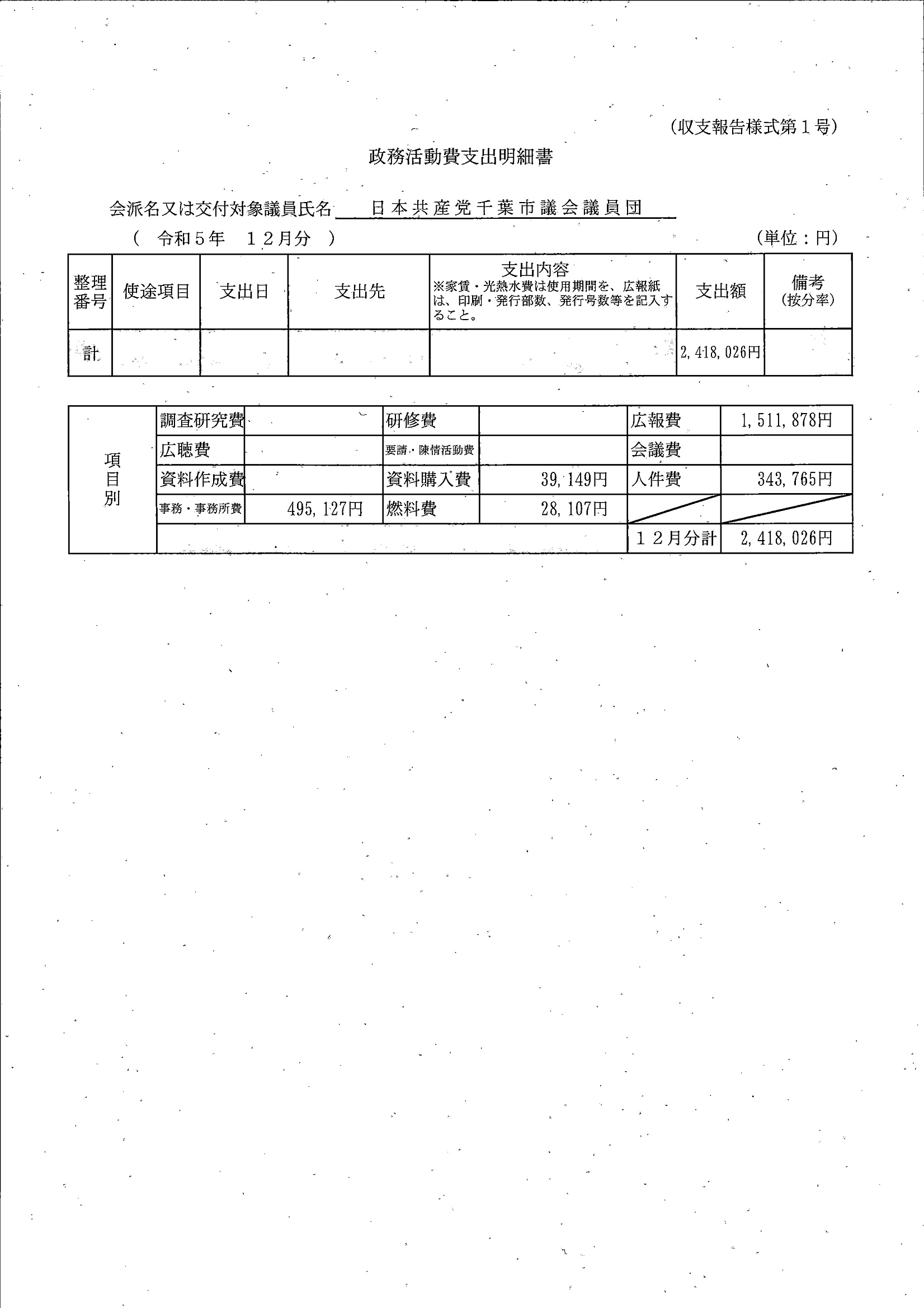 千葉市議会トップページ > 広報・情報公開 > 政務活動費 > 令和5年度交付分(政務活動費収支報告書)