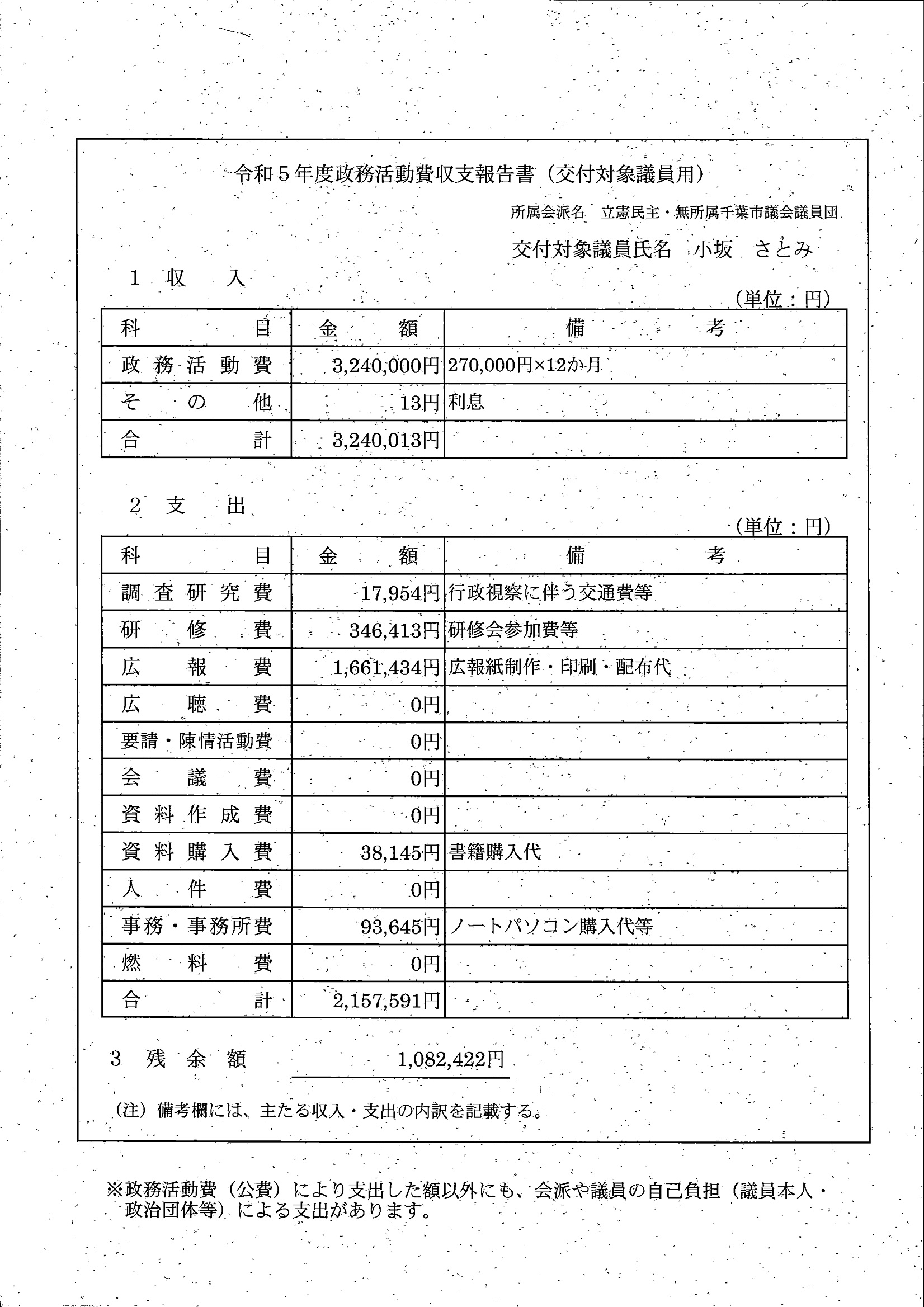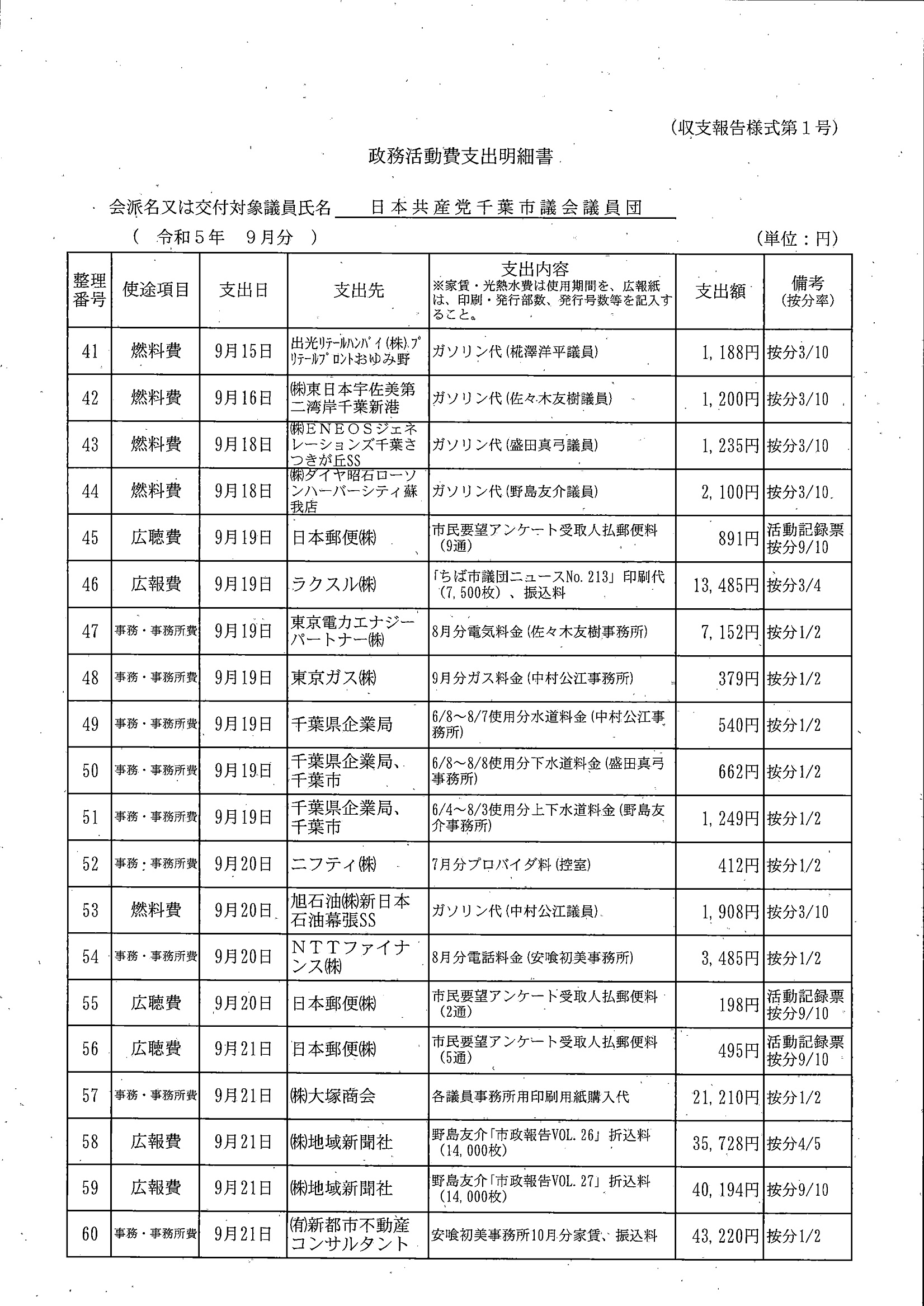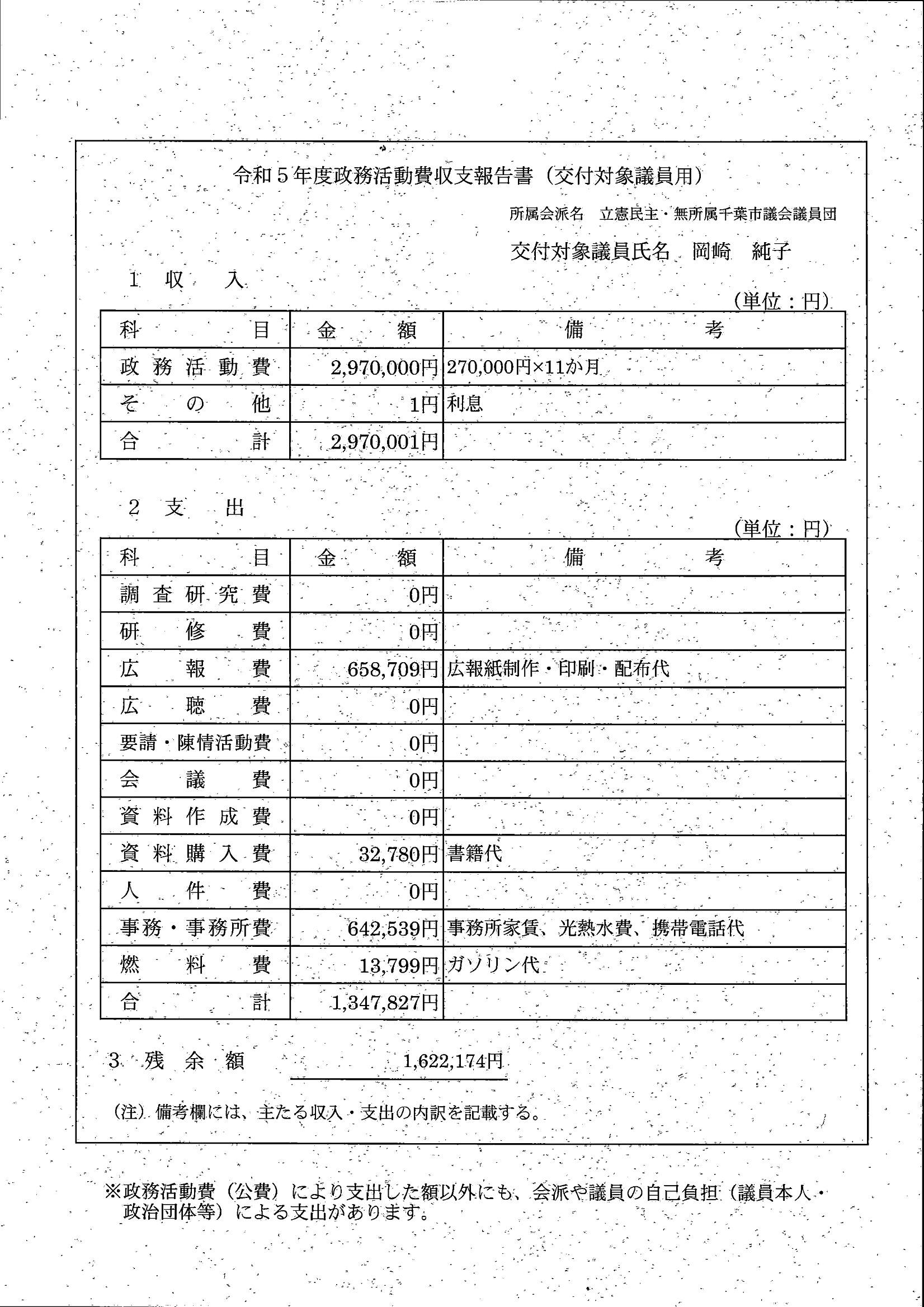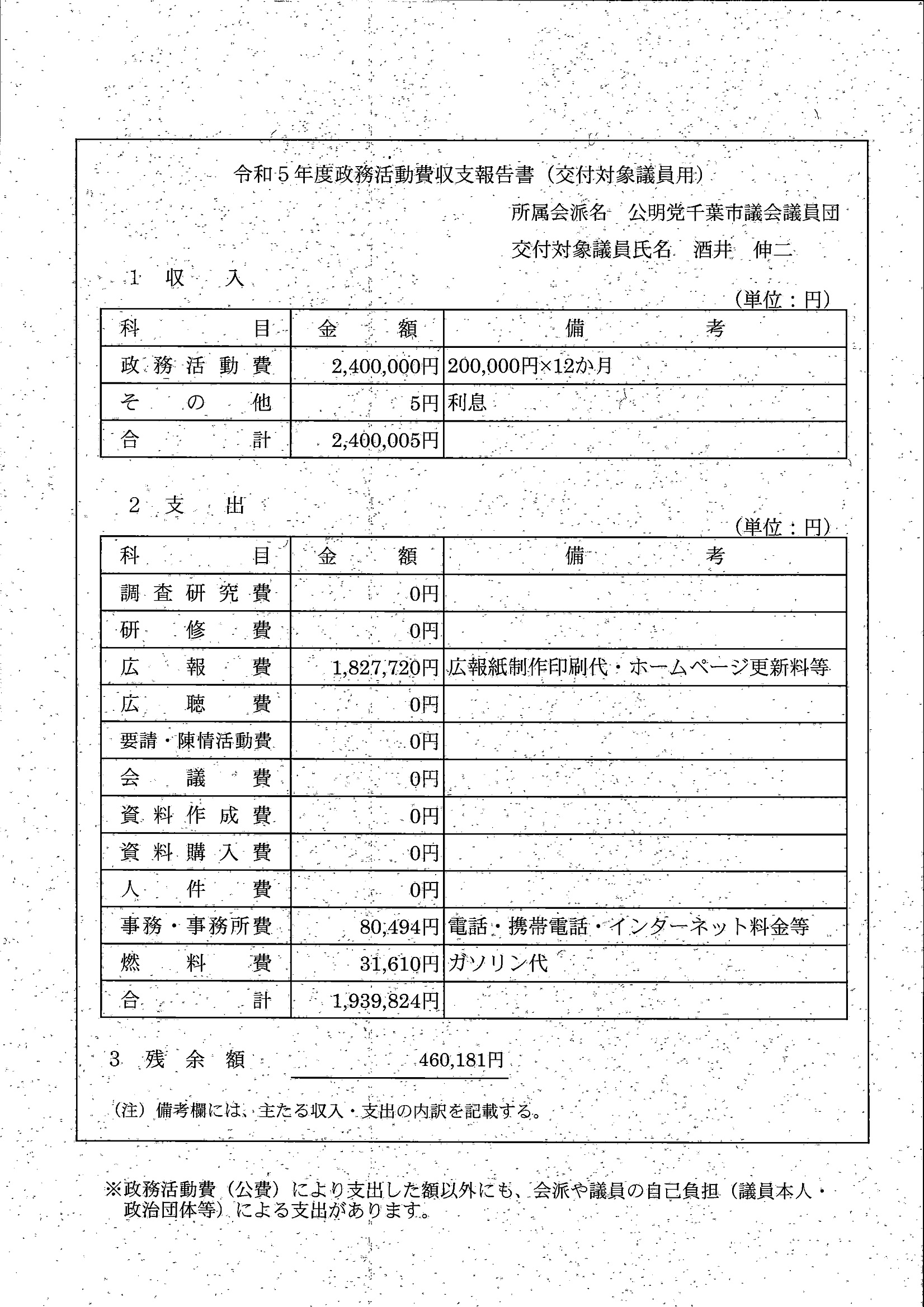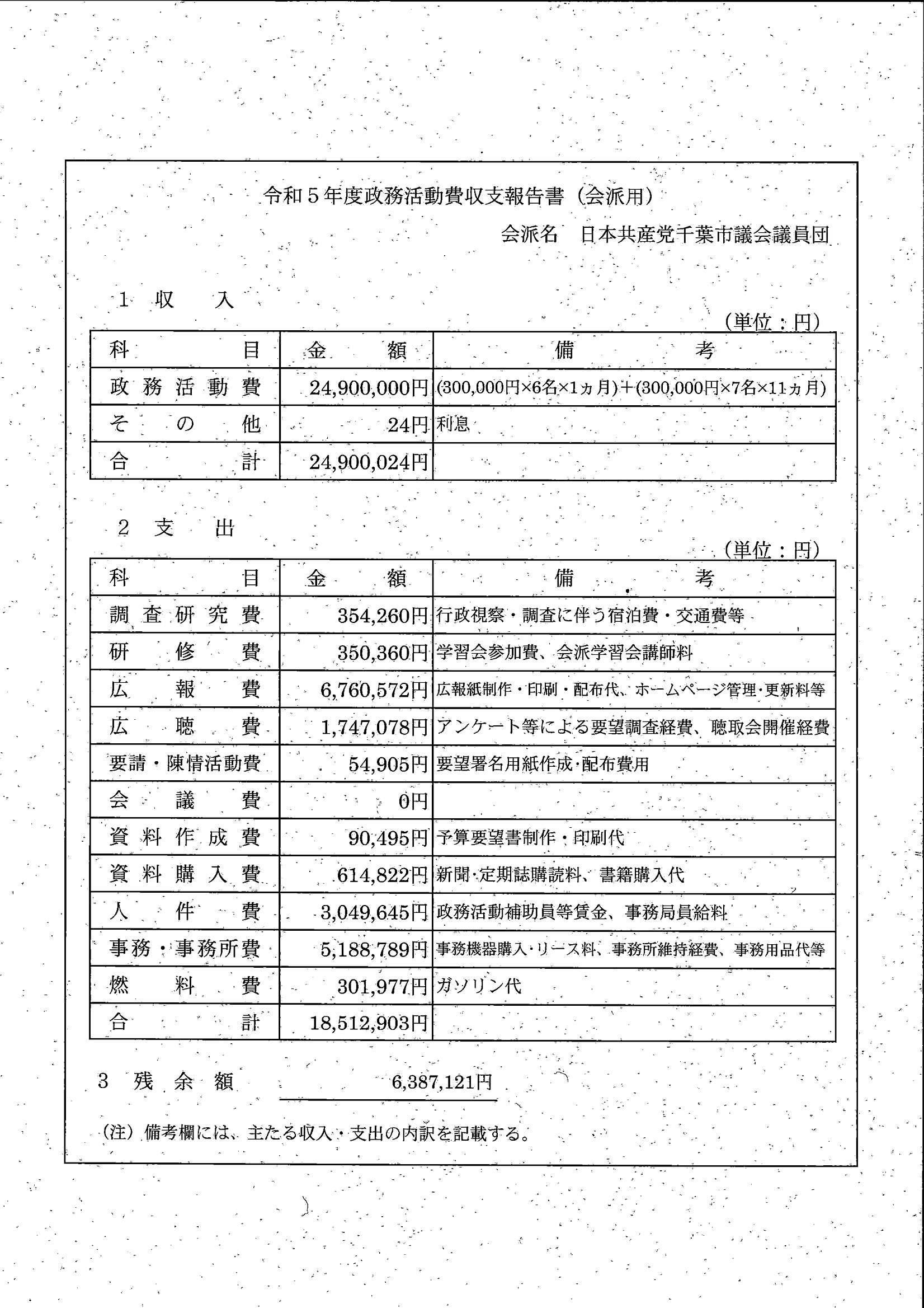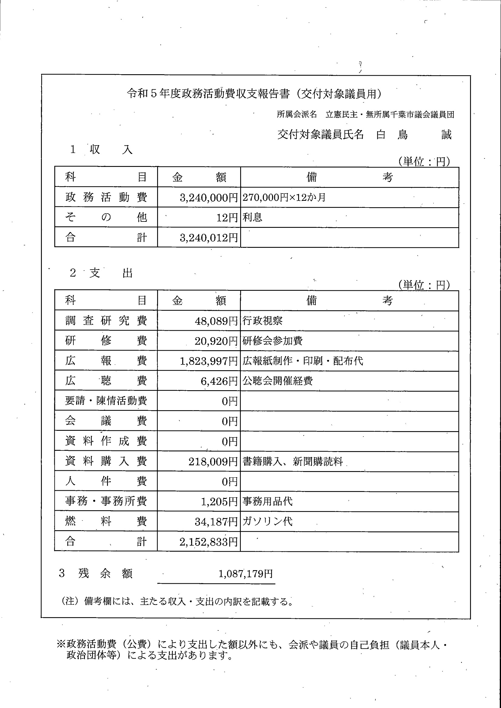 千葉市議会トップページ > 広報・情報公開 > 政務活動費 > 令和5年度交付分(政務活動費収支報告書)