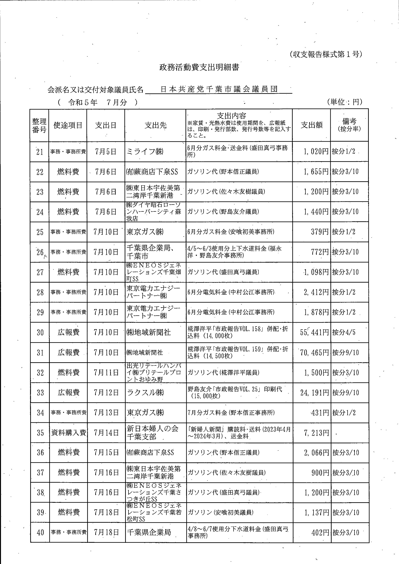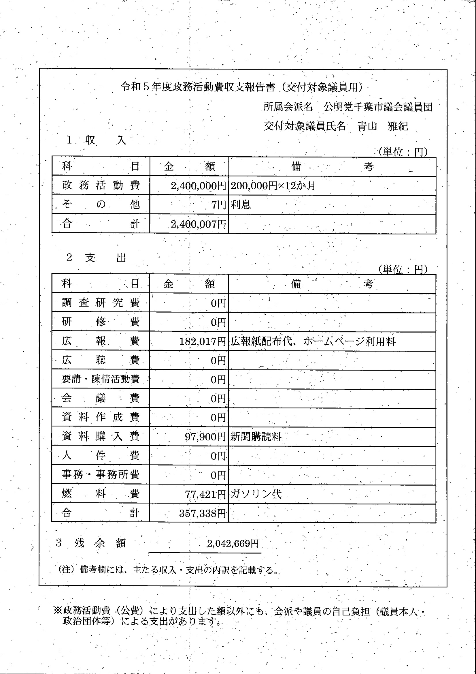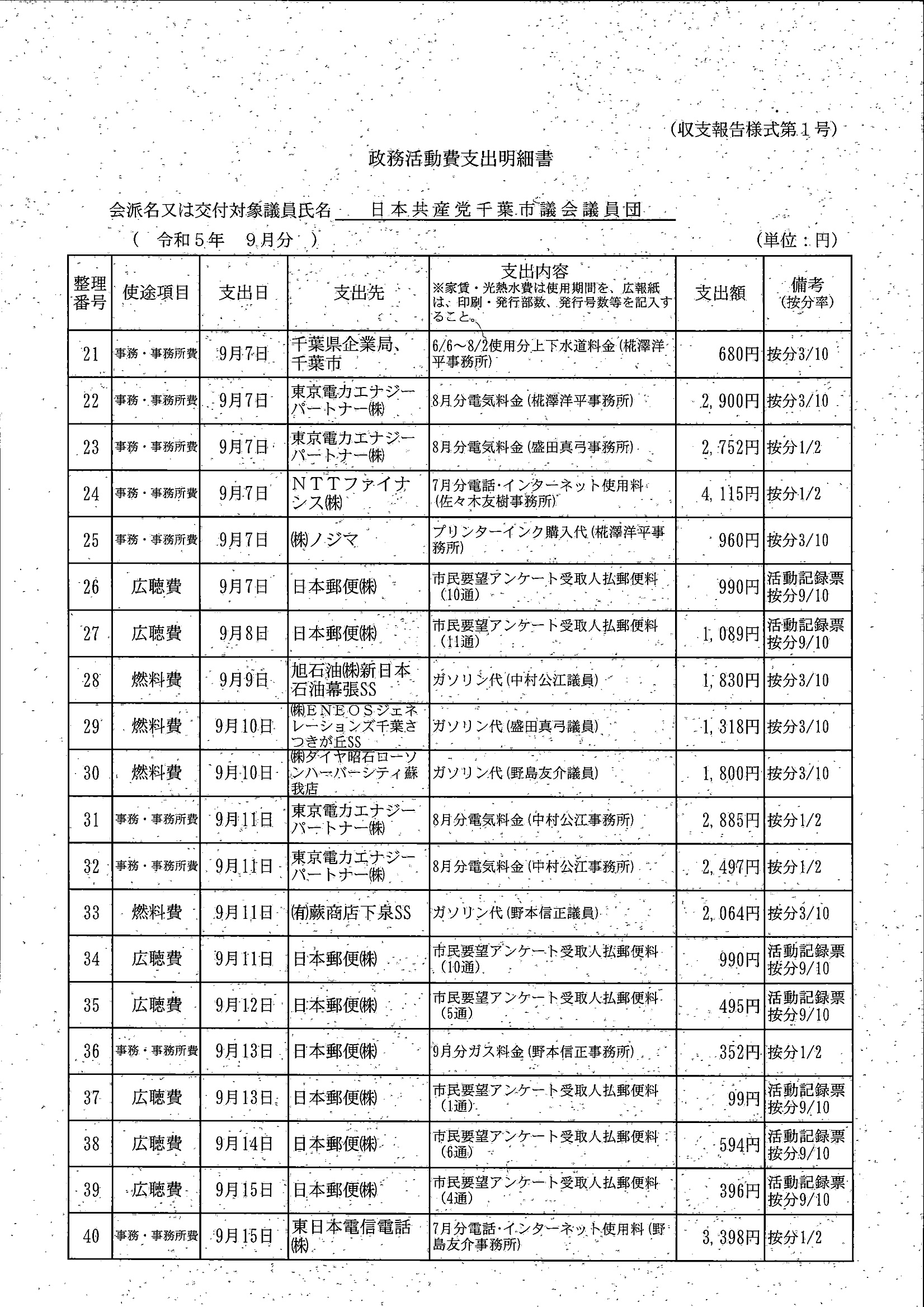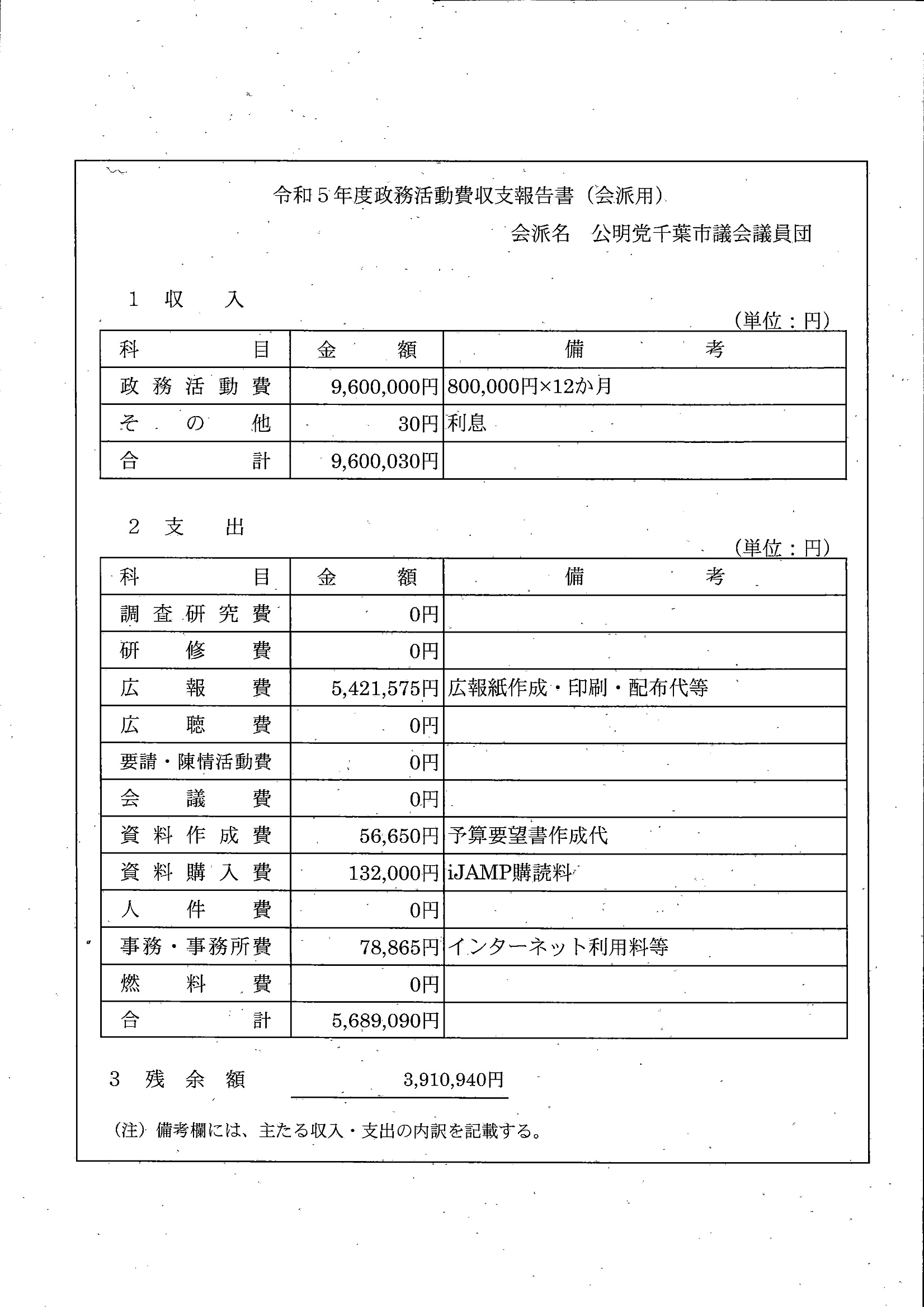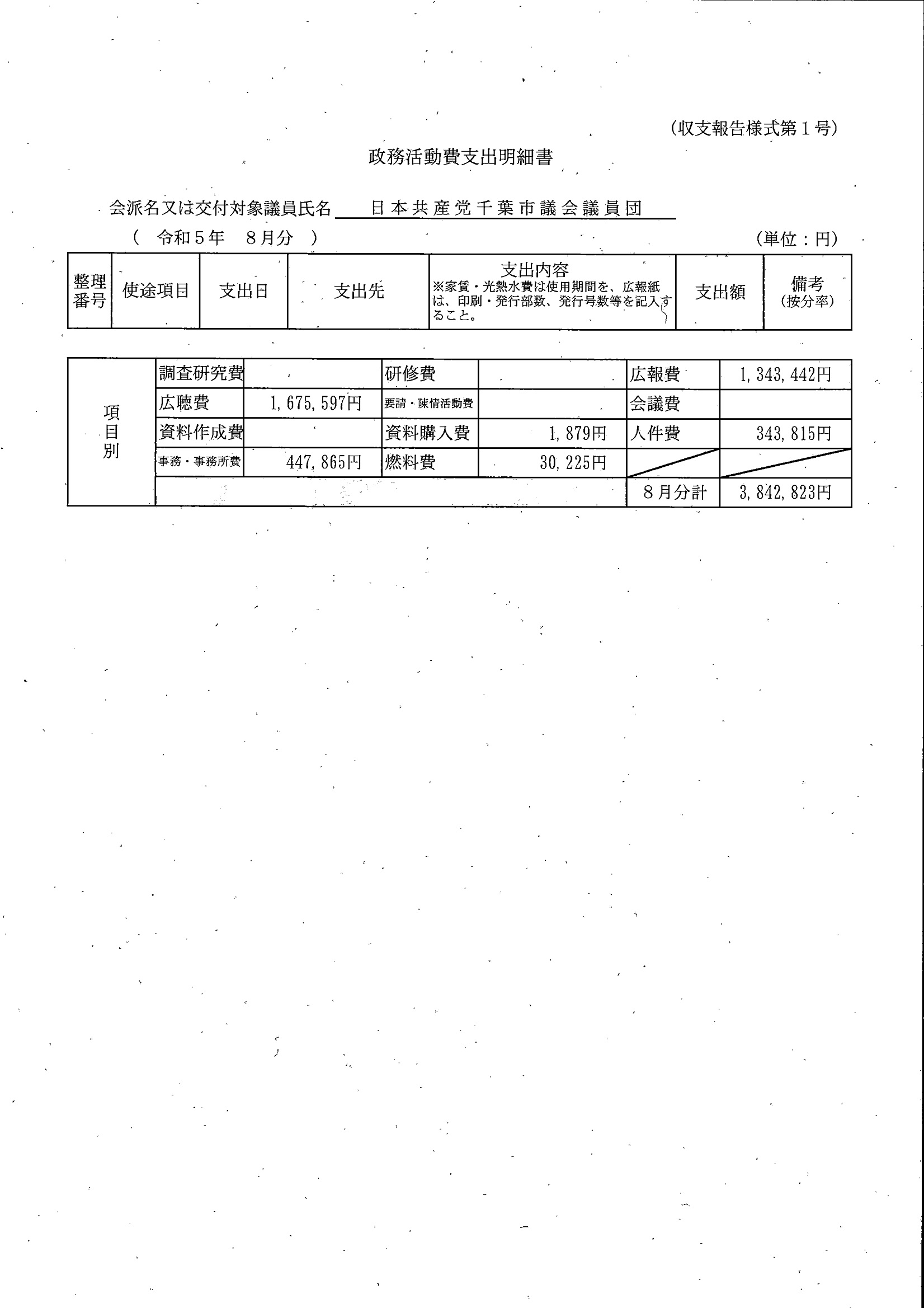 千葉市議会トップページ > 広報・情報公開 > 政務活動費 > 令和5年度交付分(政務活動費収支報告書)