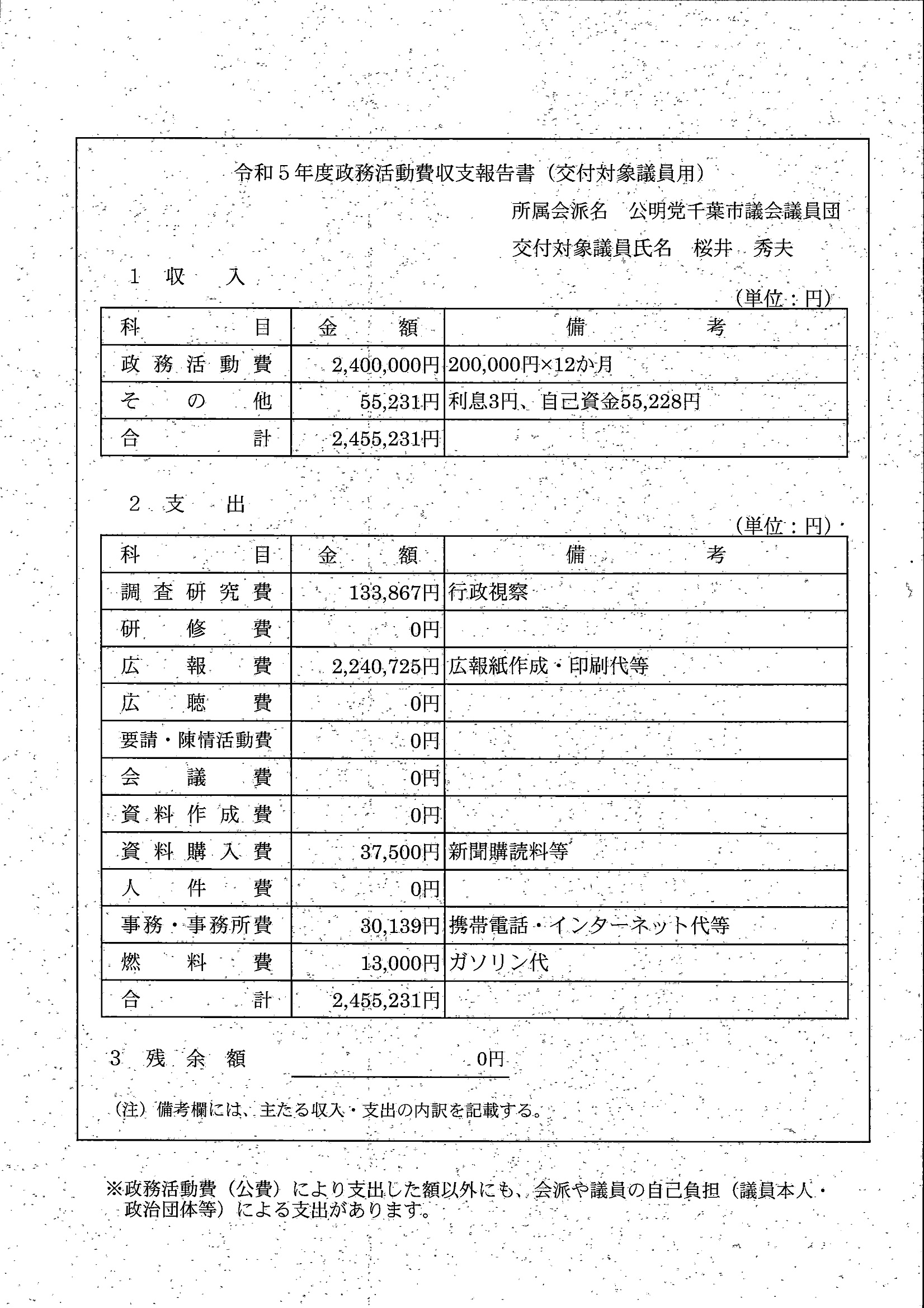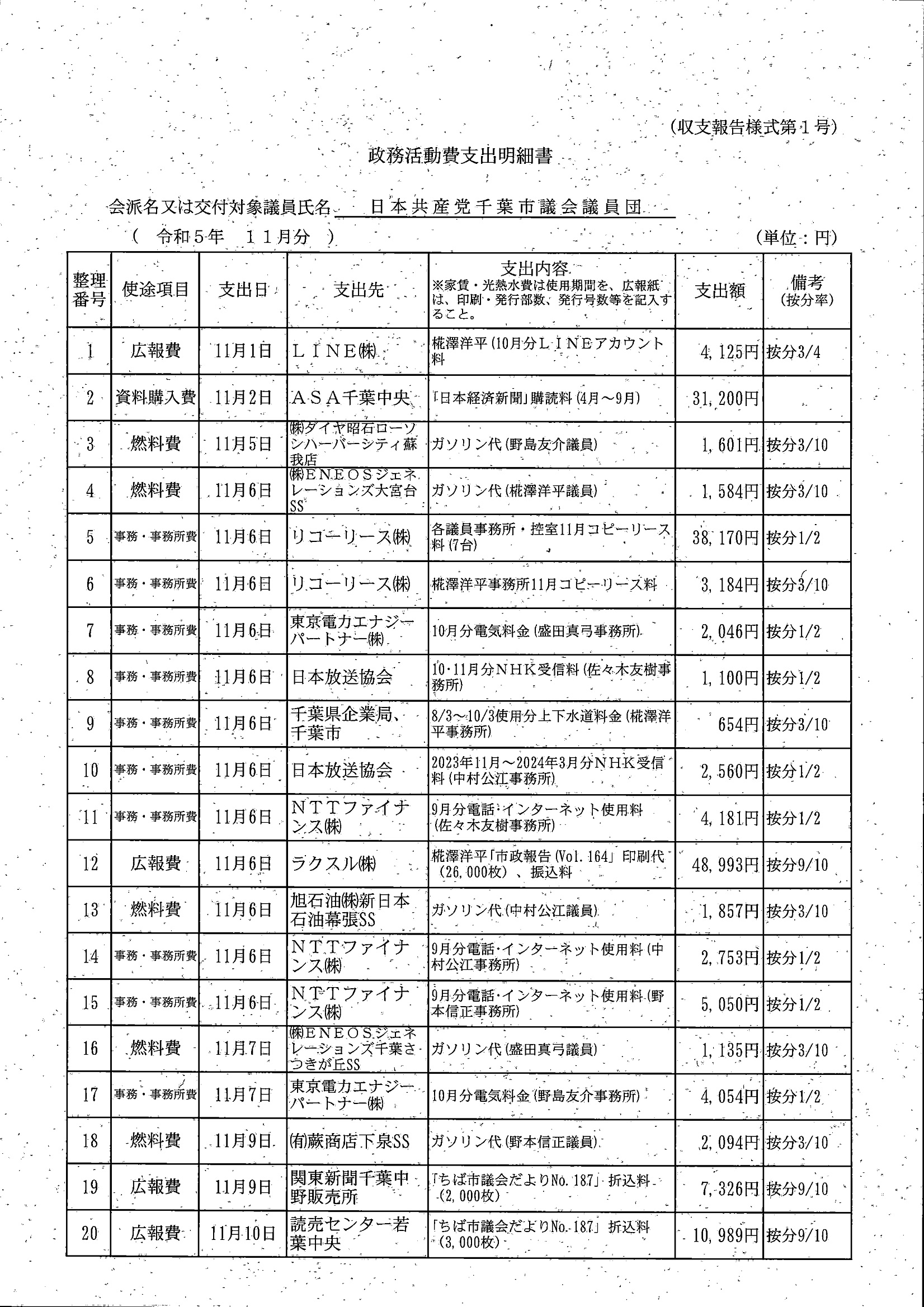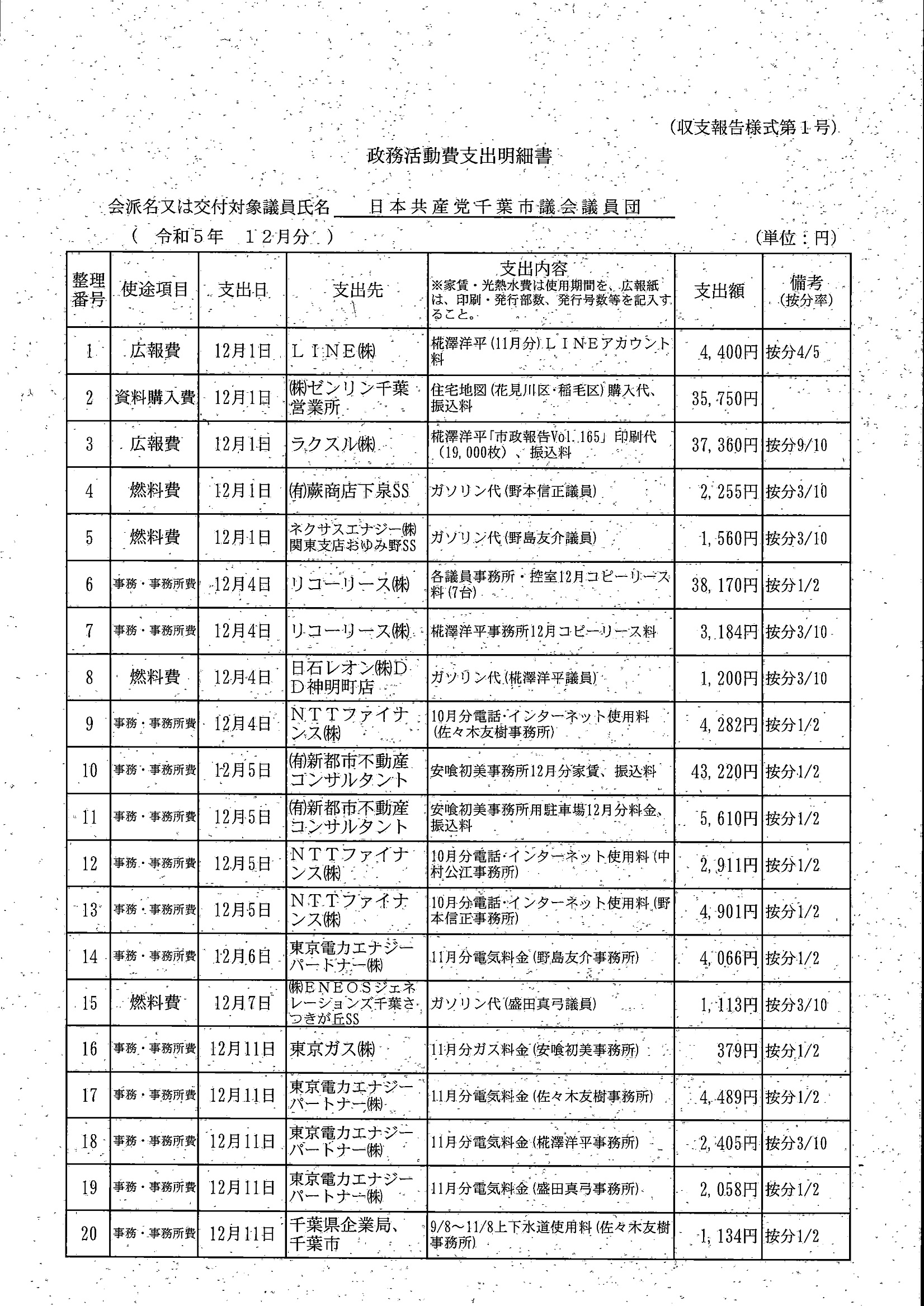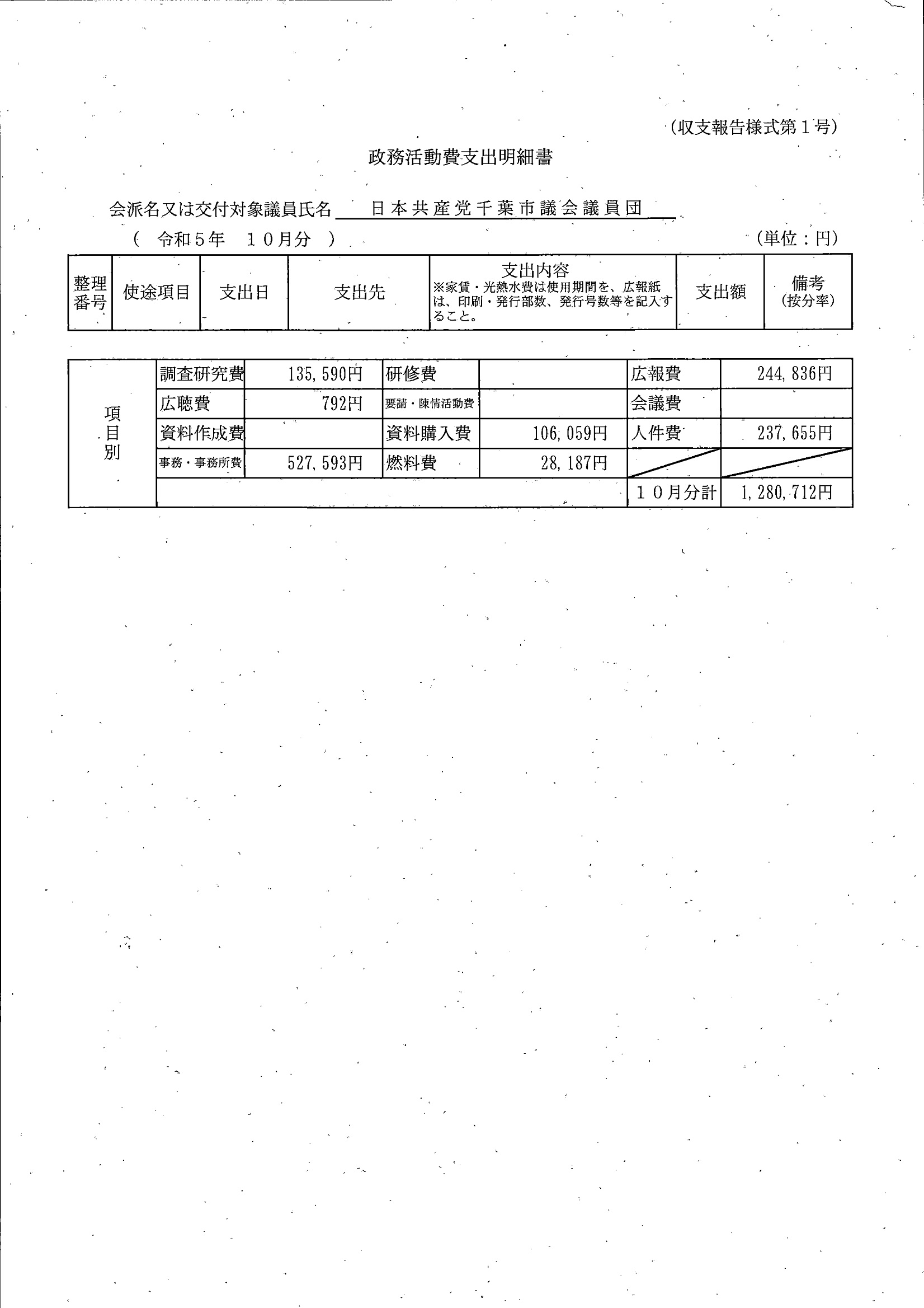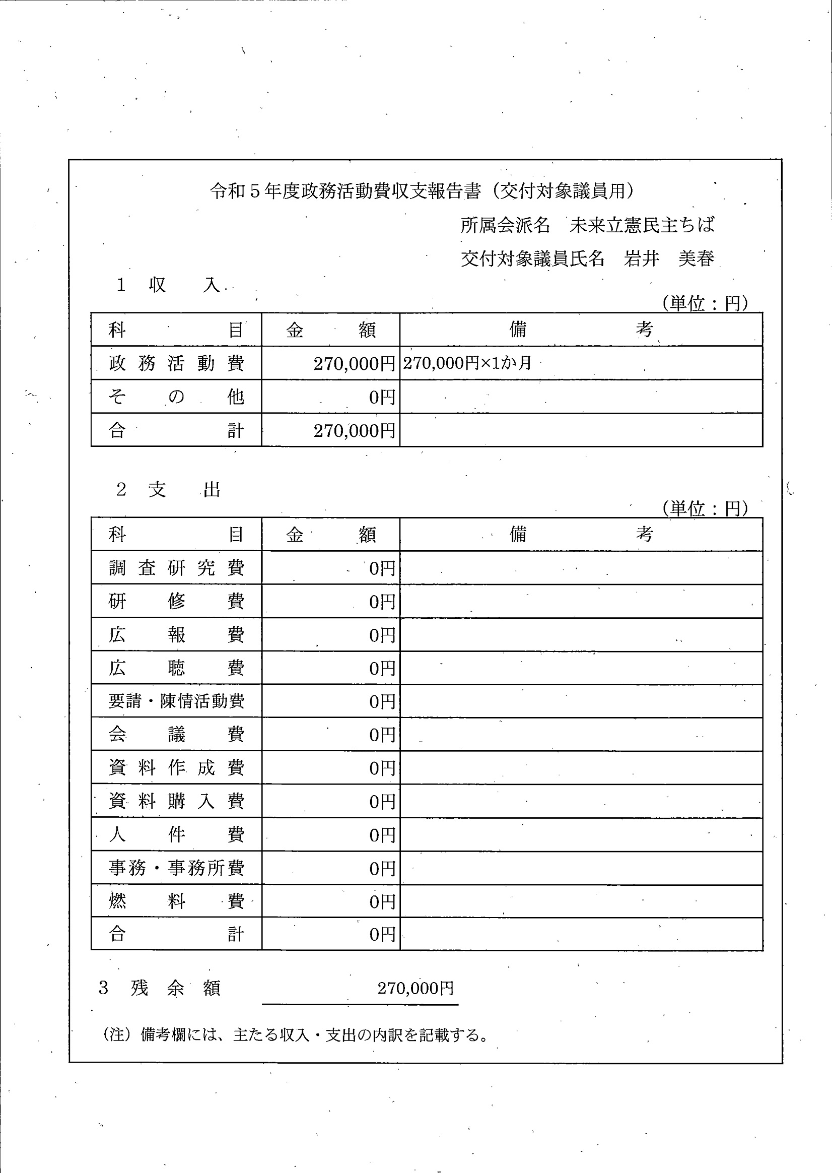 千葉市議会トップページ > 広報・情報公開 > 政務活動費 > 令和5年度交付分(政務活動費収支報告書)