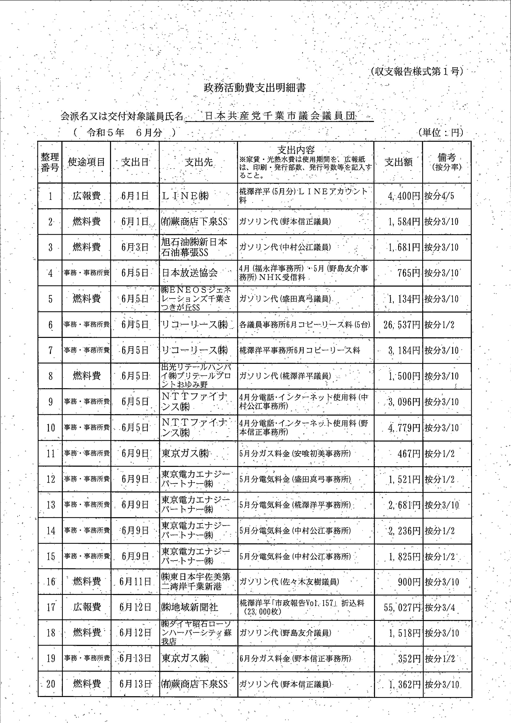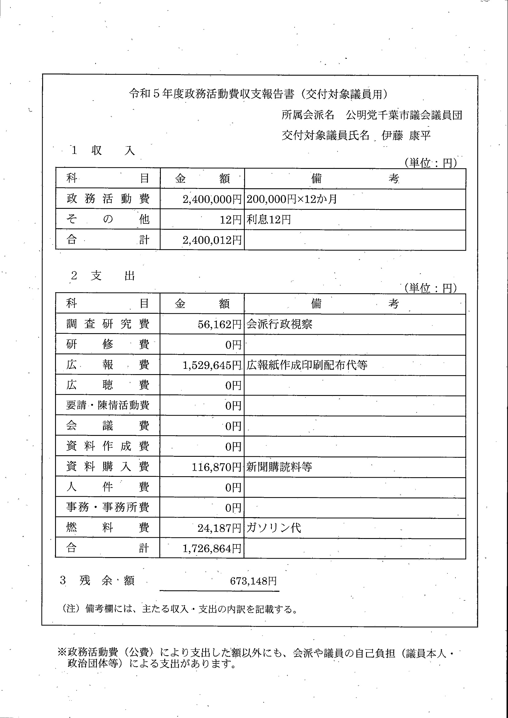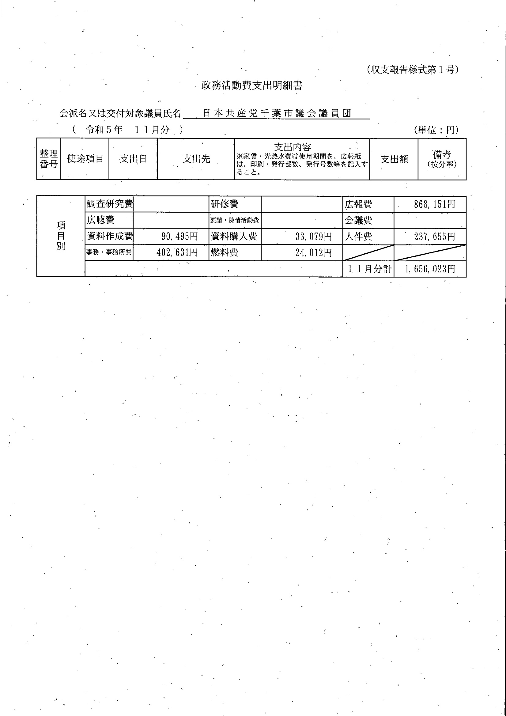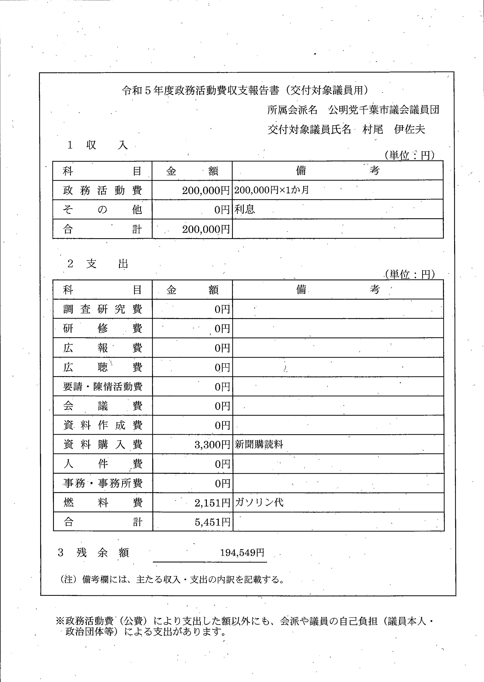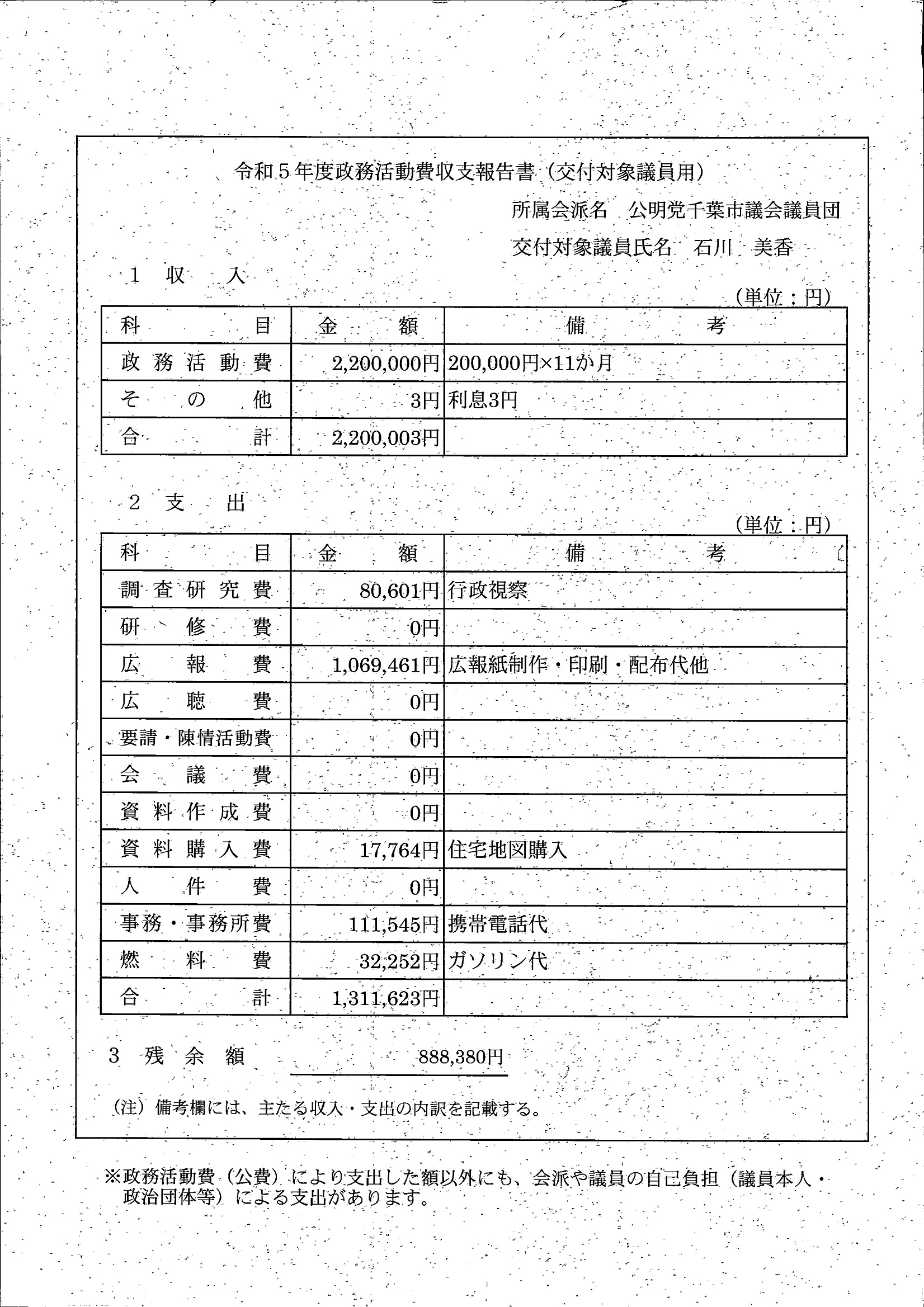 千葉市議会トップページ > 広報・情報公開 > 政務活動費 > 令和5年度交付分(政務活動費収支報告書)