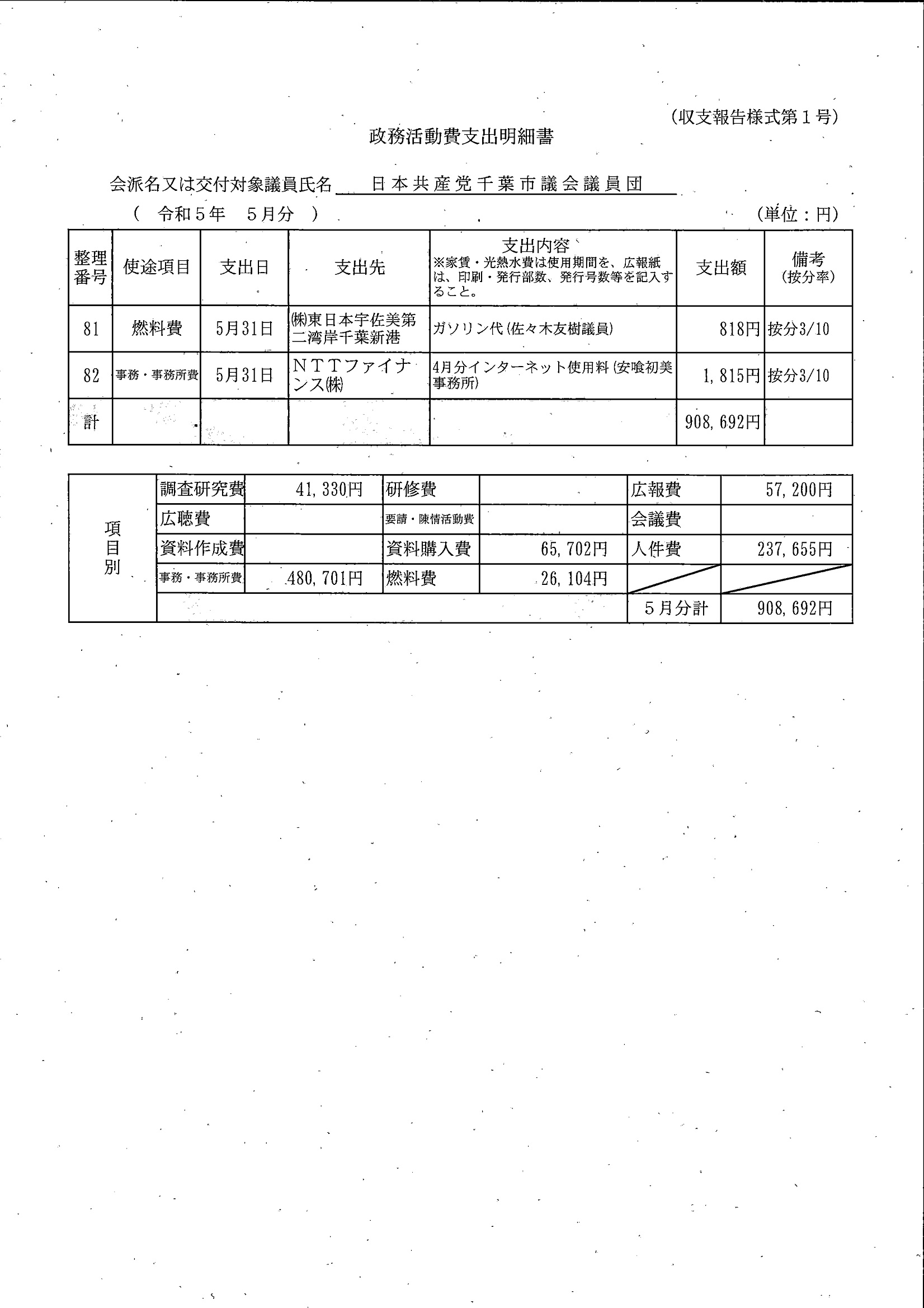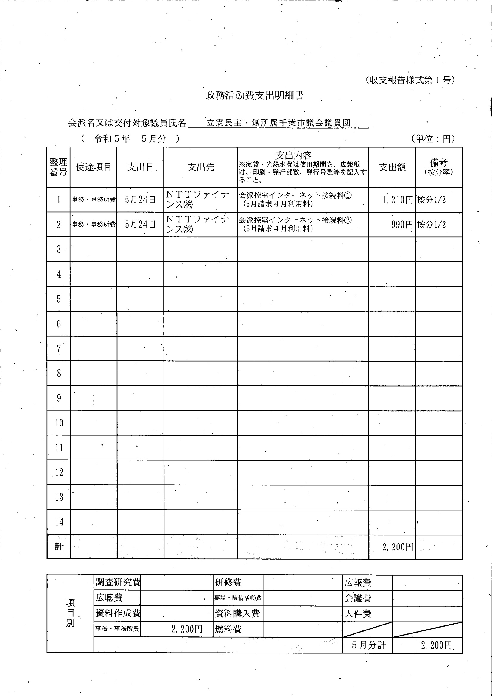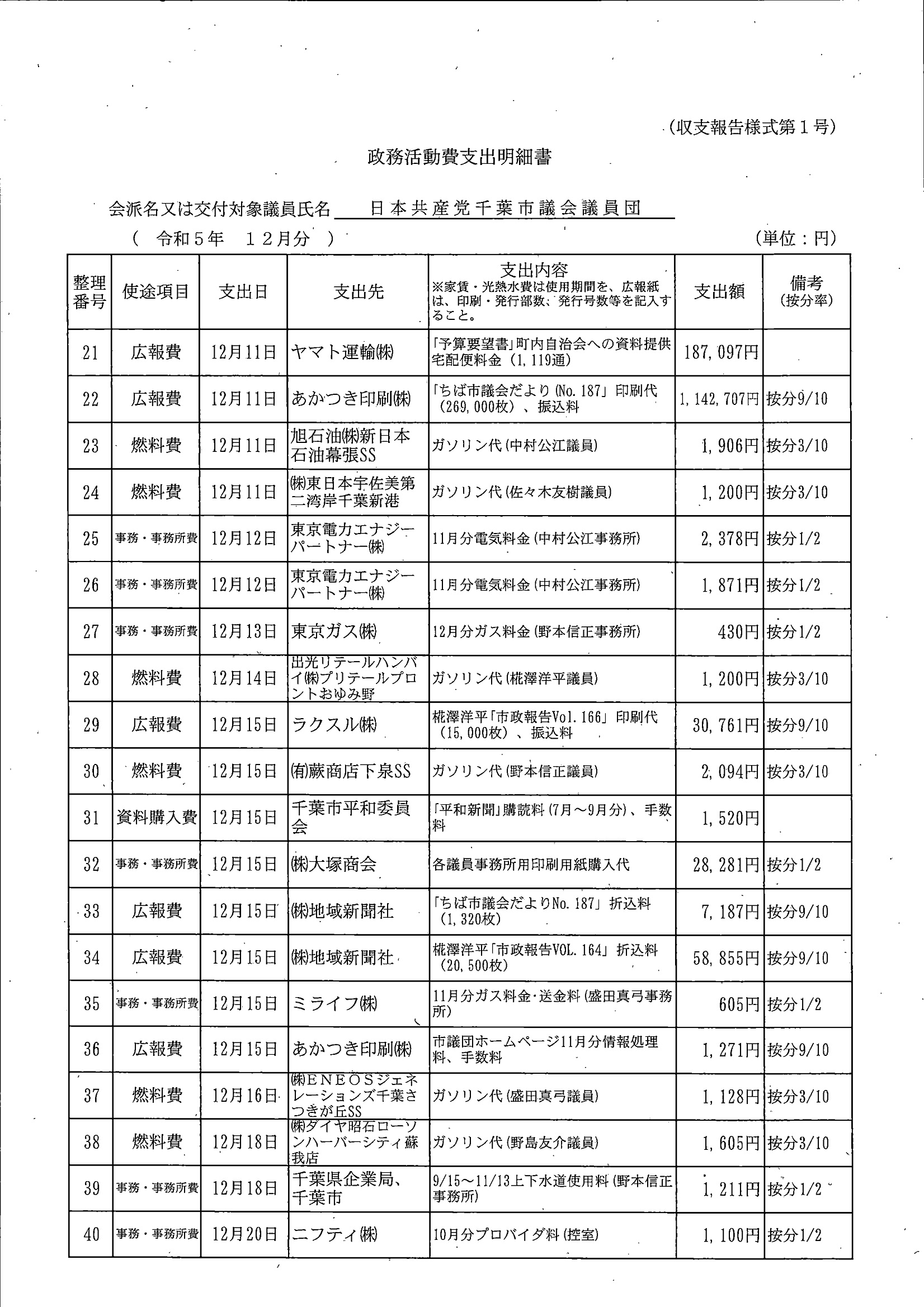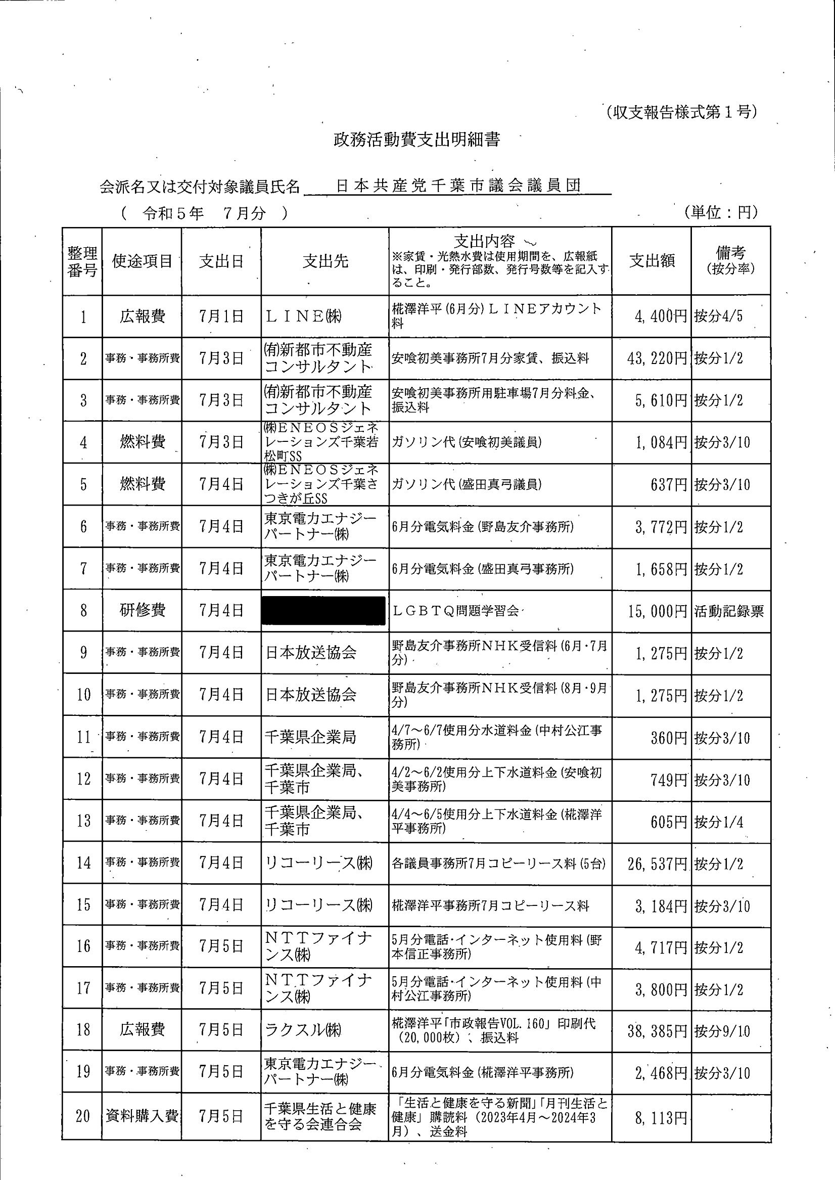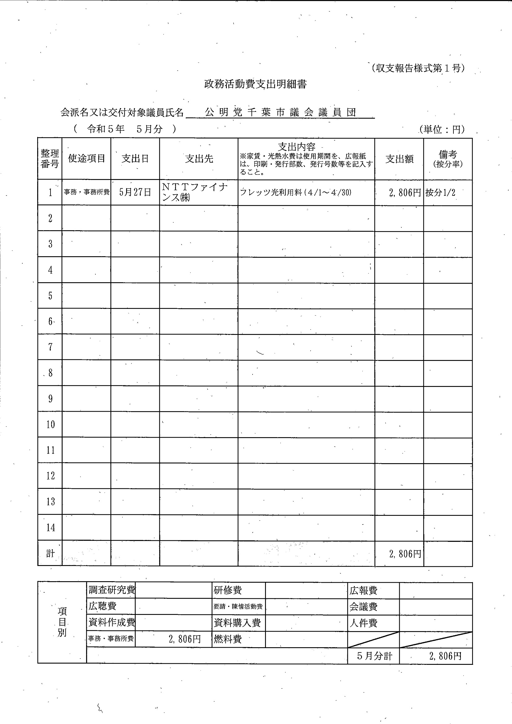 千葉市議会トップページ > 広報・情報公開 > 政務活動費 > 令和5年度交付分(政務活動費収支報告書)