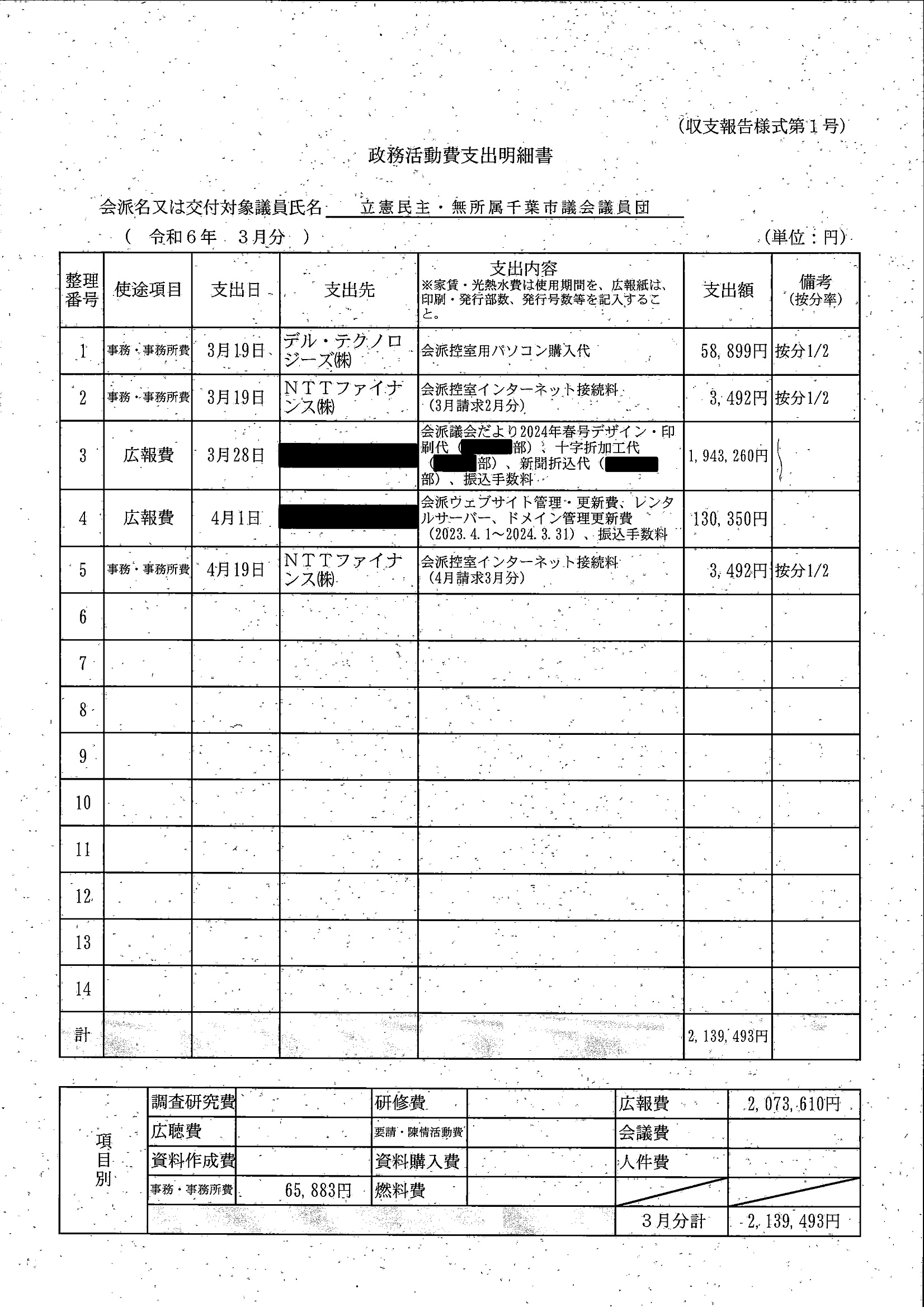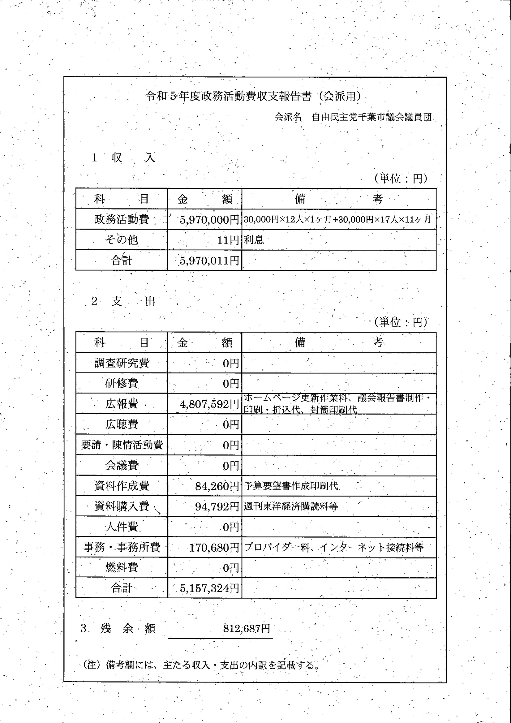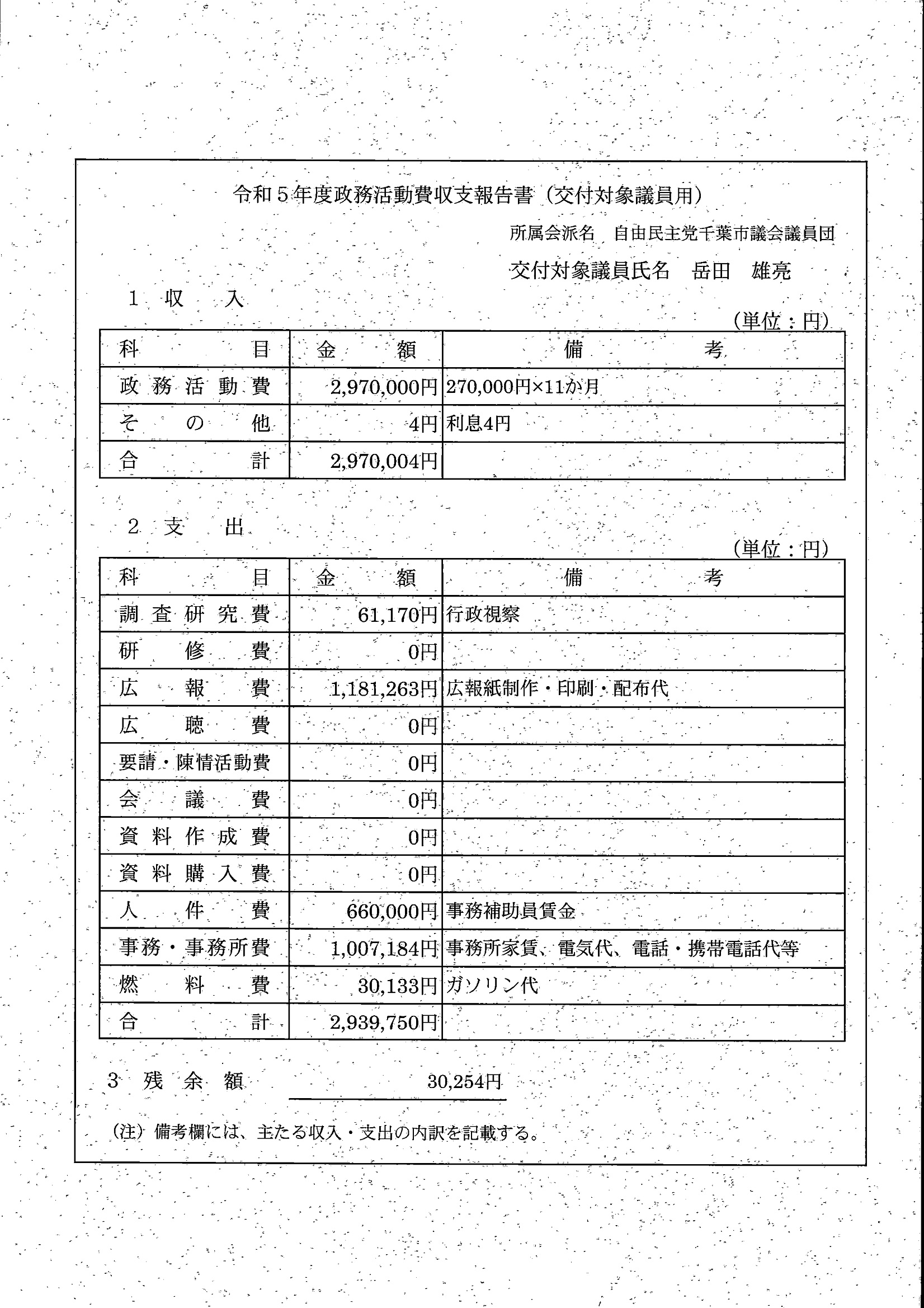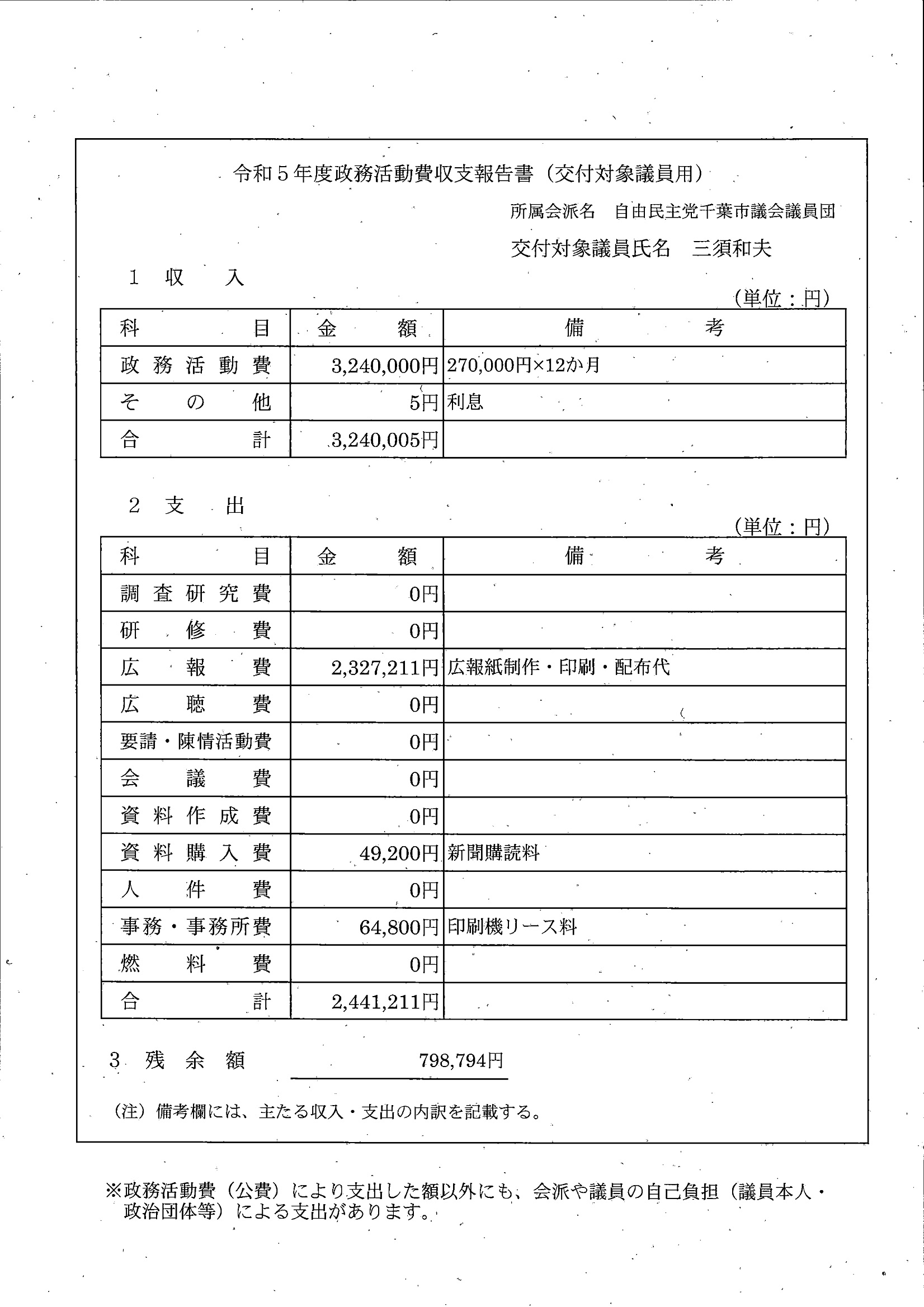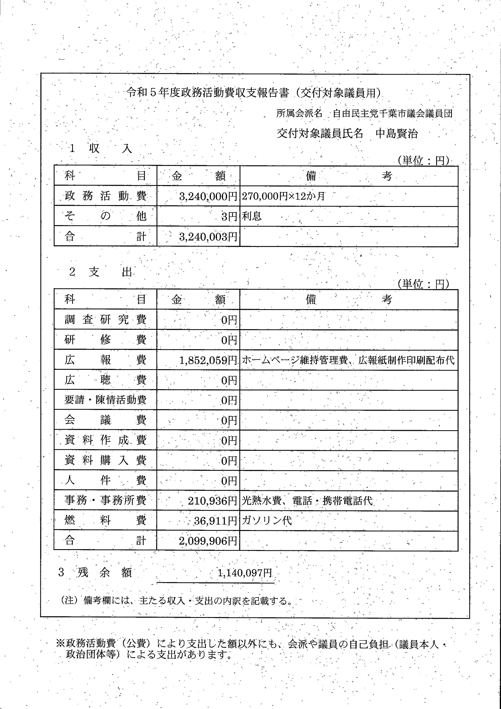 千葉市議会トップページ > 広報・情報公開 > 政務活動費 > 令和5年度交付分(政務活動費収支報告書)