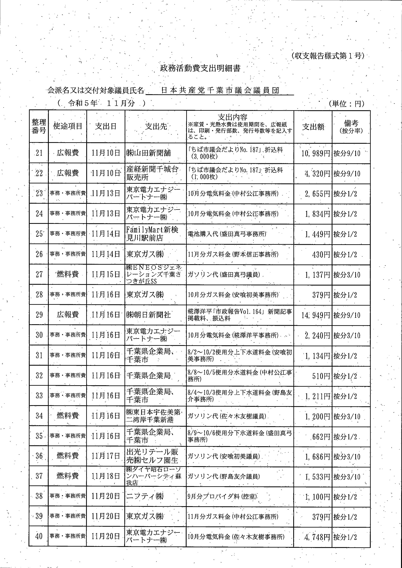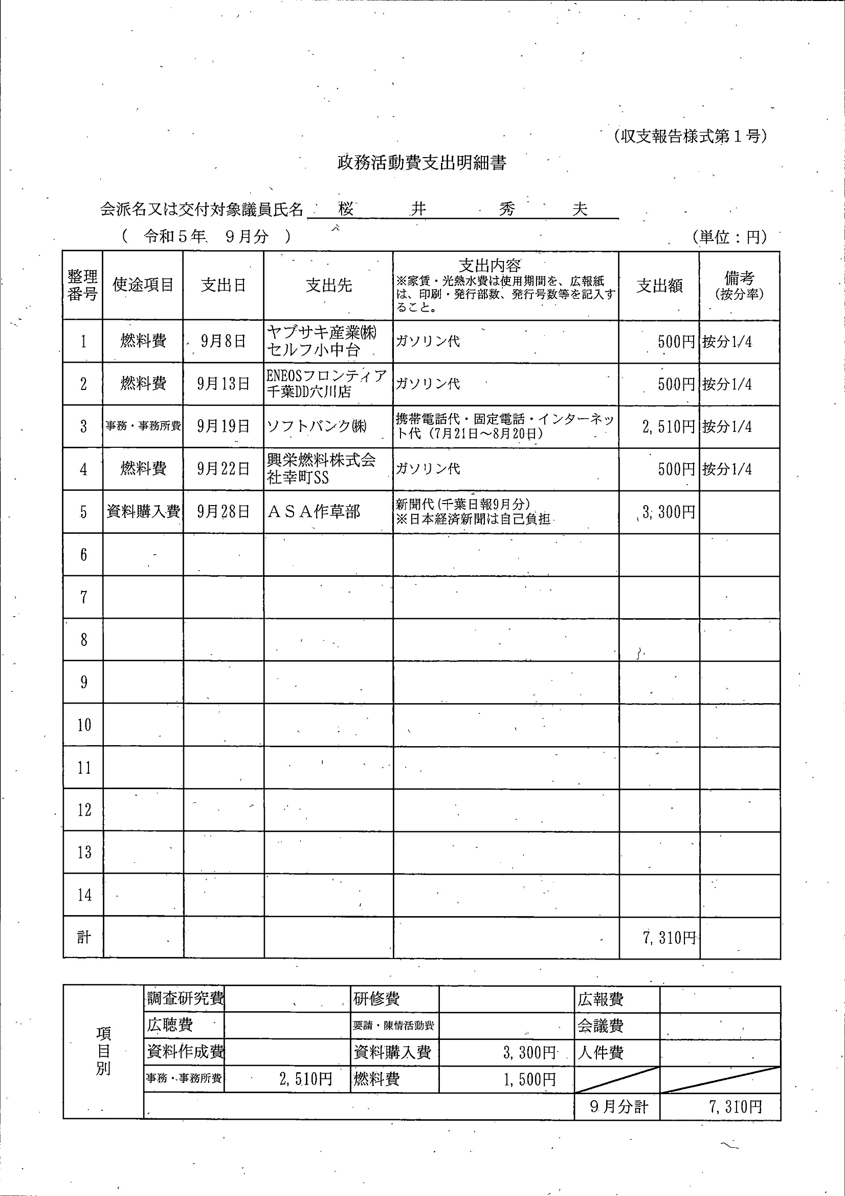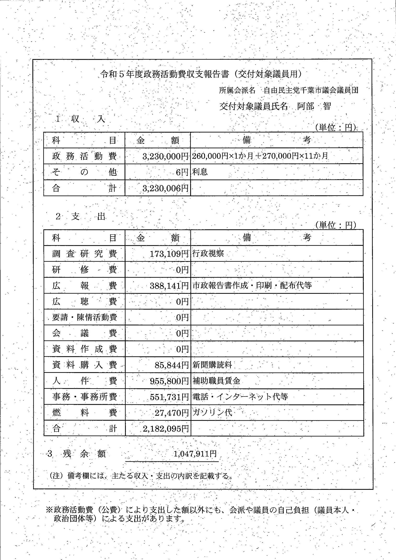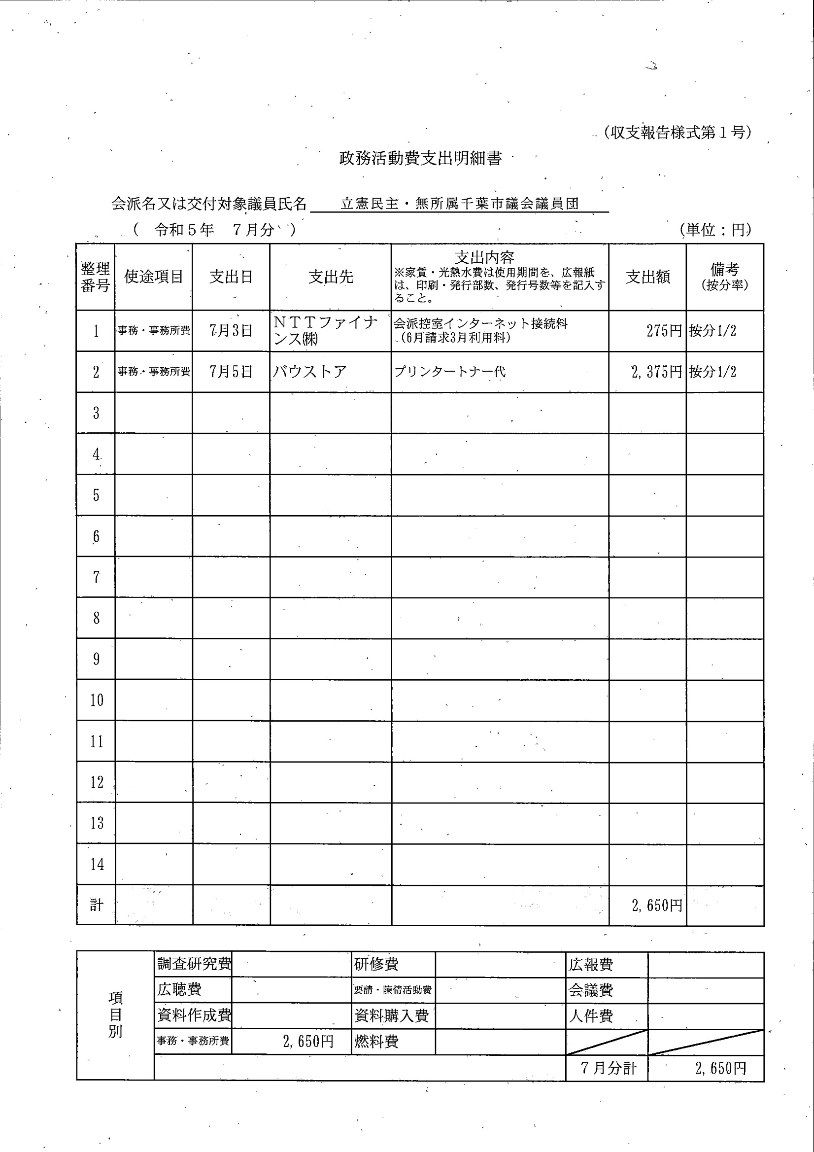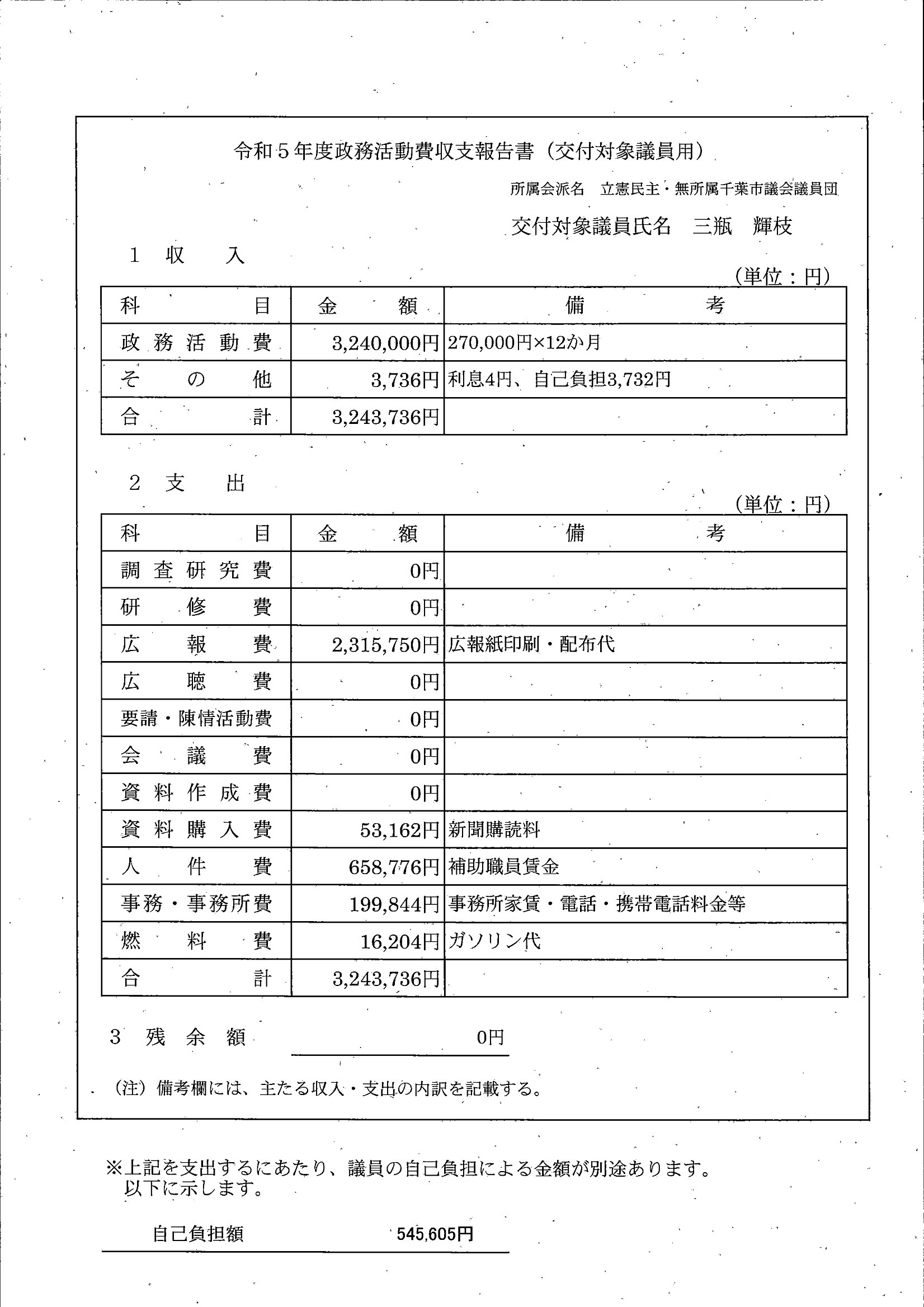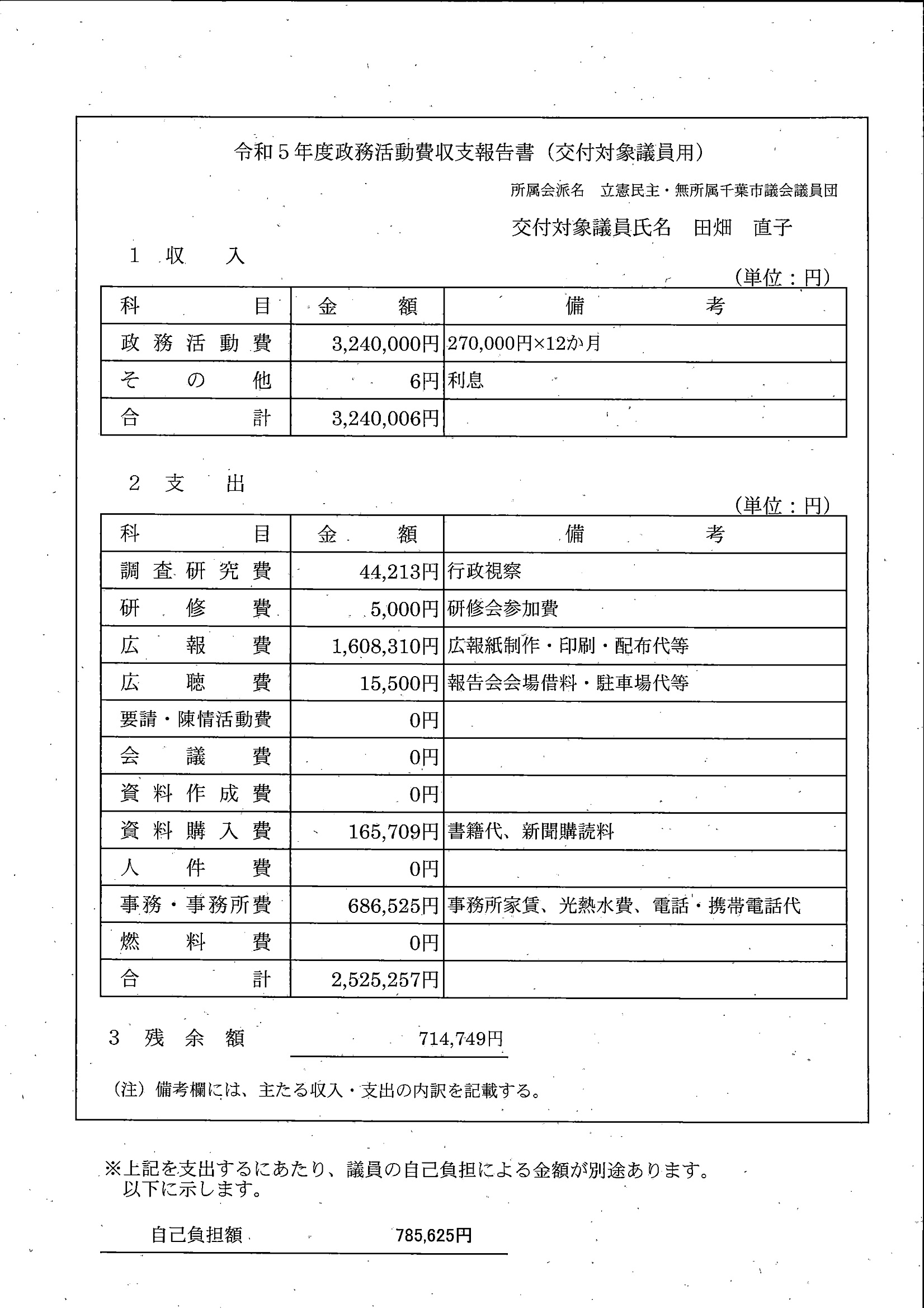 千葉市議会トップページ > 広報・情報公開 > 政務活動費 > 令和5年度交付分(政務活動費収支報告書)