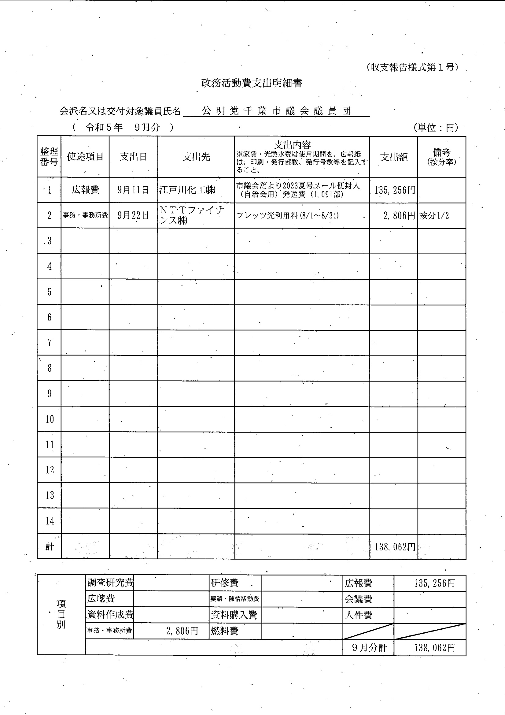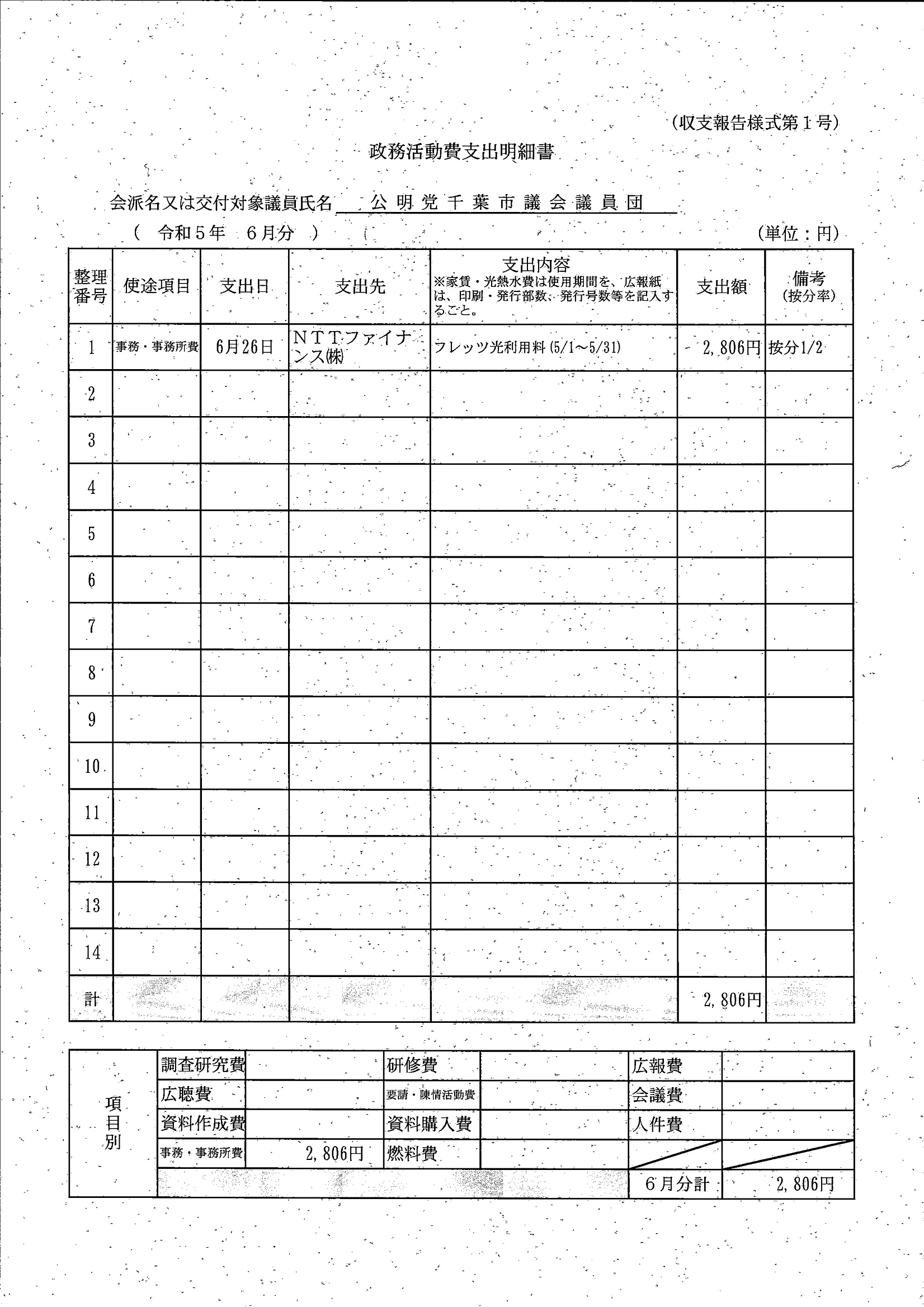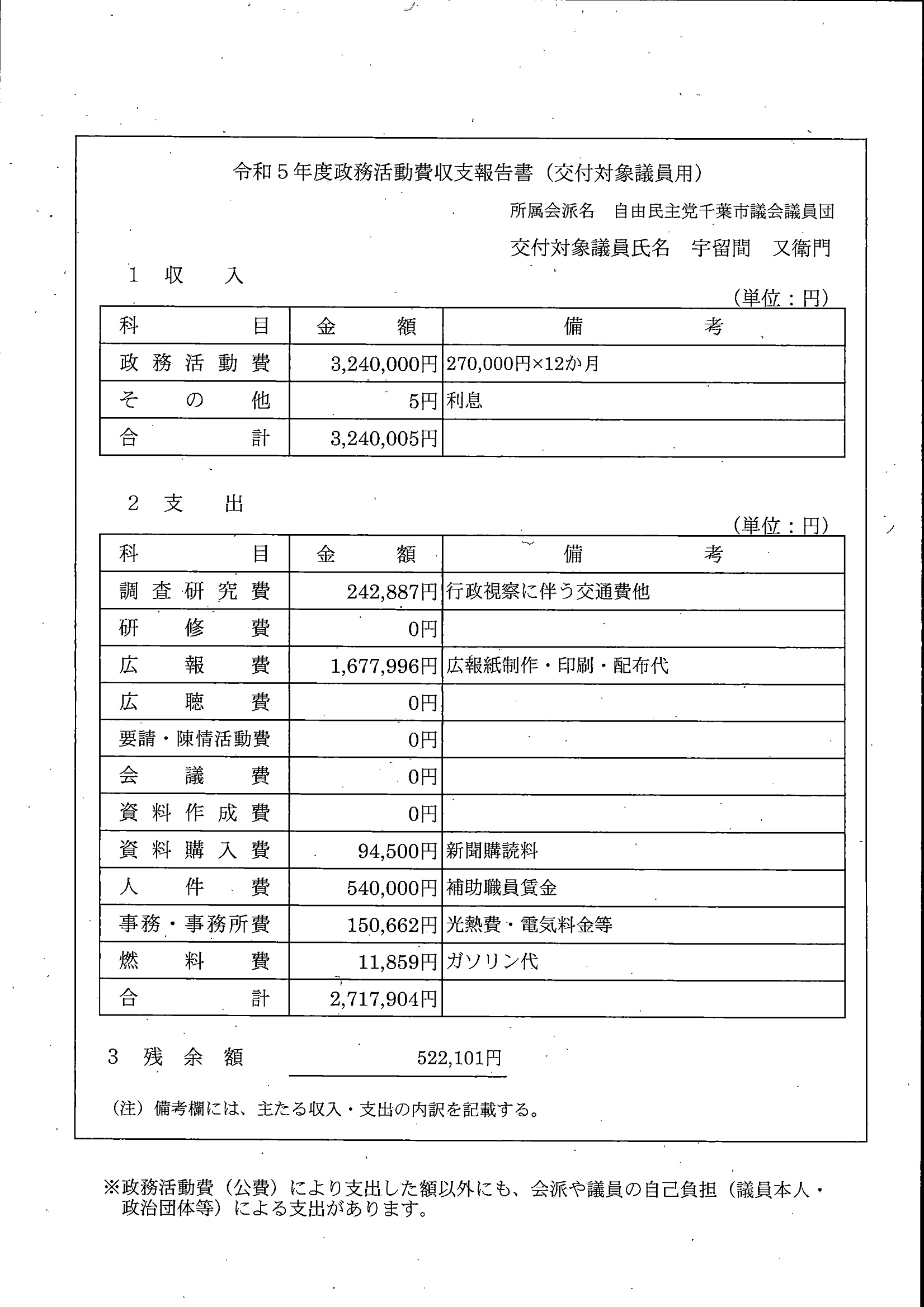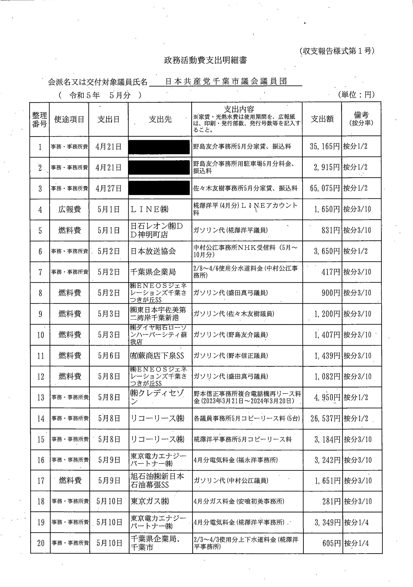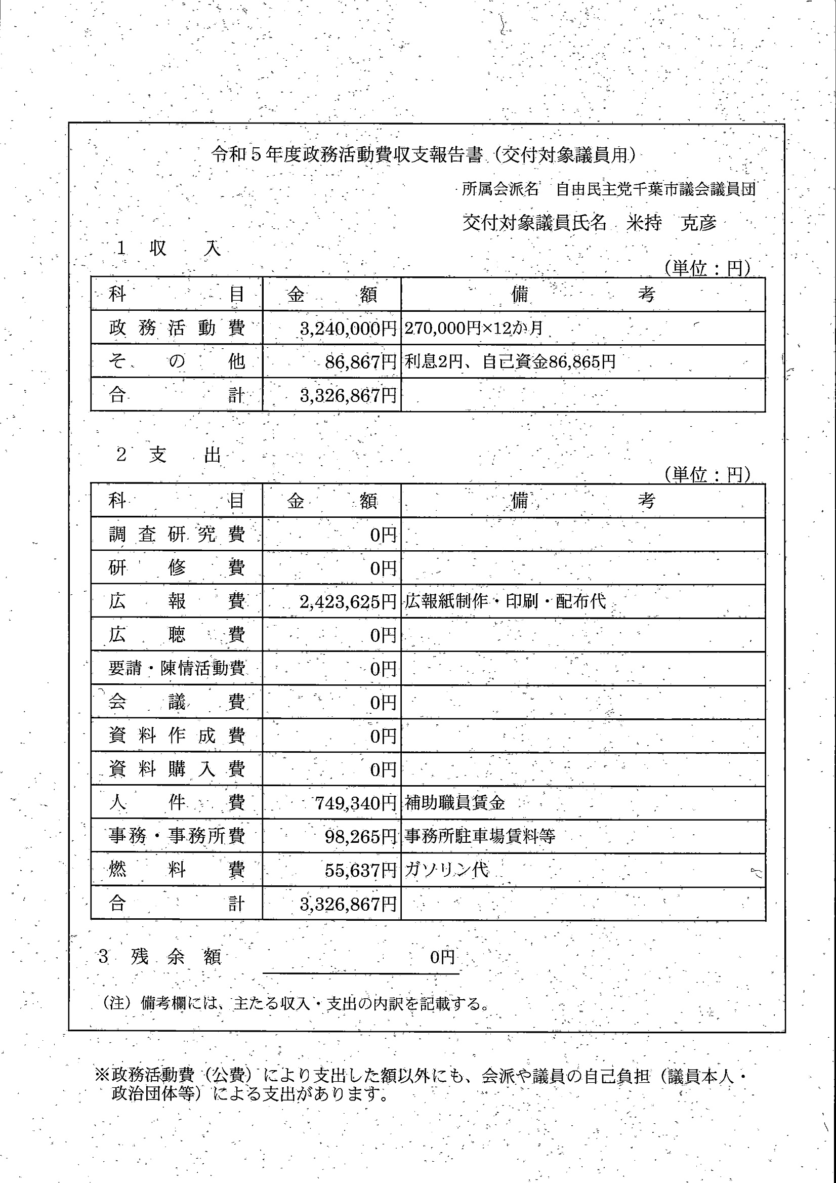 千葉市議会トップページ > 広報・情報公開 > 政務活動費 > 令和5年度交付分(政務活動費収支報告書)