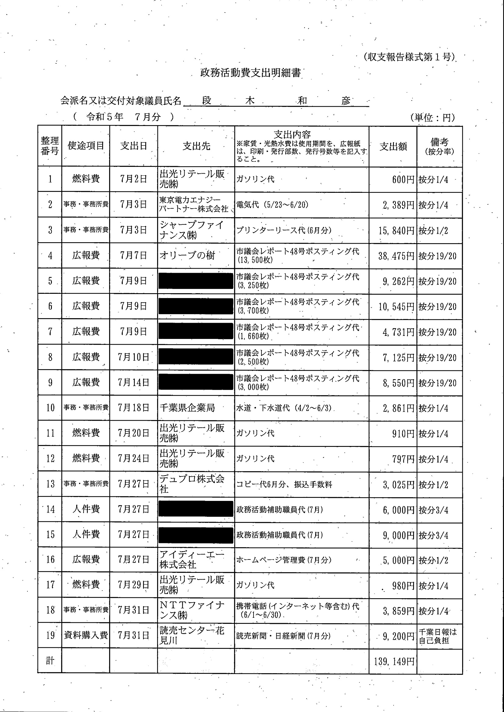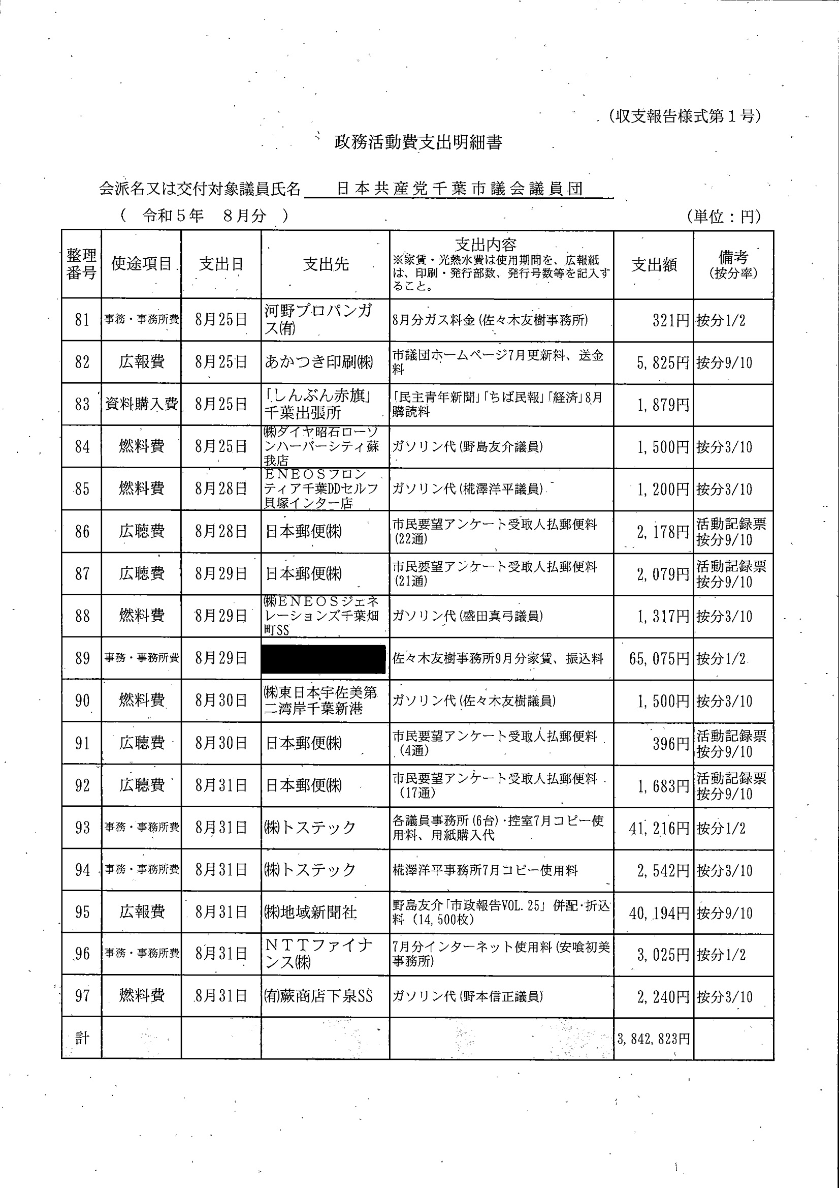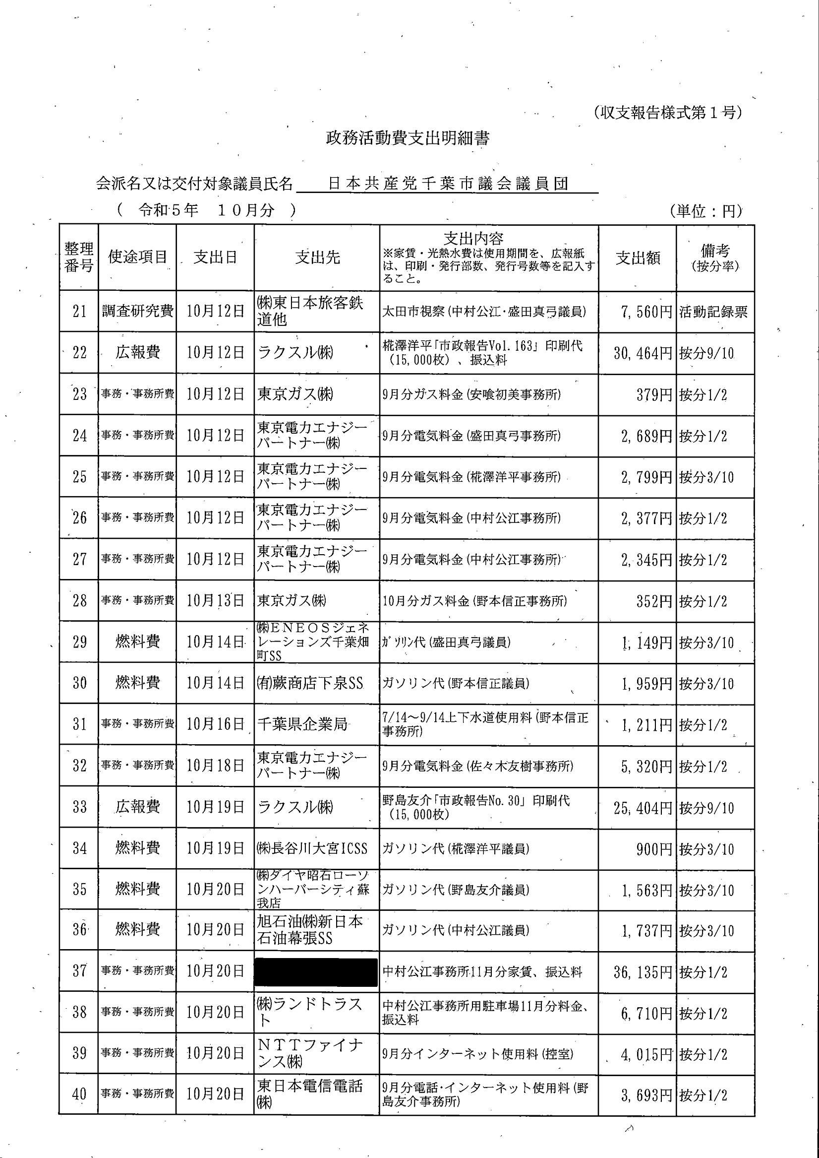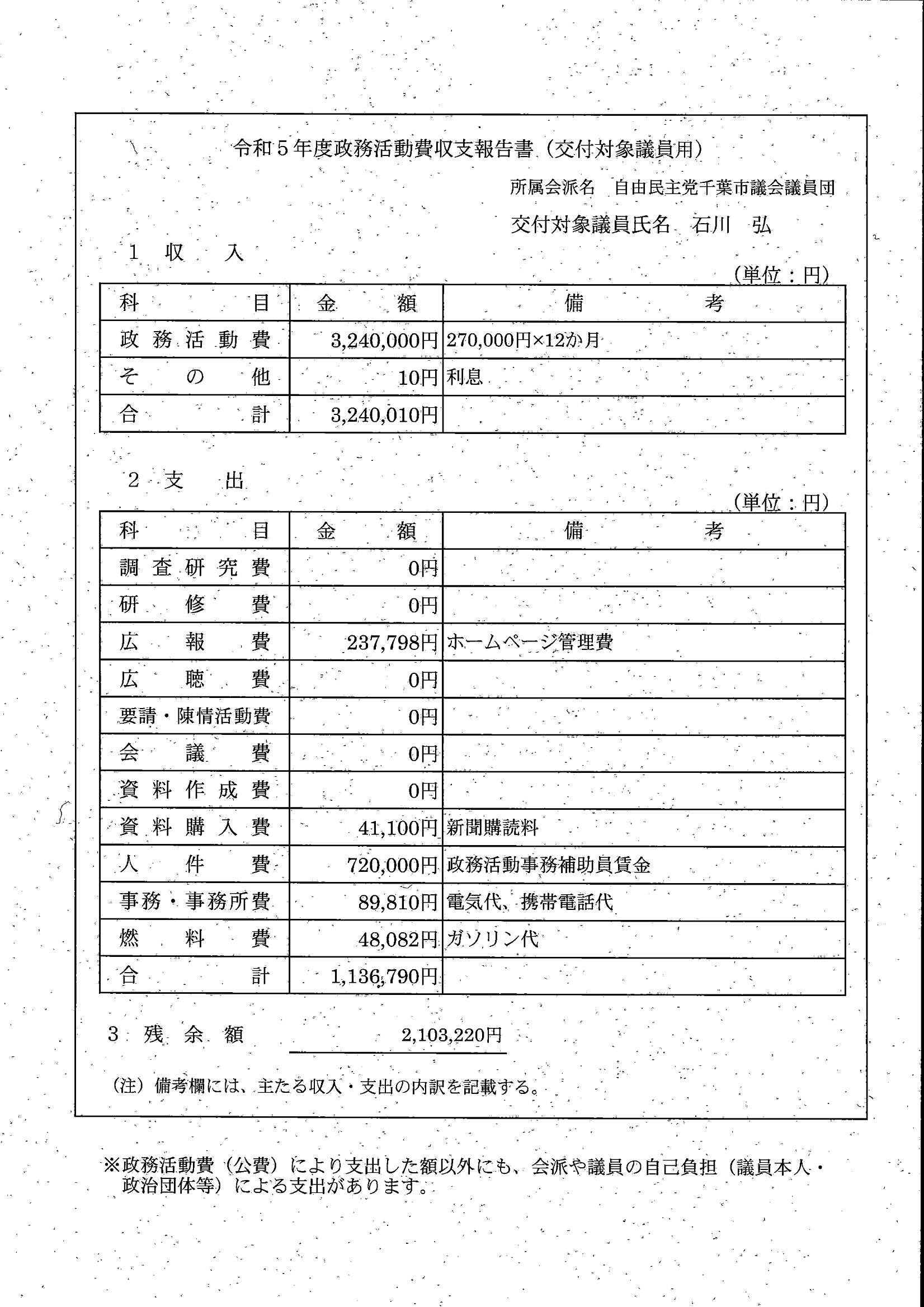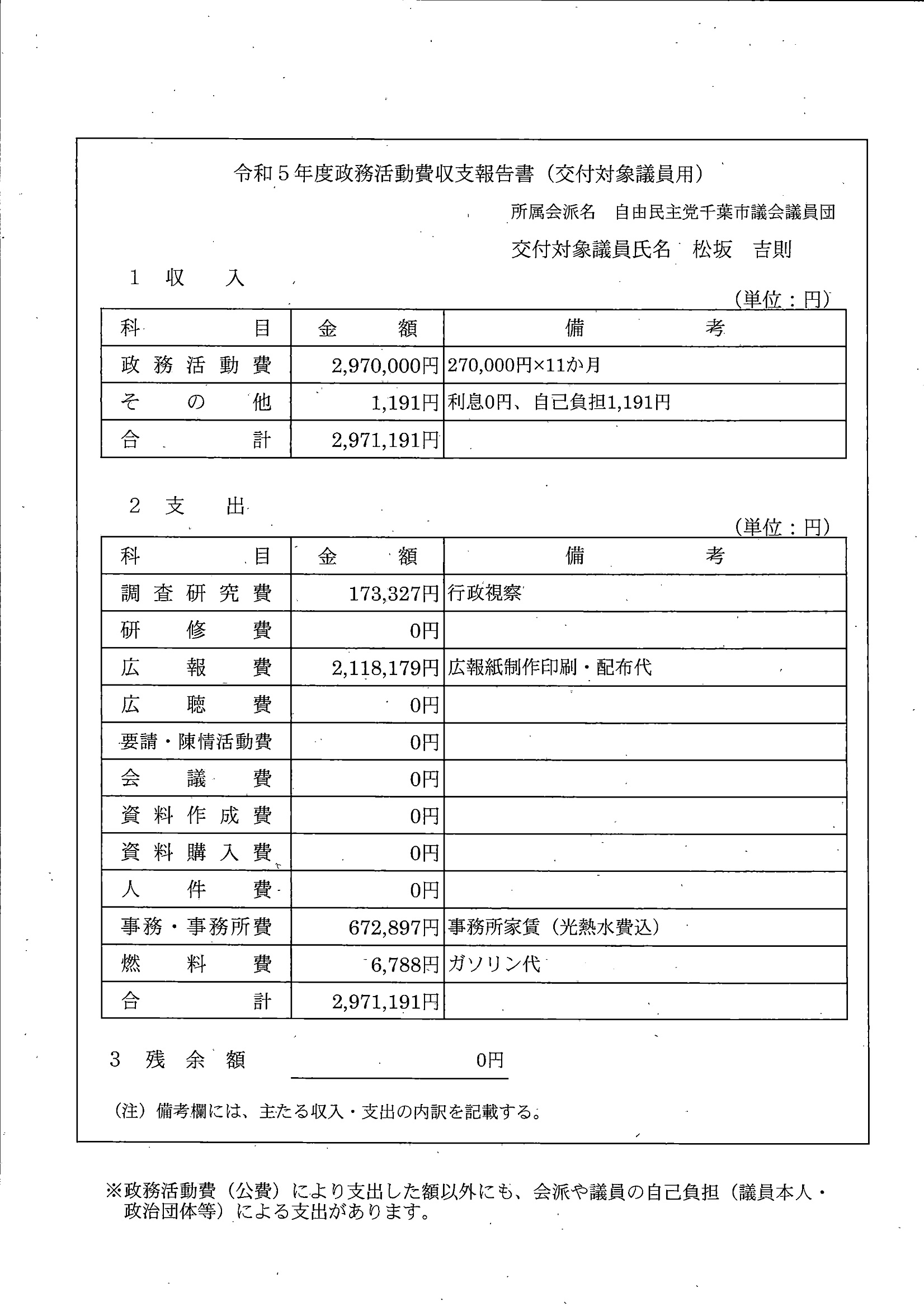 千葉市議会トップページ > 広報・情報公開 > 政務活動費 > 令和5年度交付分(政務活動費収支報告書)