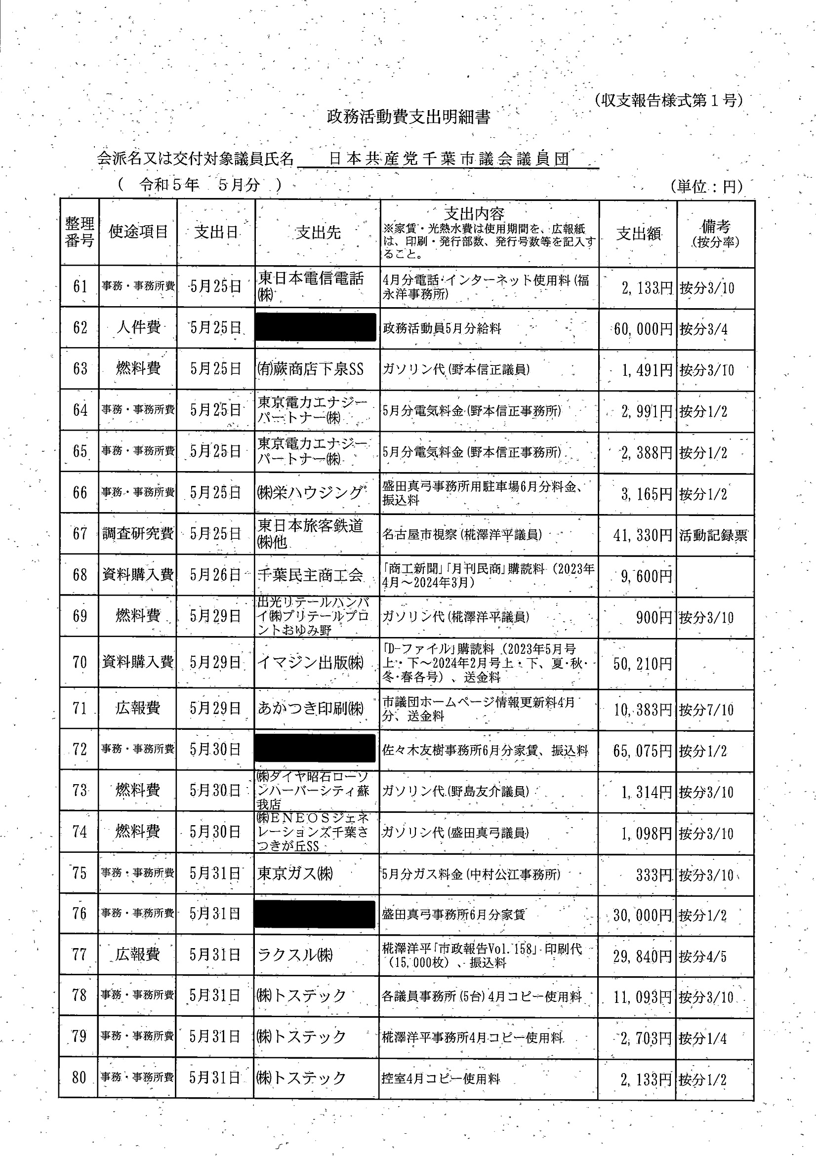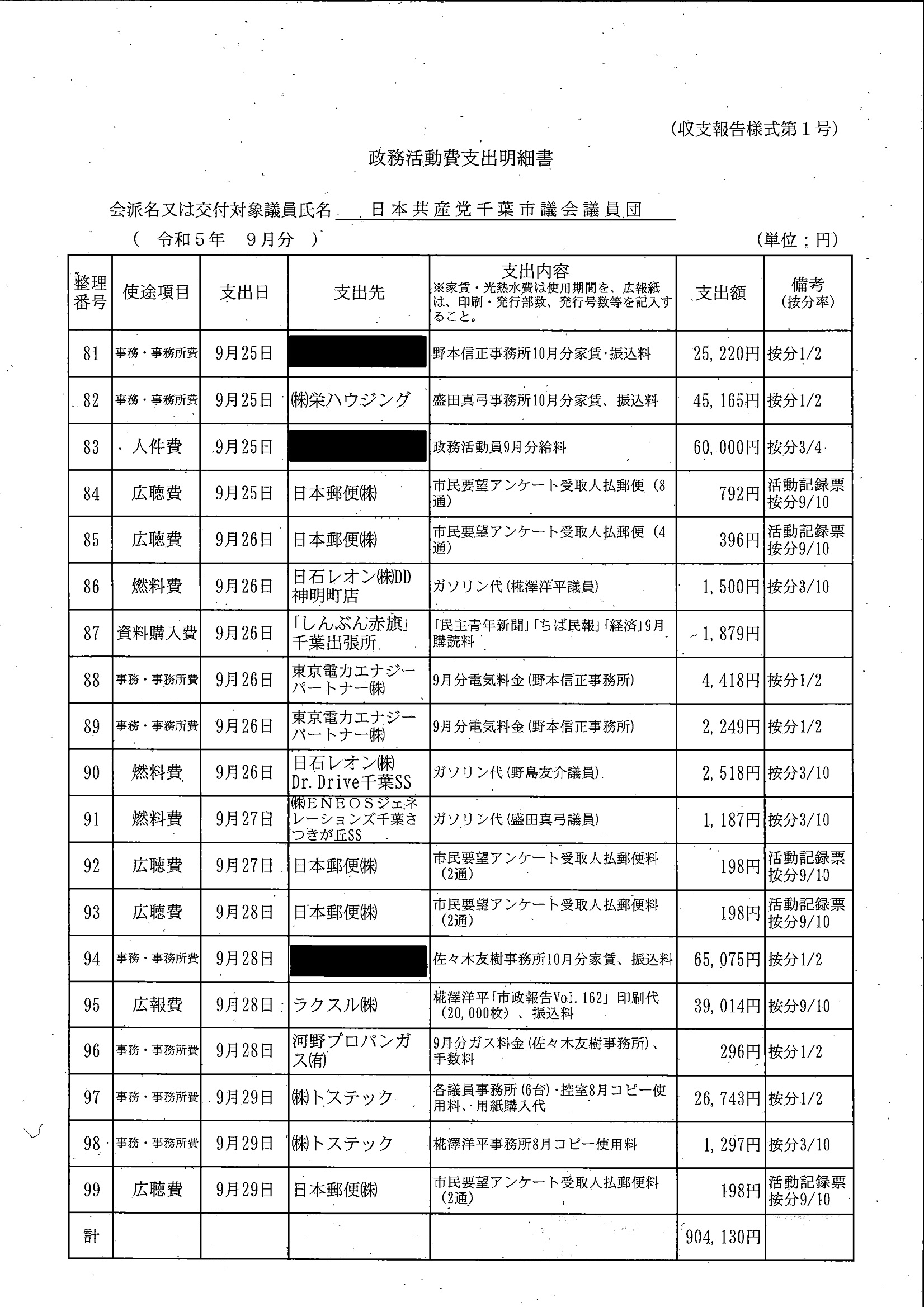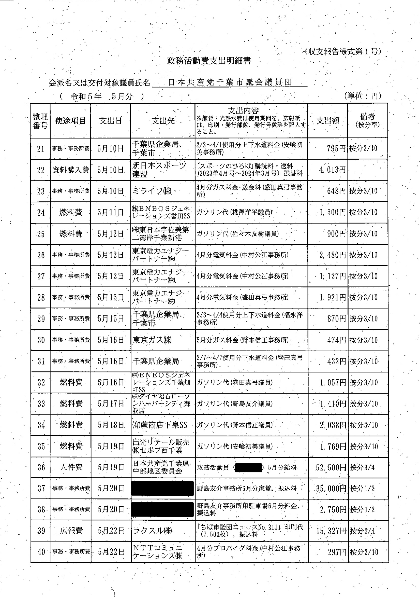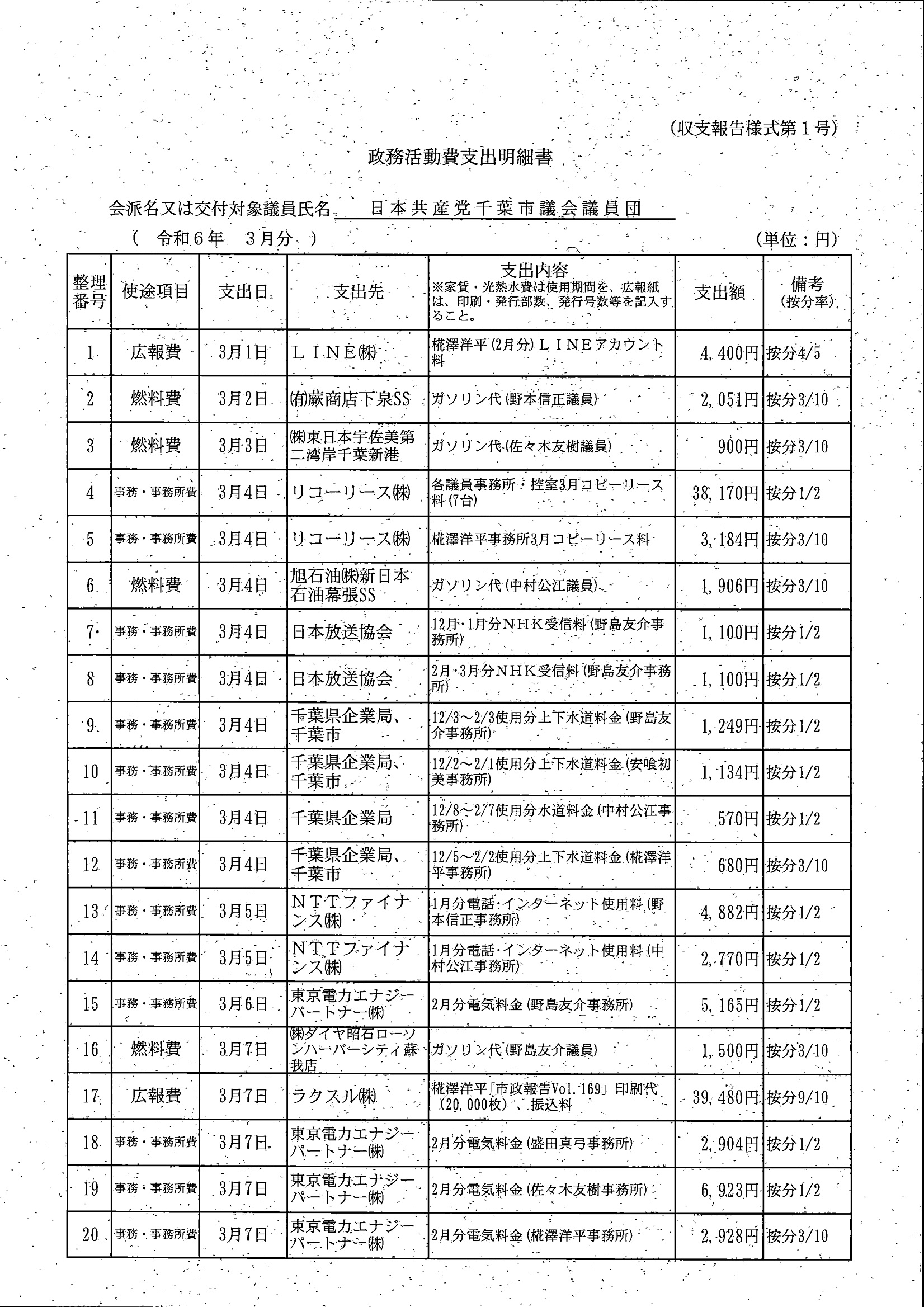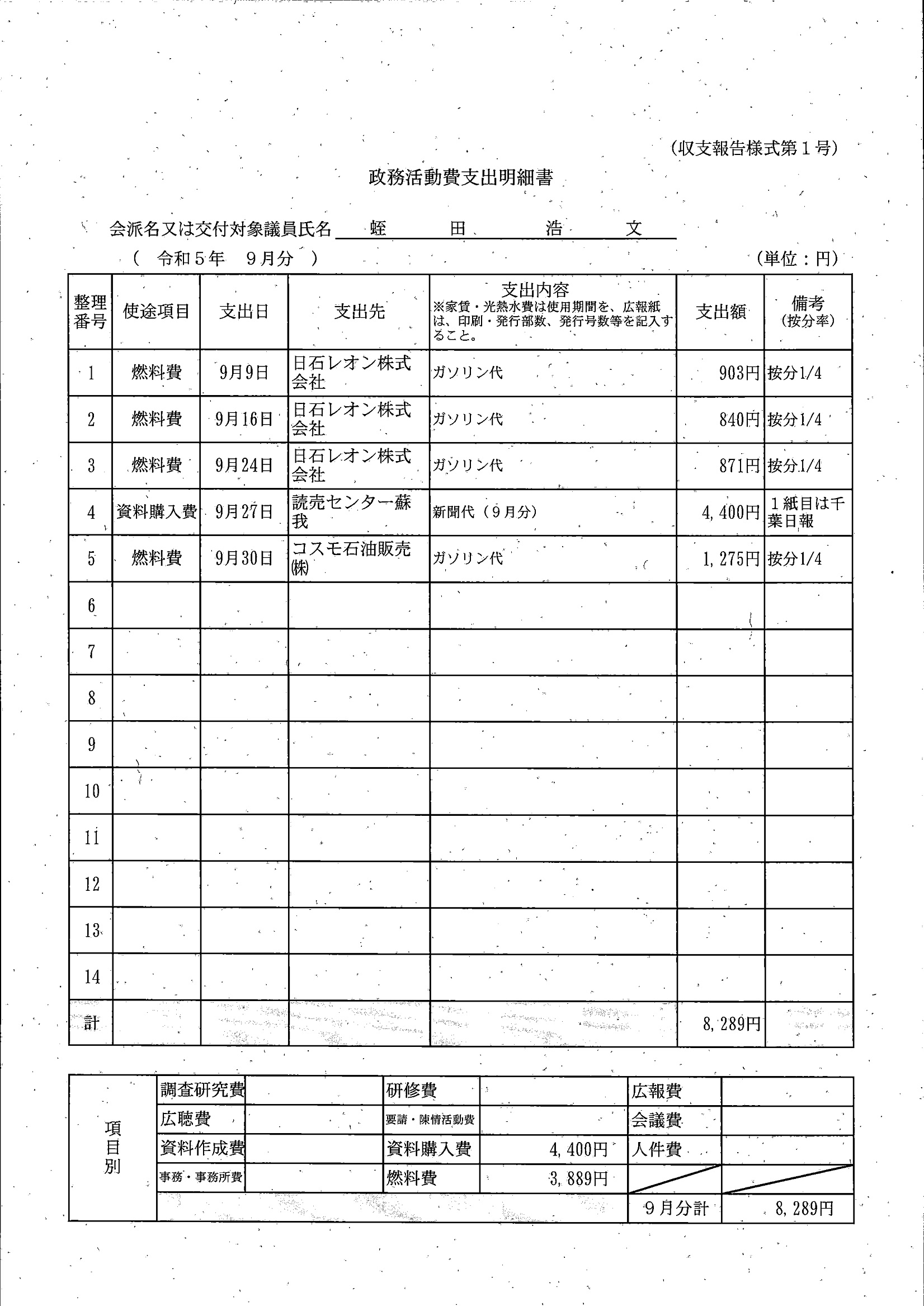 千葉市議会トップページ > 広報・情報公開 > 政務活動費 > 令和5年度交付分(政務活動費収支報告書)