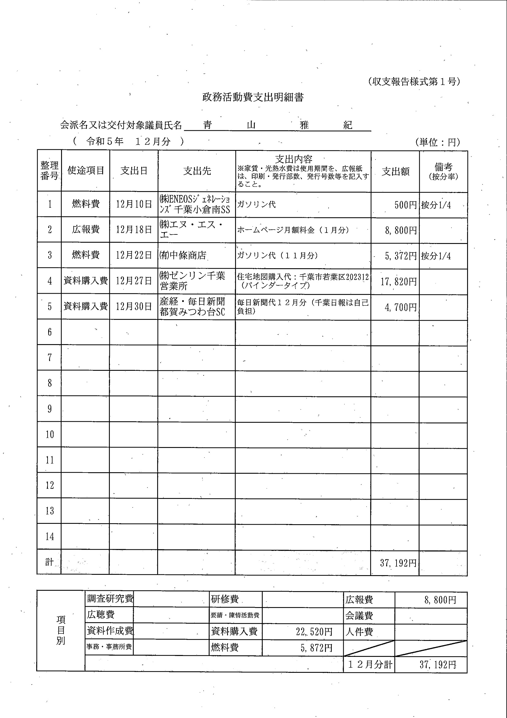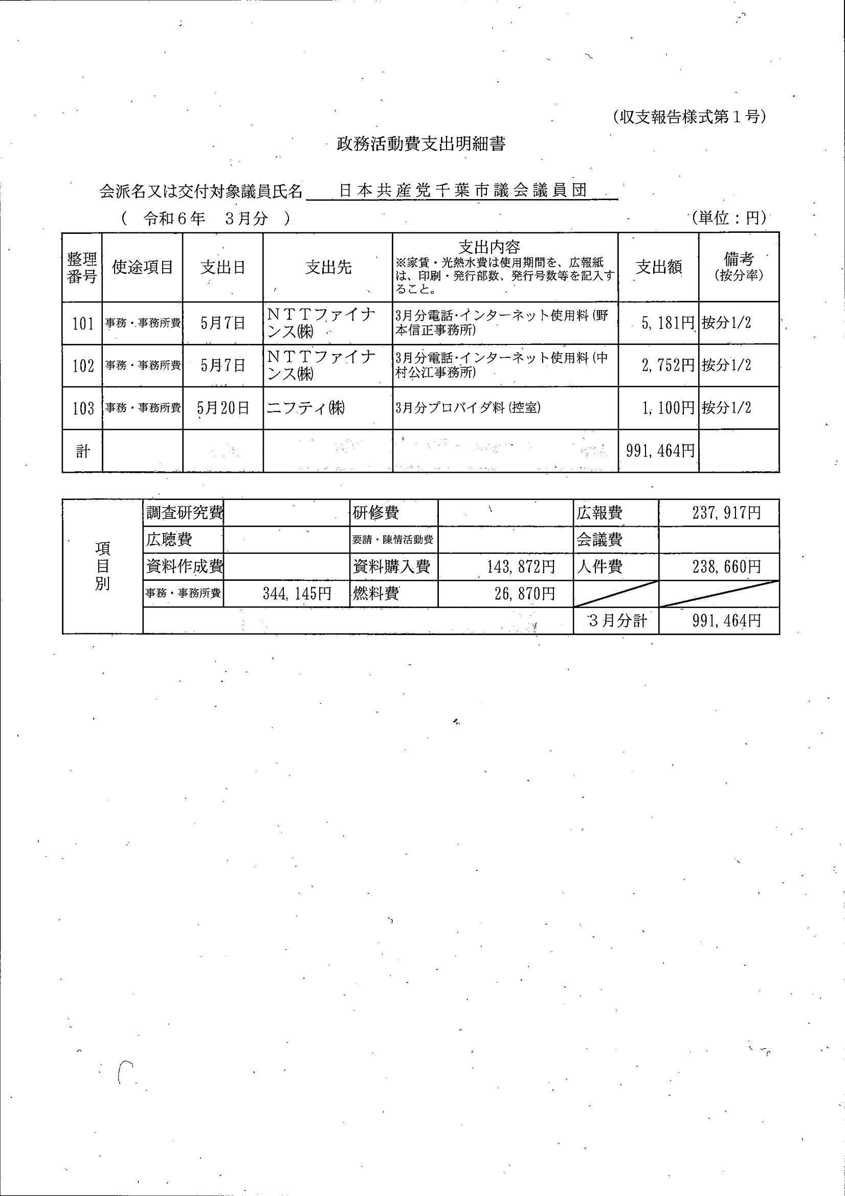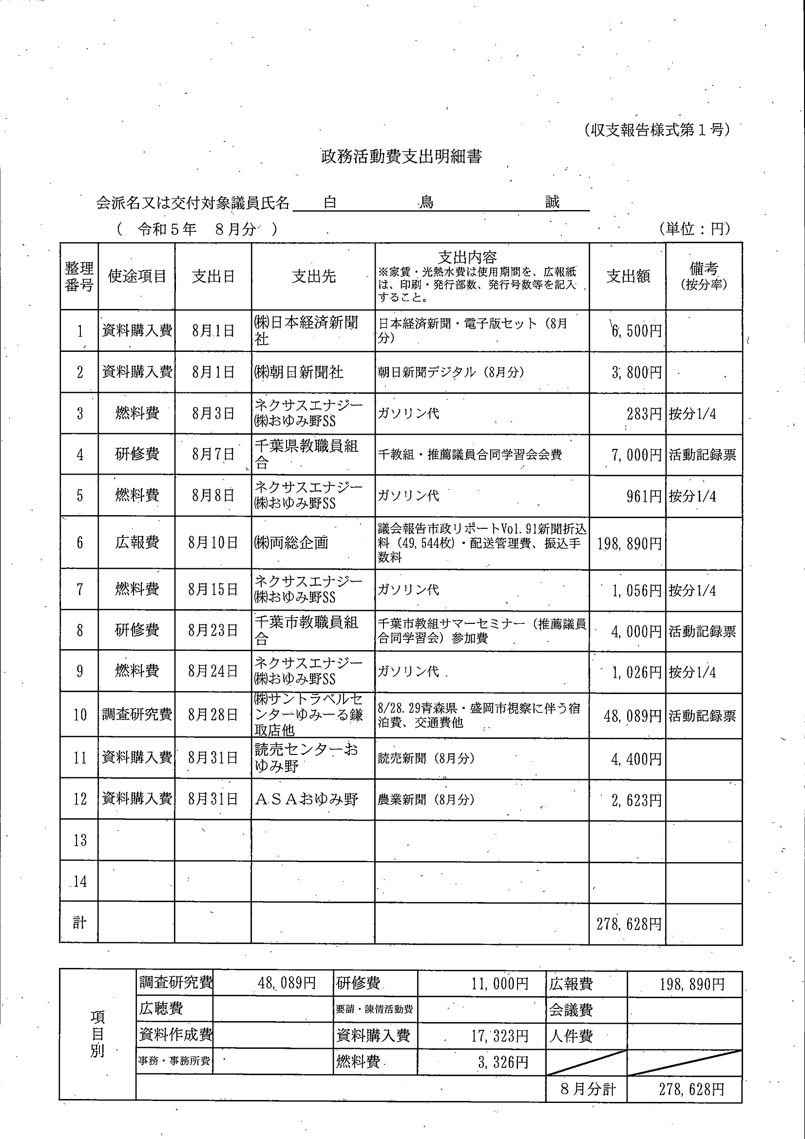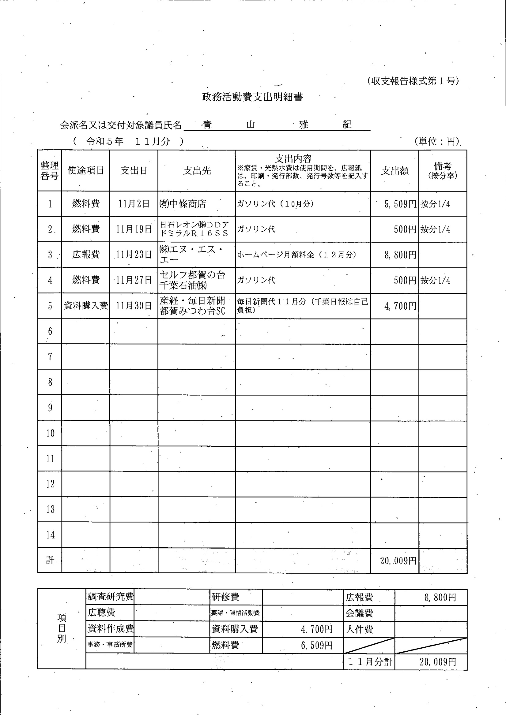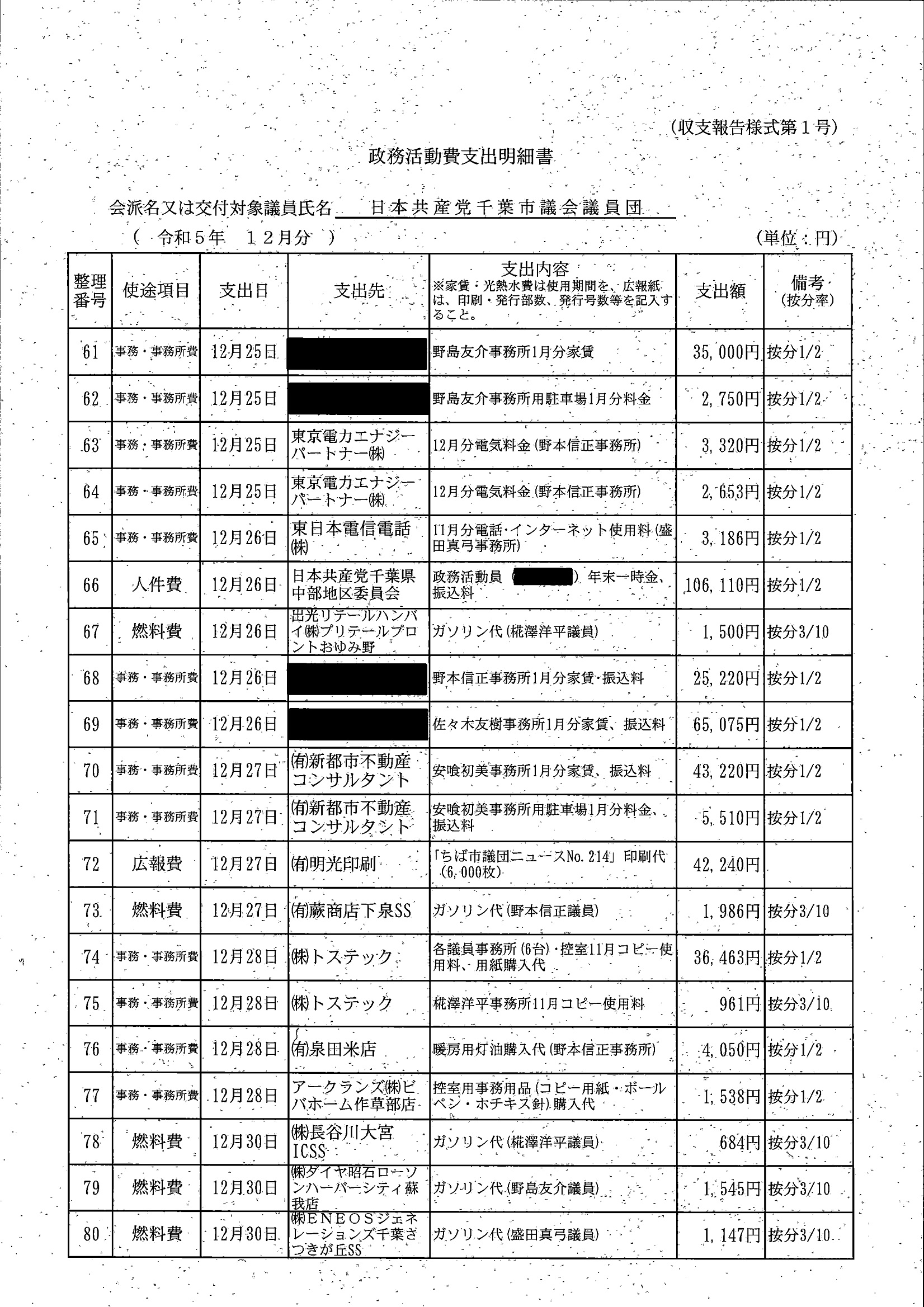 千葉市議会トップページ > 広報・情報公開 > 政務活動費 > 令和5年度交付分(政務活動費収支報告書)