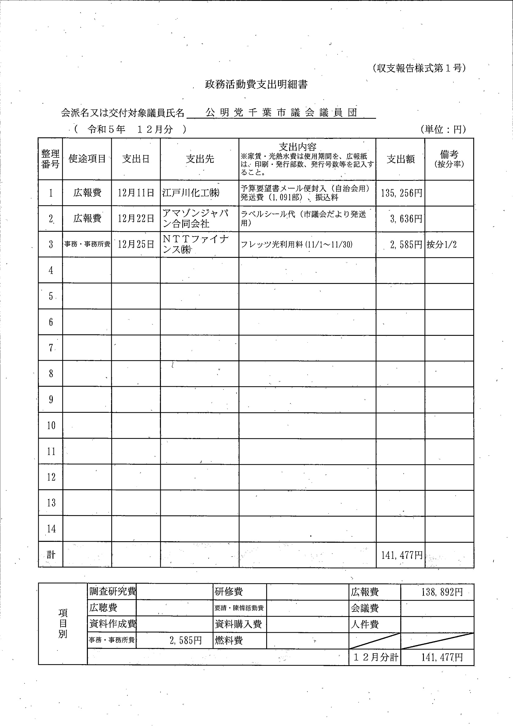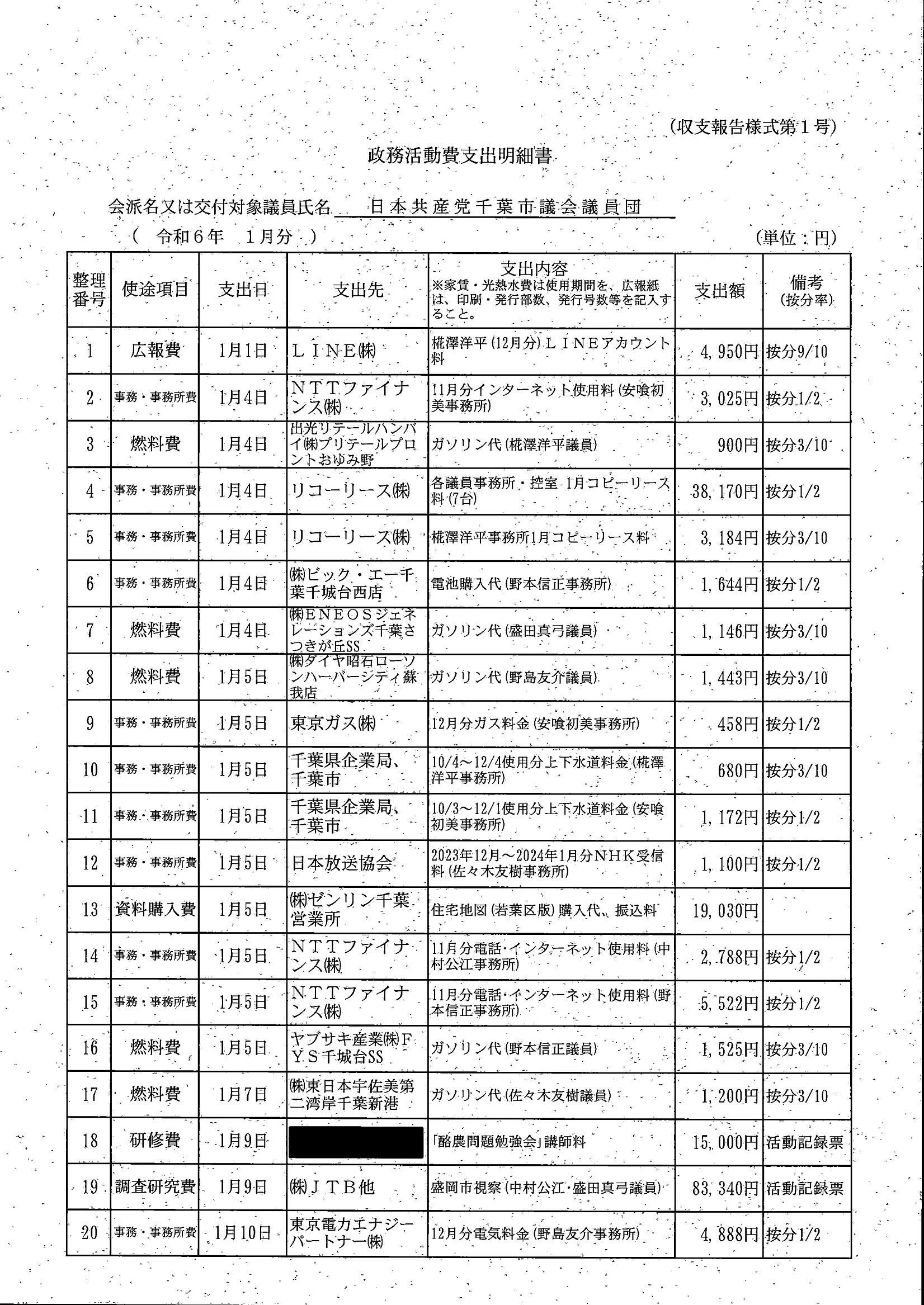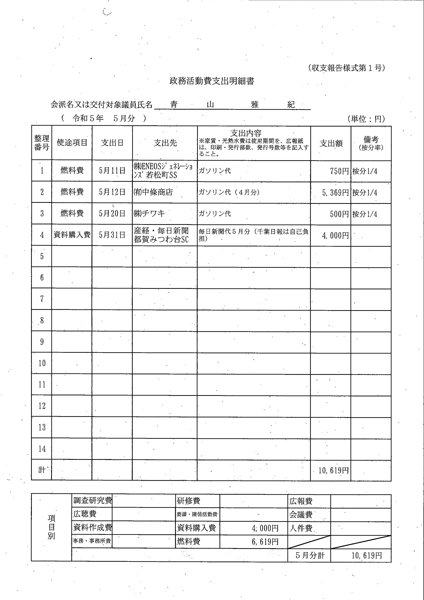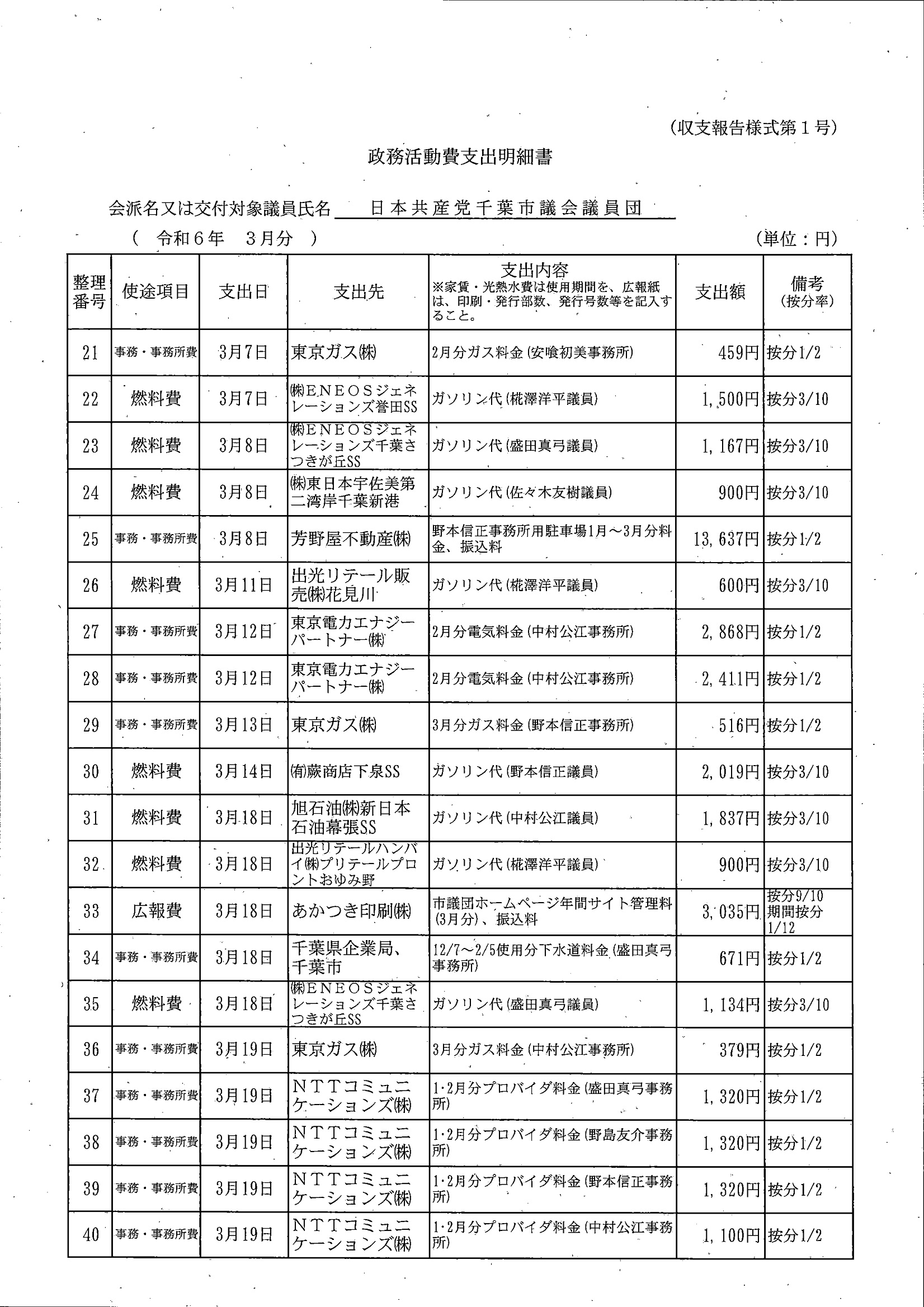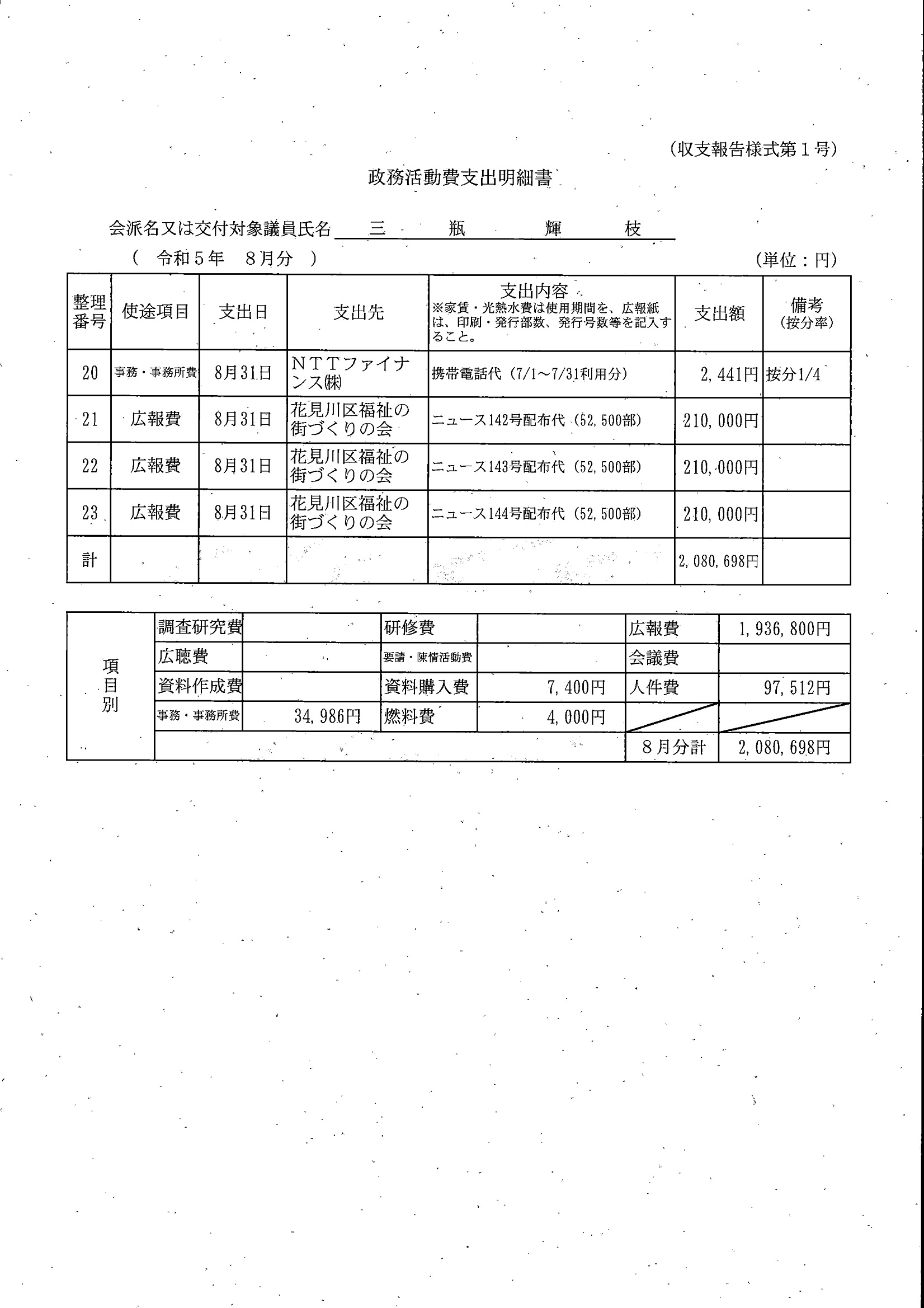 千葉市議会トップページ > 広報・情報公開 > 政務活動費 > 令和5年度交付分(政務活動費収支報告書)