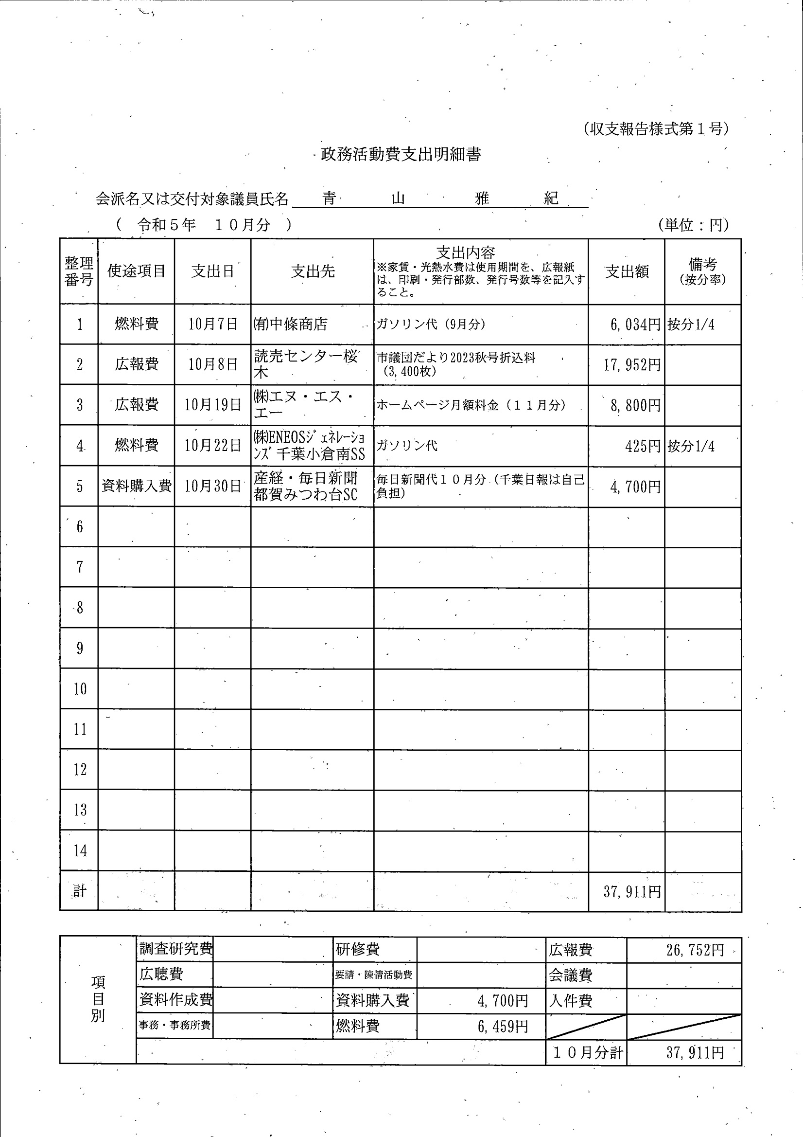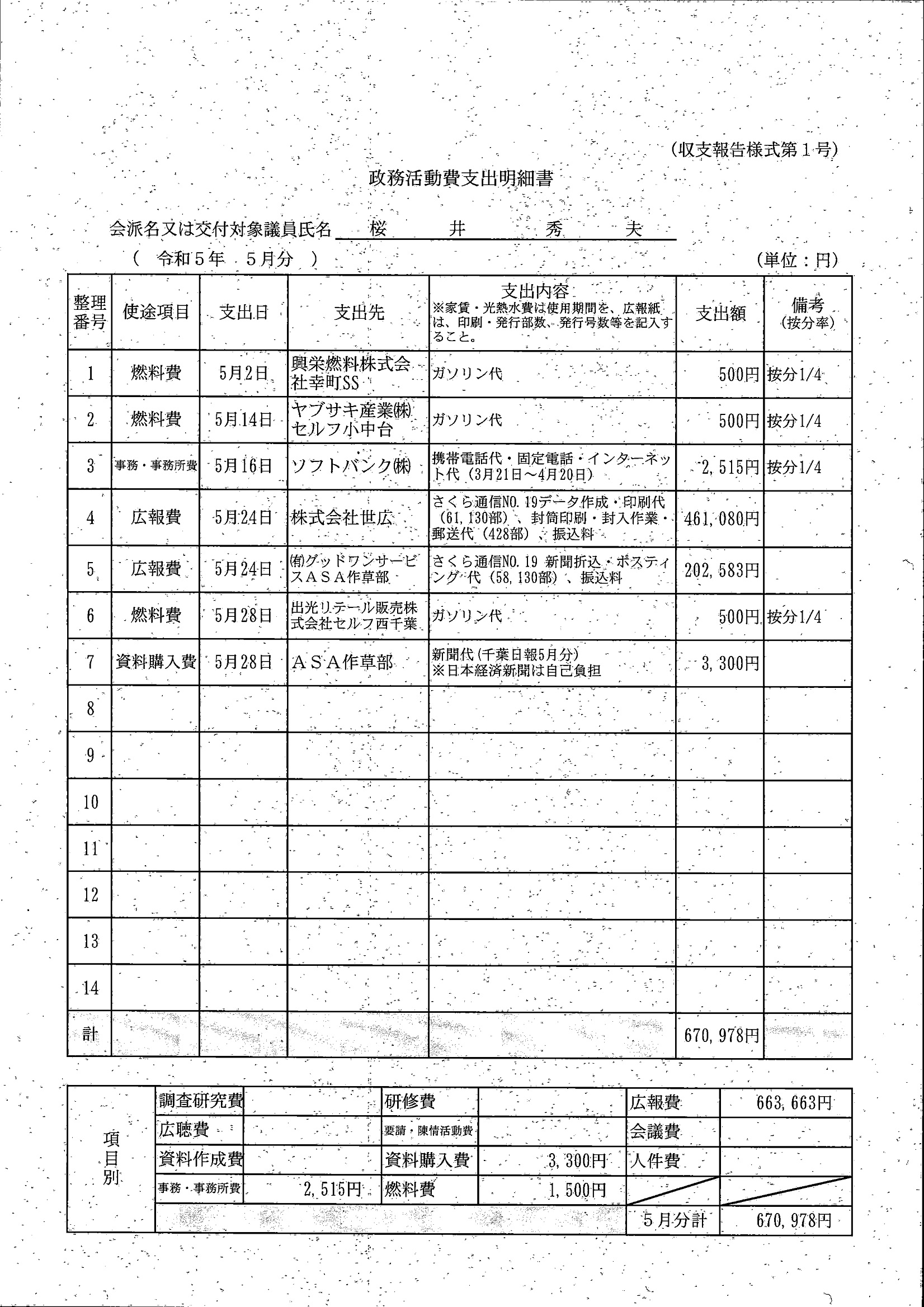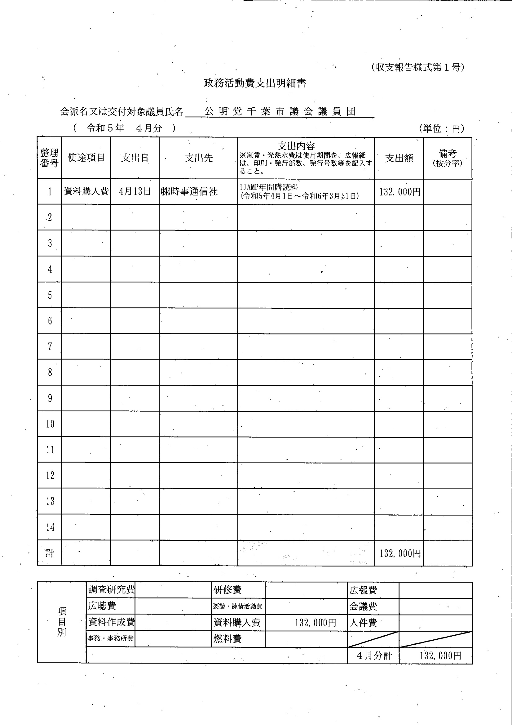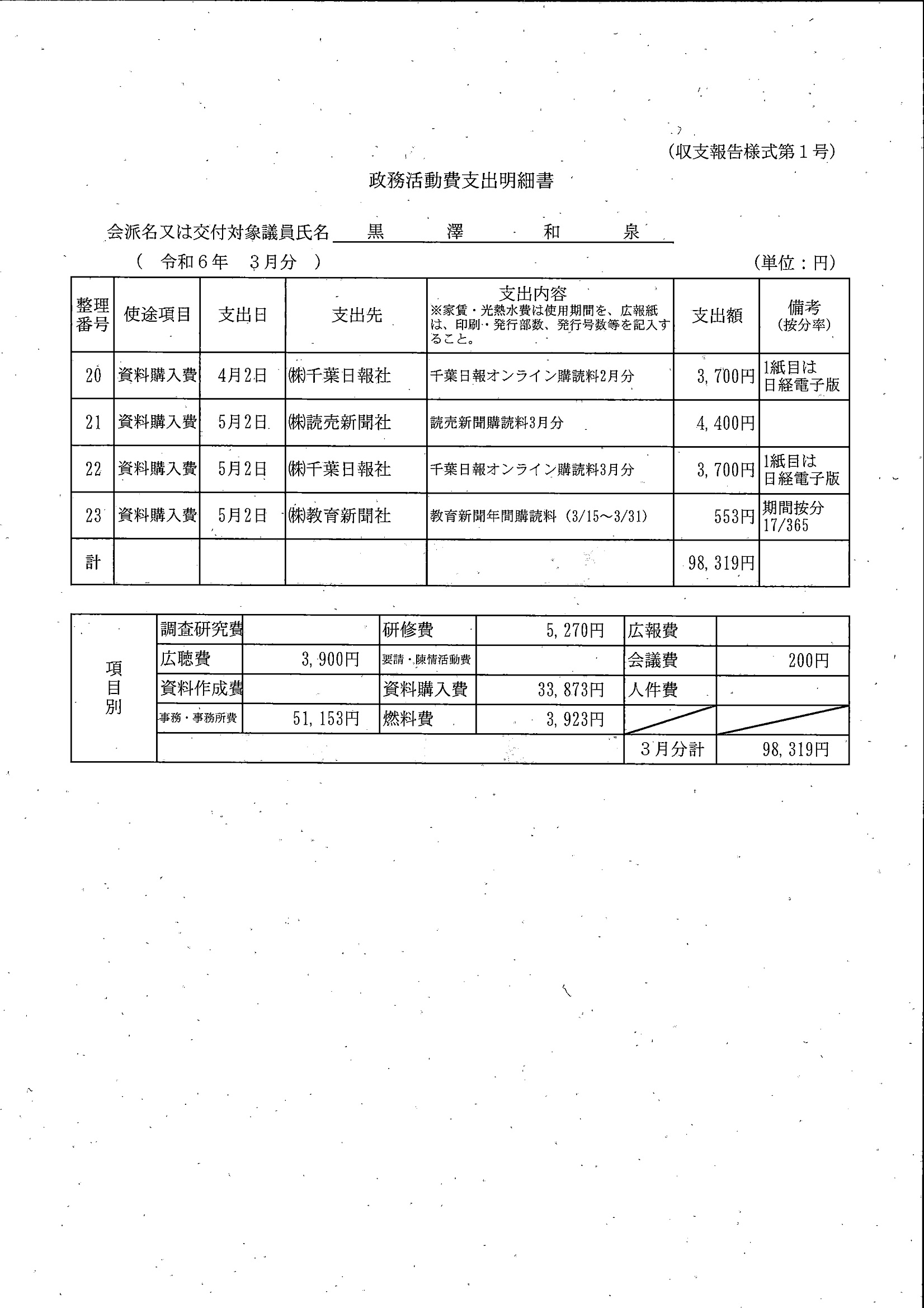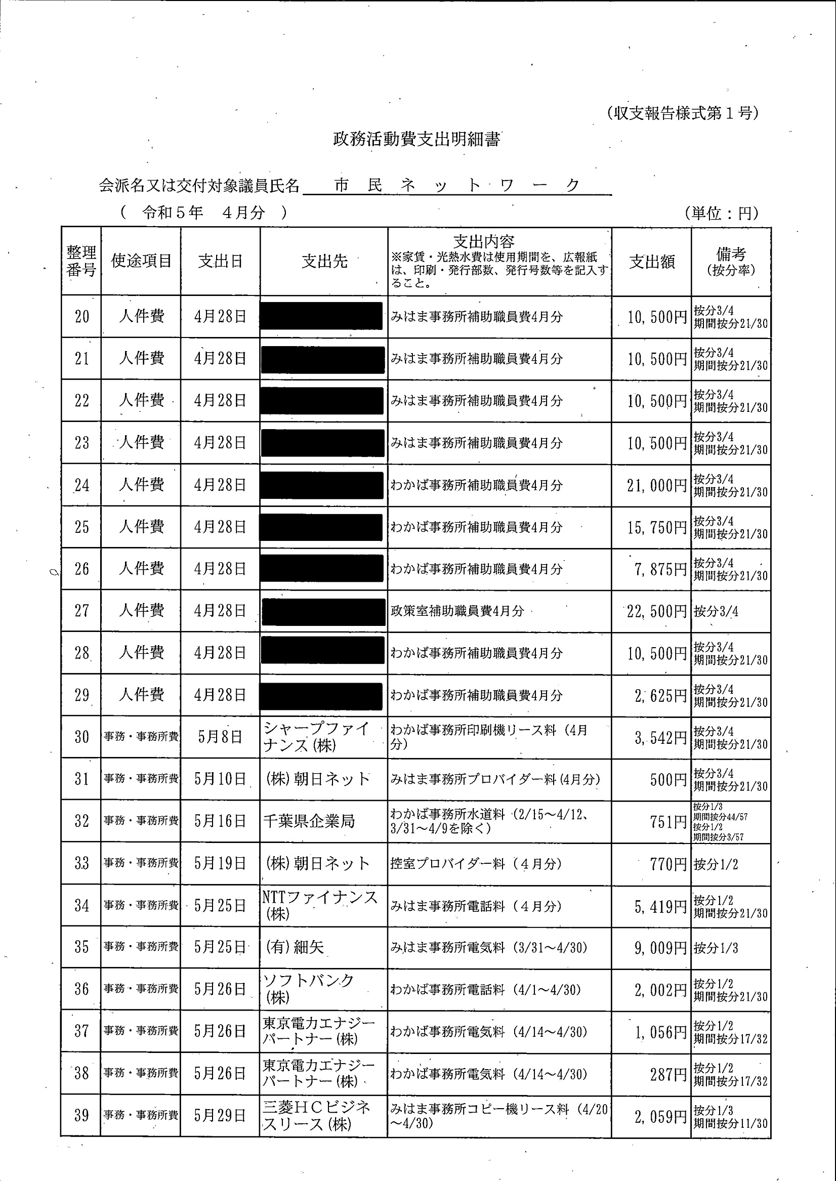 千葉市議会トップページ > 広報・情報公開 > 政務活動費 > 令和5年度交付分(政務活動費収支報告書)