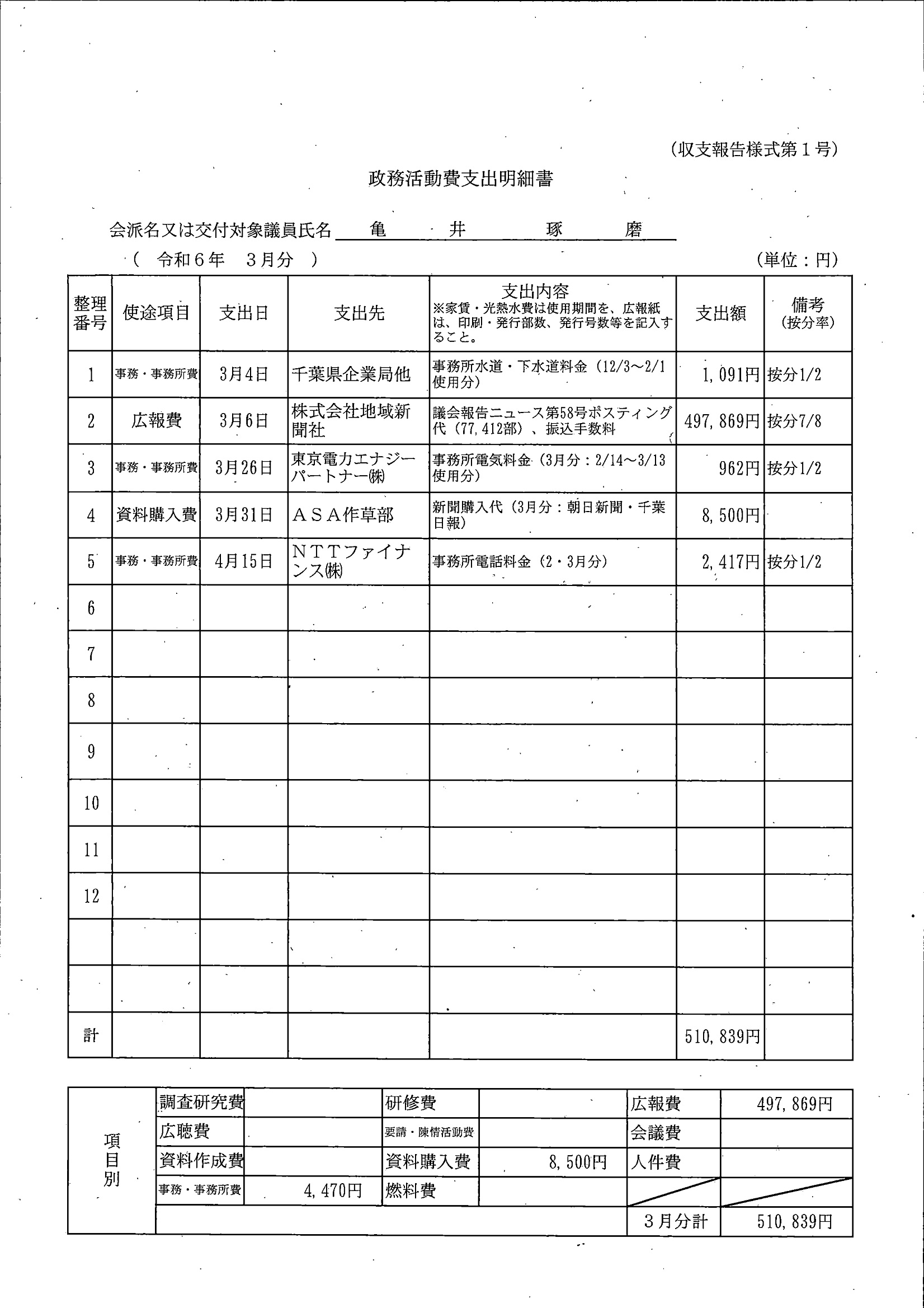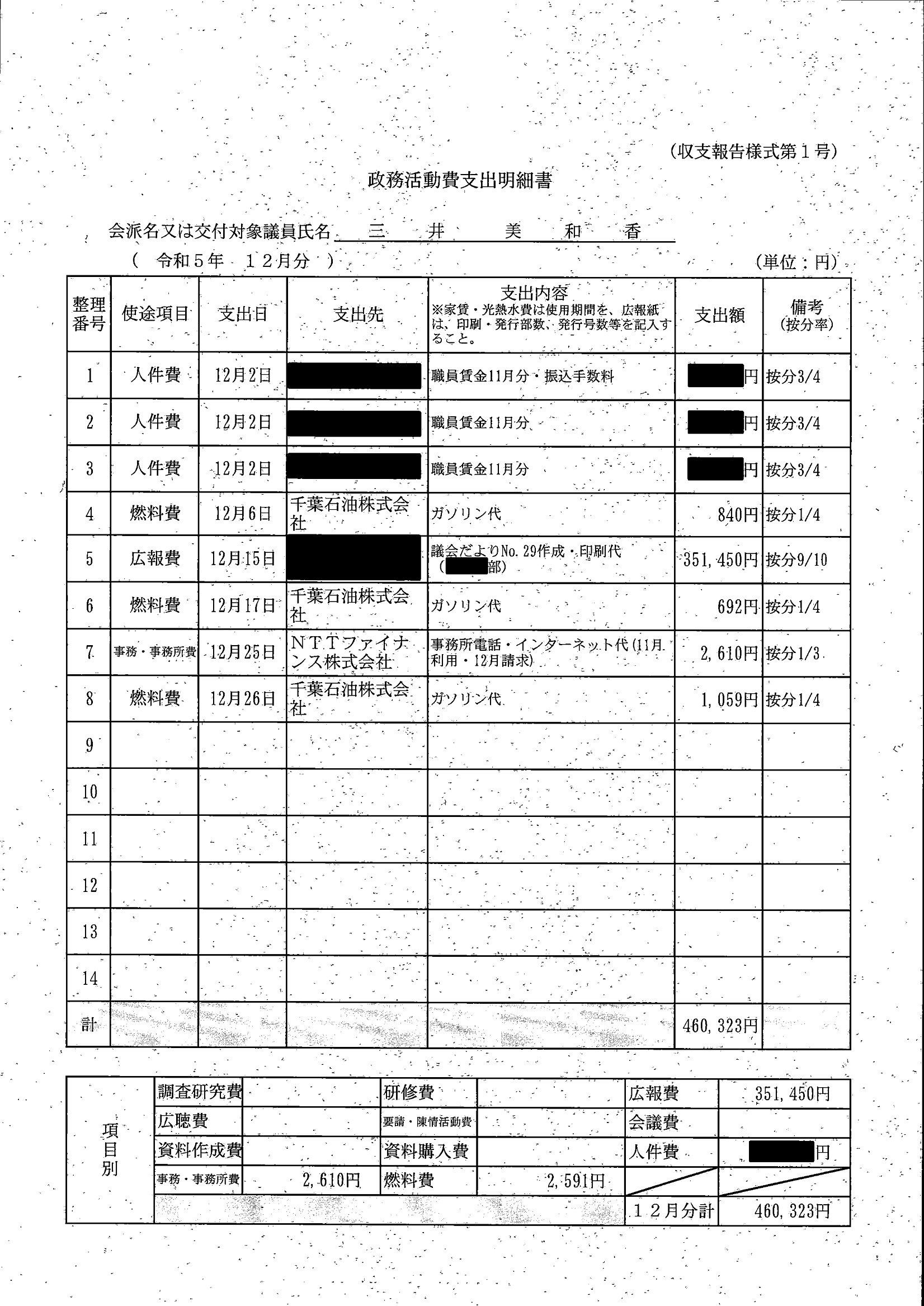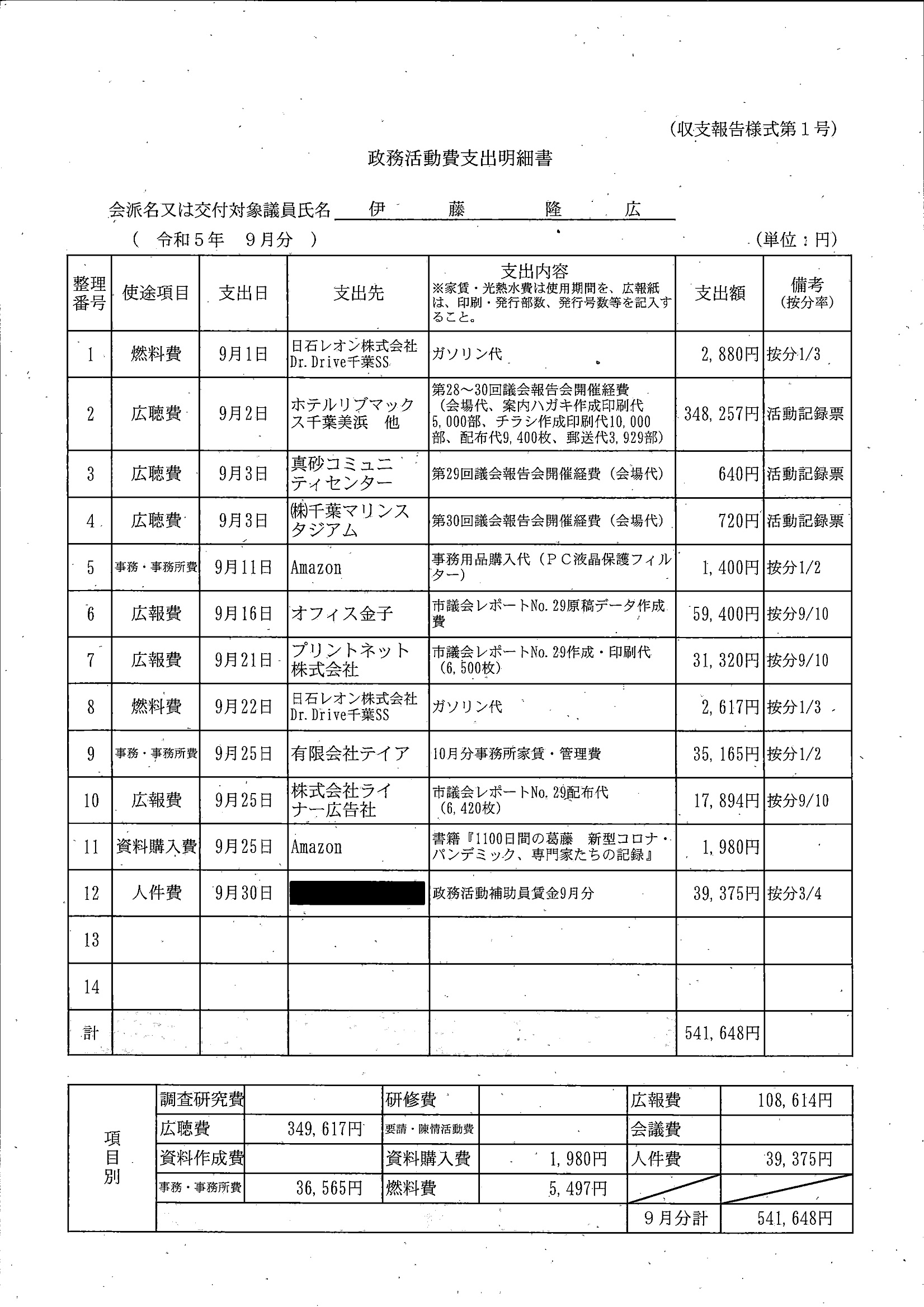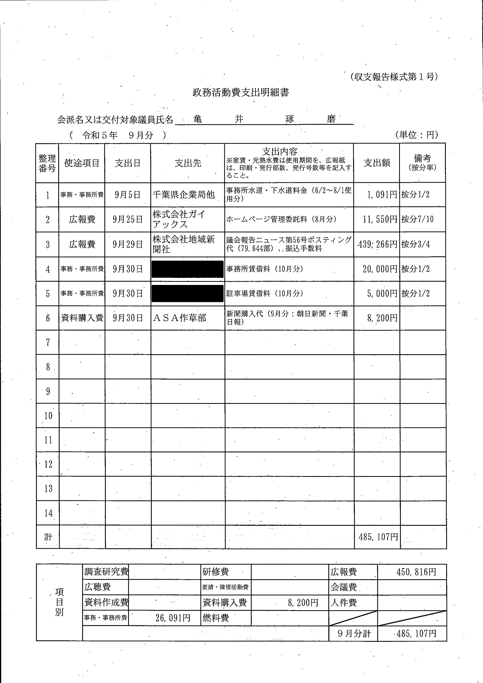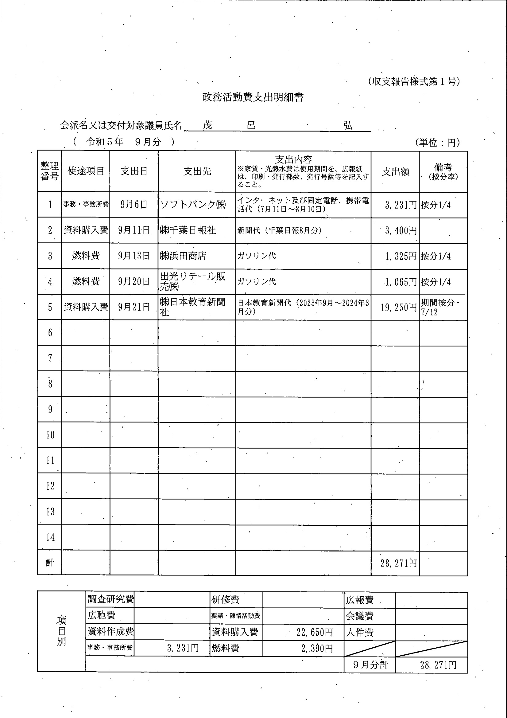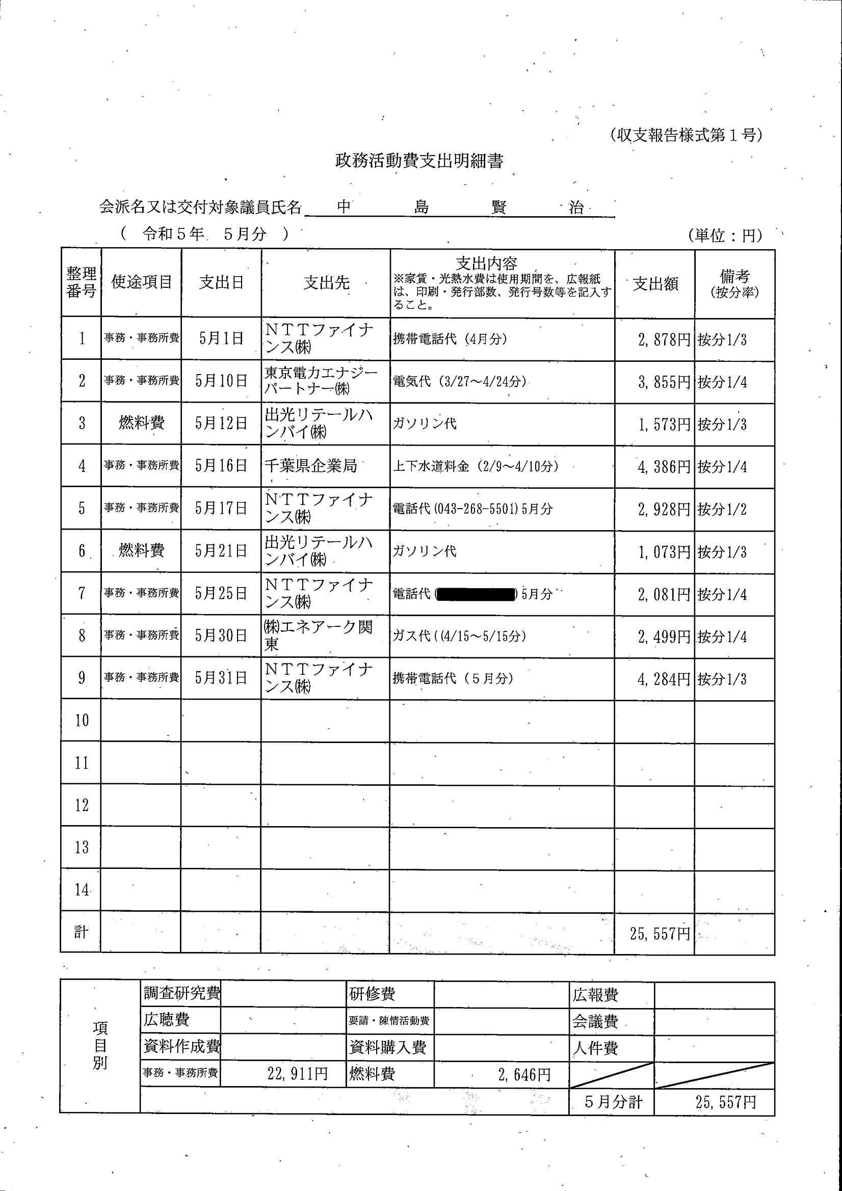 千葉市議会トップページ > 広報・情報公開 > 政務活動費 > 令和5年度交付分(政務活動費収支報告書)