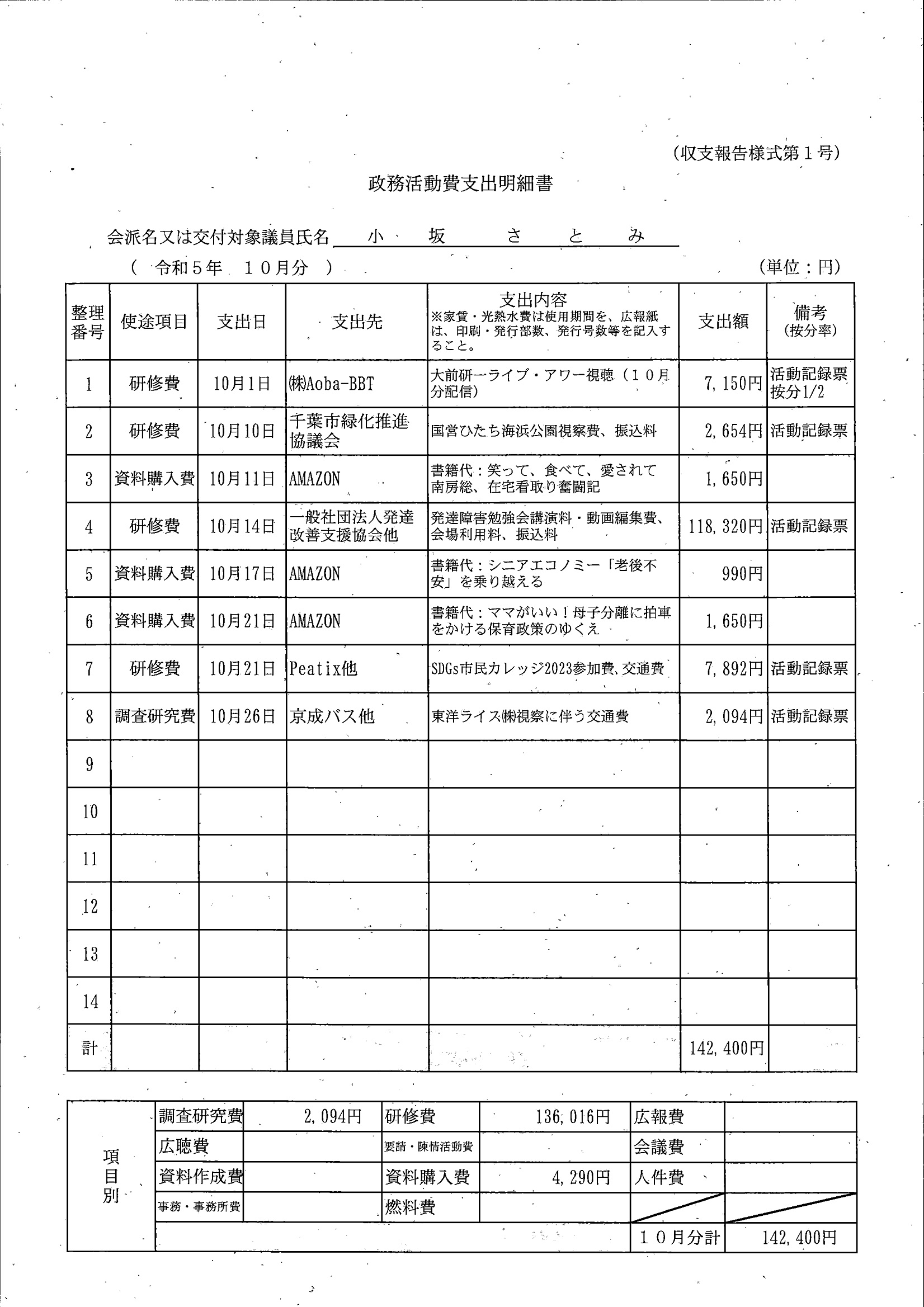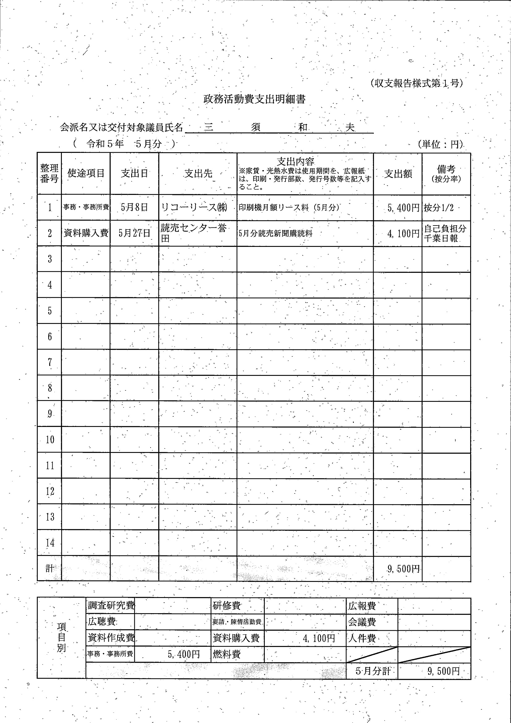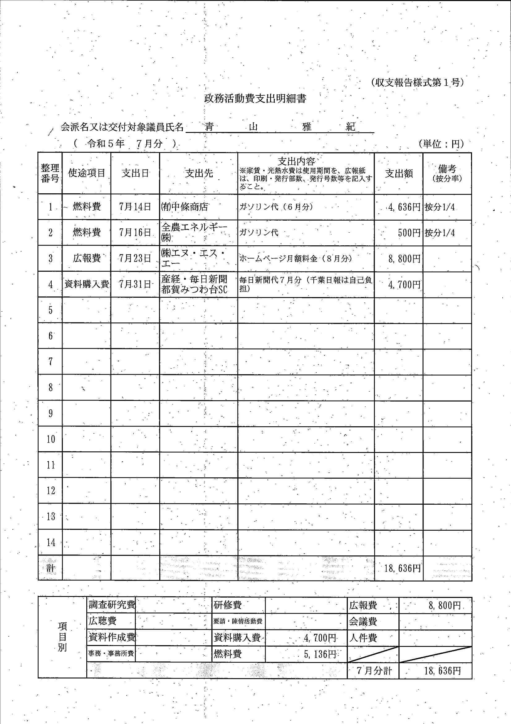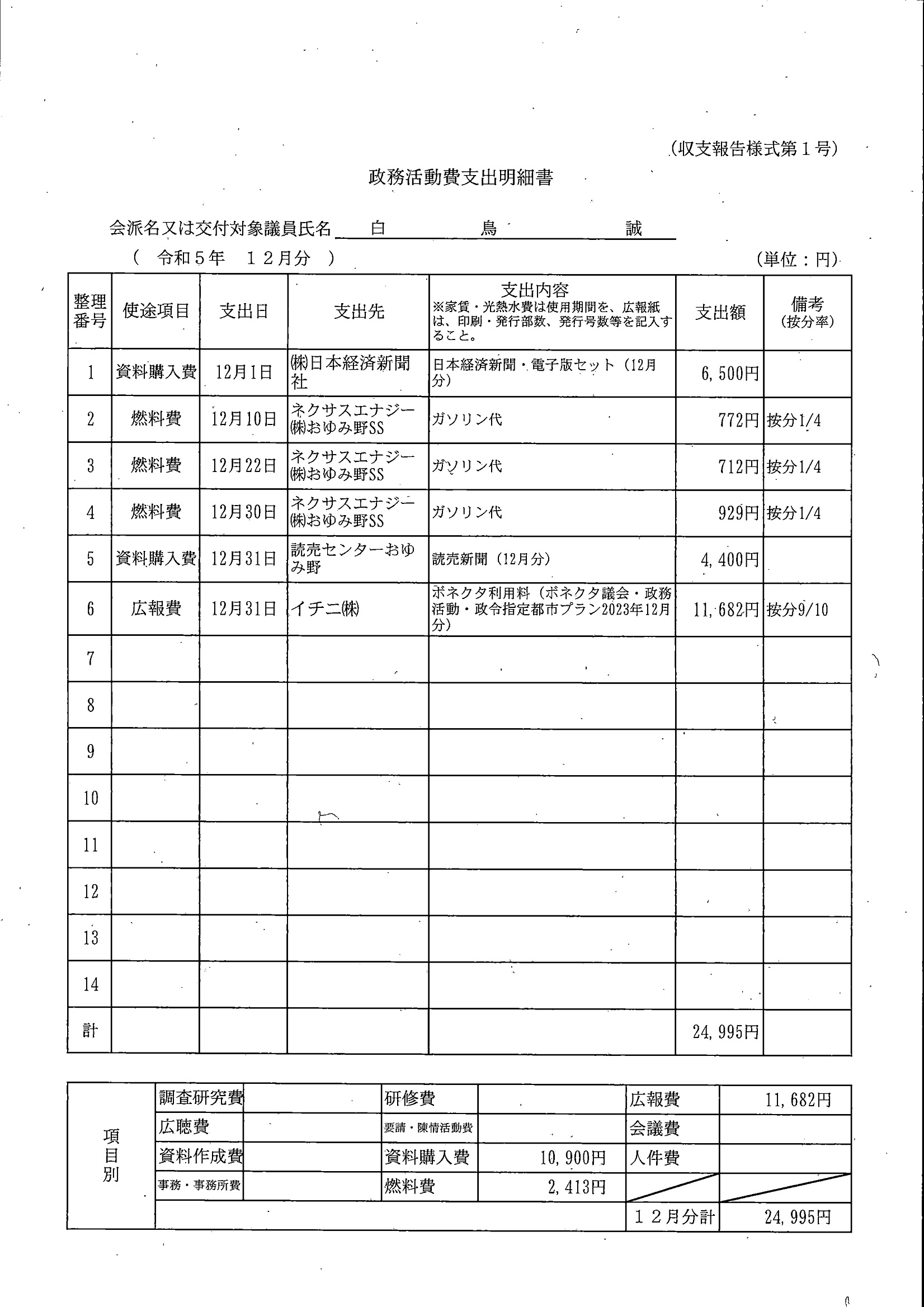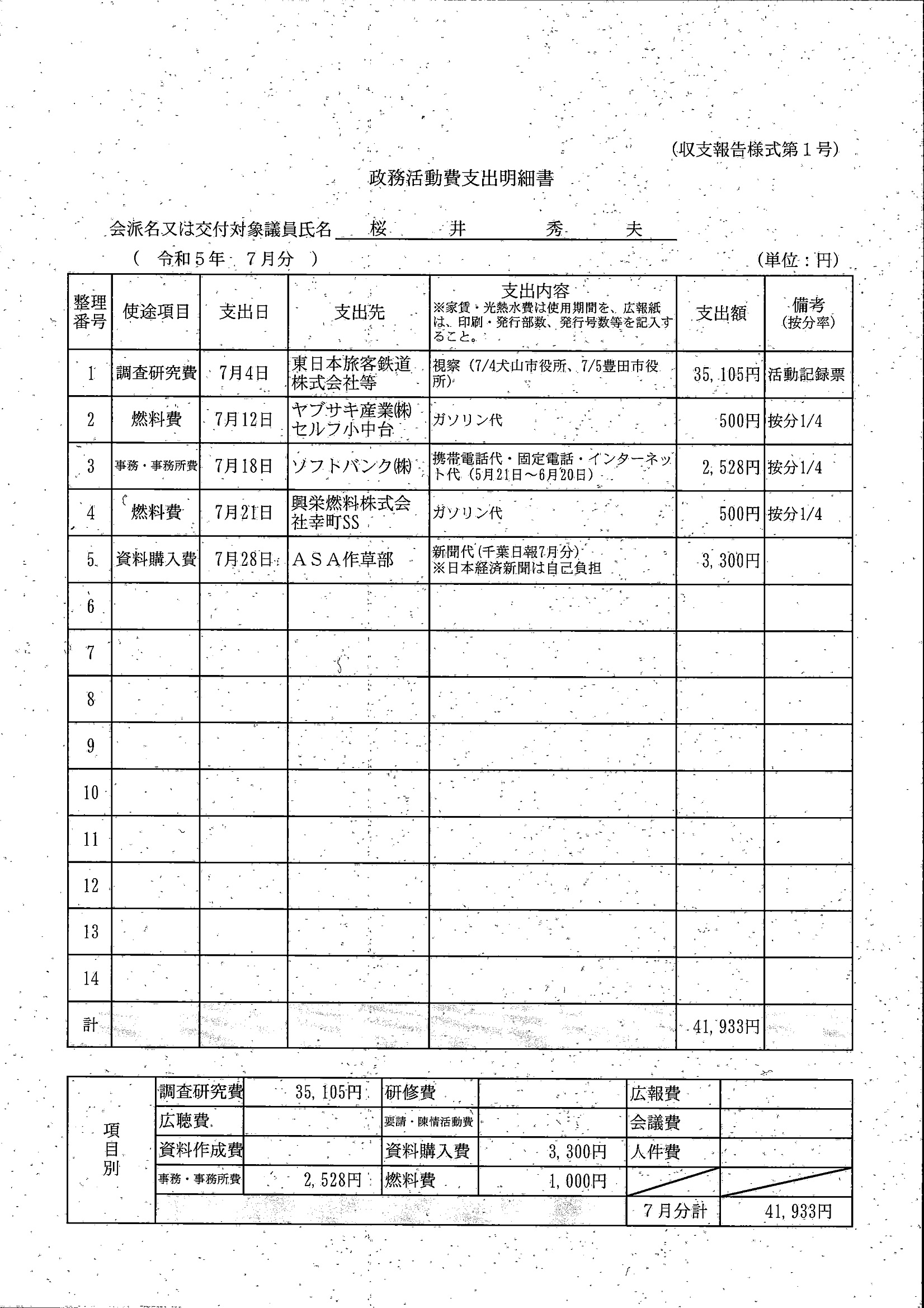 千葉市議会トップページ > 広報・情報公開 > 政務活動費 > 令和5年度交付分(政務活動費収支報告書)