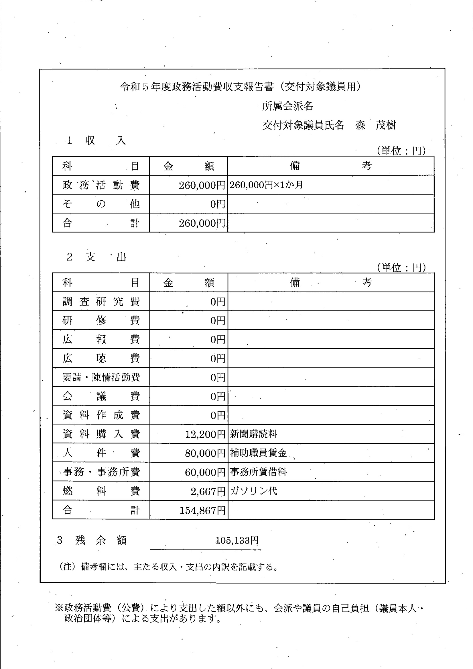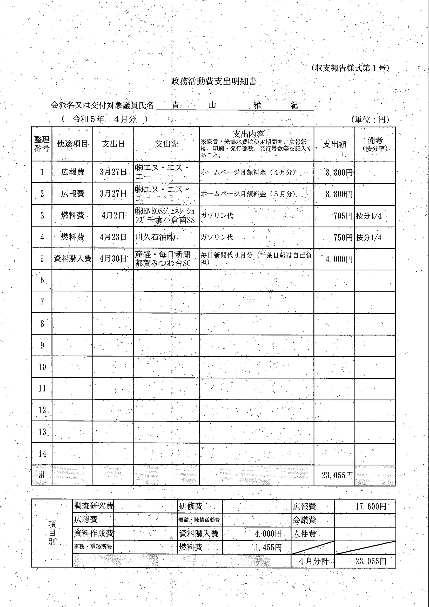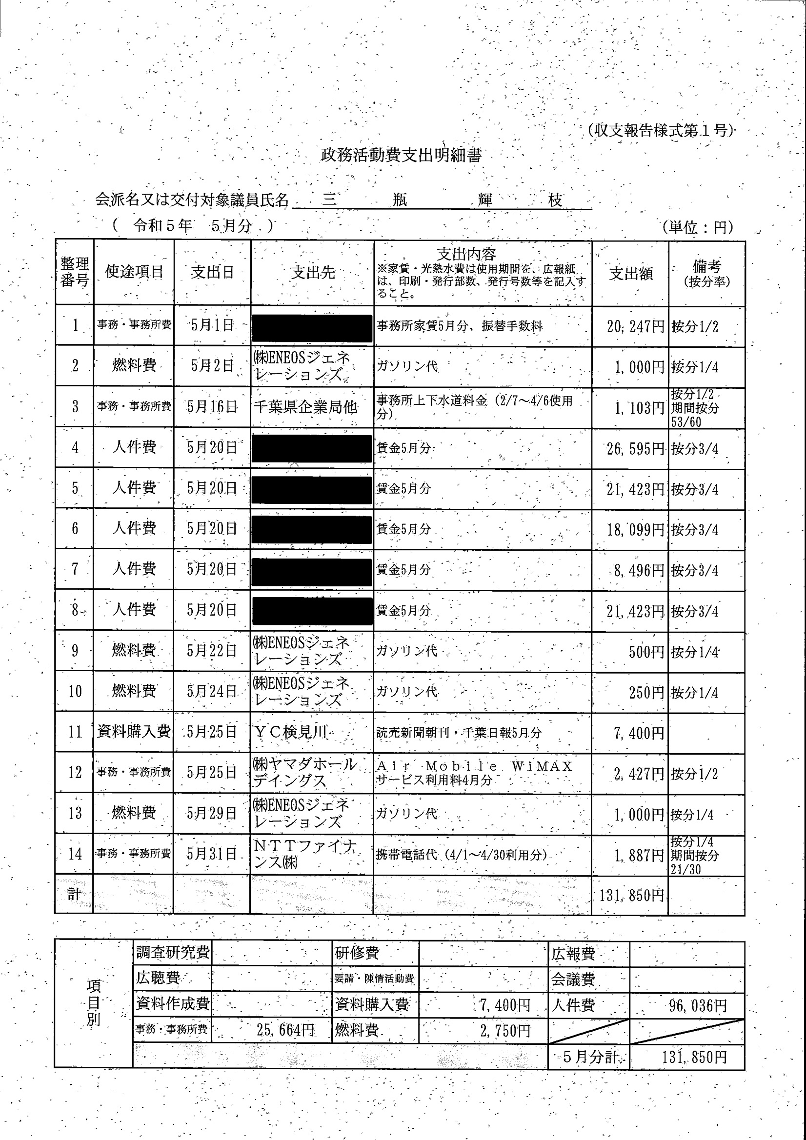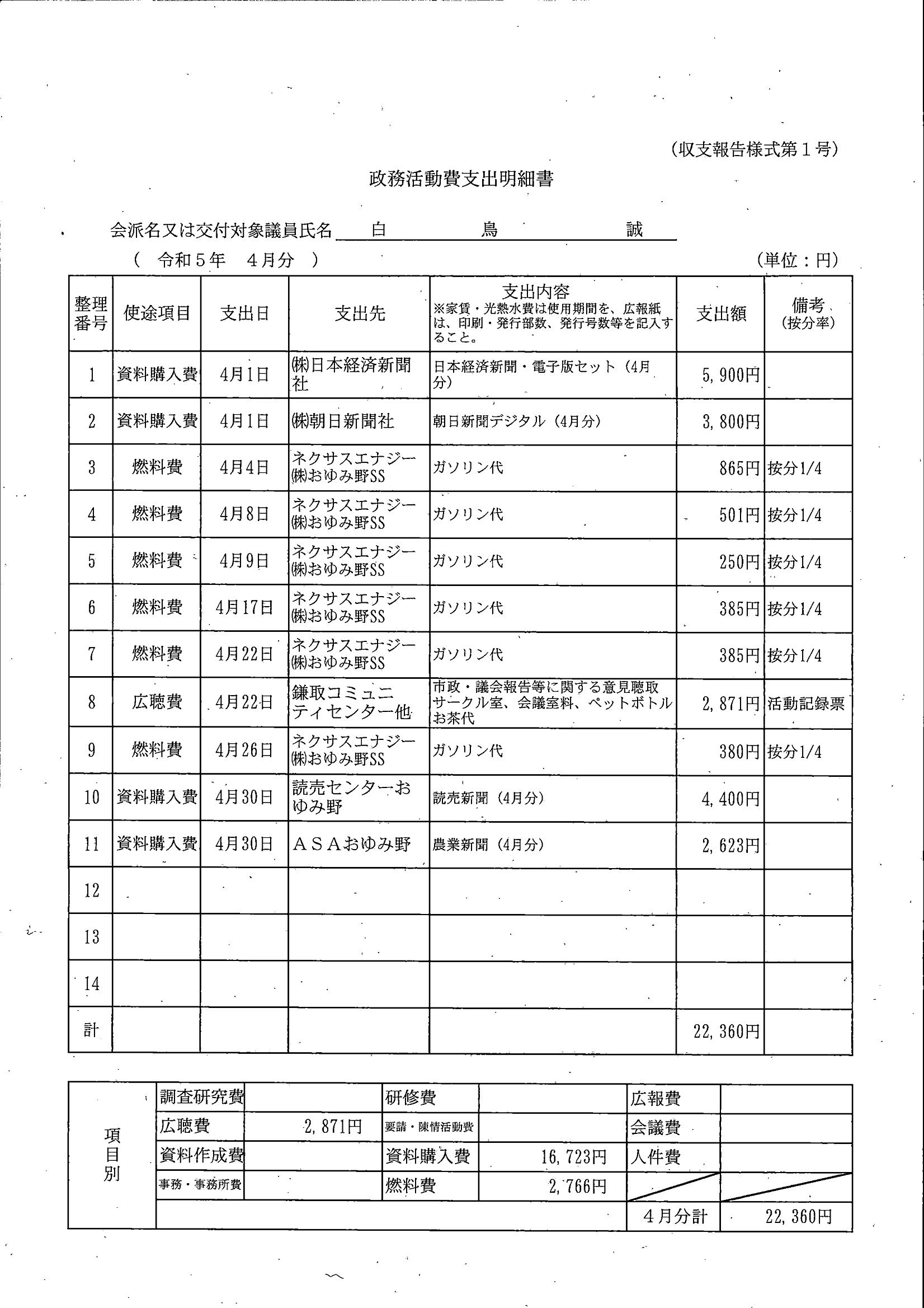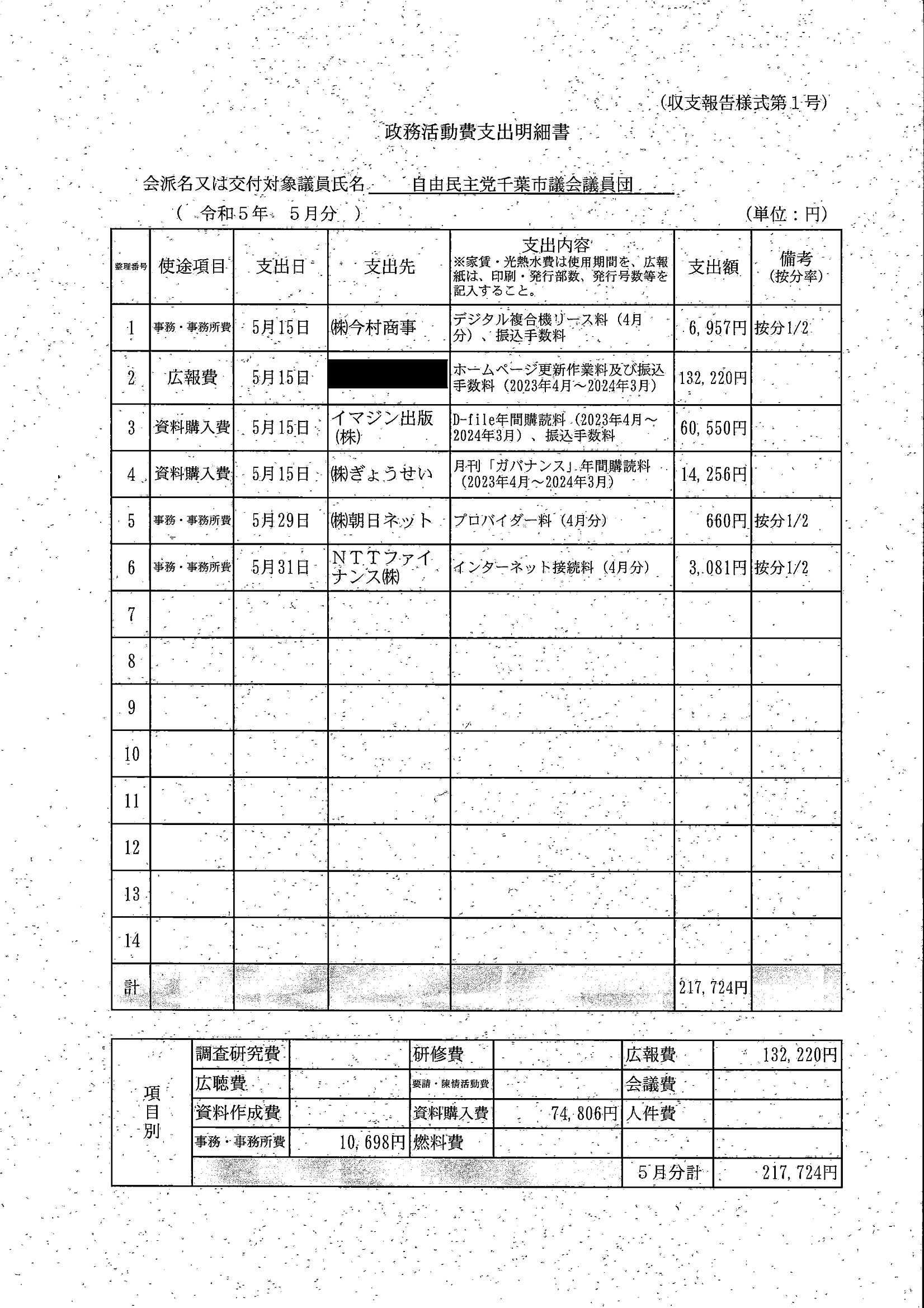 千葉市議会トップページ > 広報・情報公開 > 政務活動費 > 令和5年度交付分(政務活動費収支報告書)
