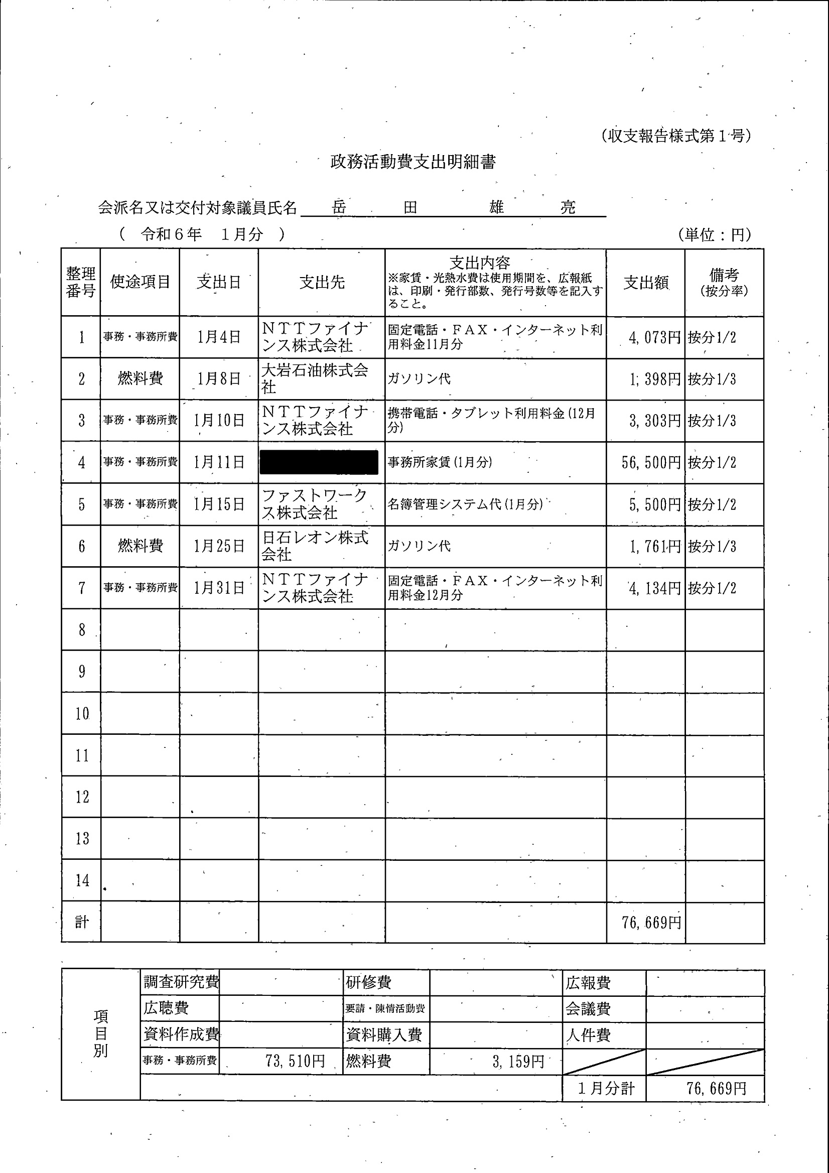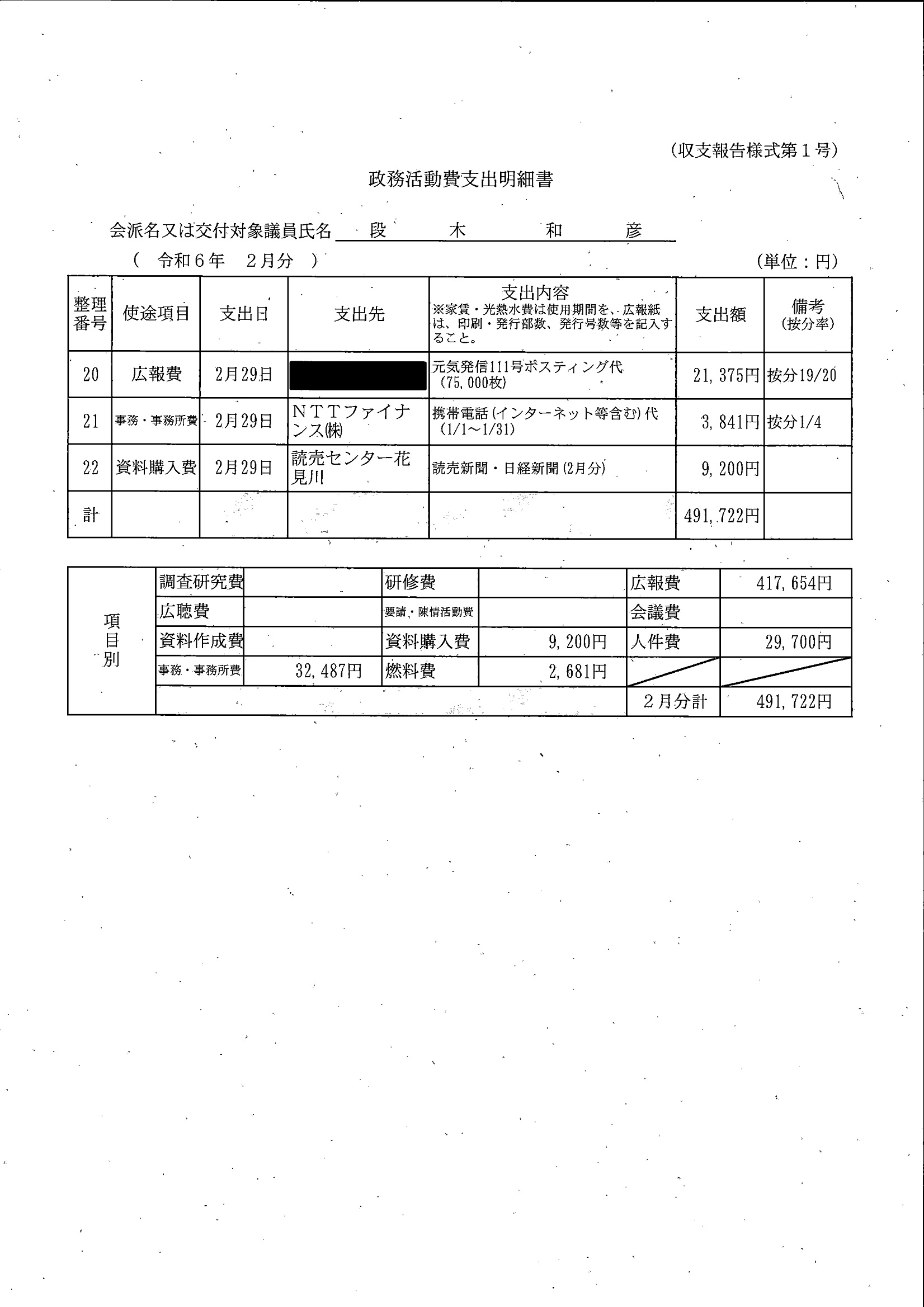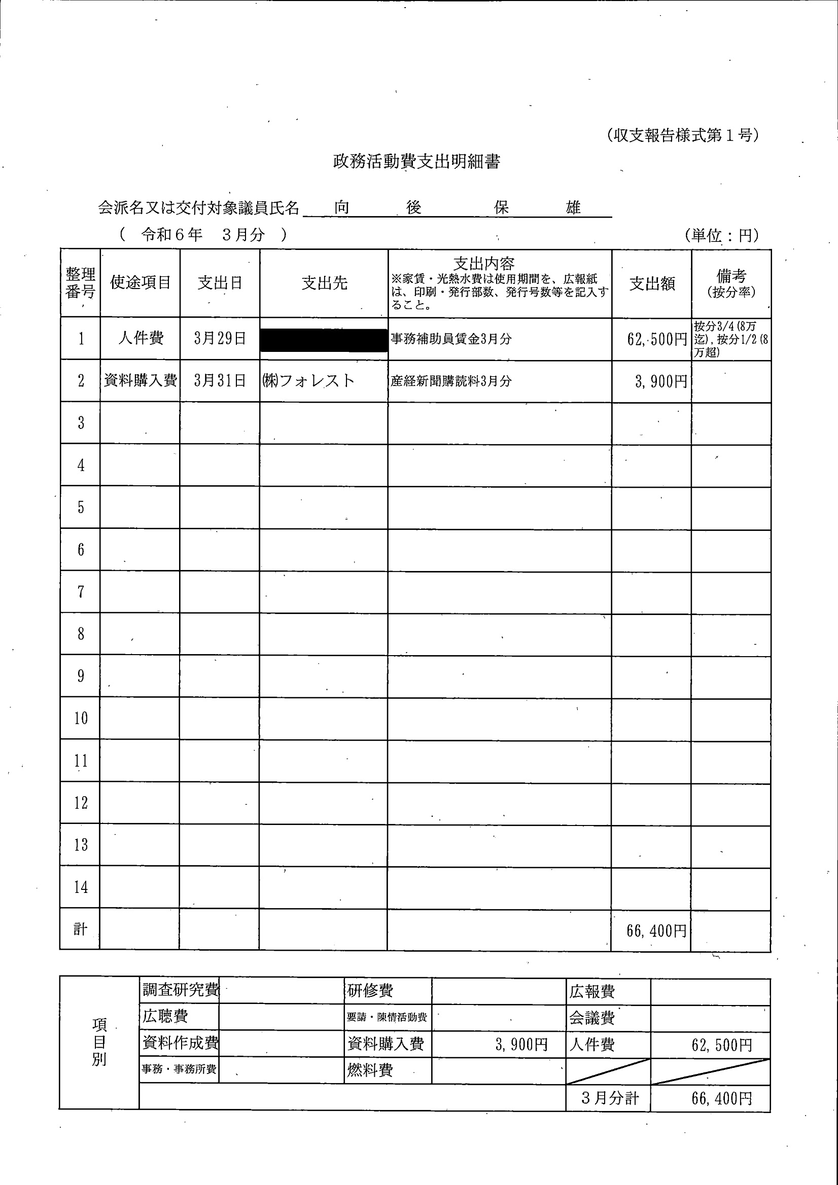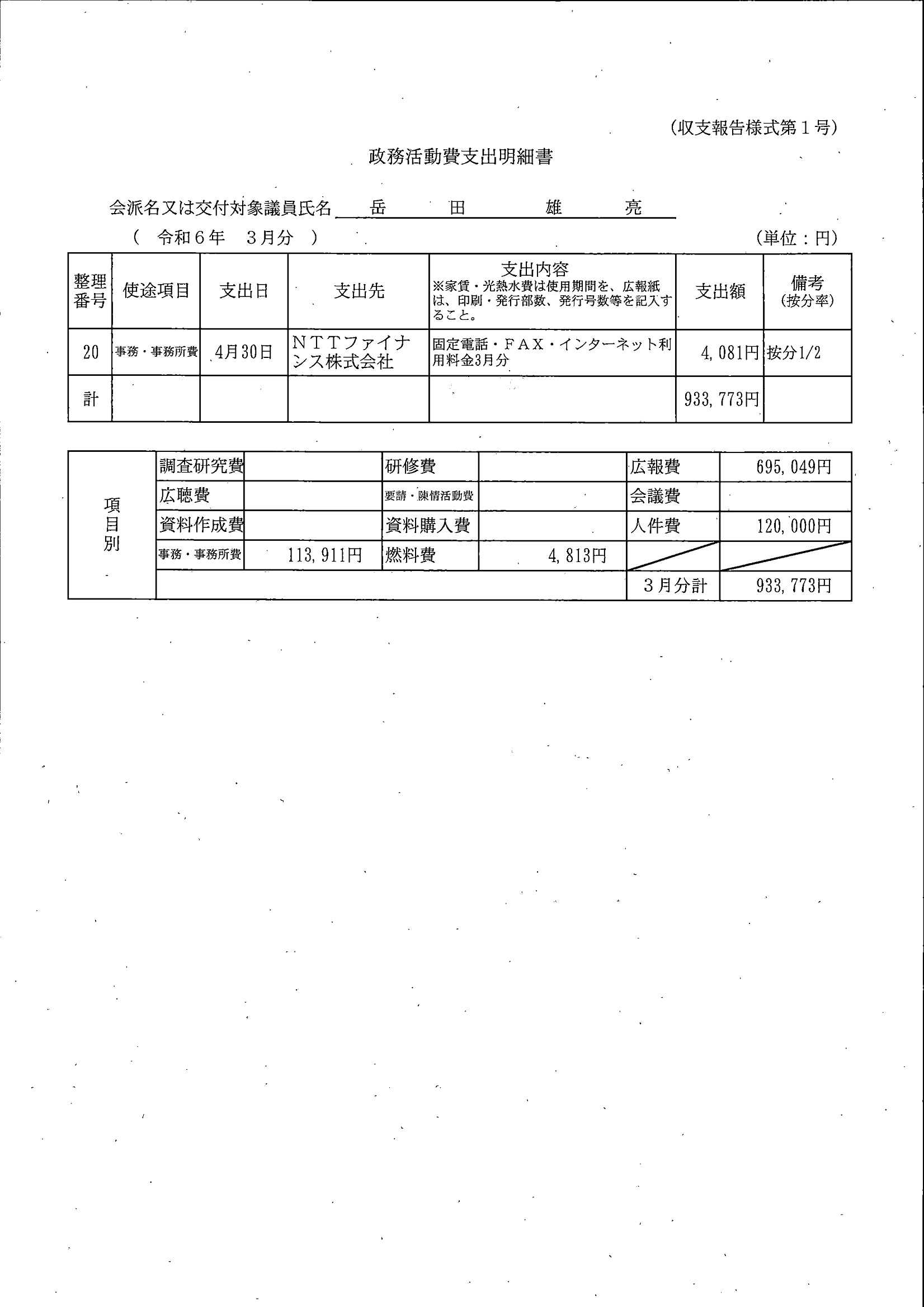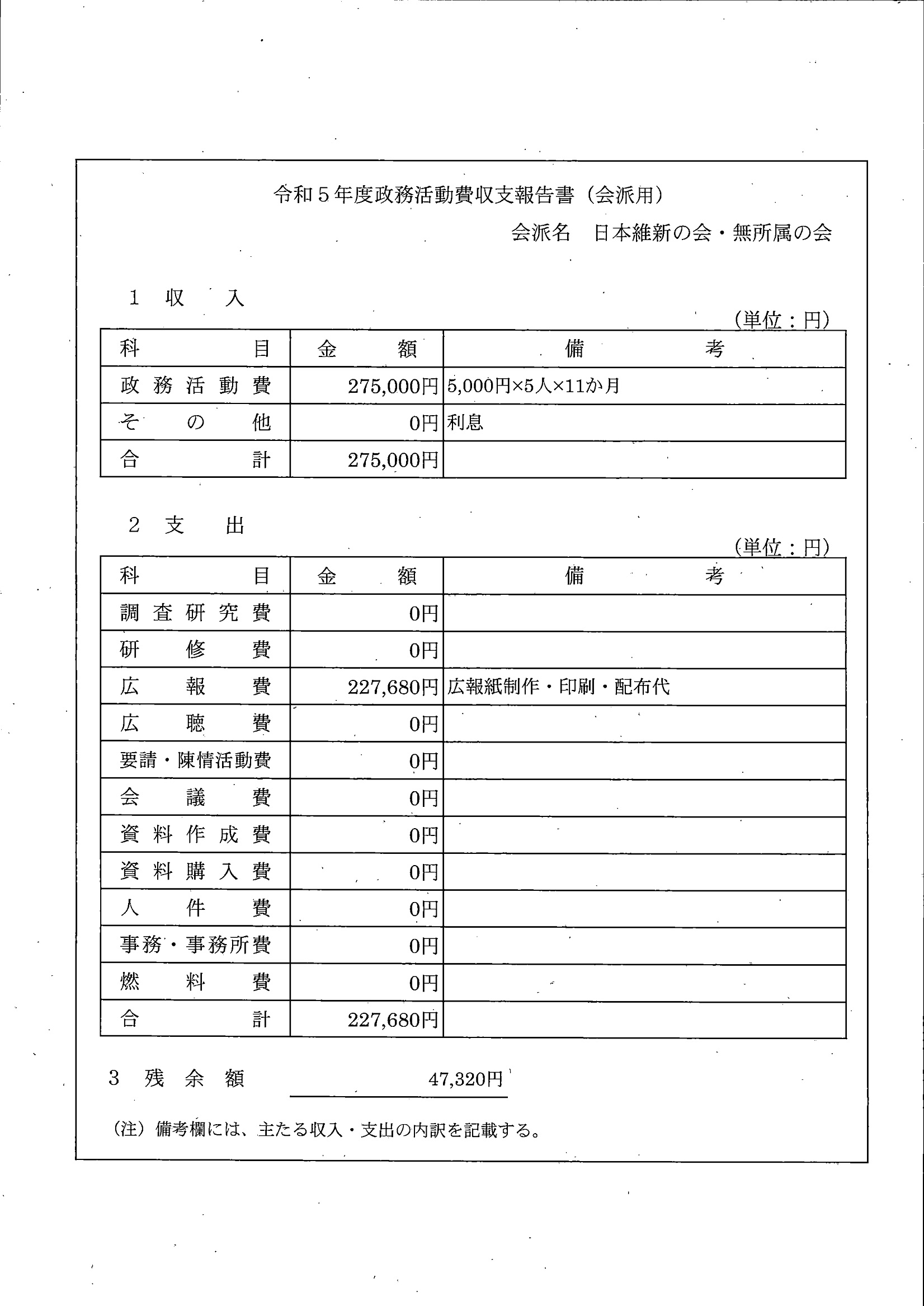 全額を会派に交付しているため、議員分はありません。