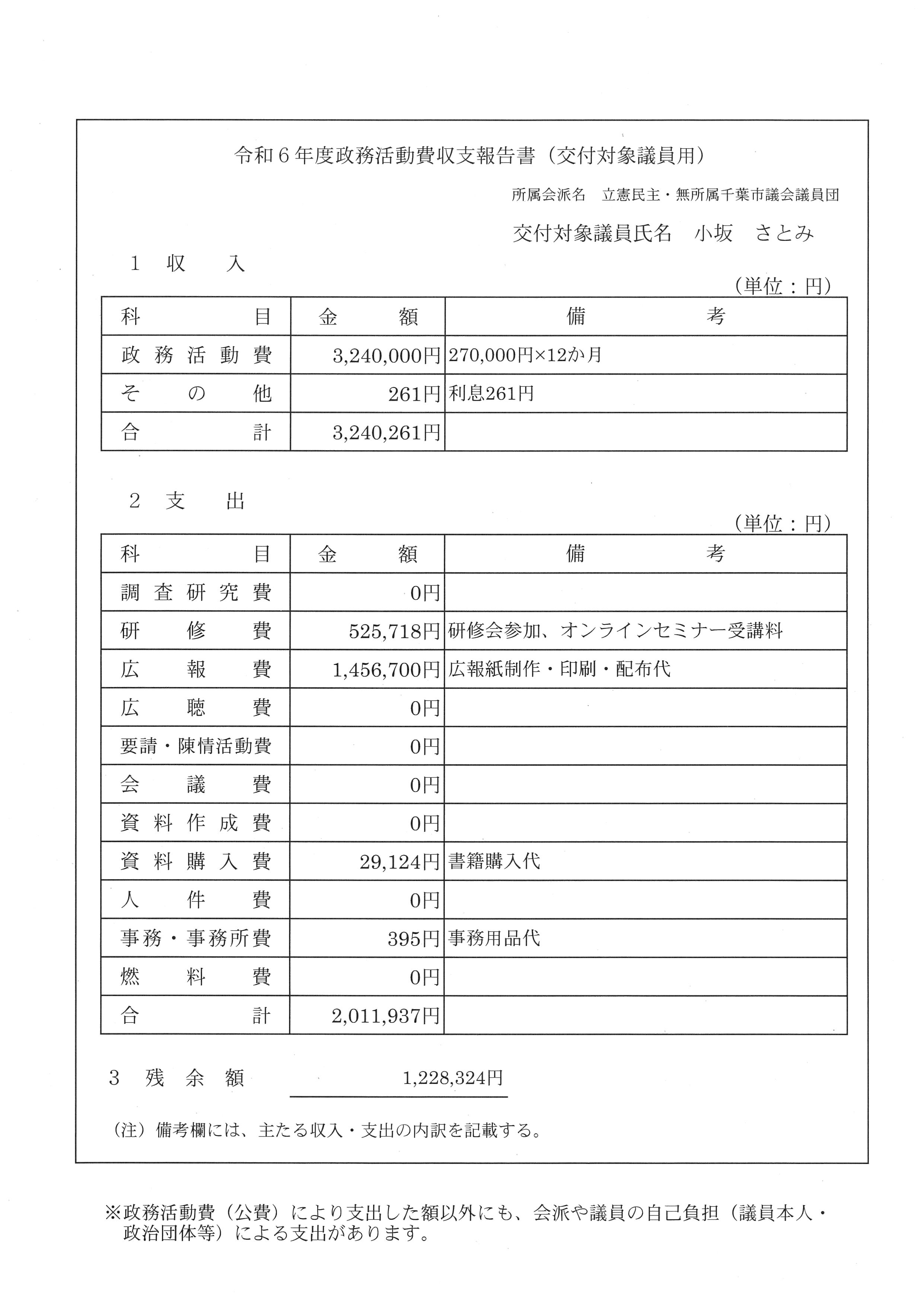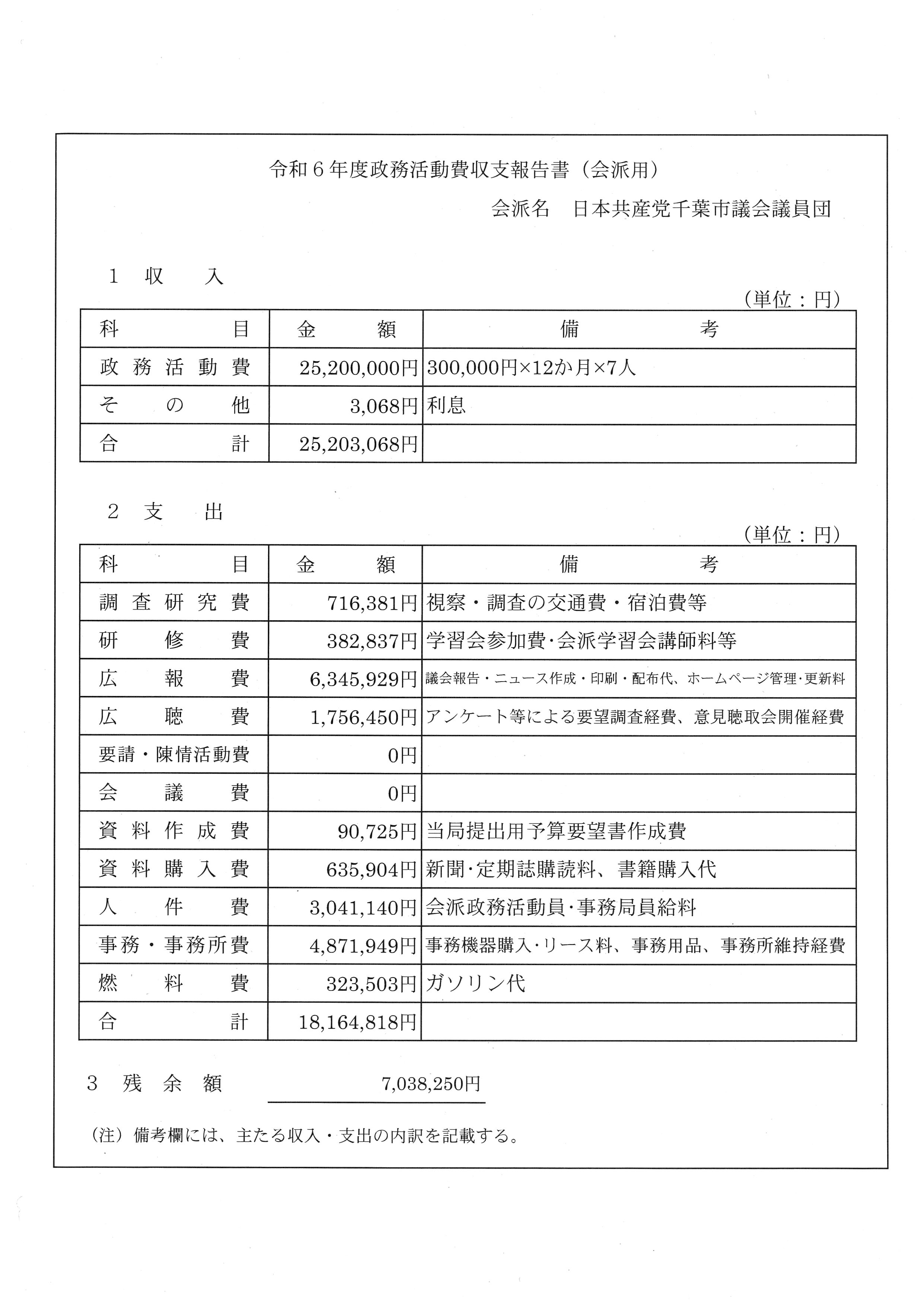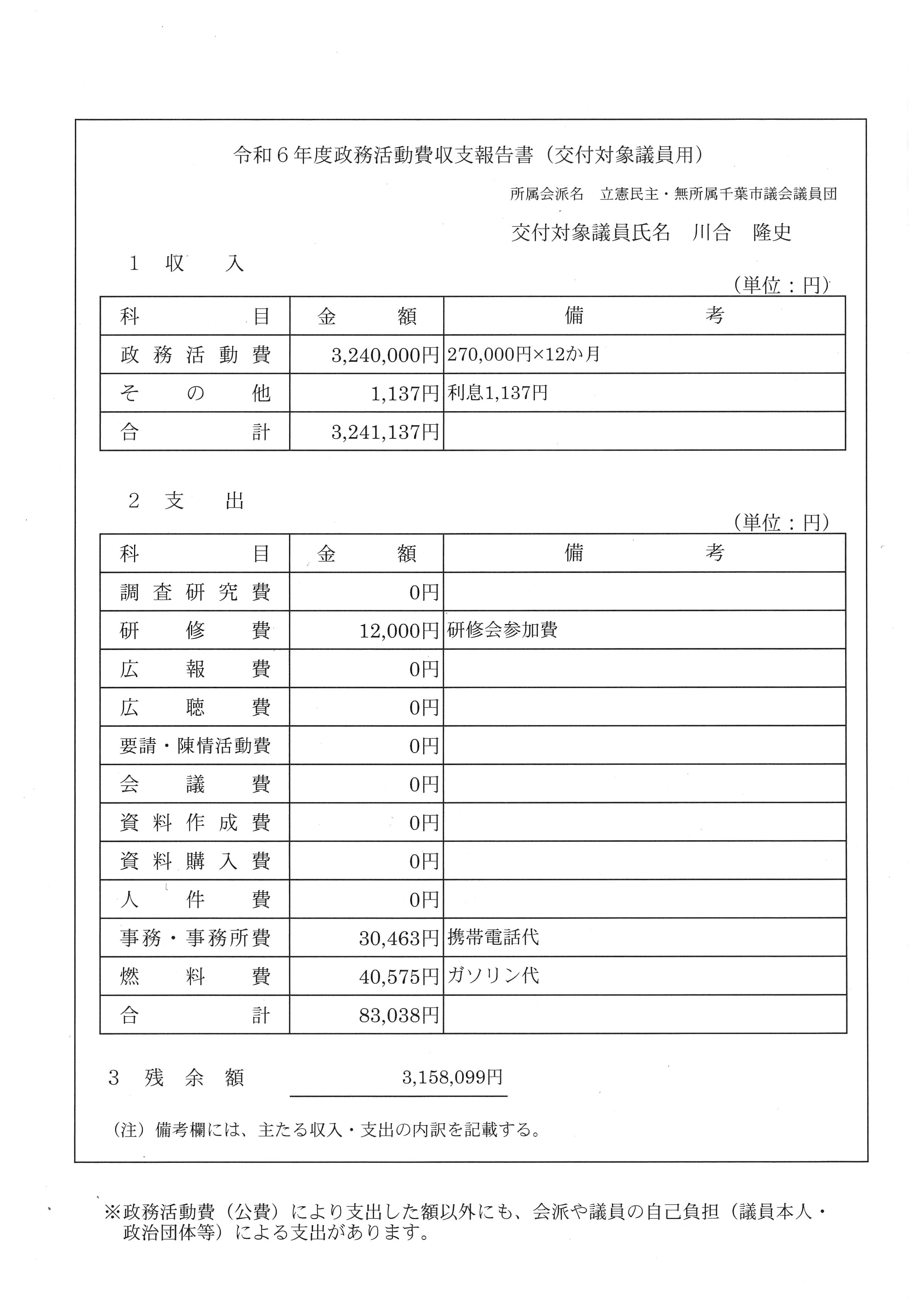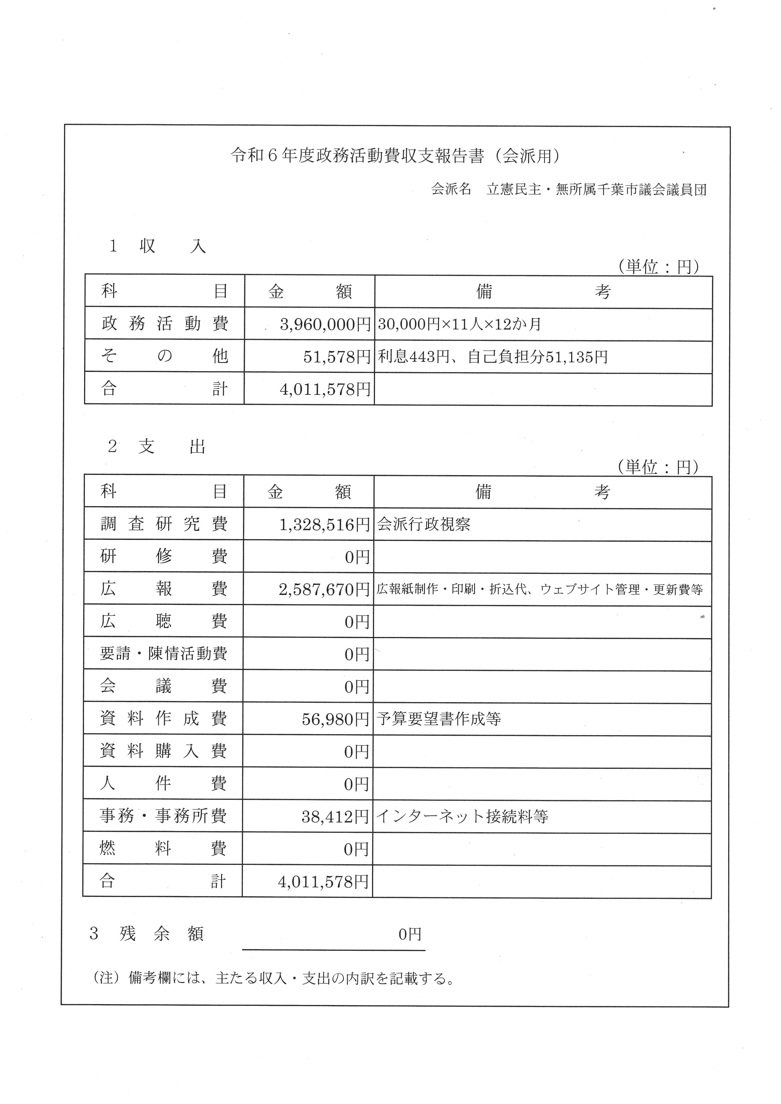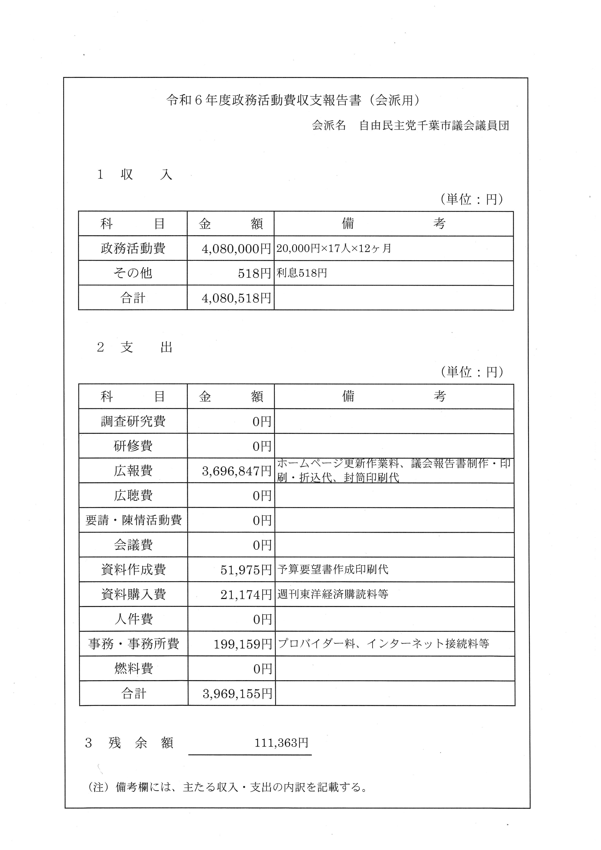 千葉市議会トップページ > 広報・情報公開 > 政務活動費 > 令和6年度交付分(政務活動費収支報告書)