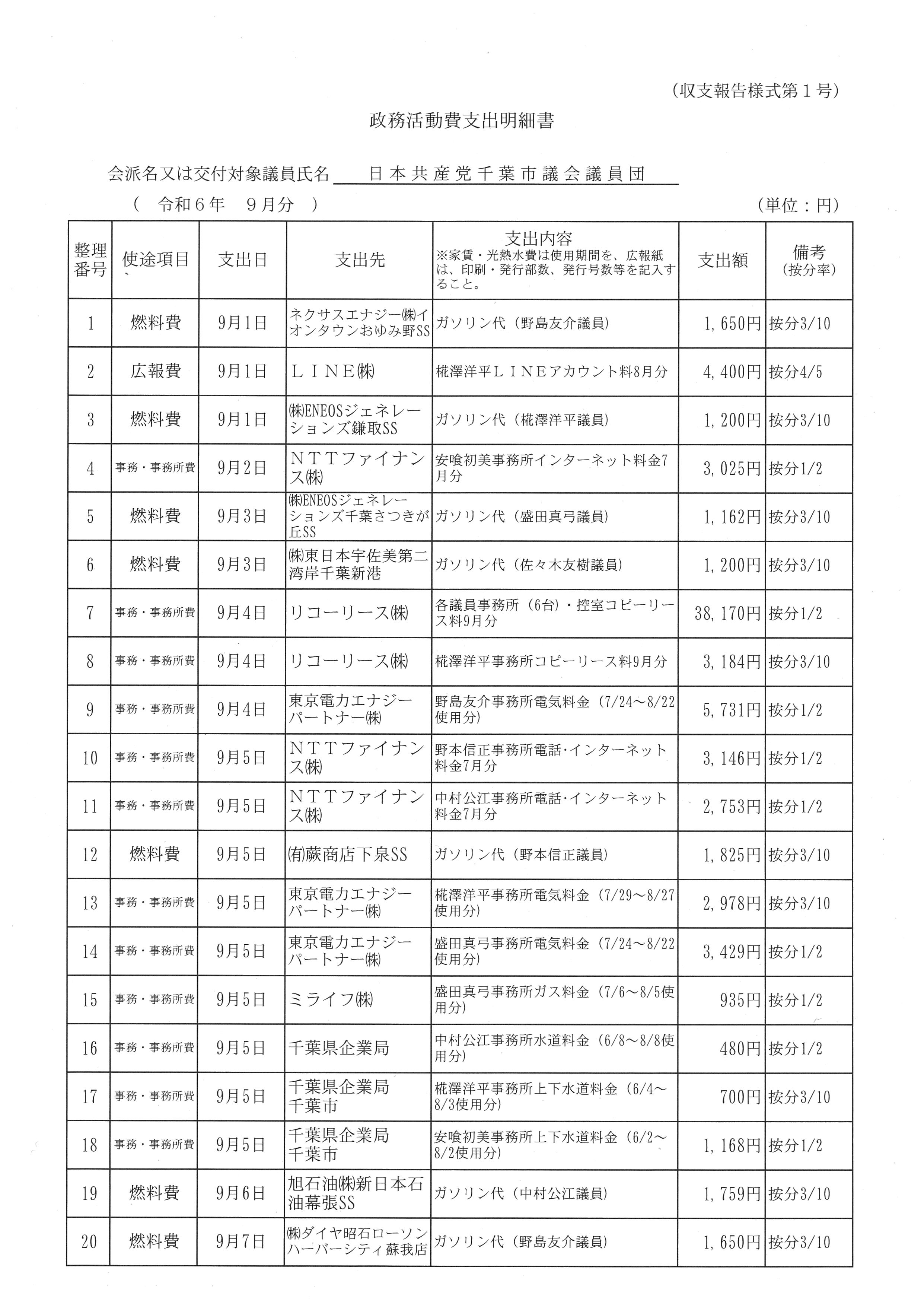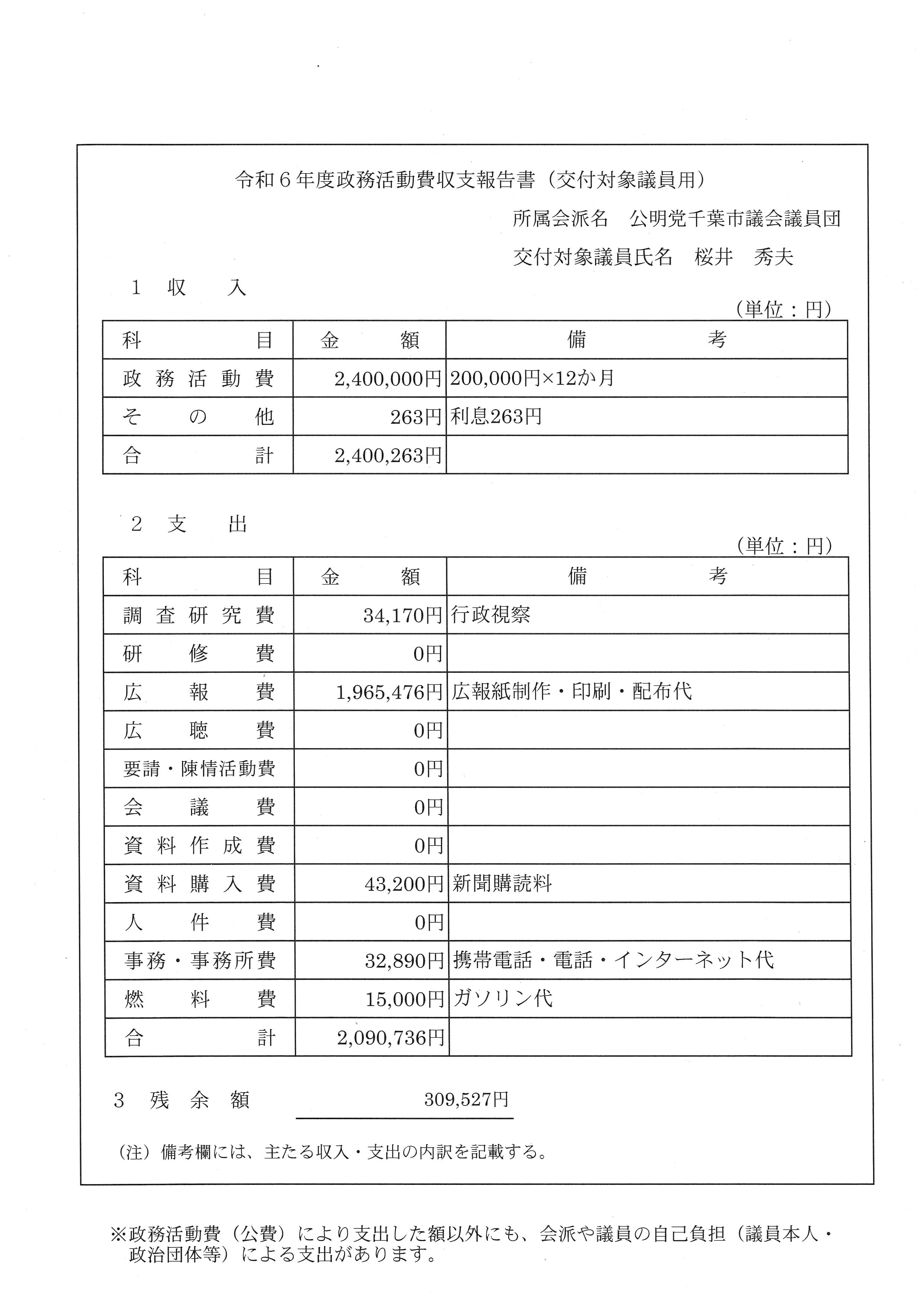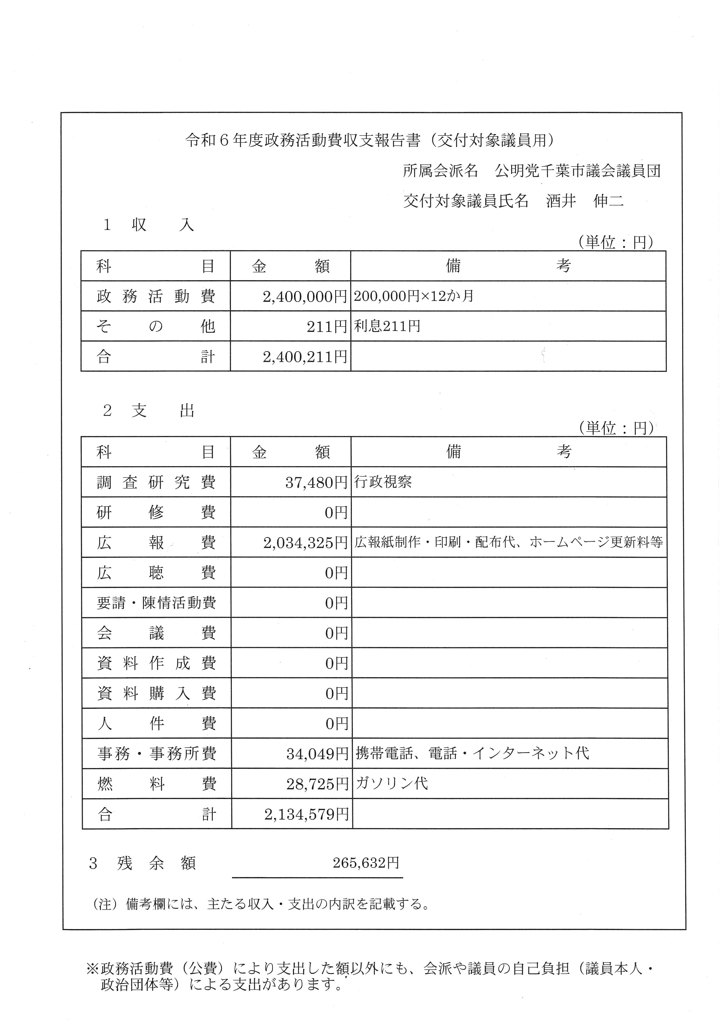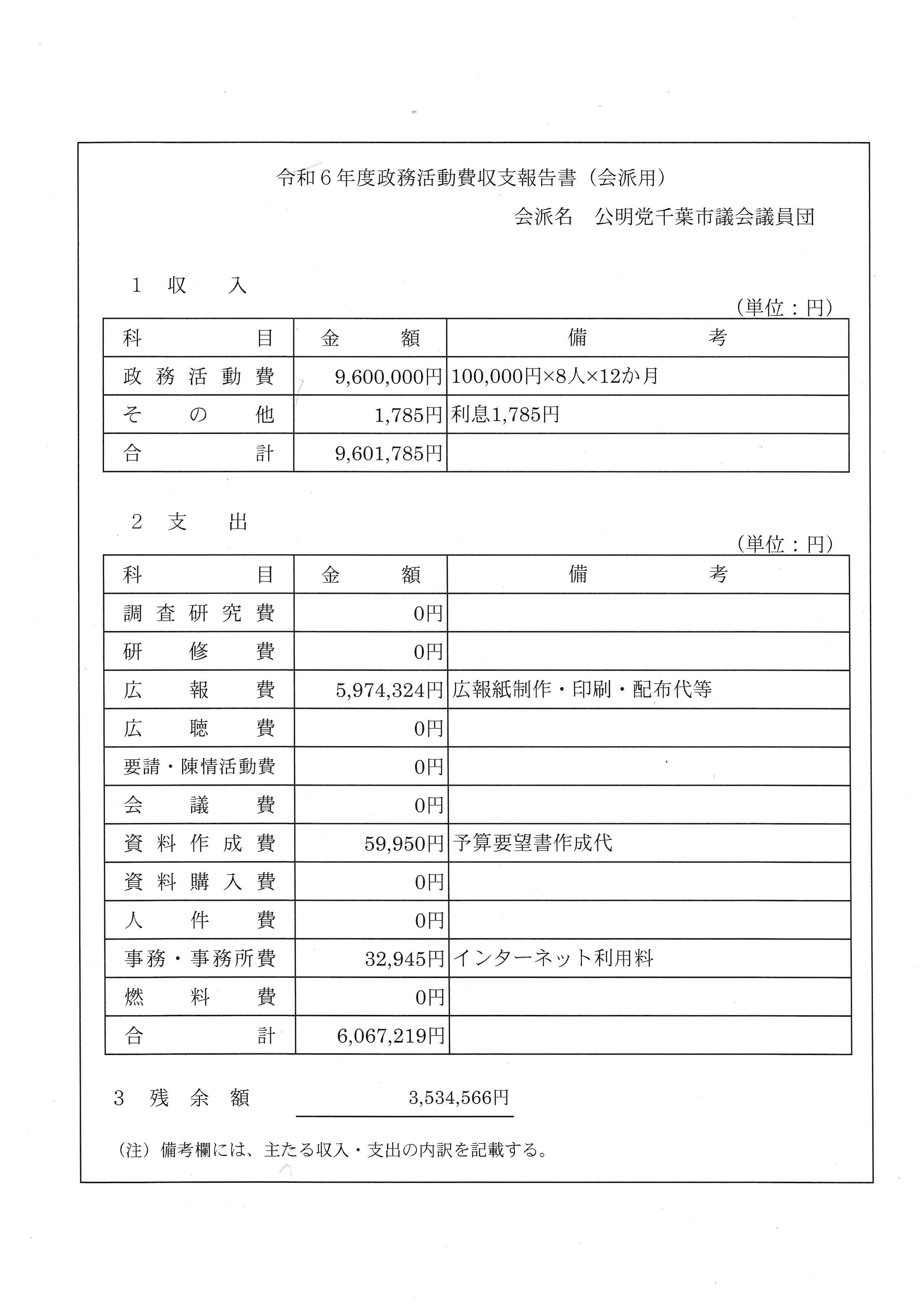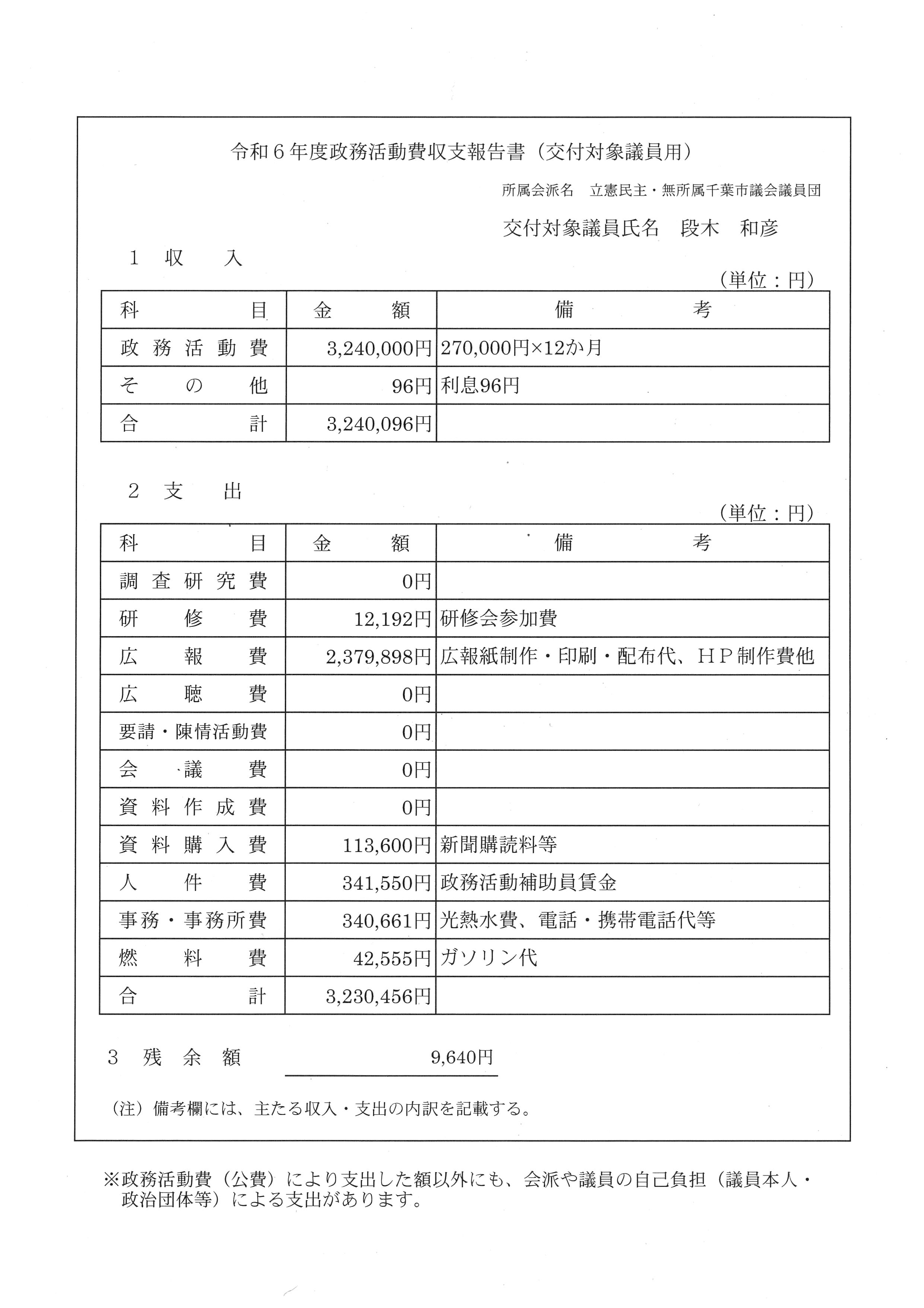 千葉市議会トップページ > 広報・情報公開 > 政務活動費 > 令和6年度交付分(政務活動費収支報告書)