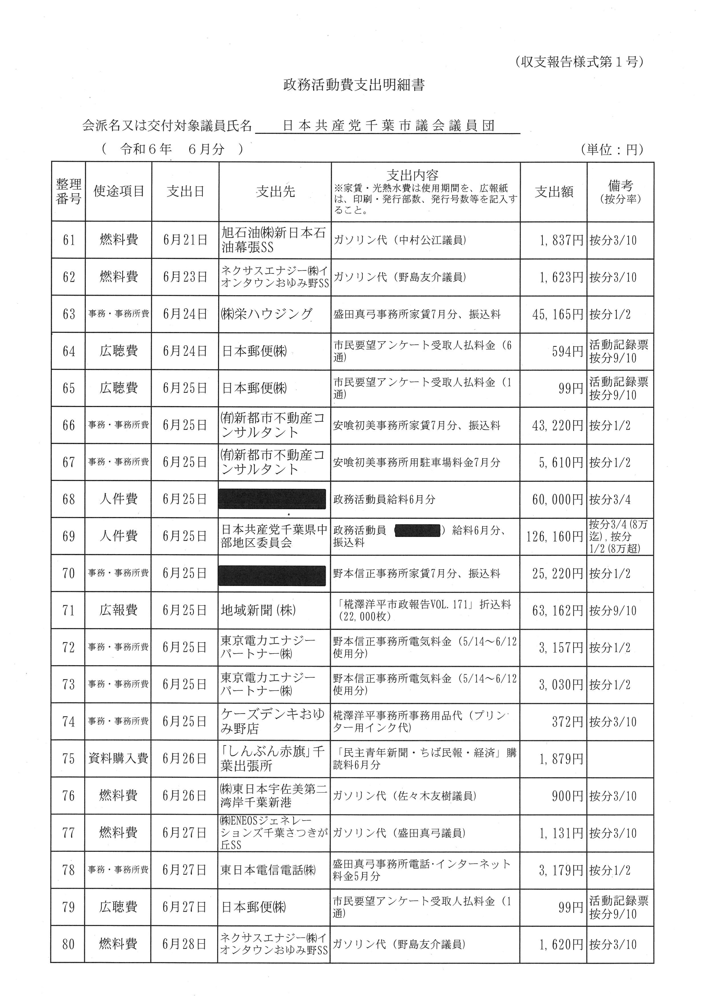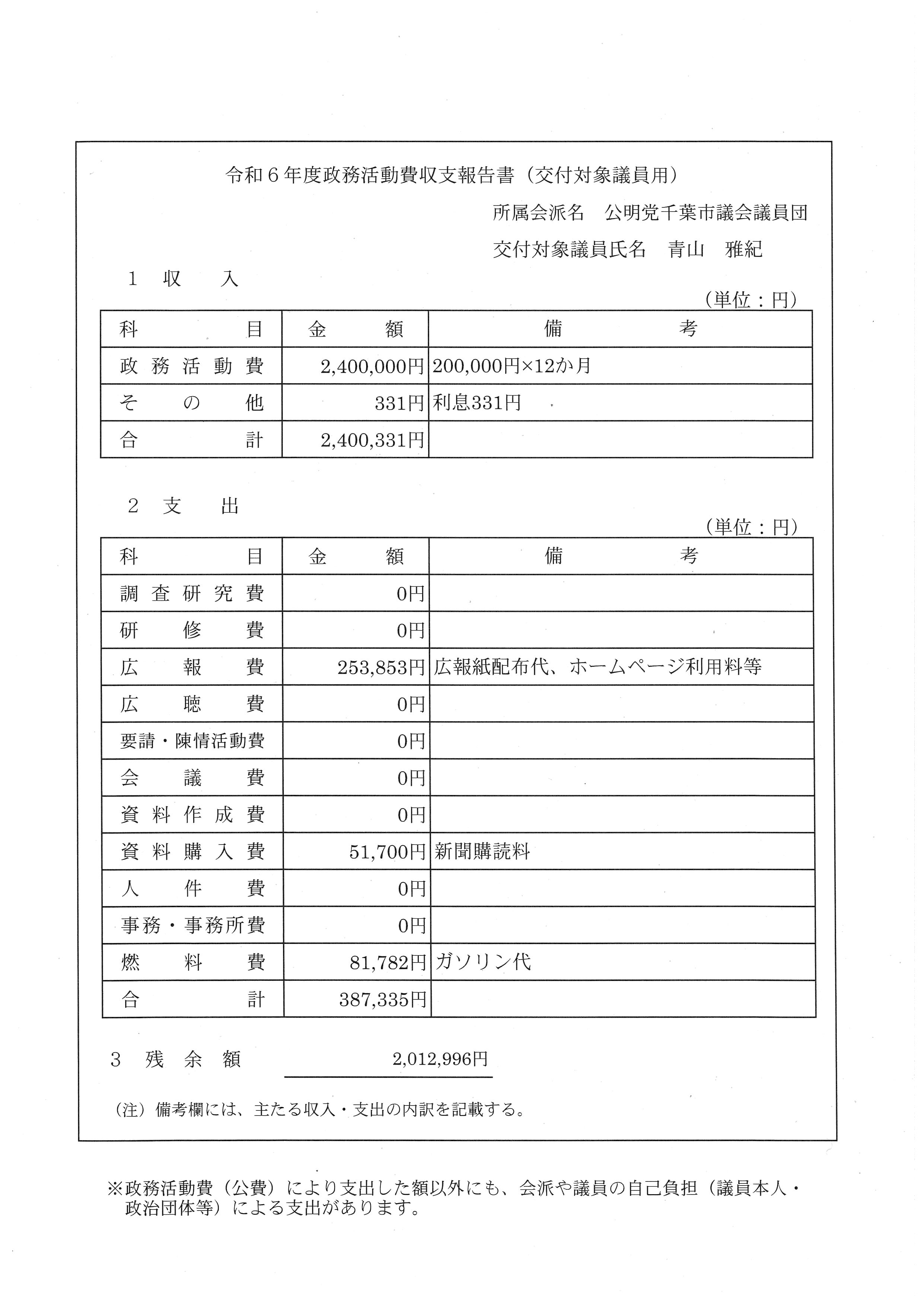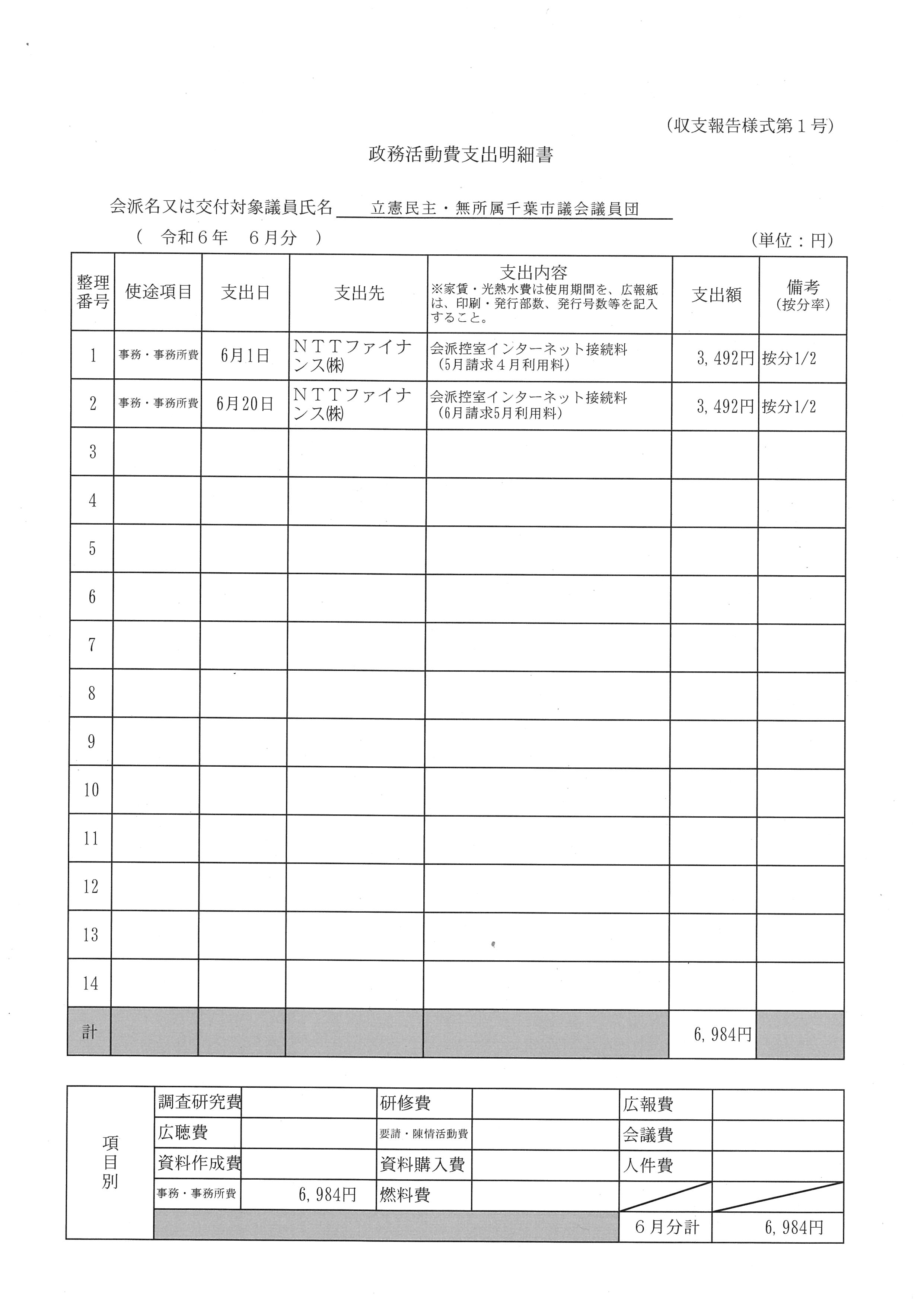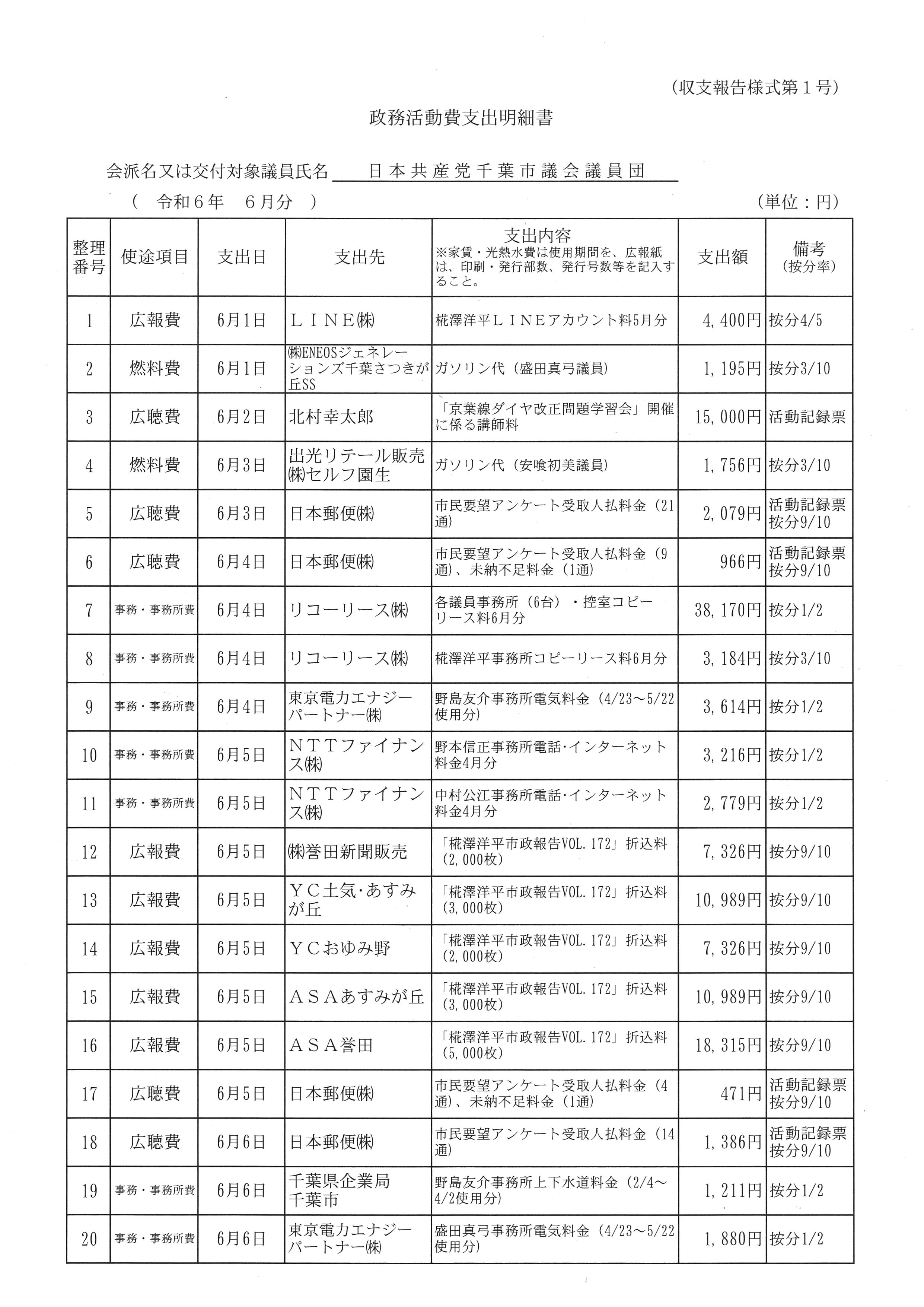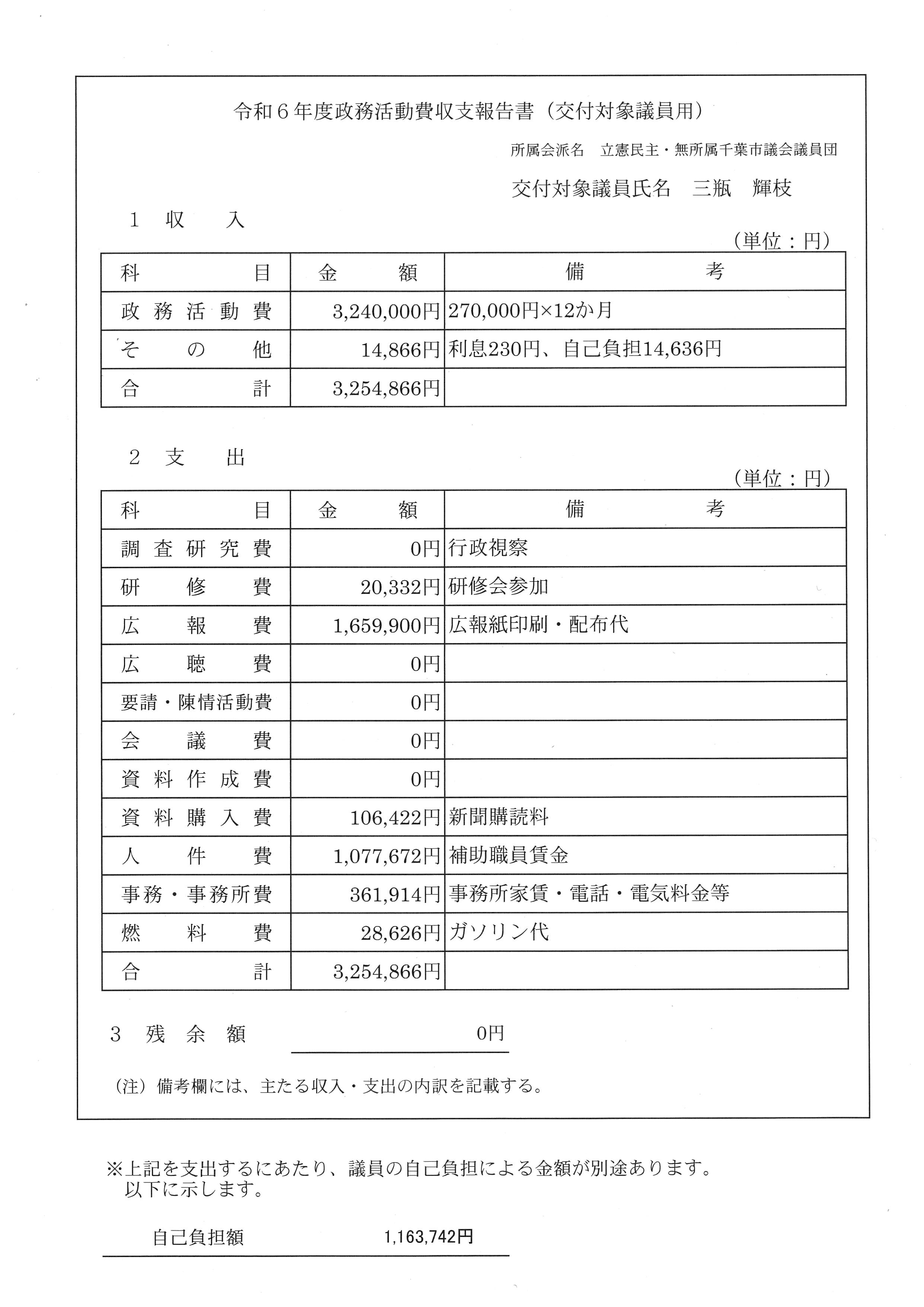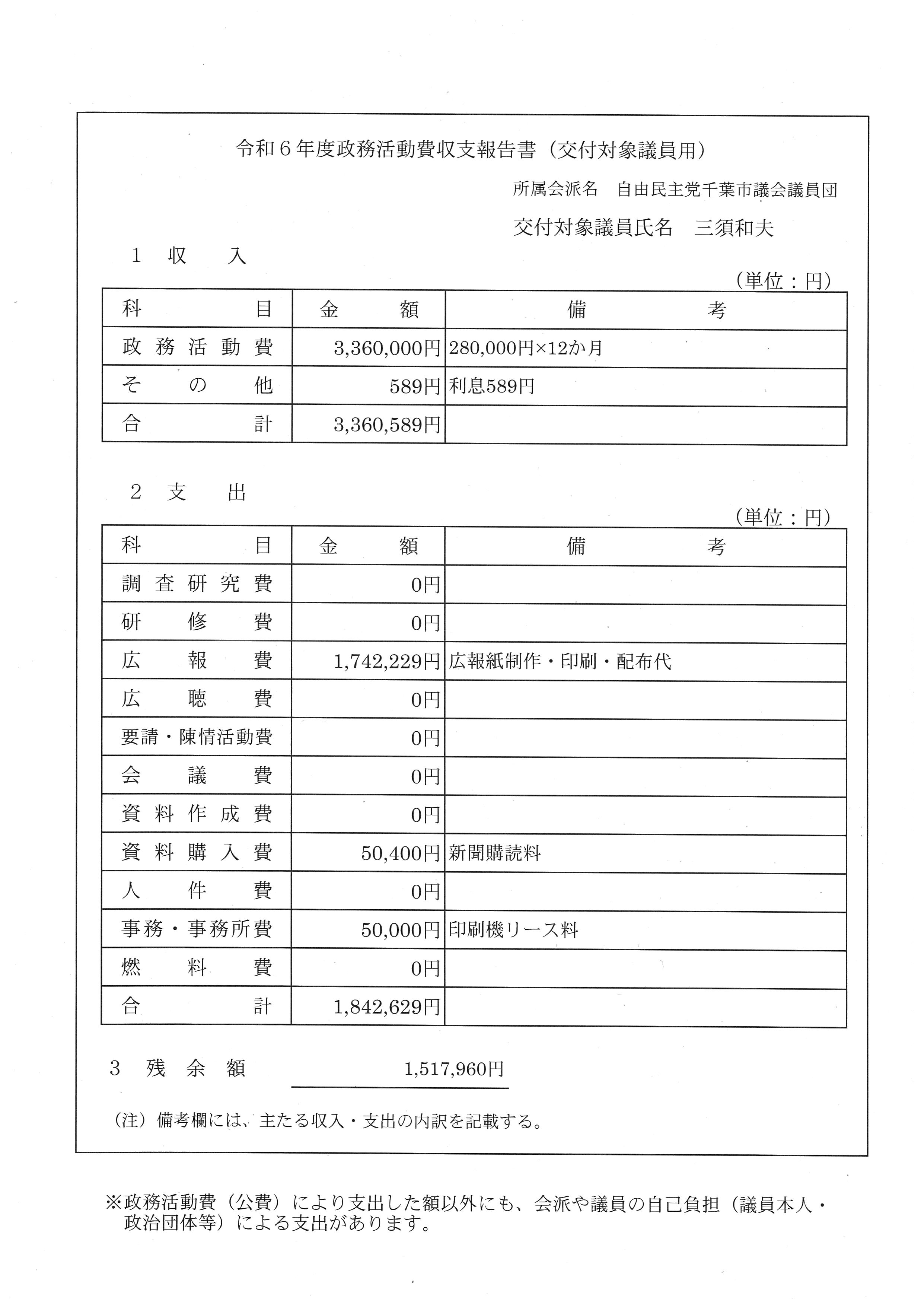 千葉市議会トップページ > 広報・情報公開 > 政務活動費 > 令和6年度交付分(政務活動費収支報告書)