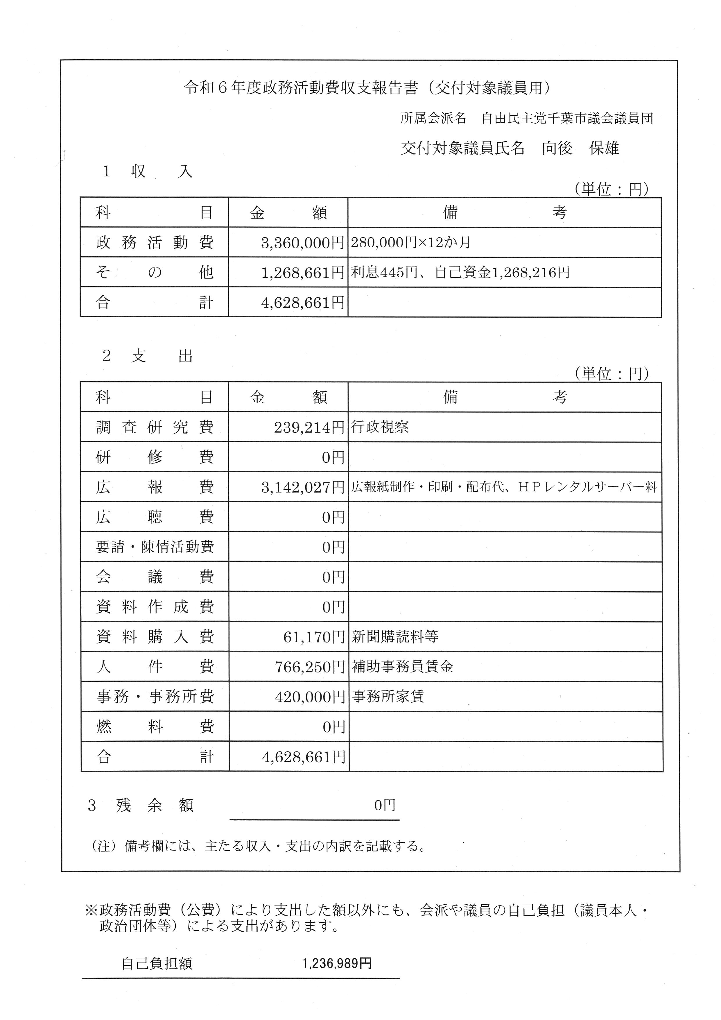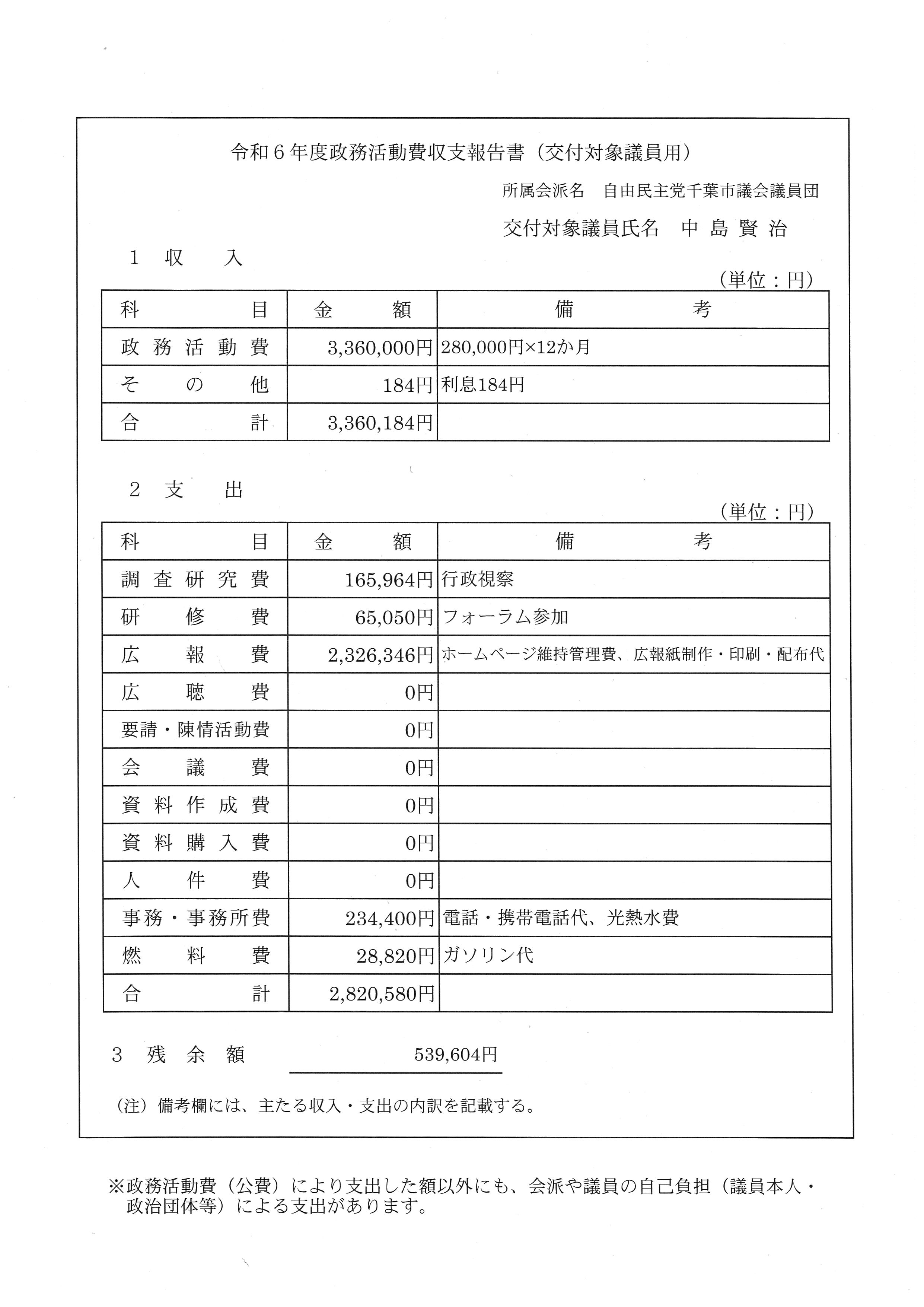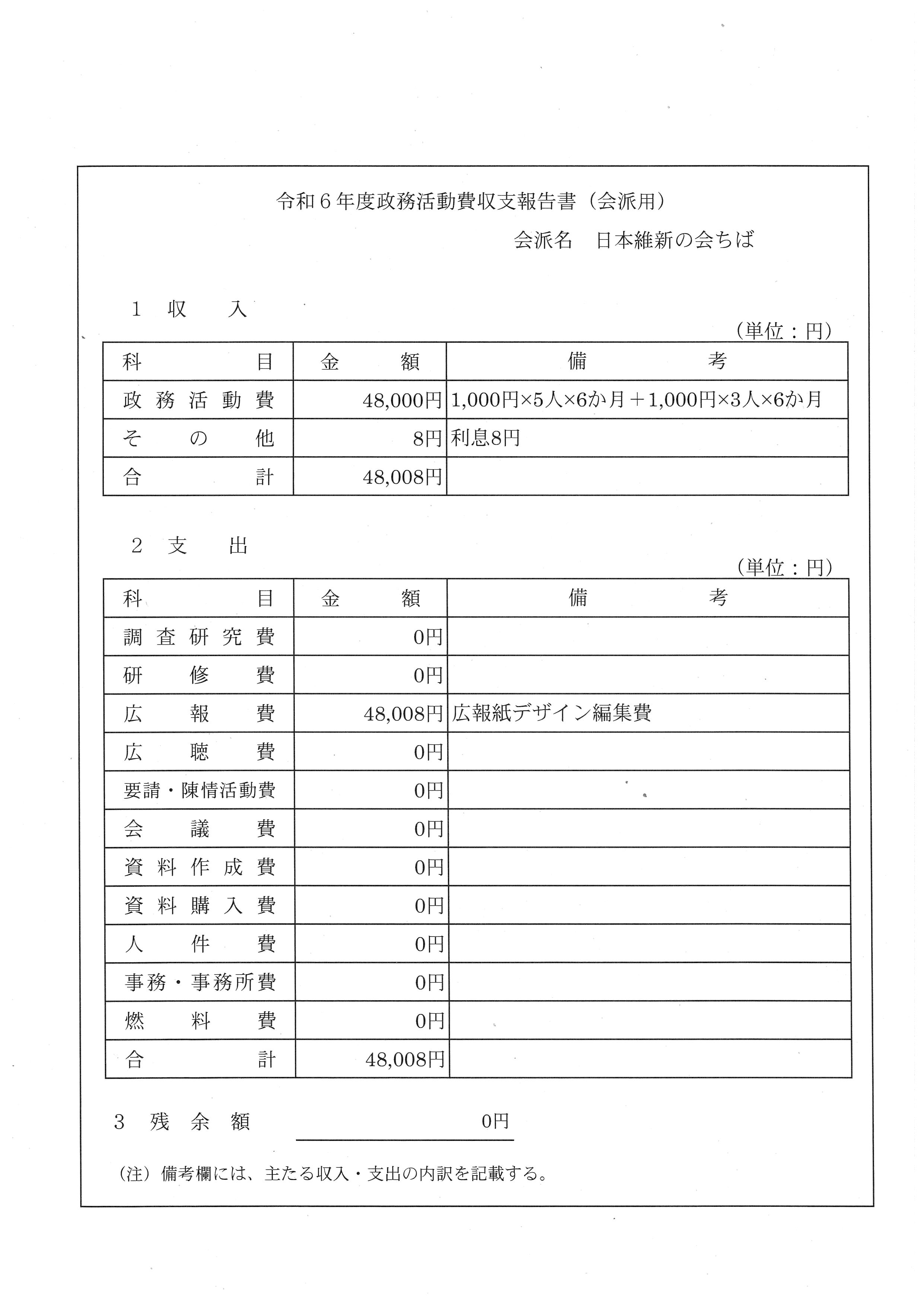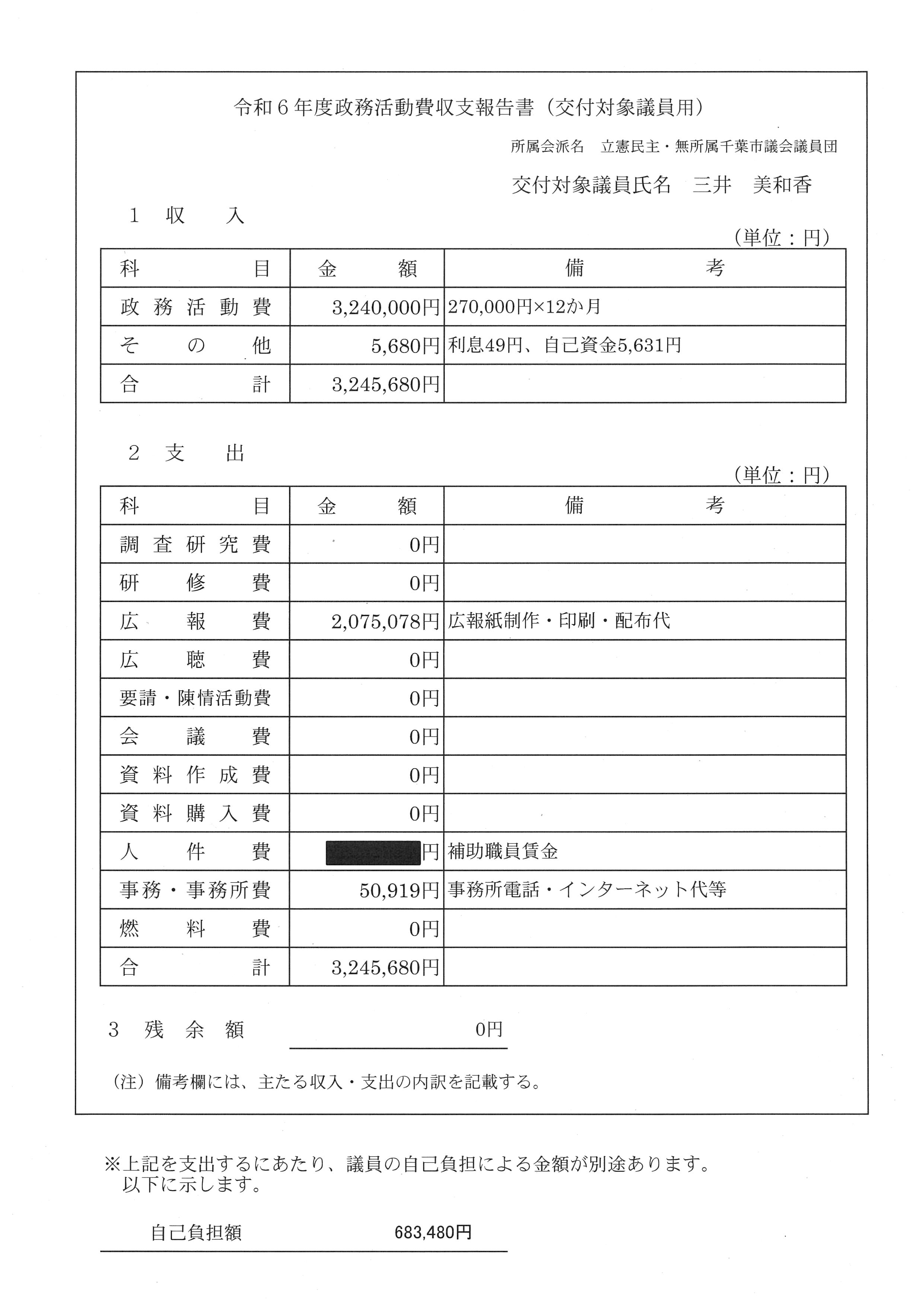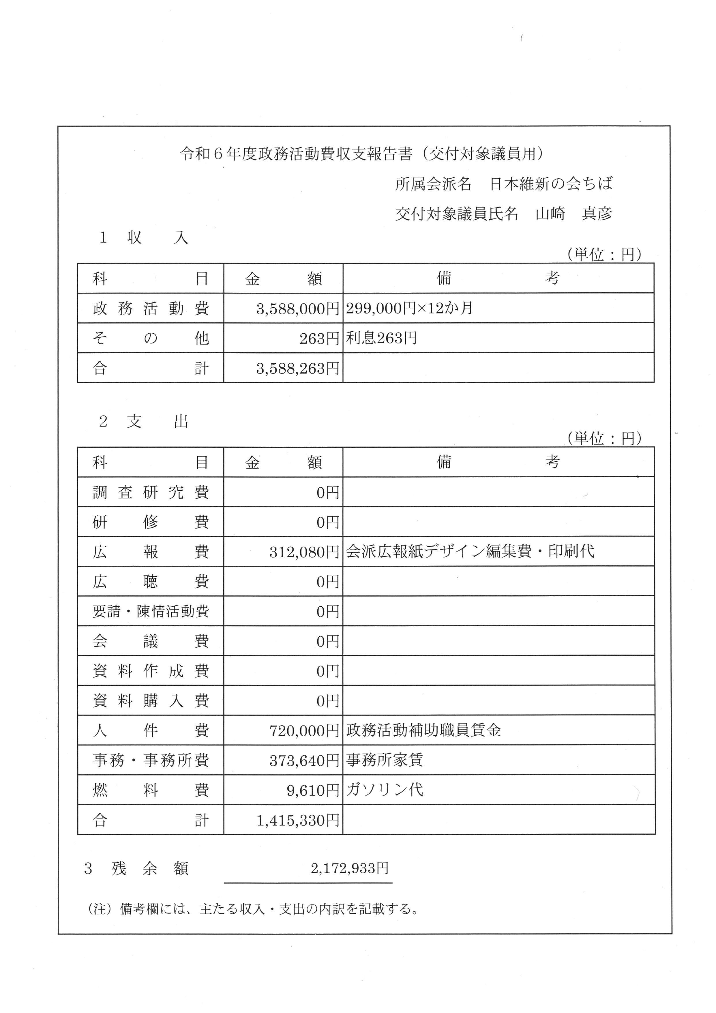千葉市議会トップページ > 広報・情報公開 > 政務活動費 > 令和6年度交付分(政務活動費収支報告書)