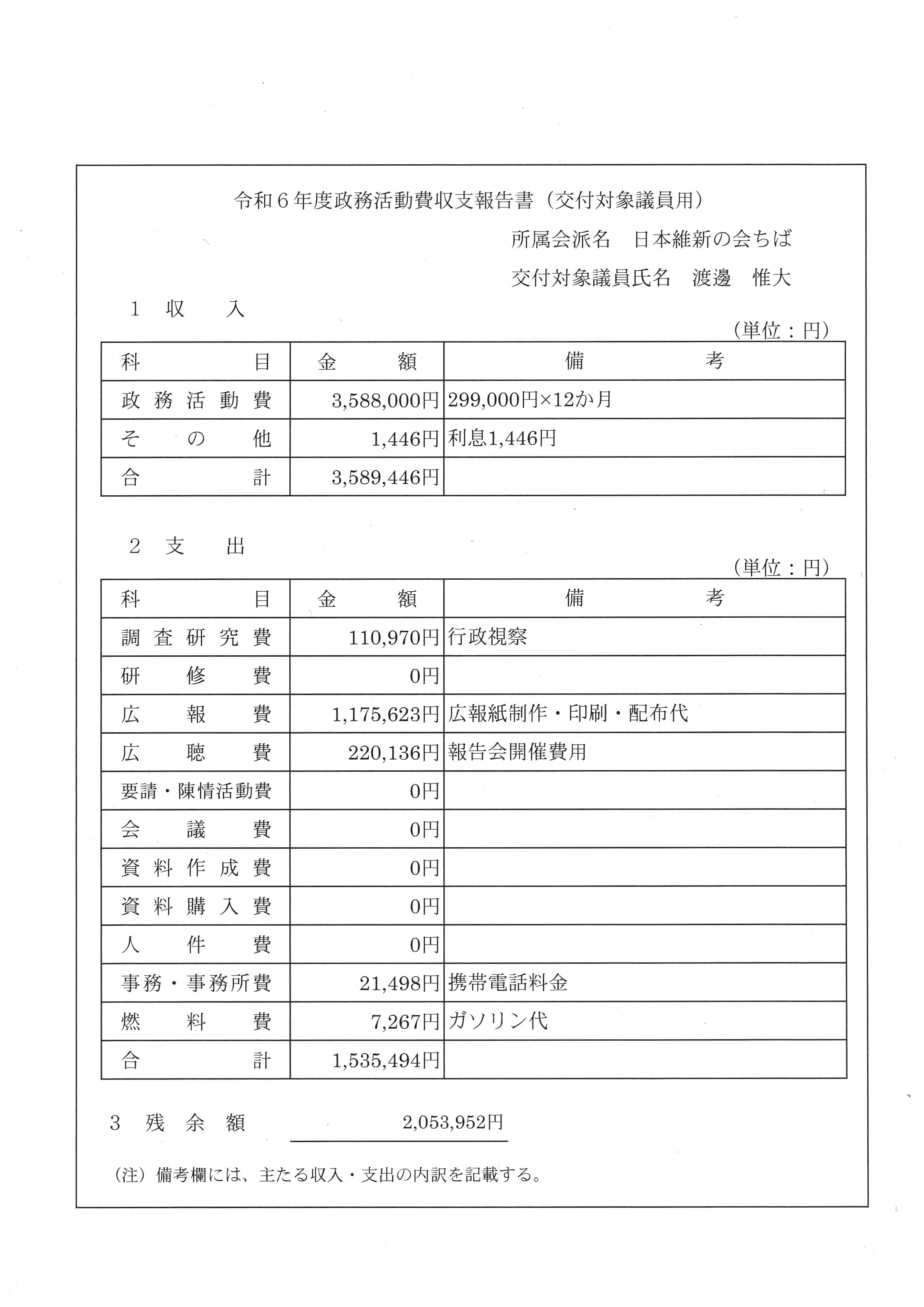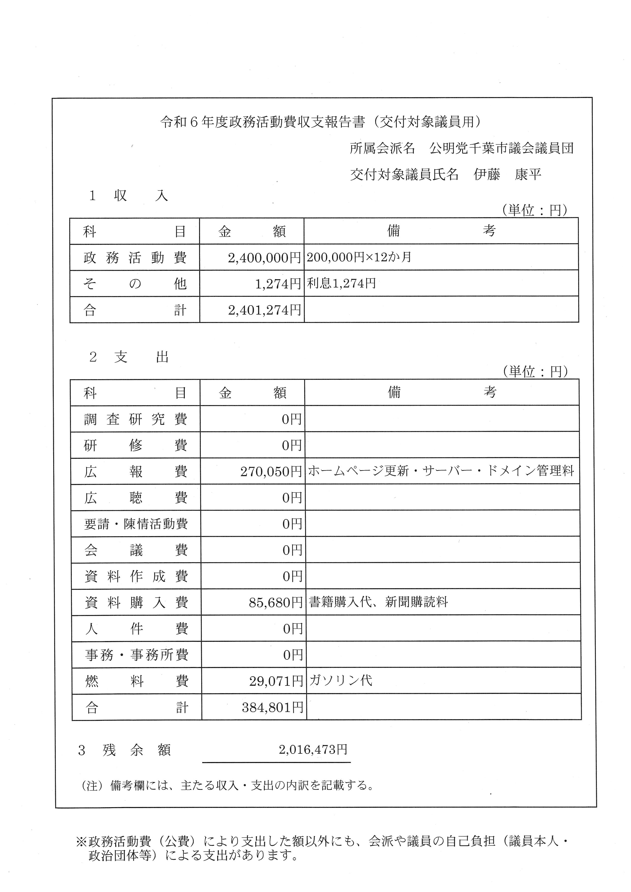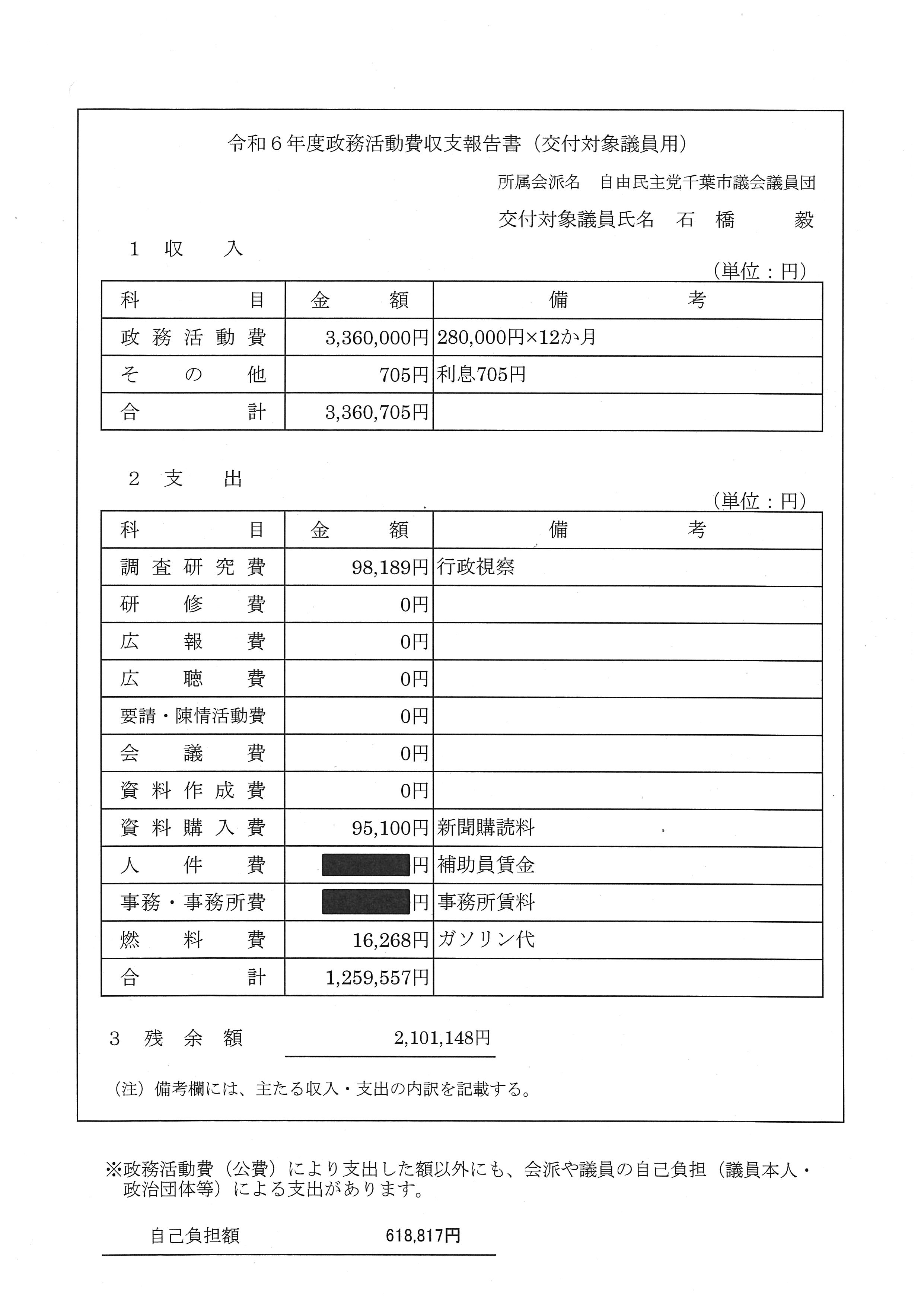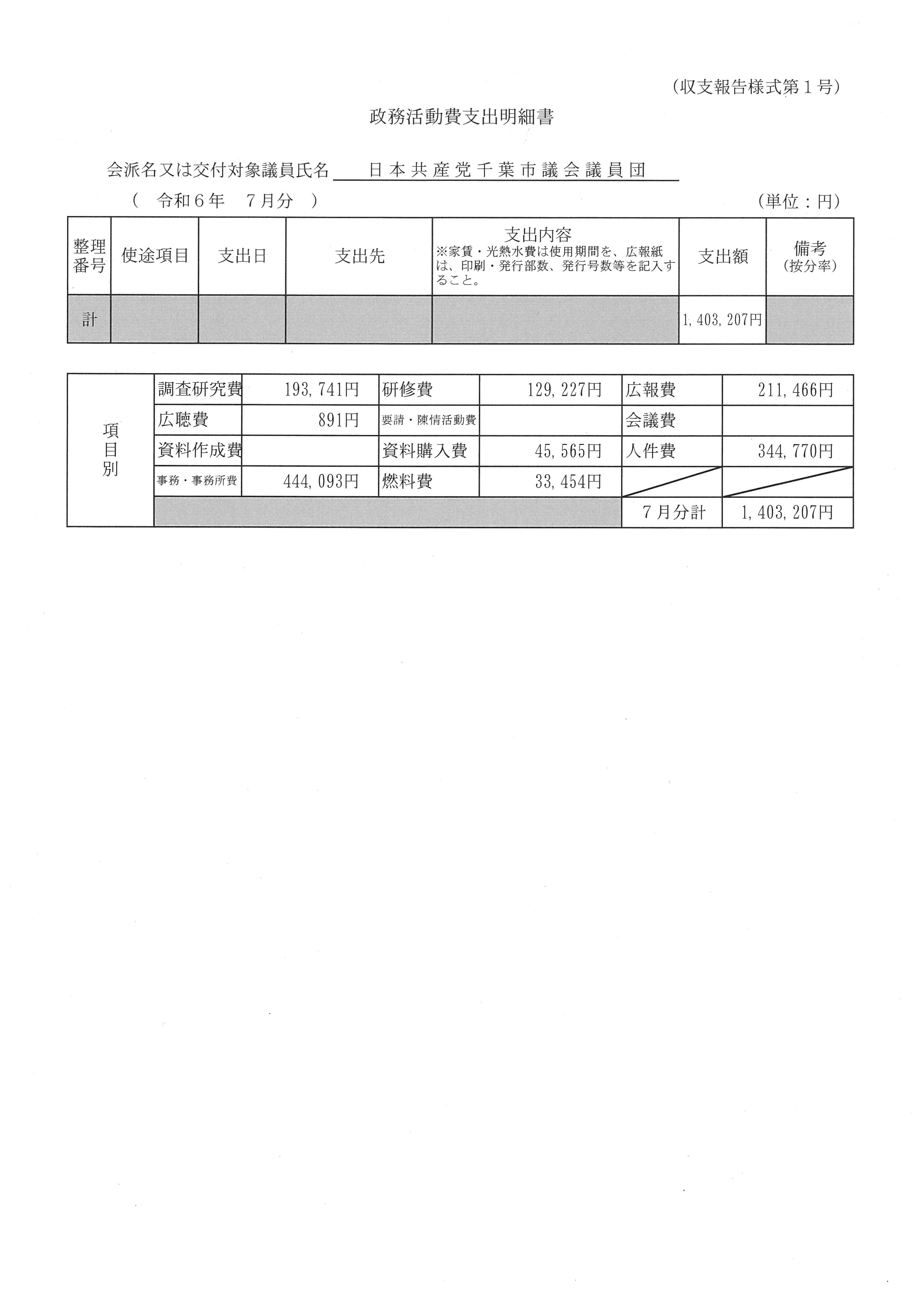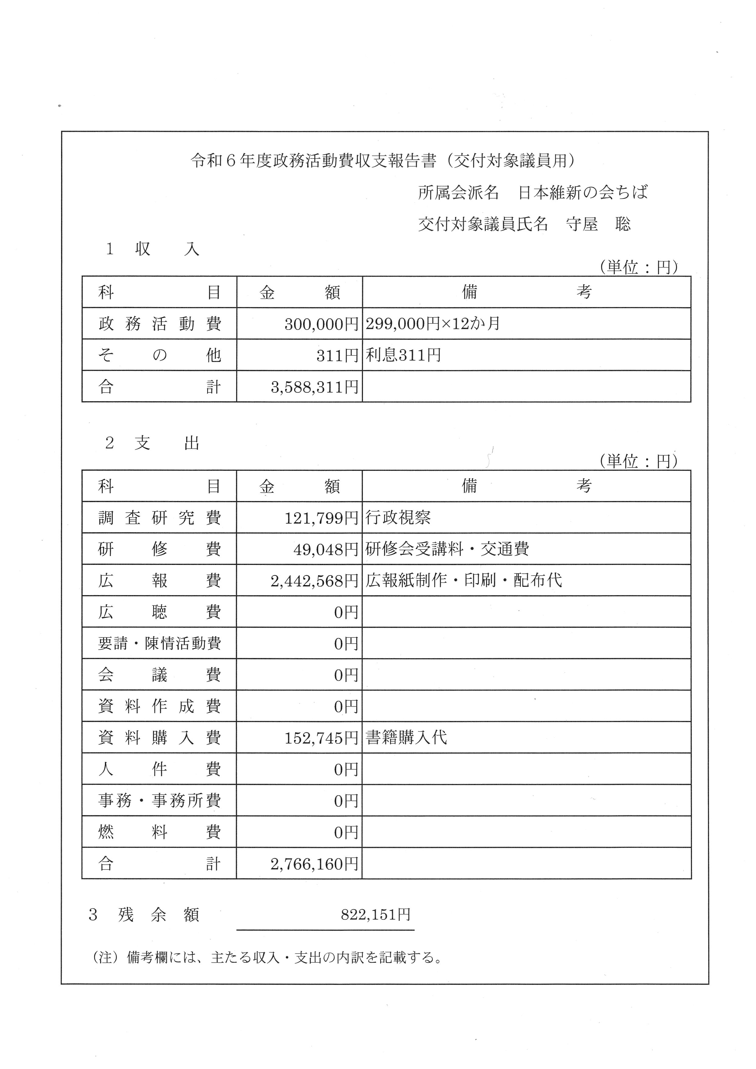 千葉市議会トップページ > 広報・情報公開 > 政務活動費 > 令和6年度交付分(政務活動費収支報告書)