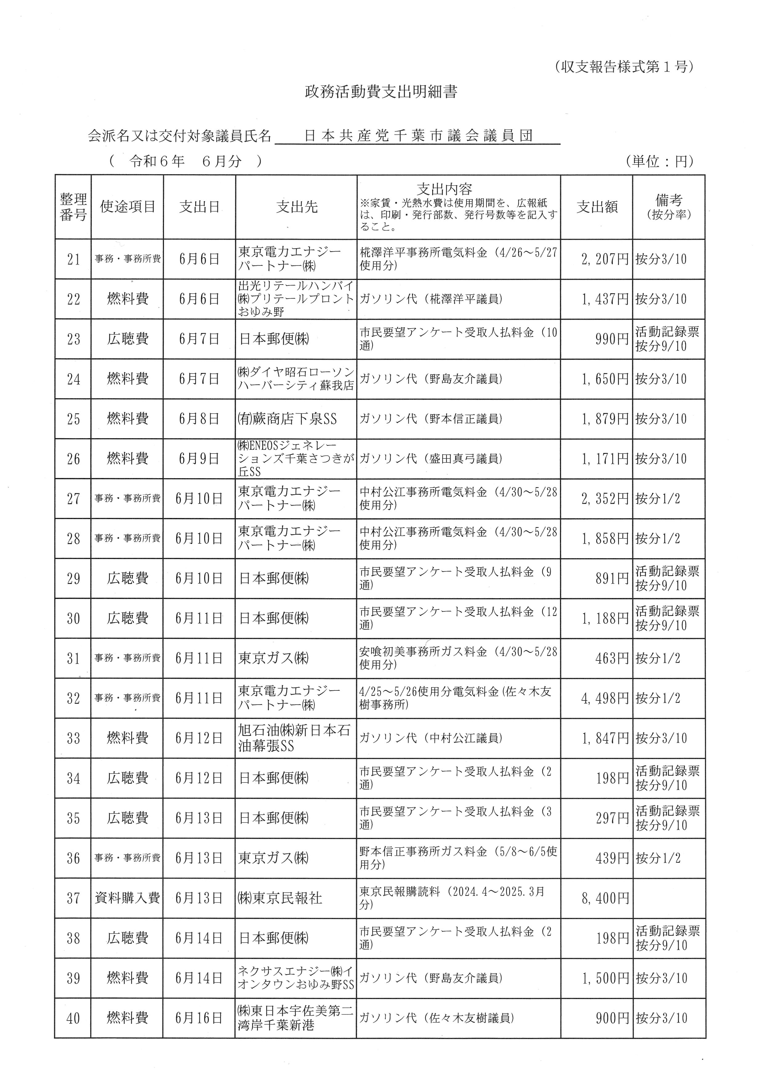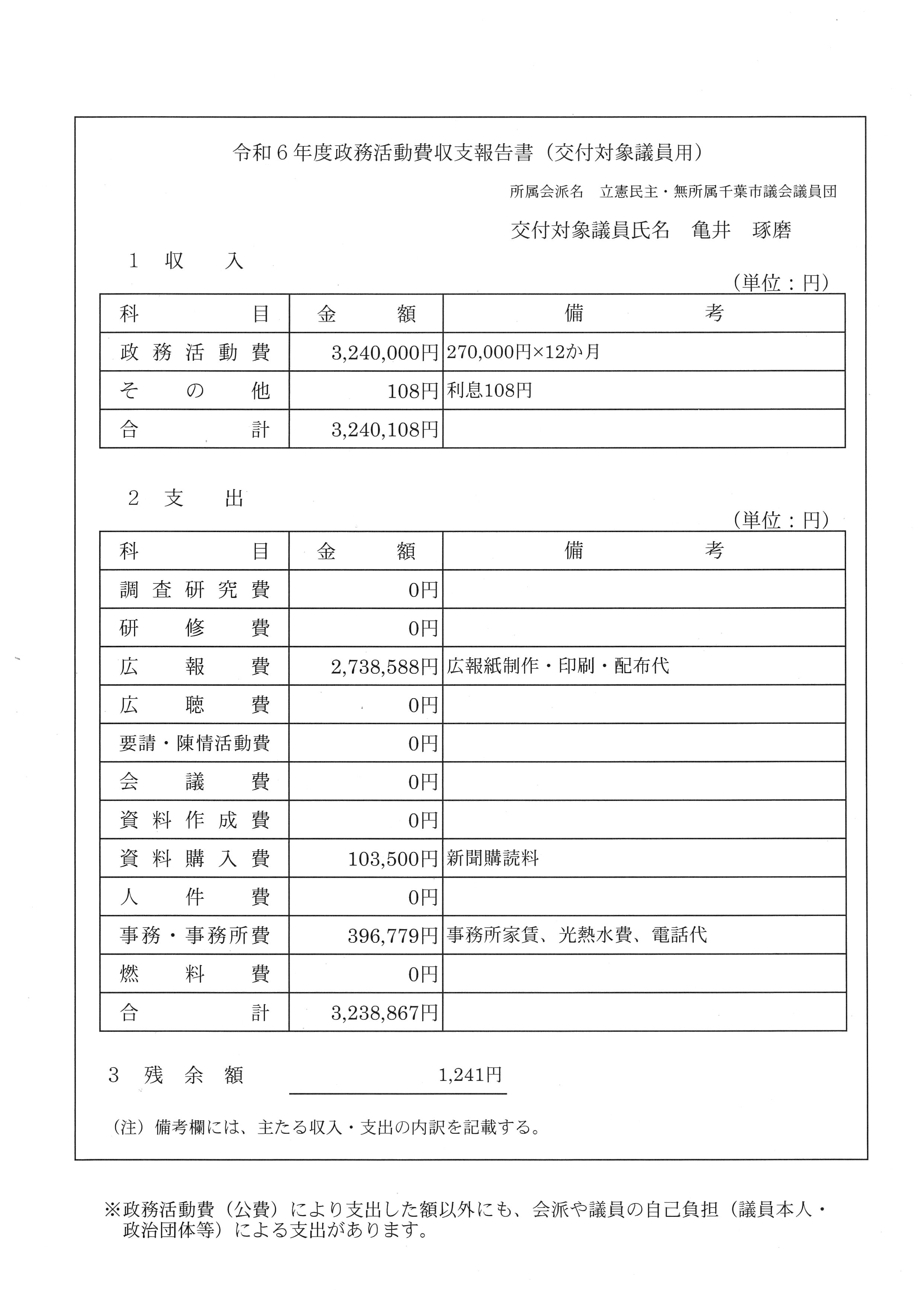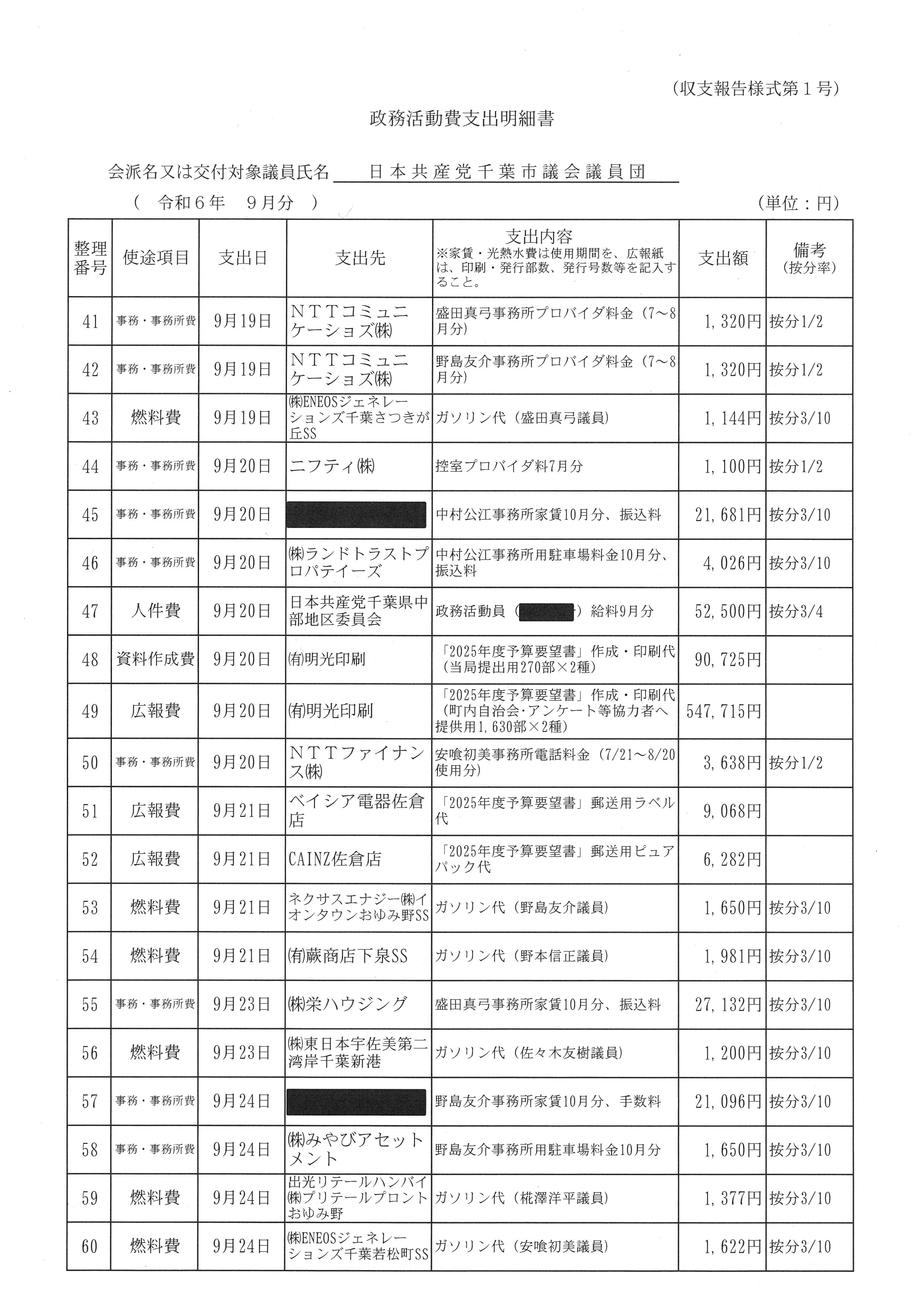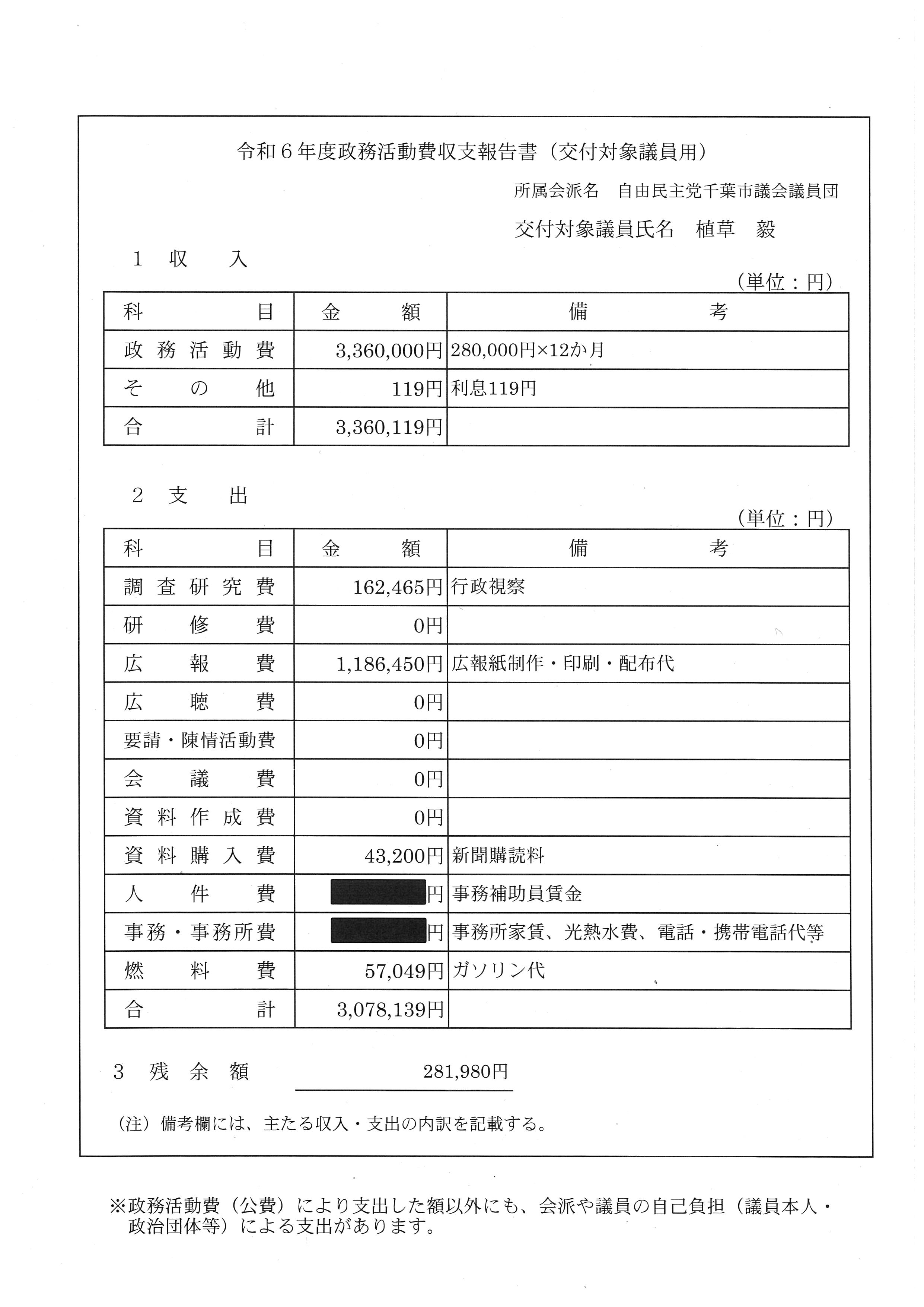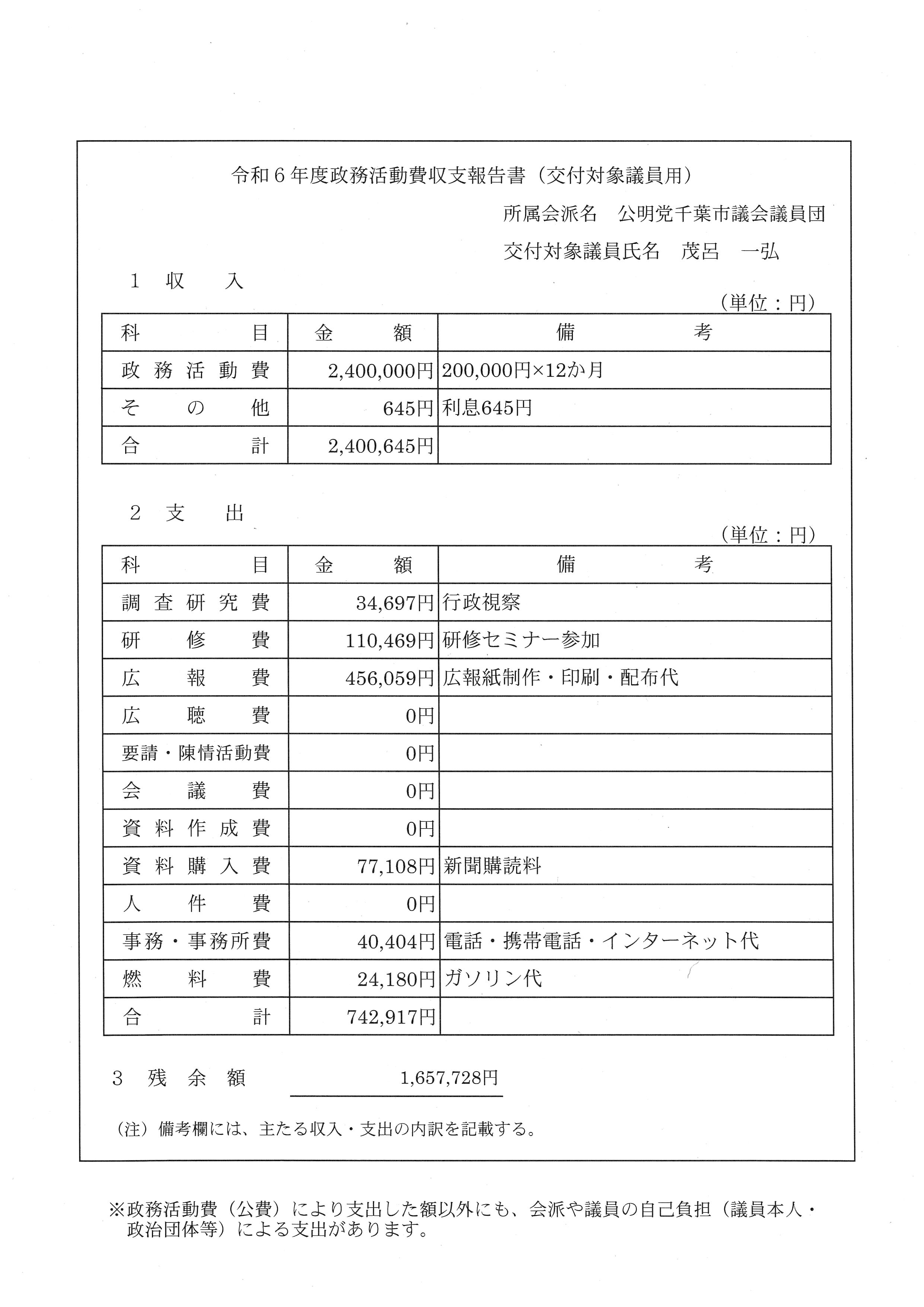 千葉市議会トップページ > 広報・情報公開 > 政務活動費 > 令和6年度交付分(政務活動費収支報告書)