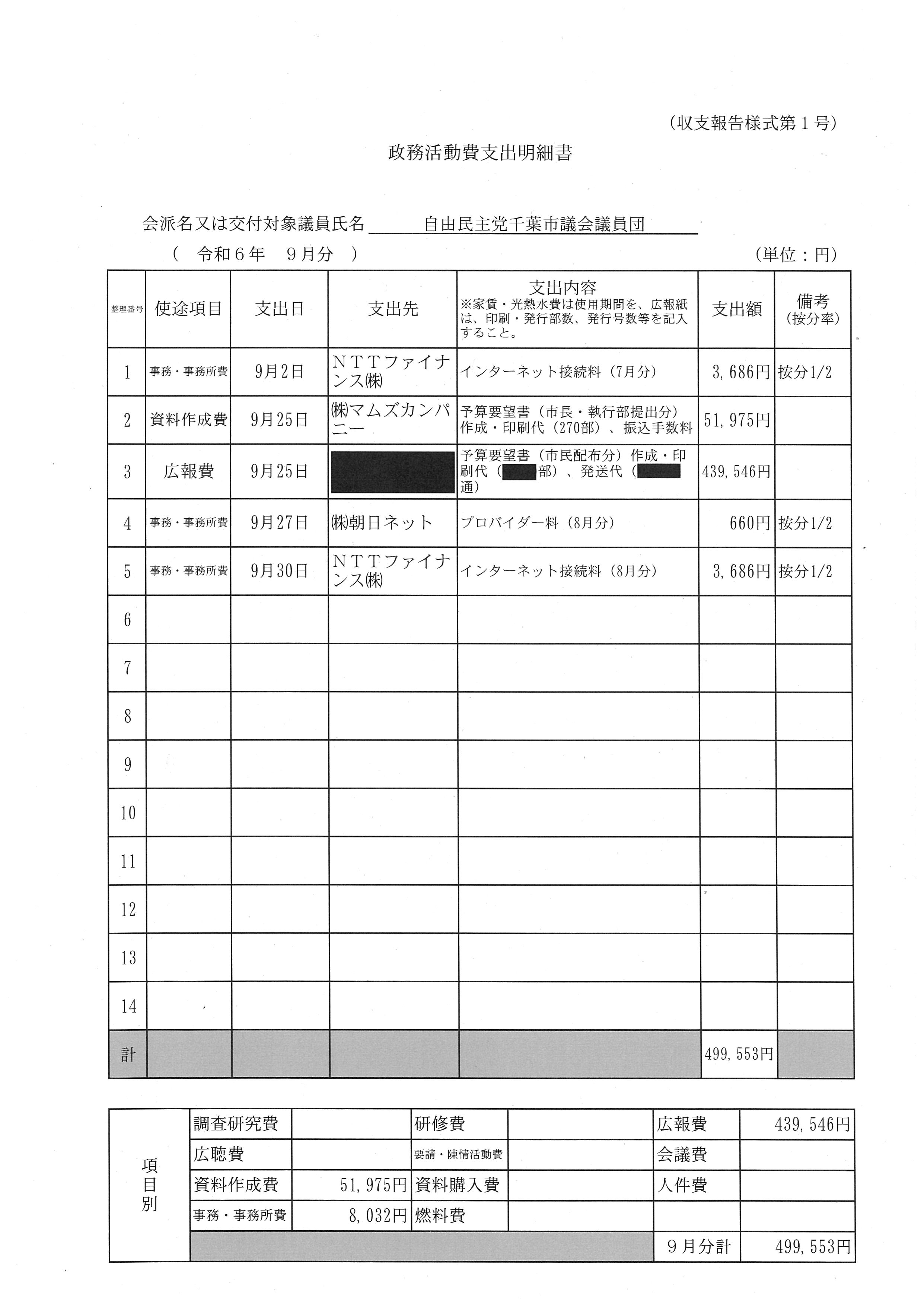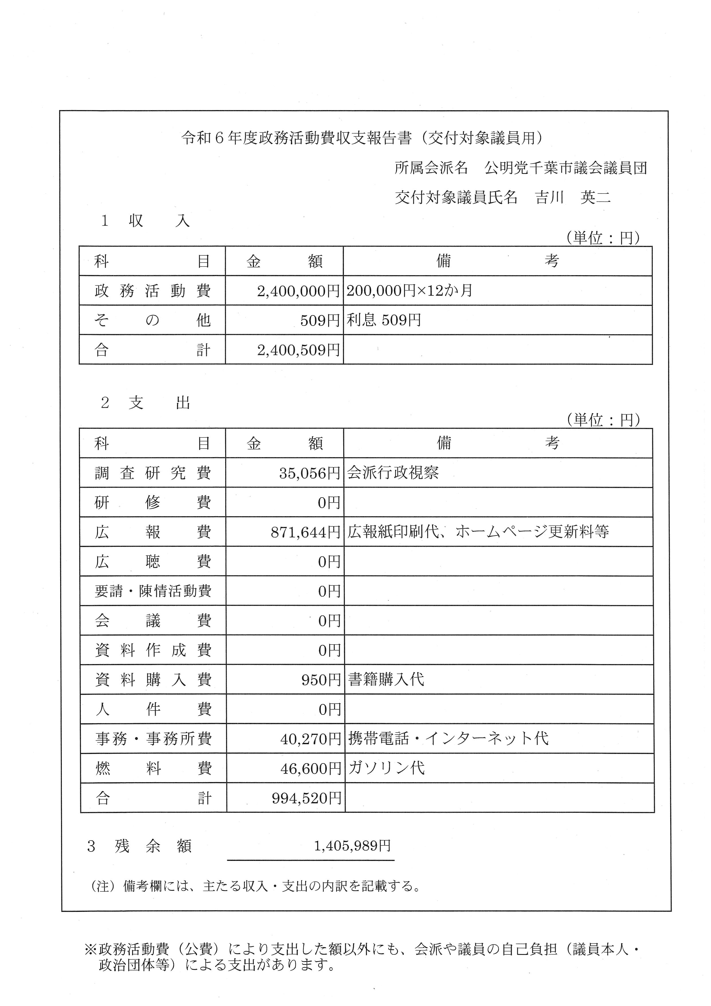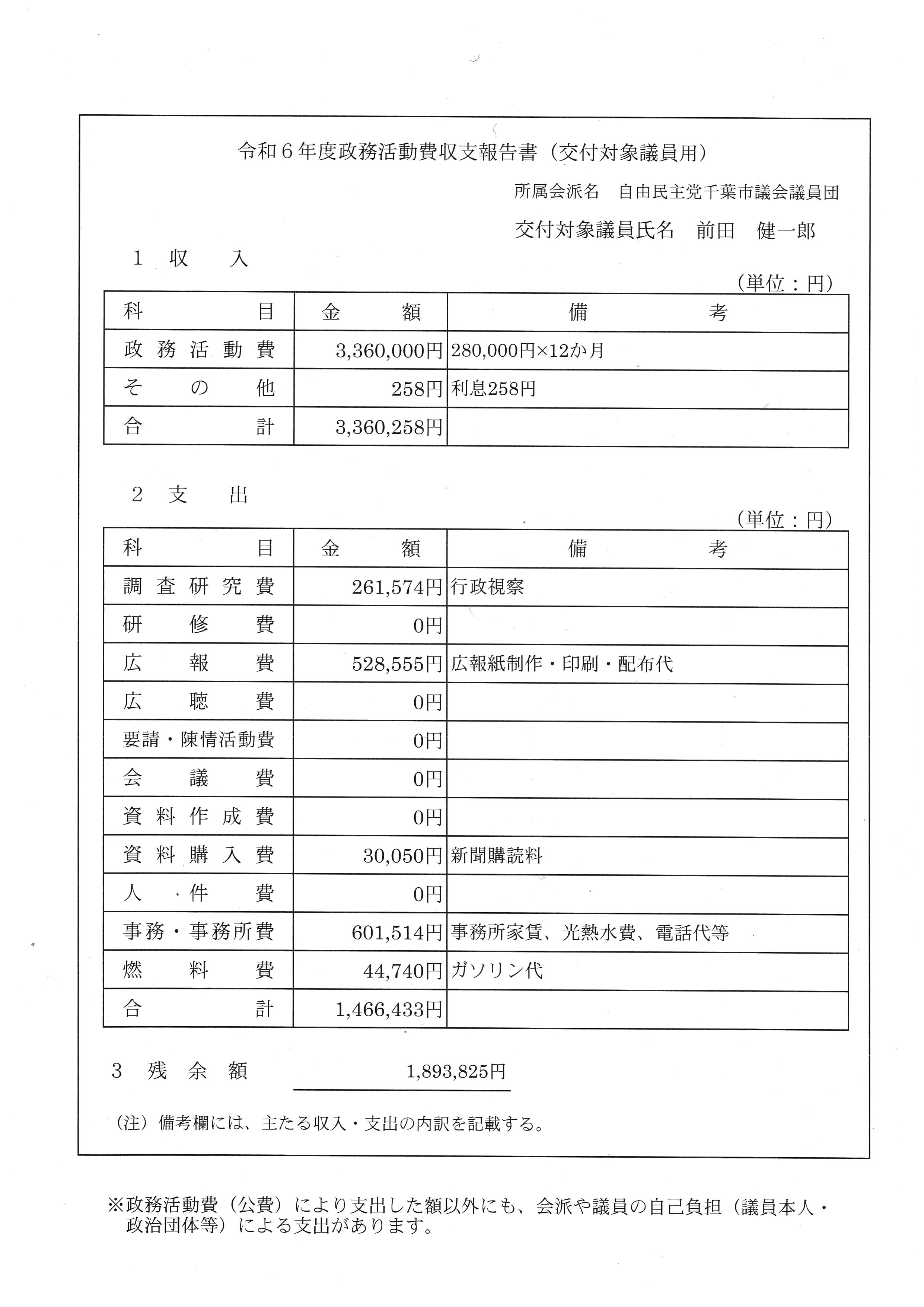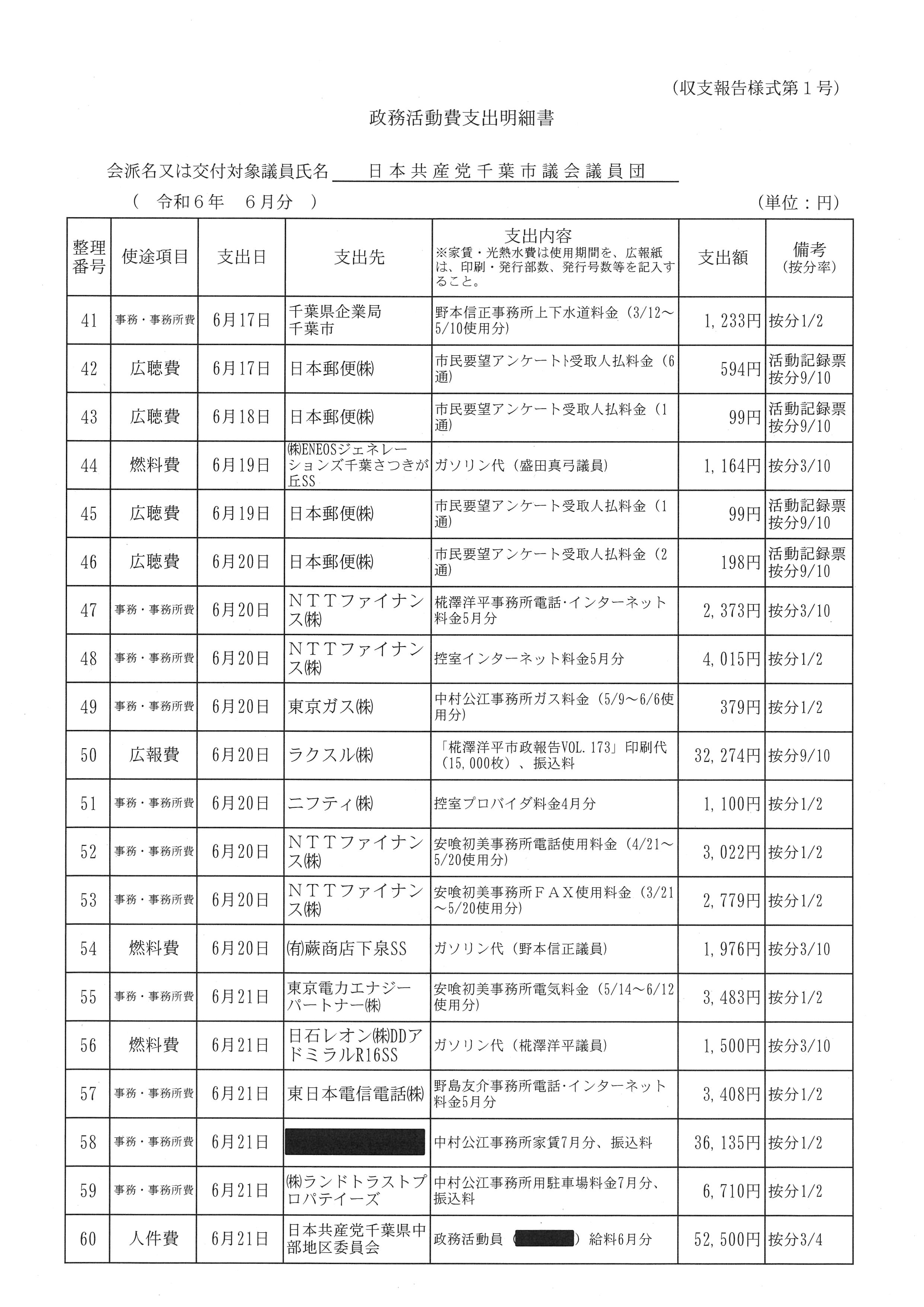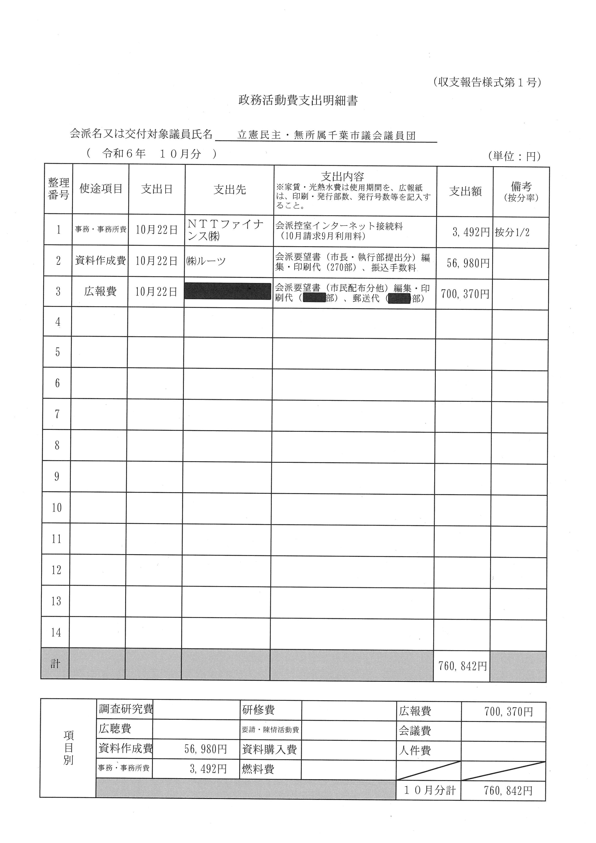 千葉市議会トップページ > 広報・情報公開 > 政務活動費 > 令和6年度交付分(政務活動費収支報告書)