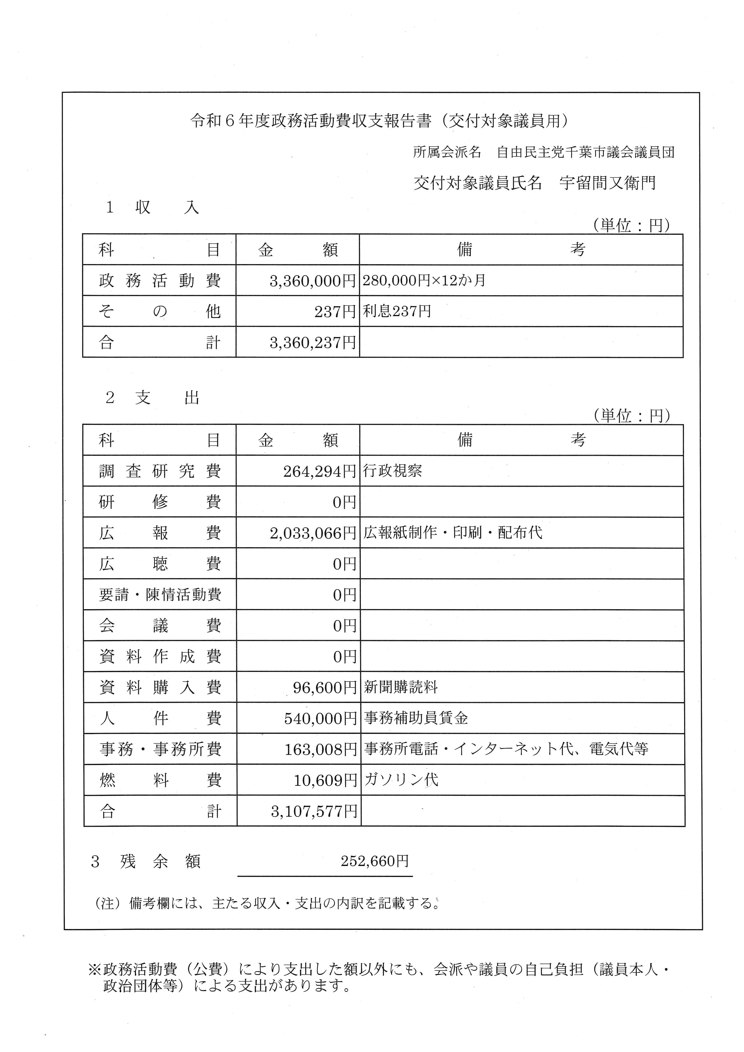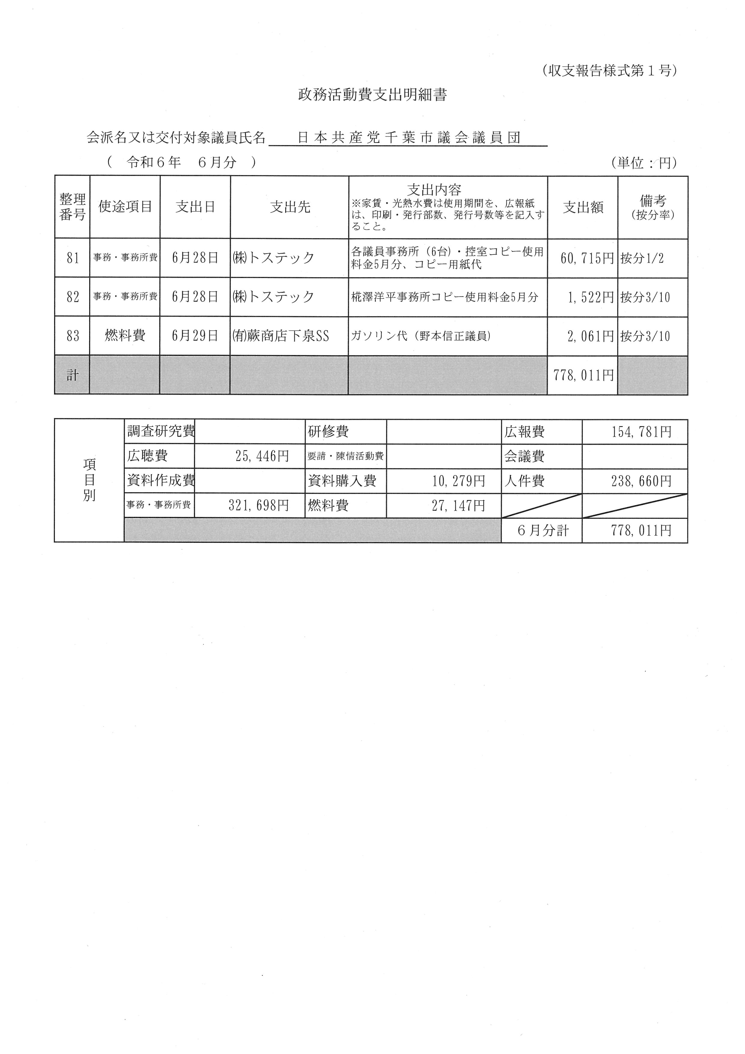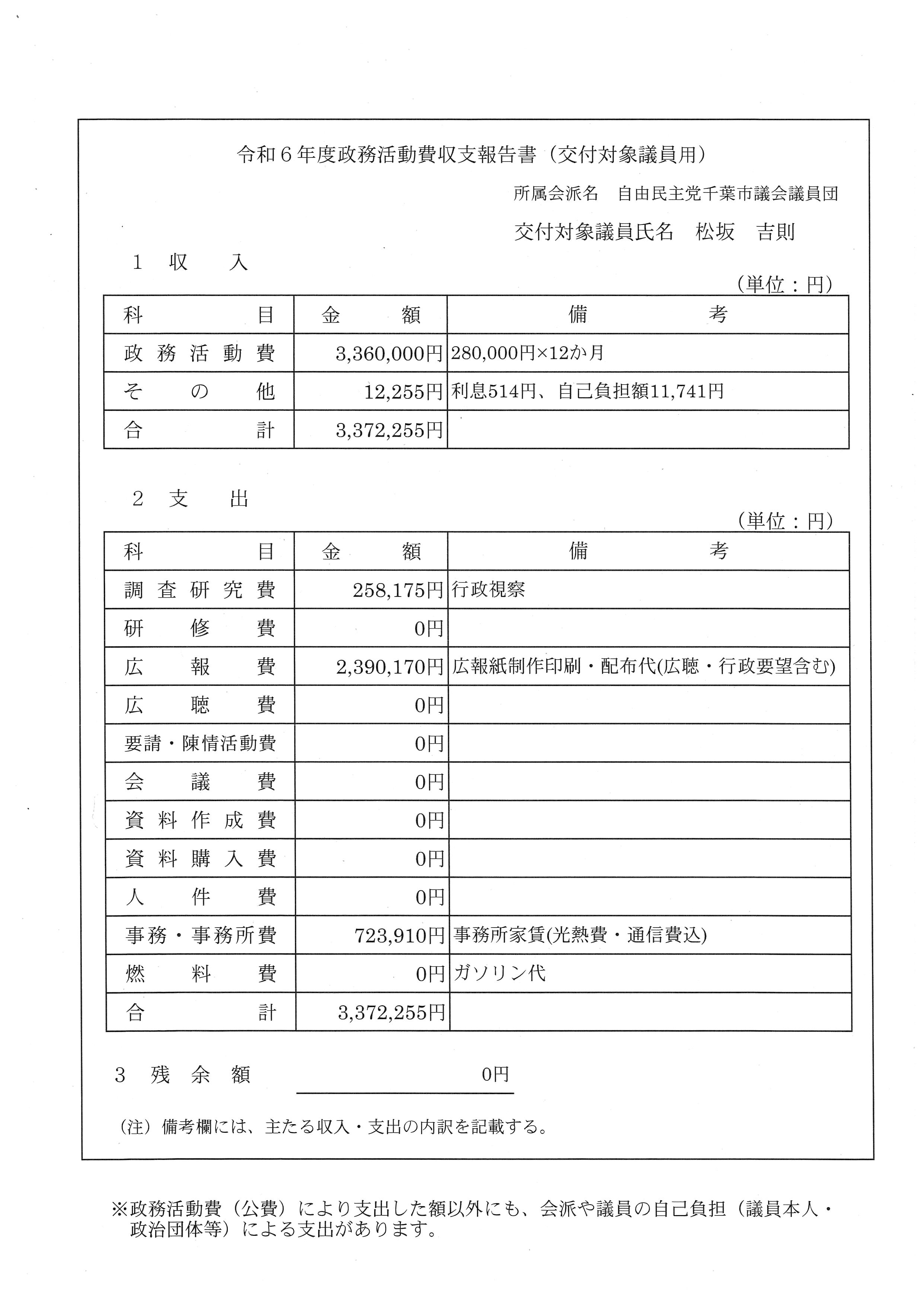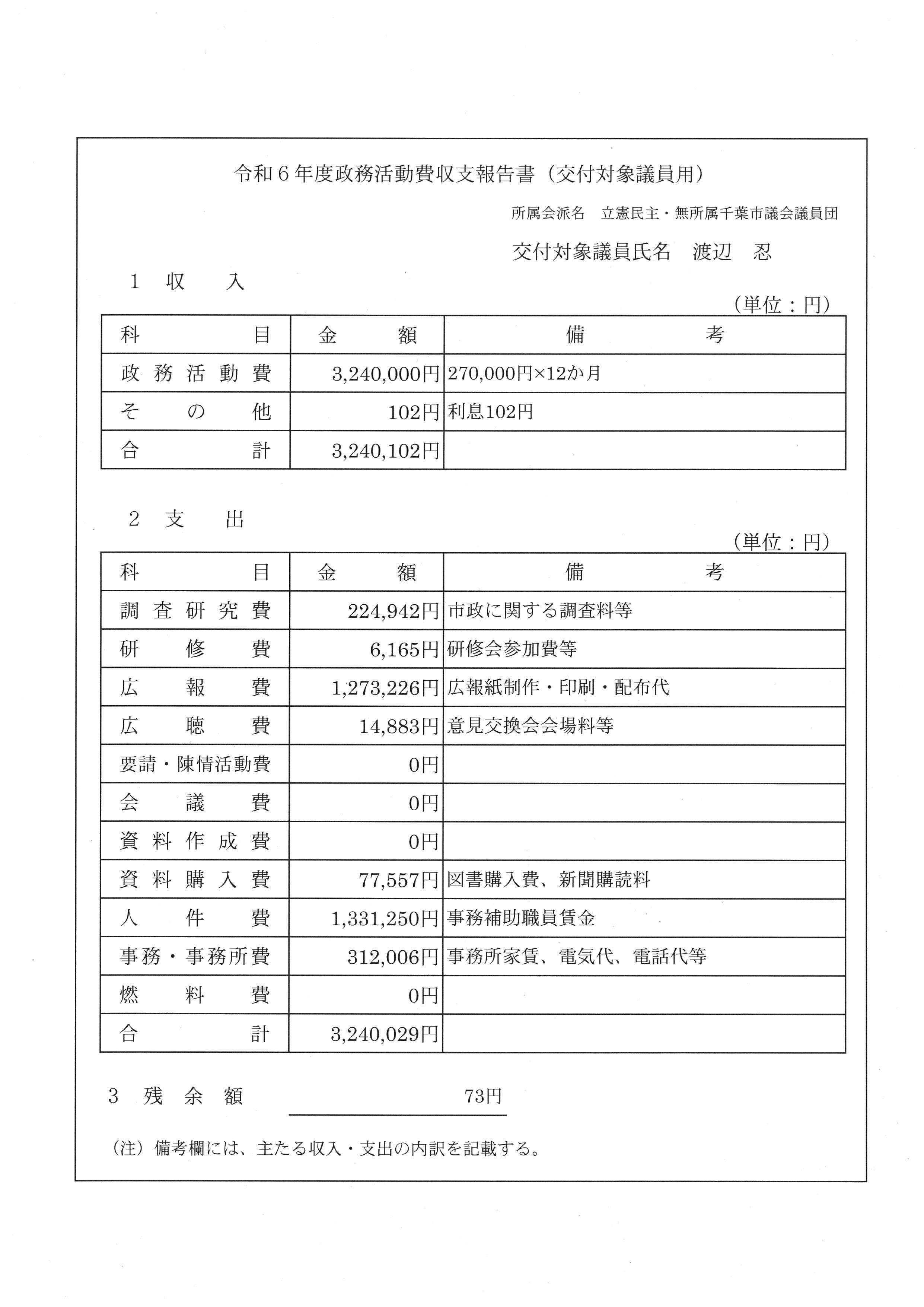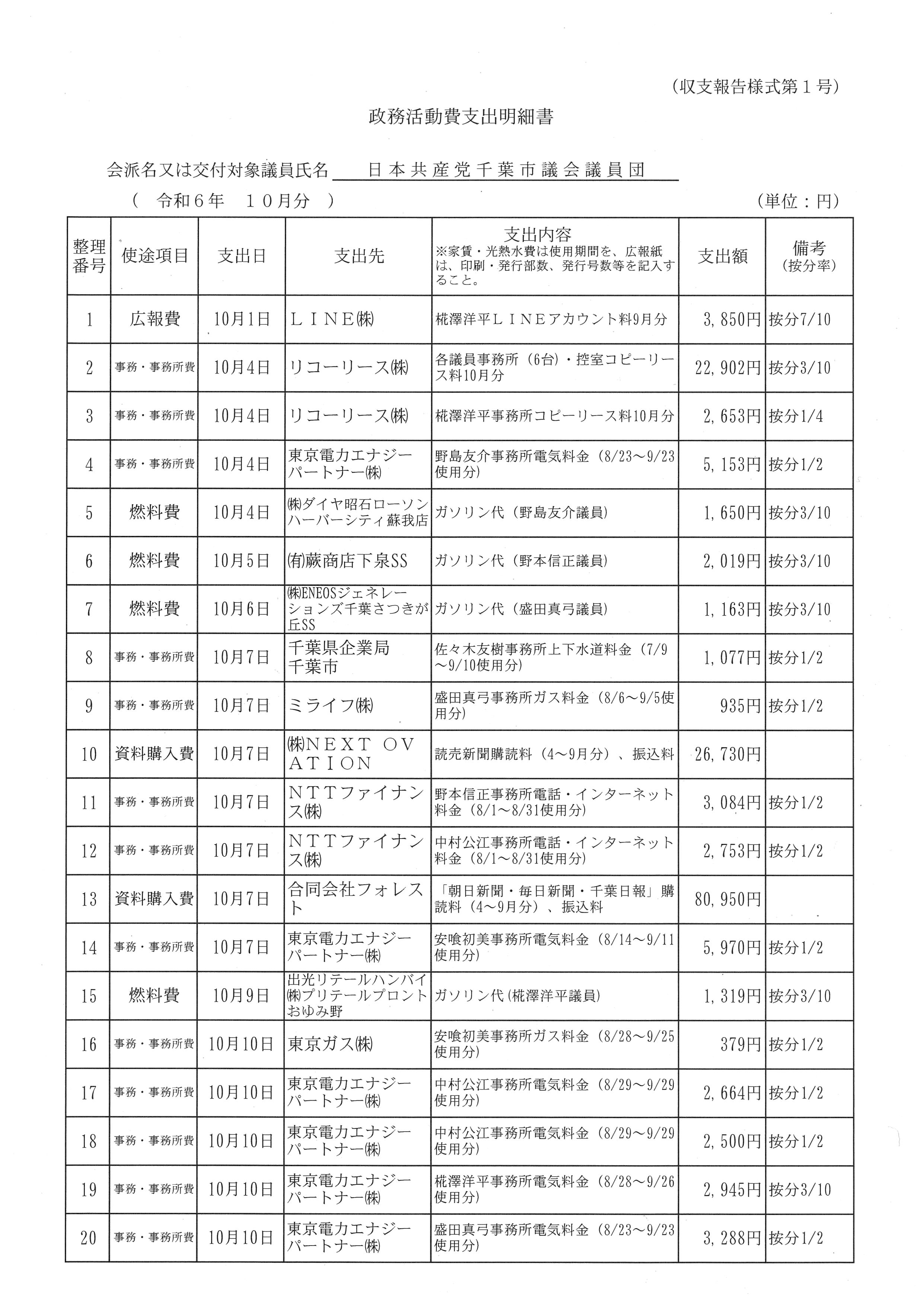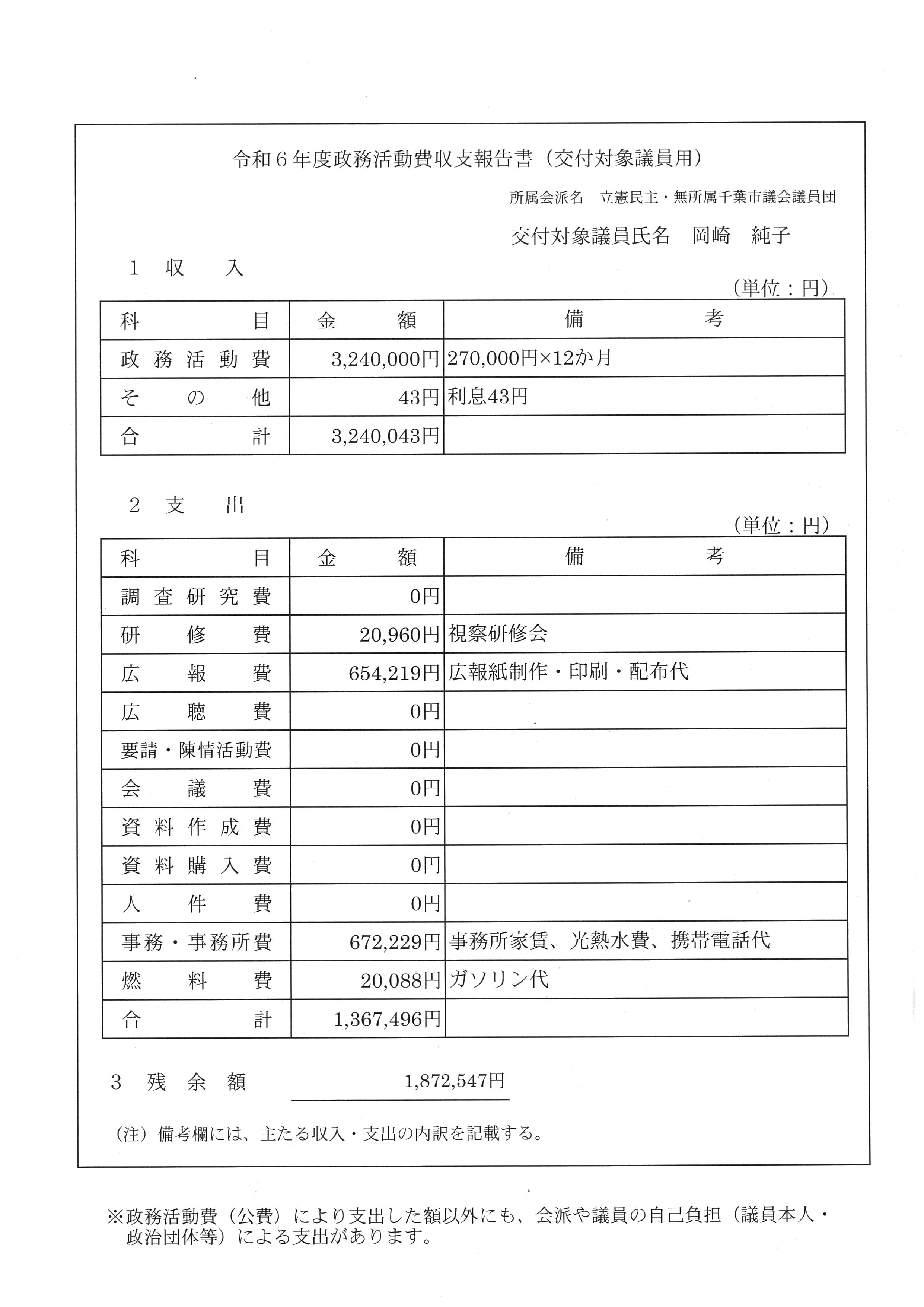 千葉市議会トップページ > 広報・情報公開 > 政務活動費 > 令和6年度交付分(政務活動費収支報告書)