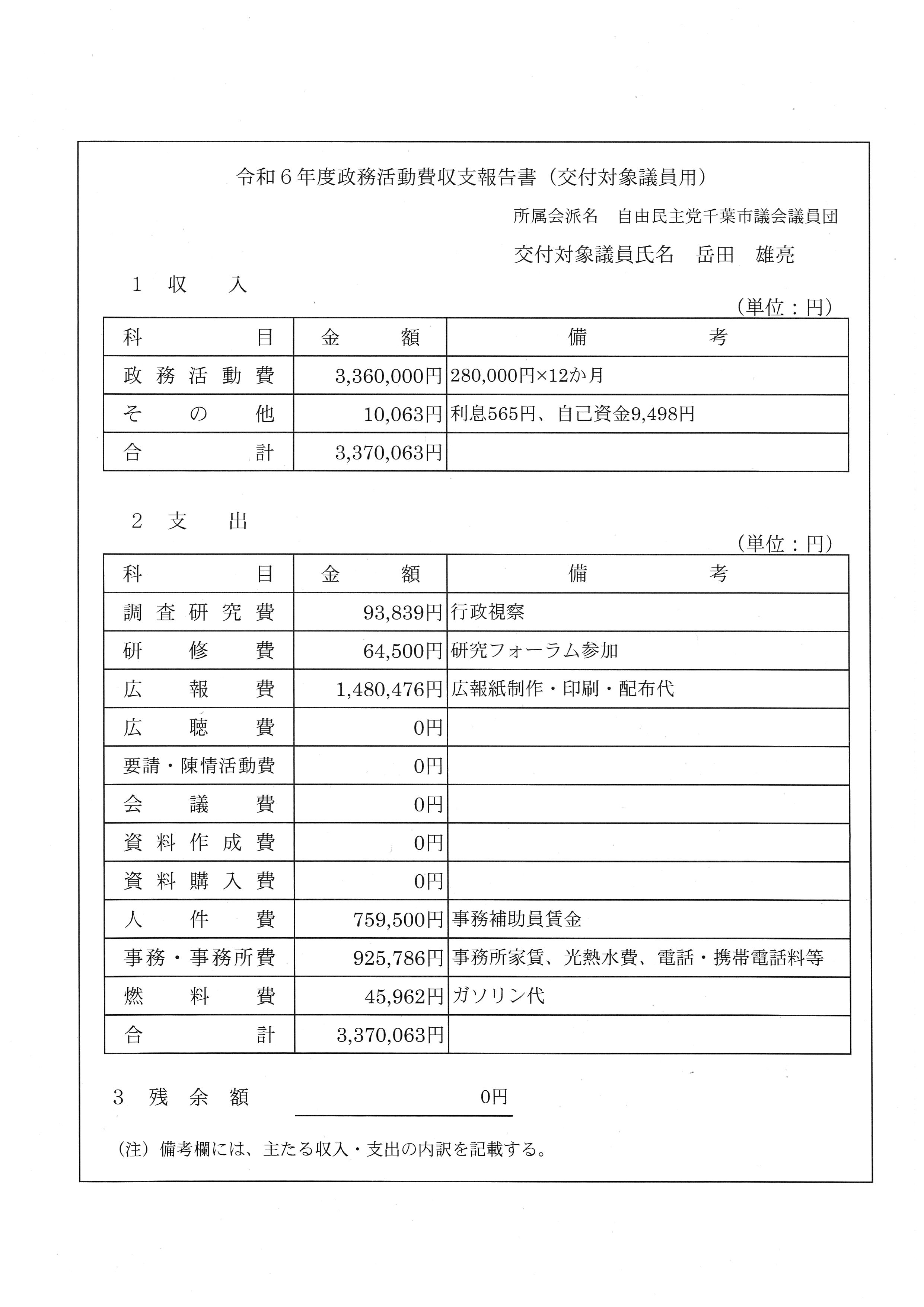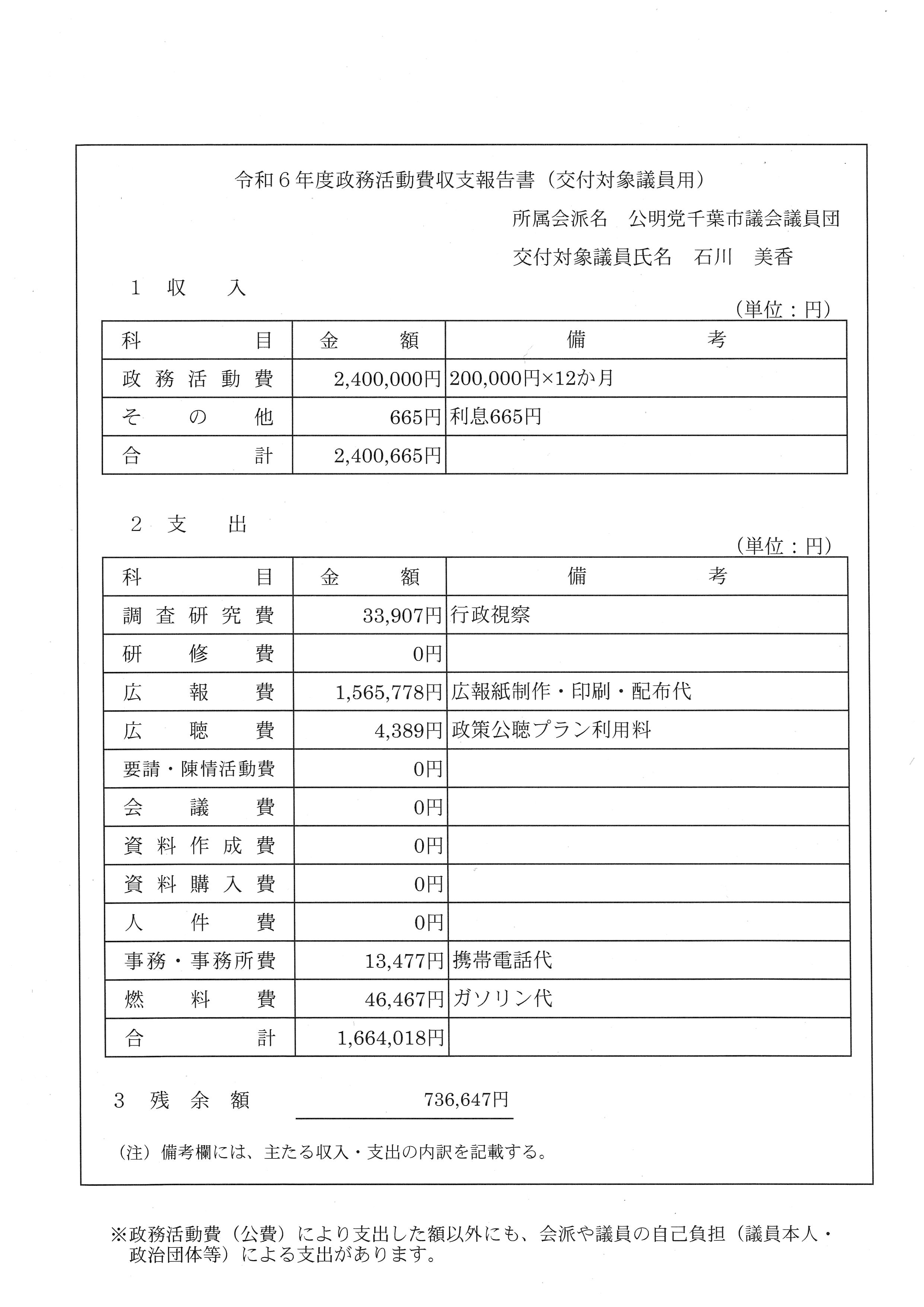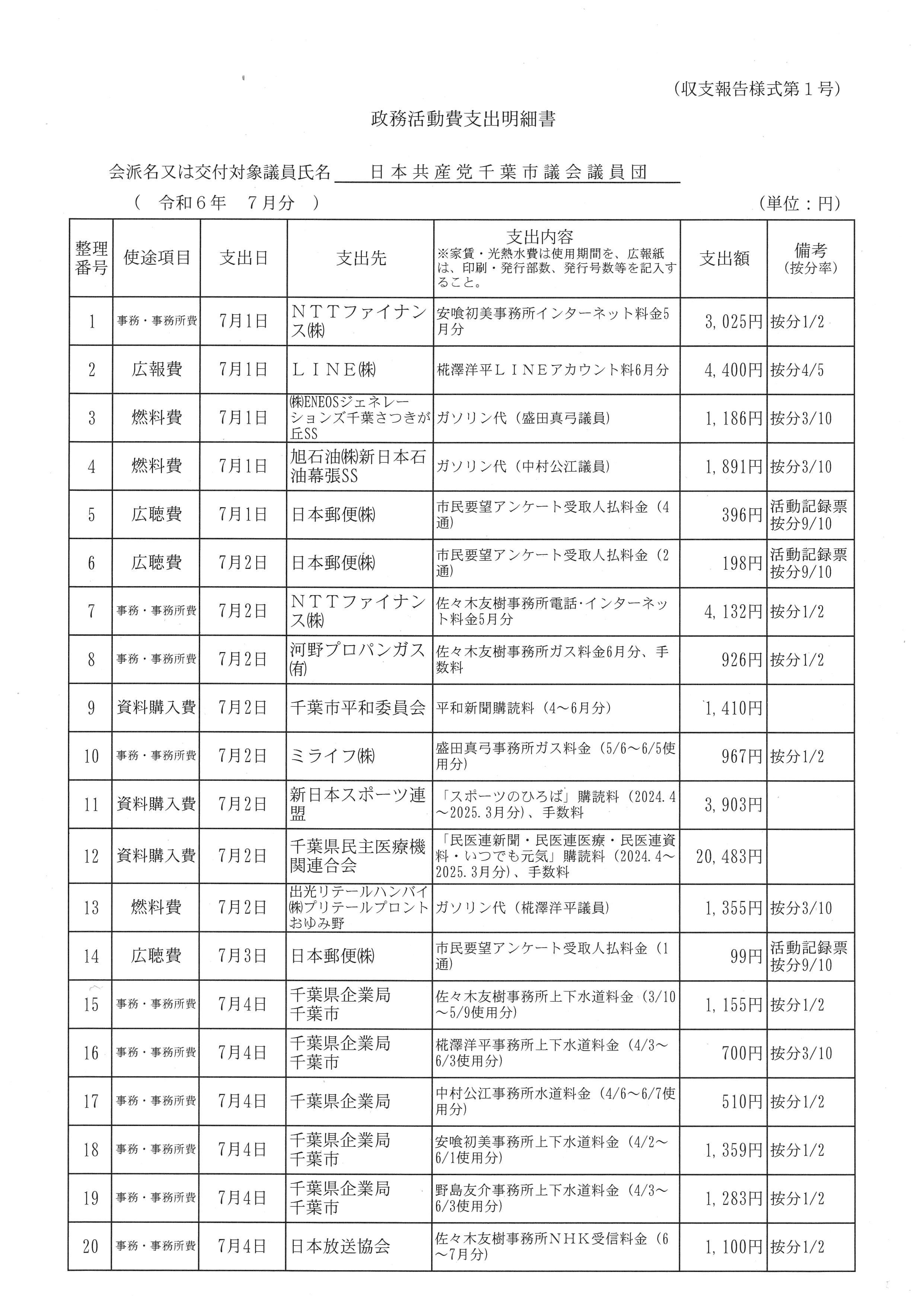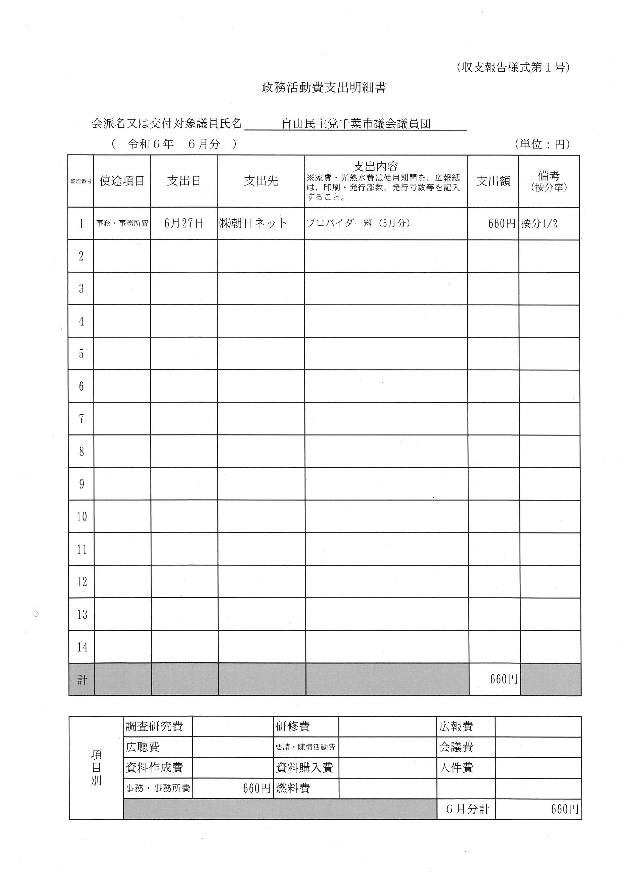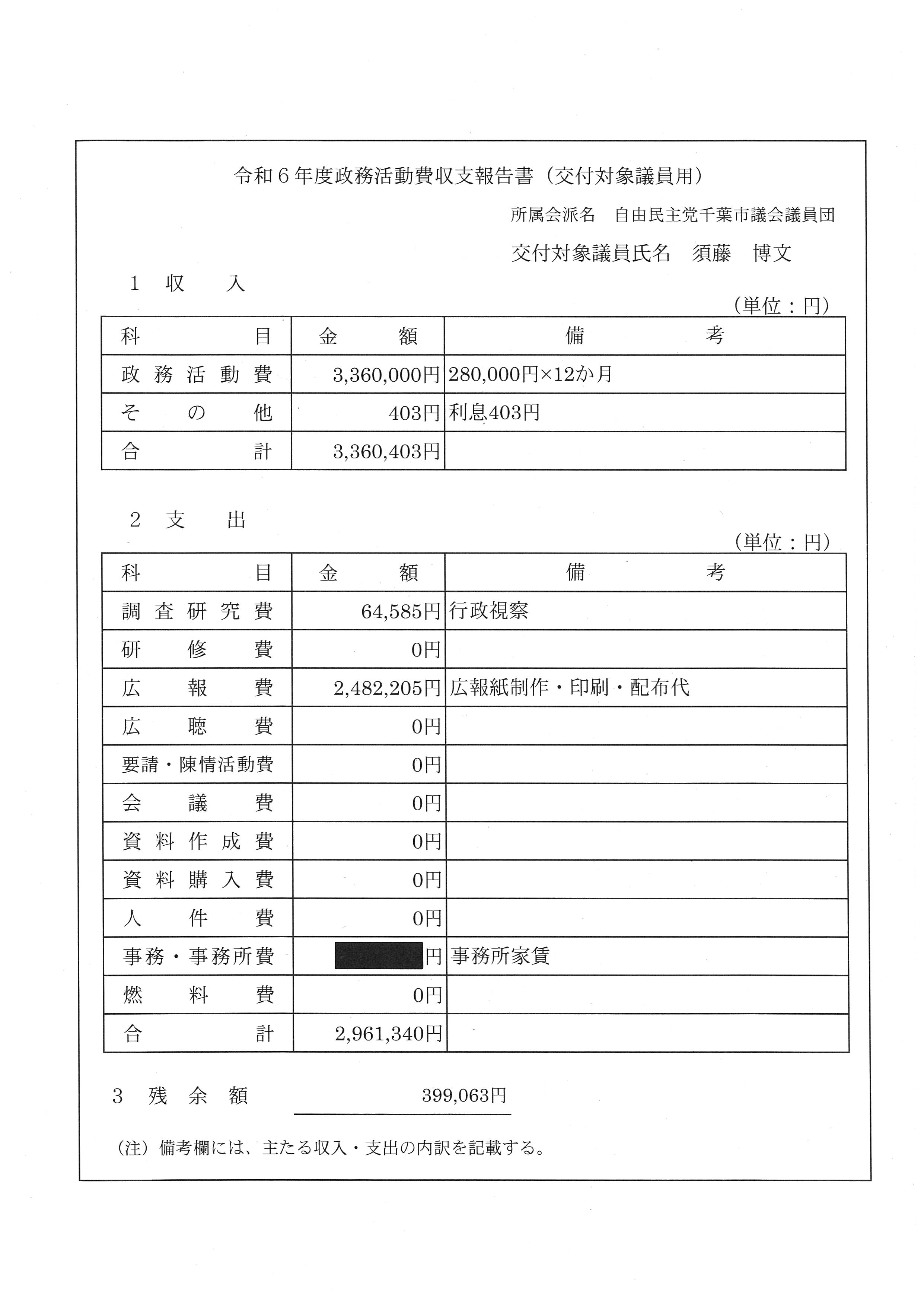 千葉市議会トップページ > 広報・情報公開 > 政務活動費 > 令和6年度交付分(政務活動費収支報告書)