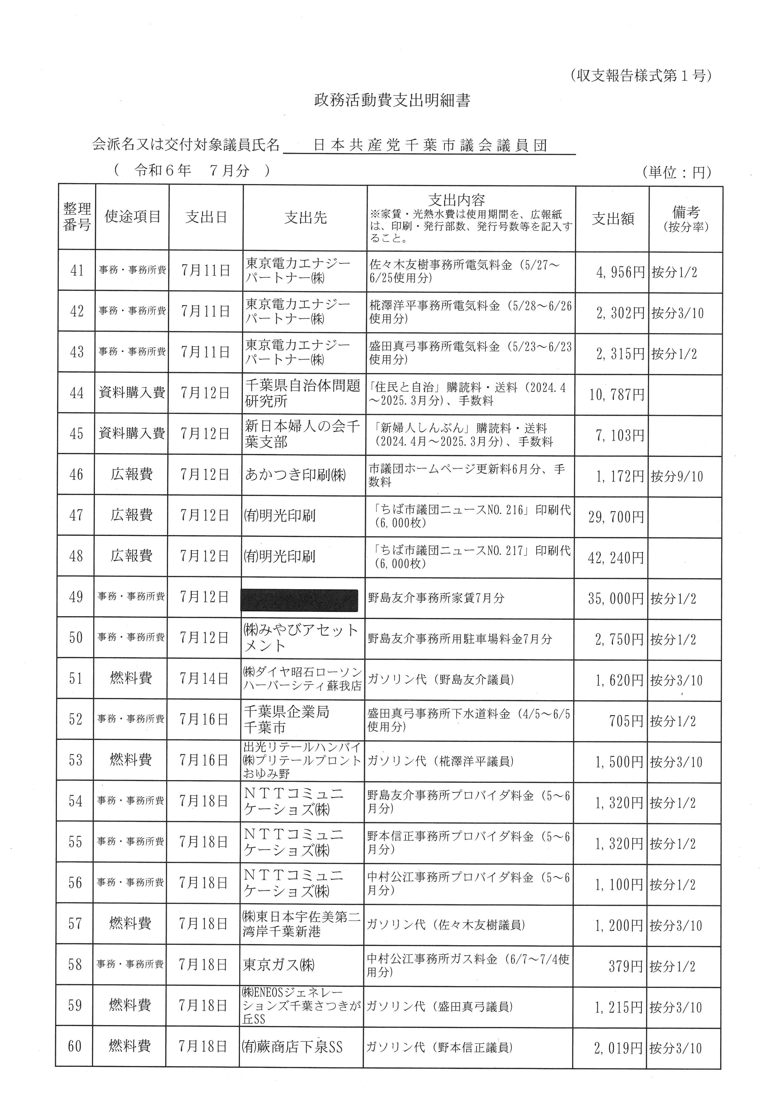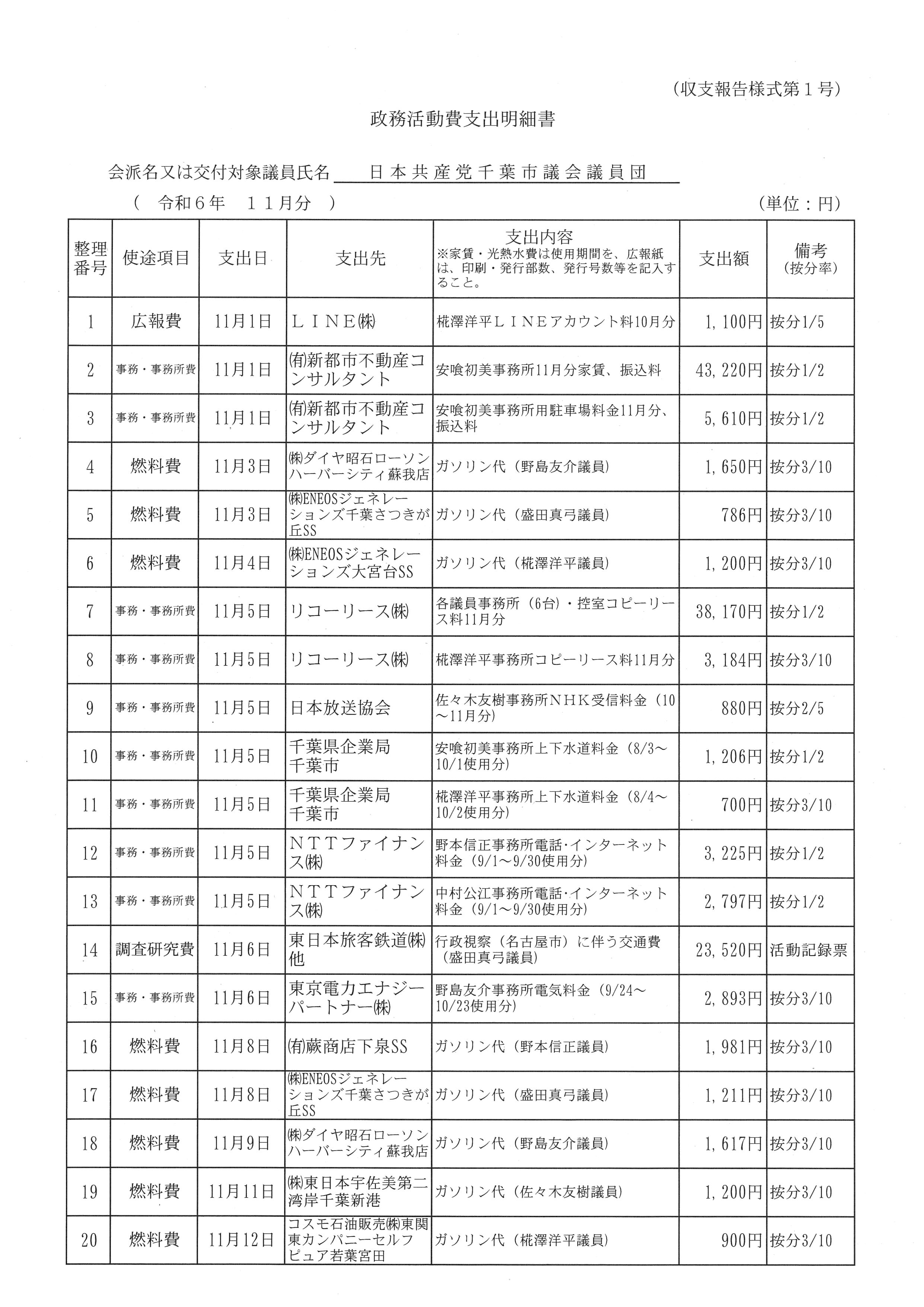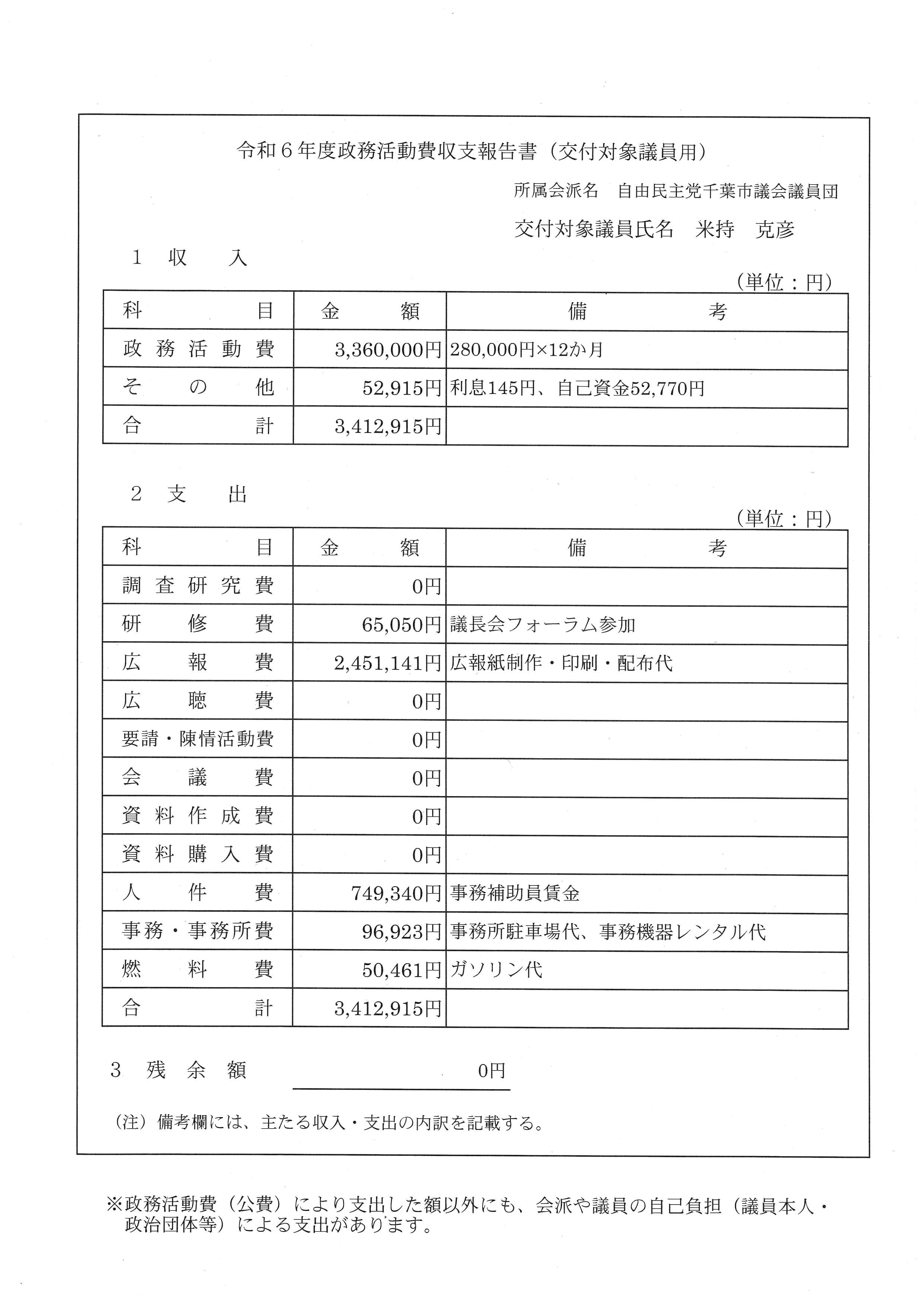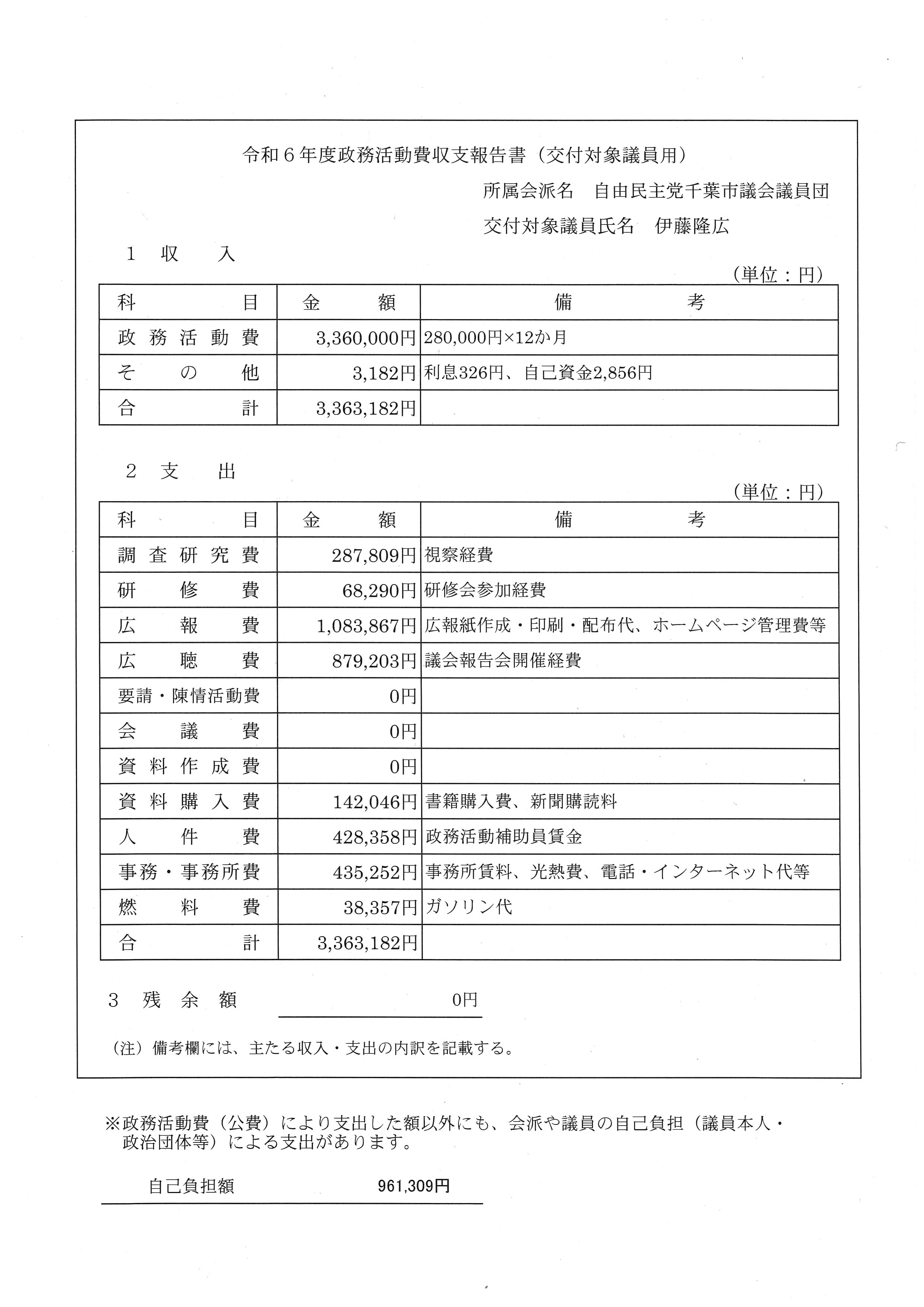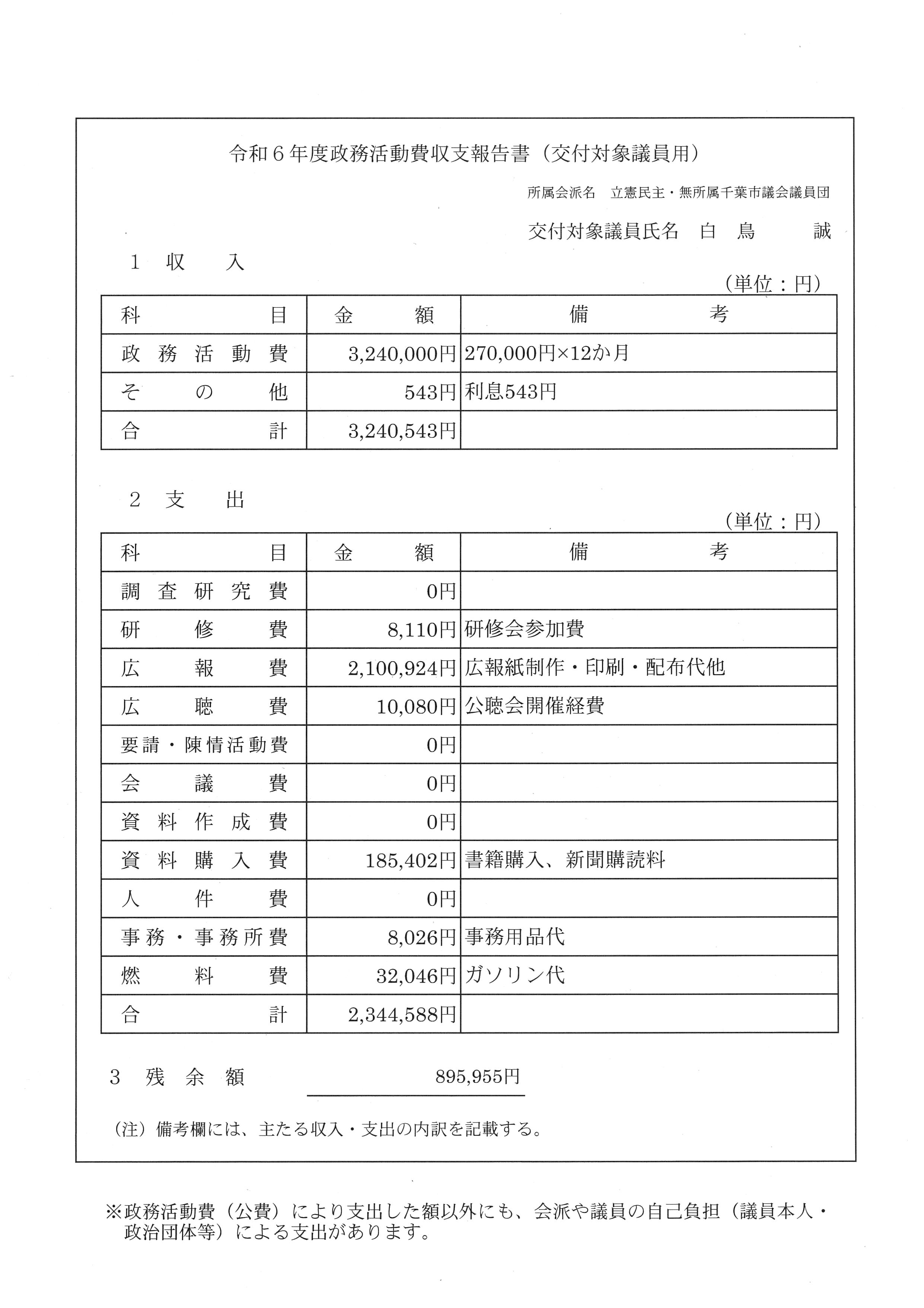 千葉市議会トップページ > 広報・情報公開 > 政務活動費 > 令和6年度交付分(政務活動費収支報告書)