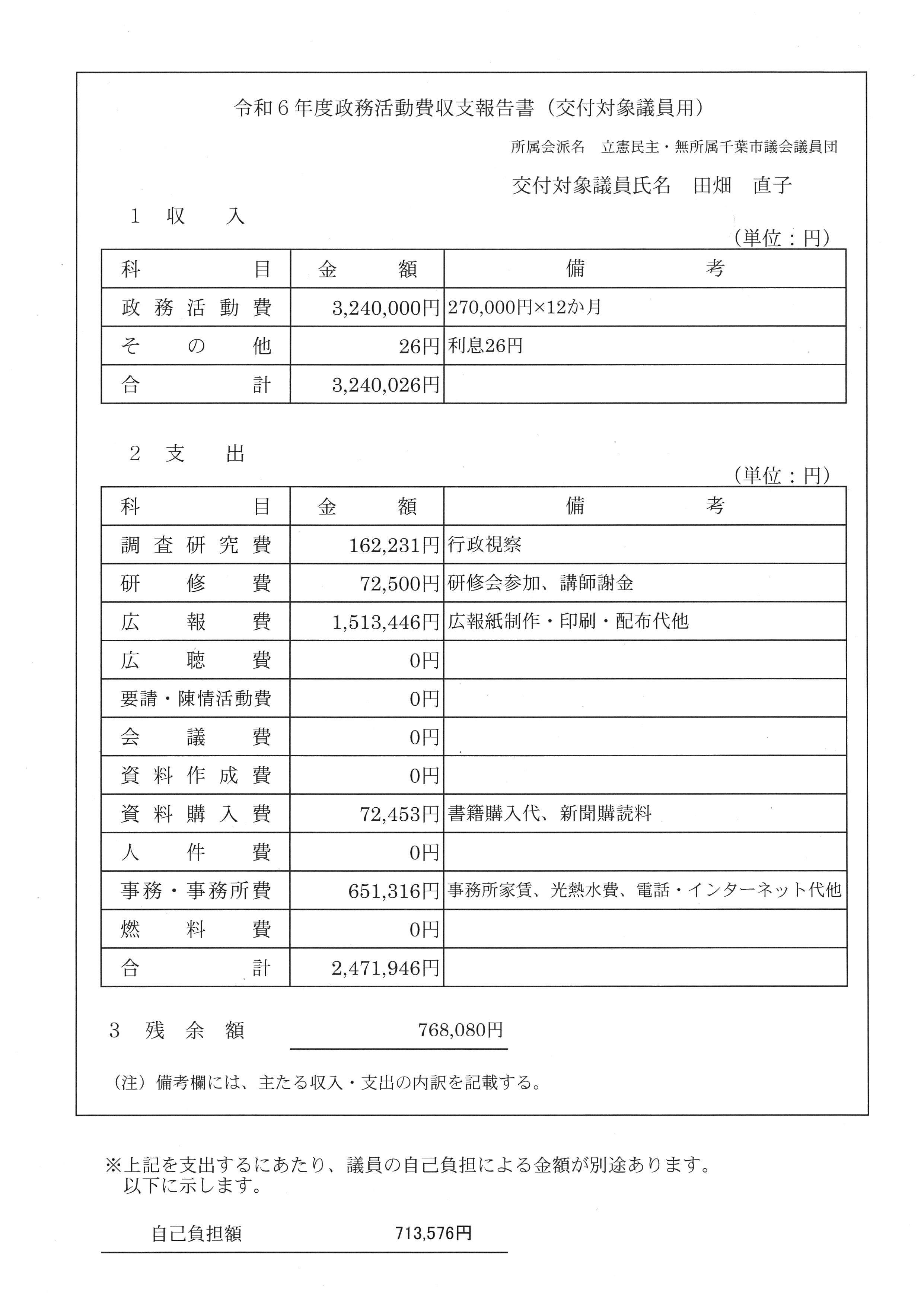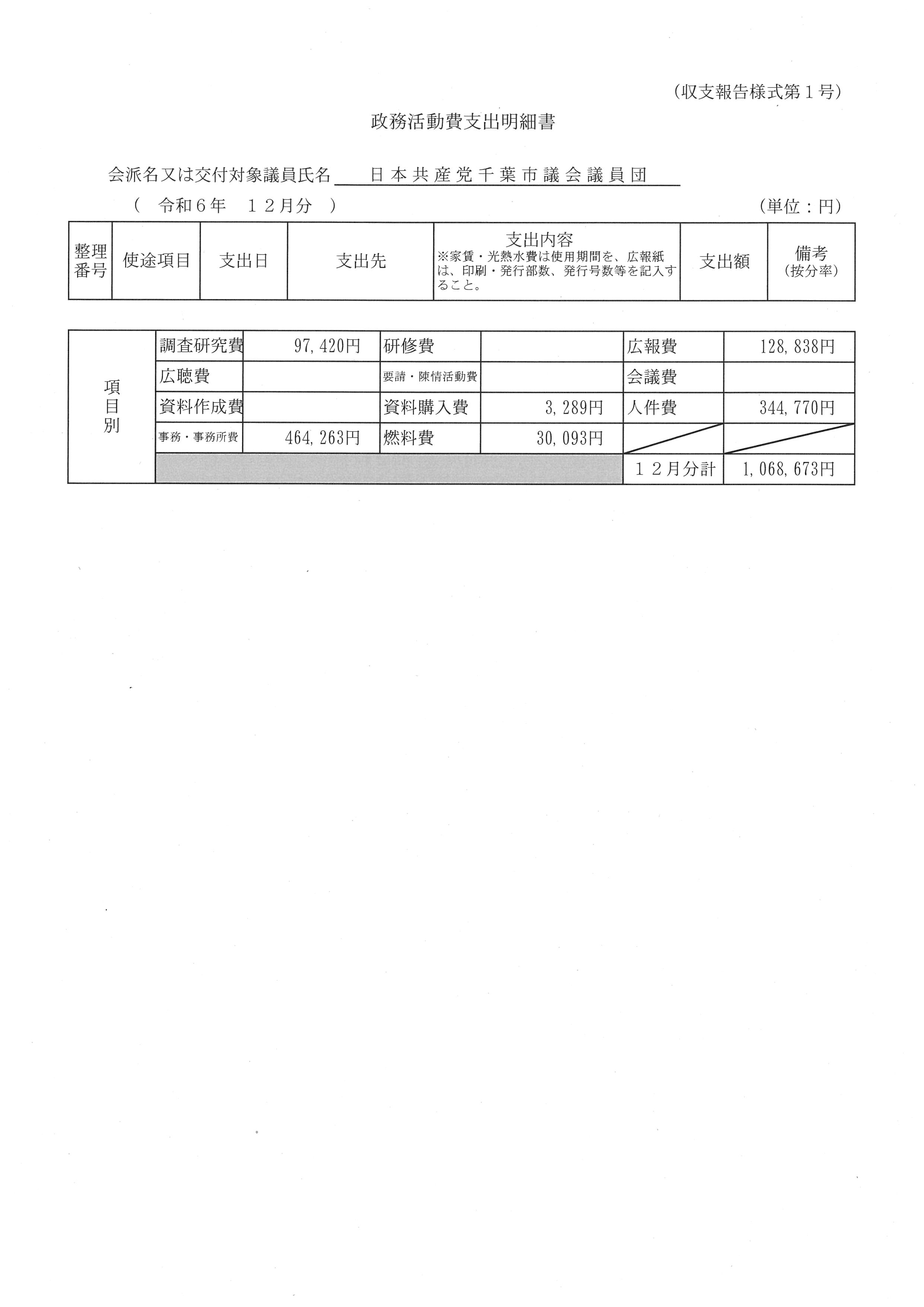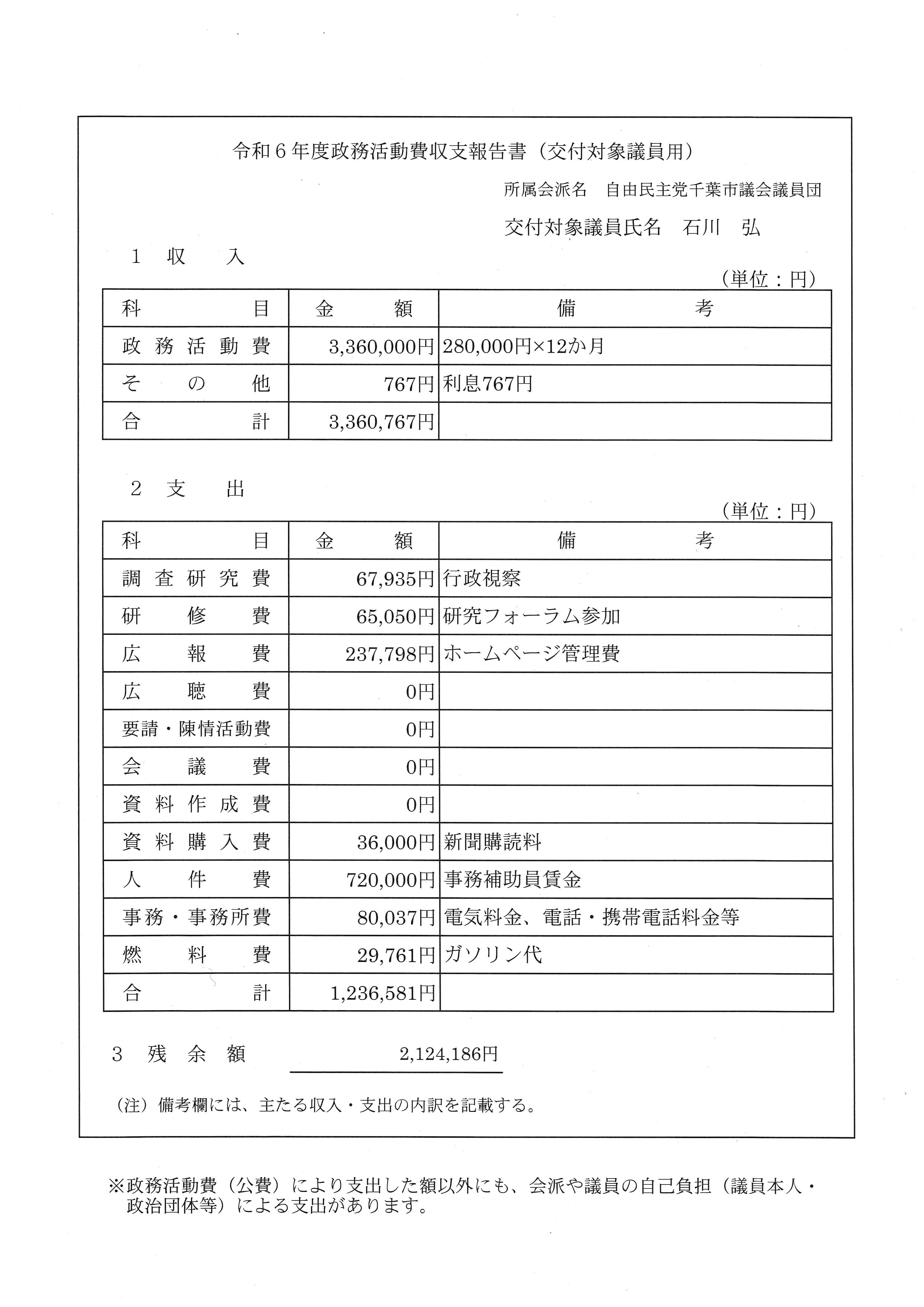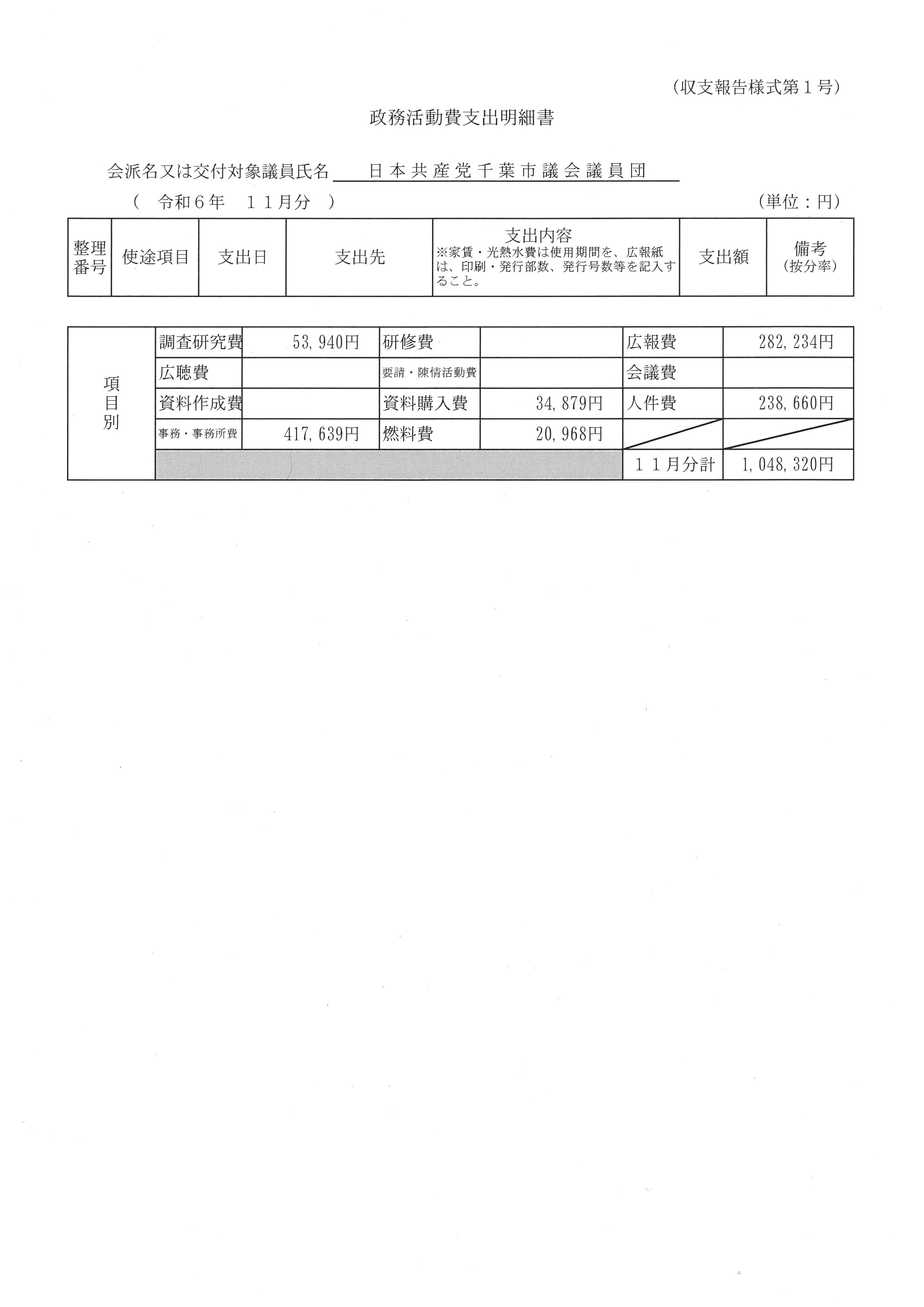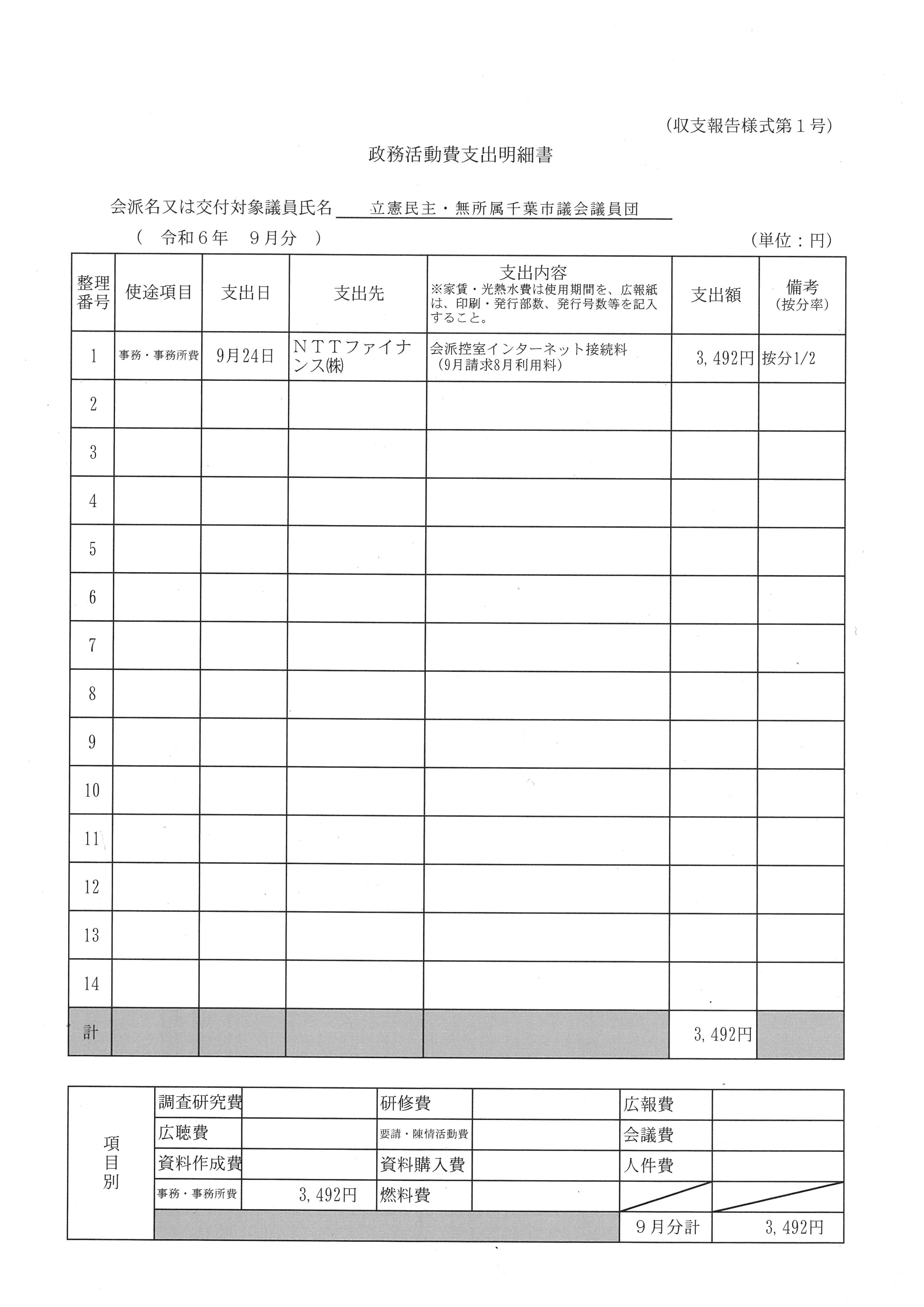 千葉市議会トップページ > 広報・情報公開 > 政務活動費 > 令和6年度交付分(政務活動費収支報告書)