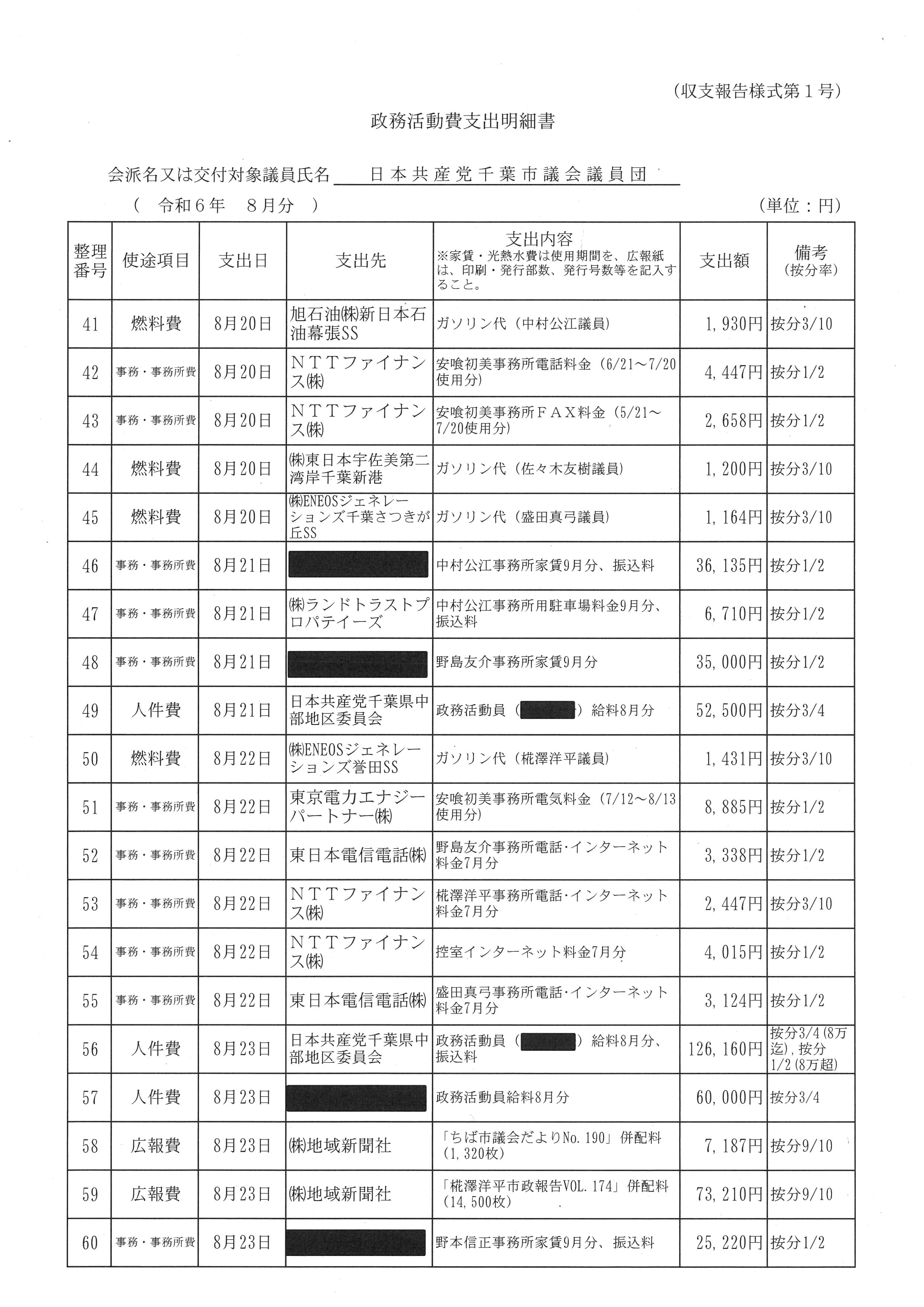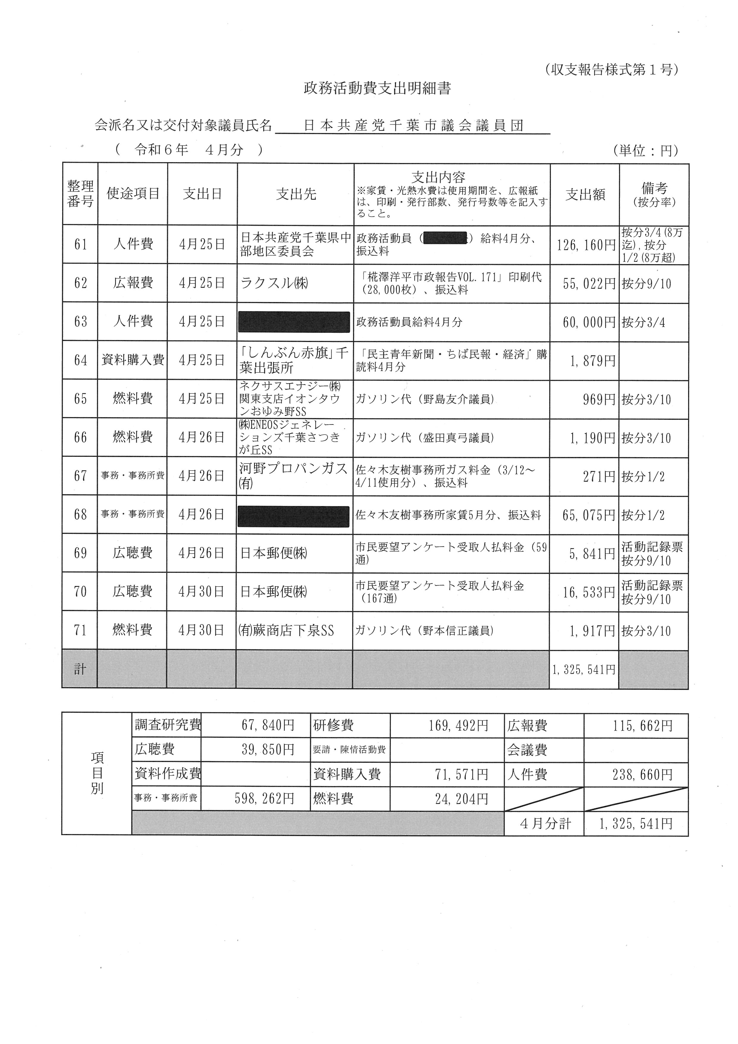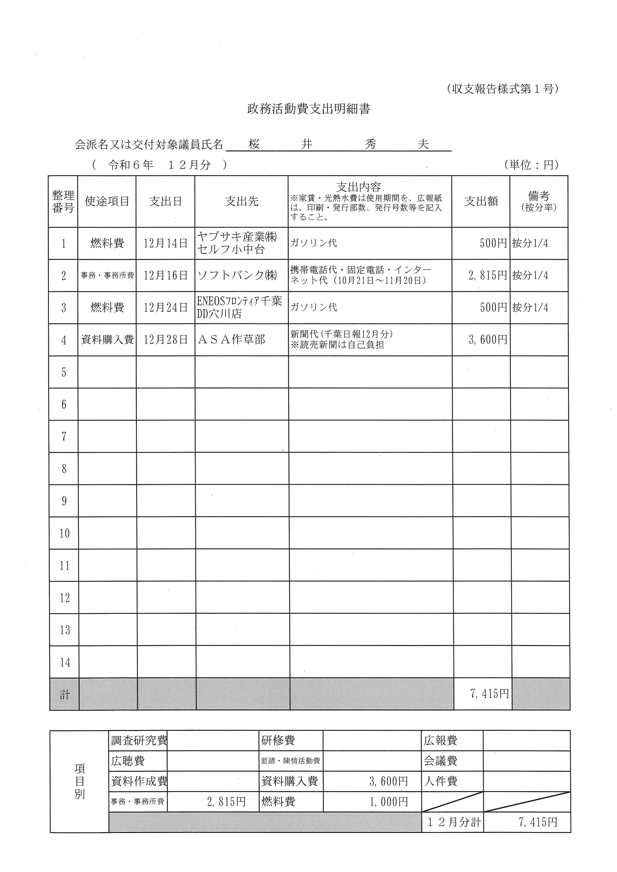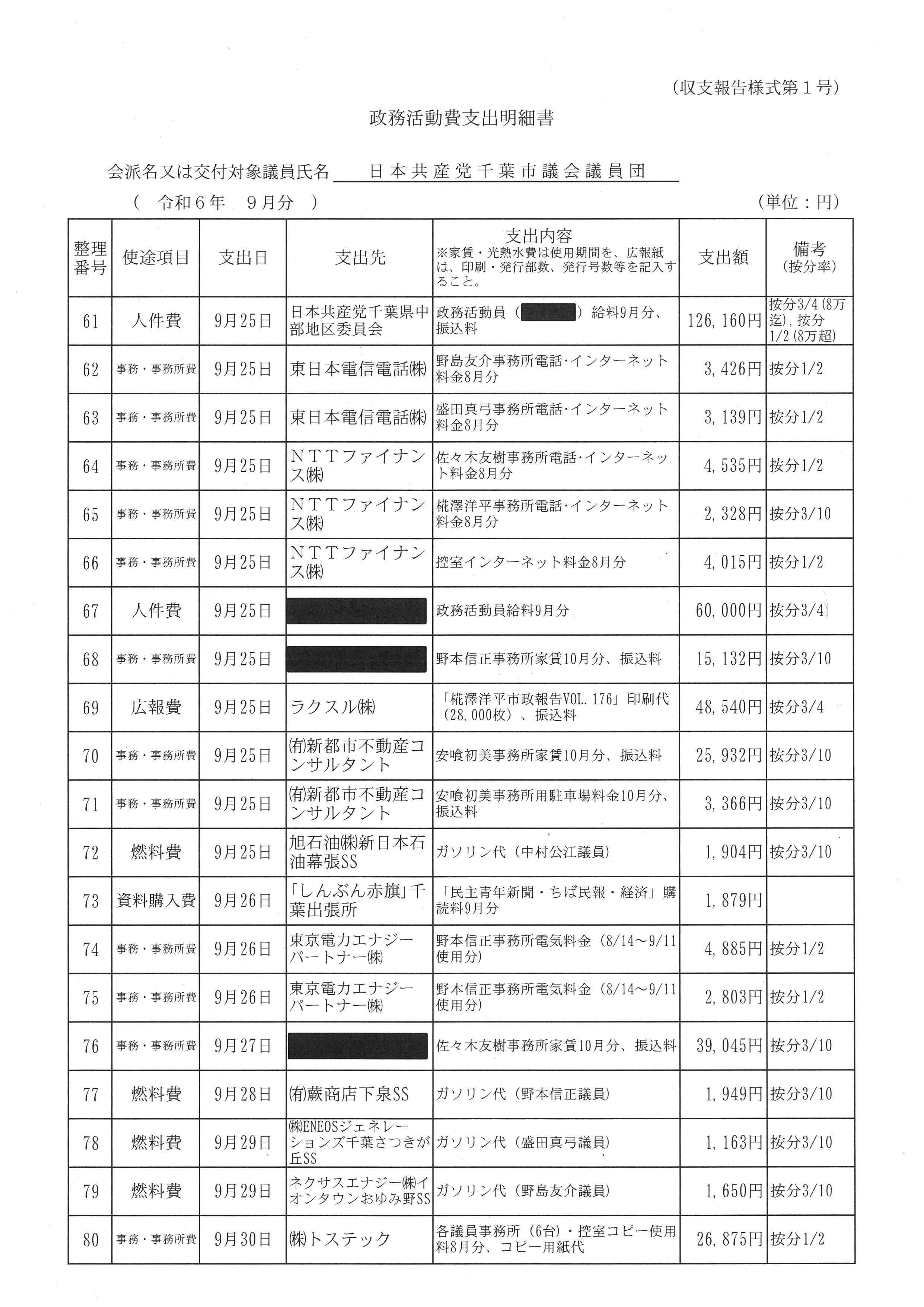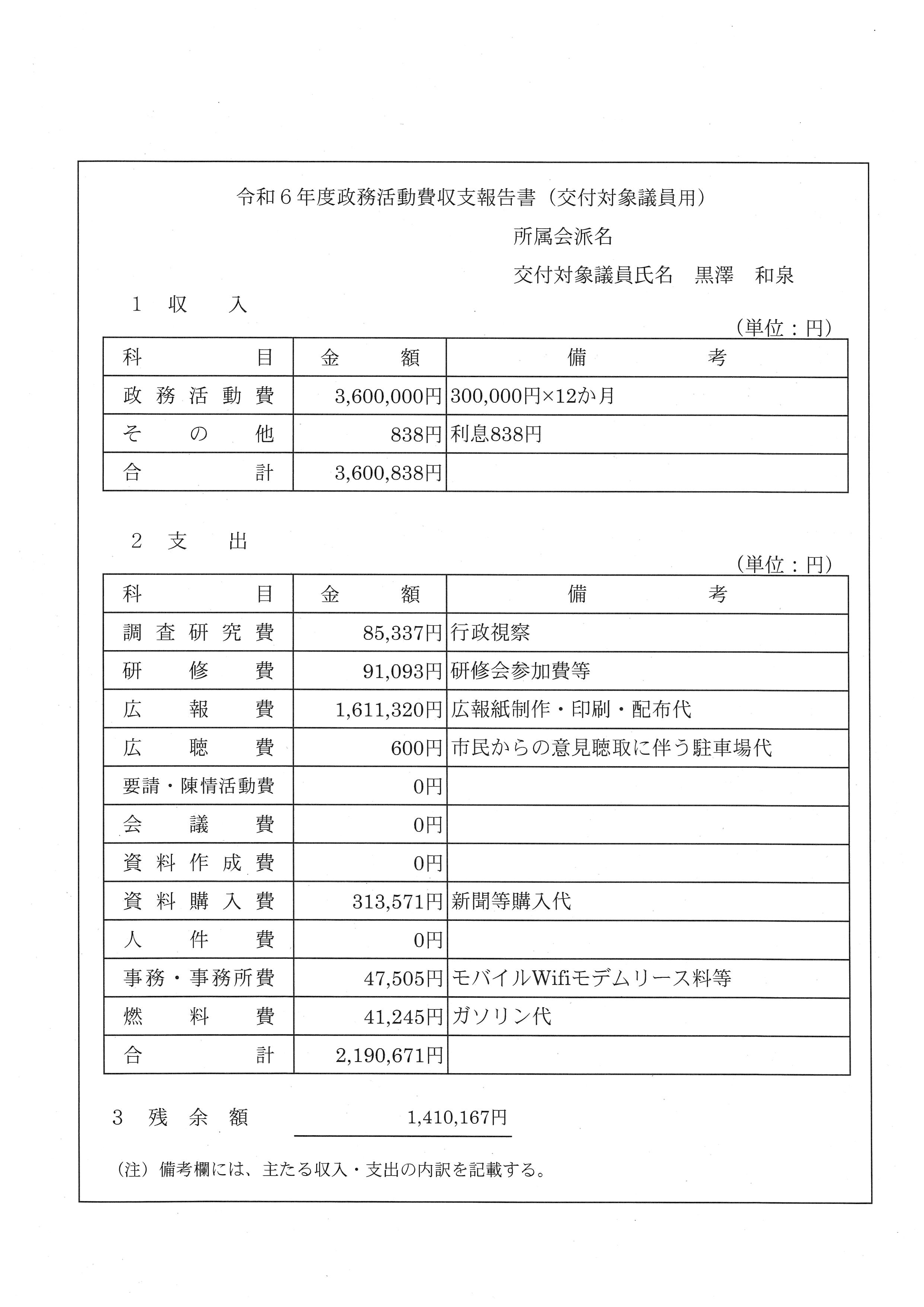千葉市議会トップページ > 広報・情報公開 > 政務活動費 > 令和6年度交付分(政務活動費収支報告書)