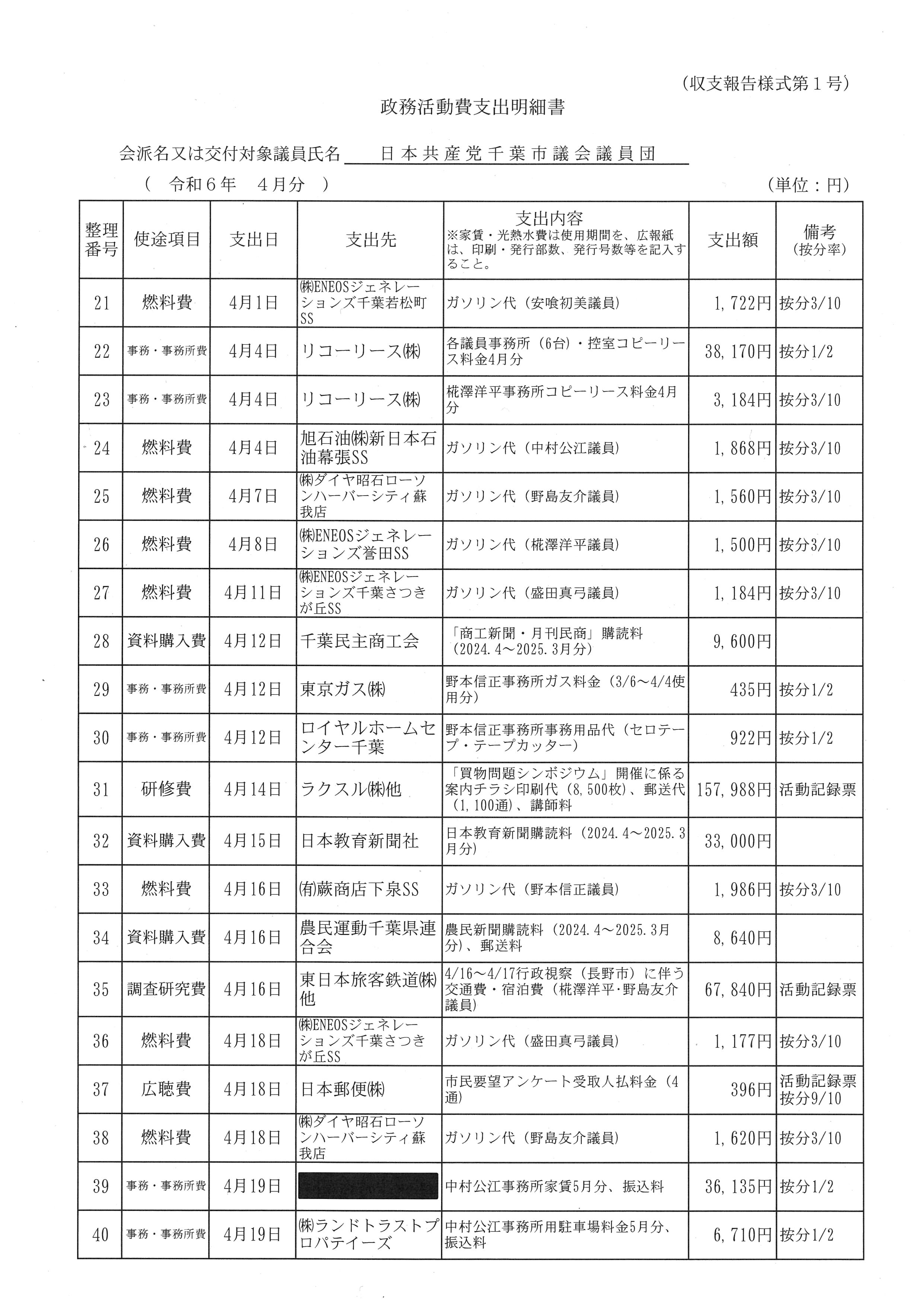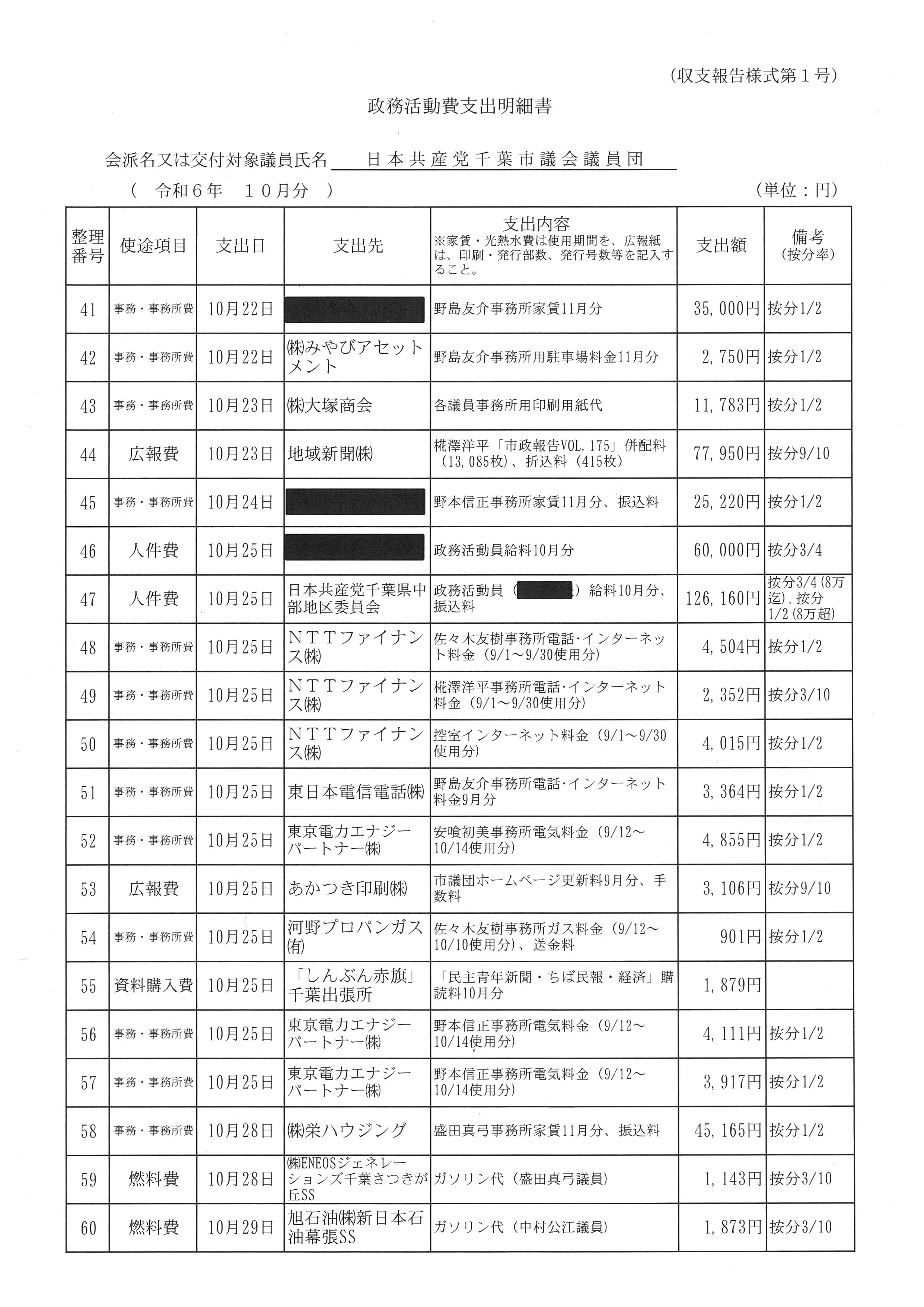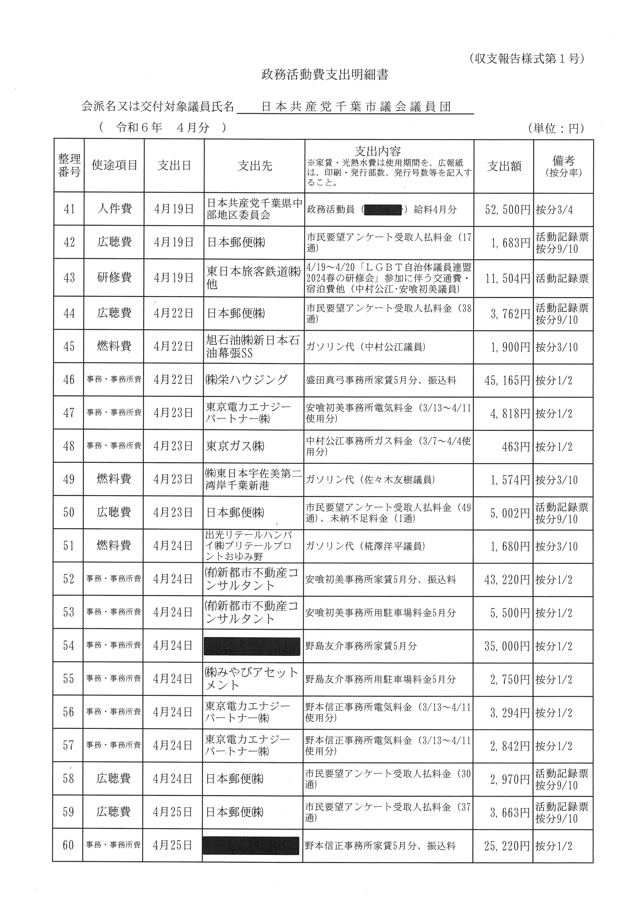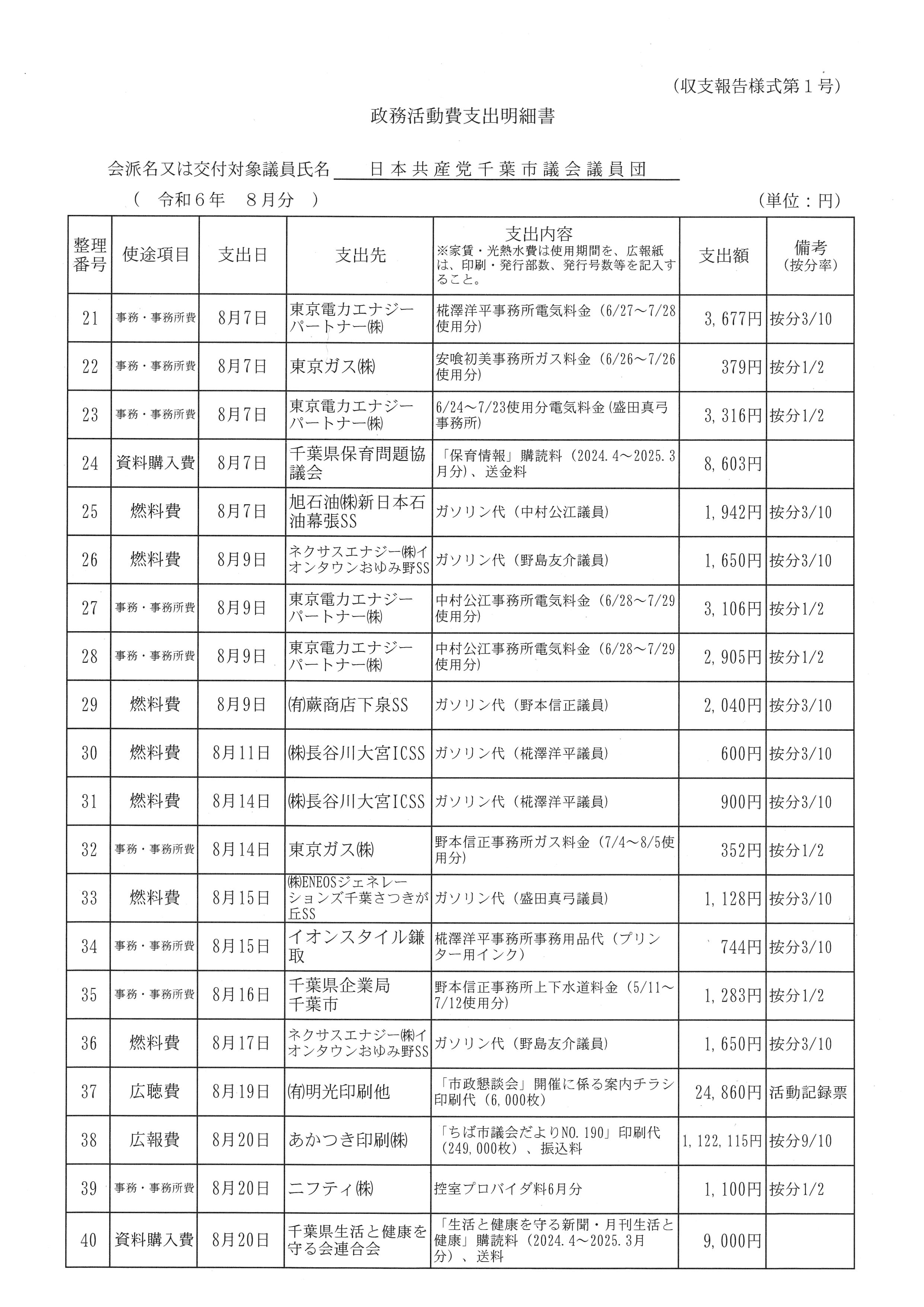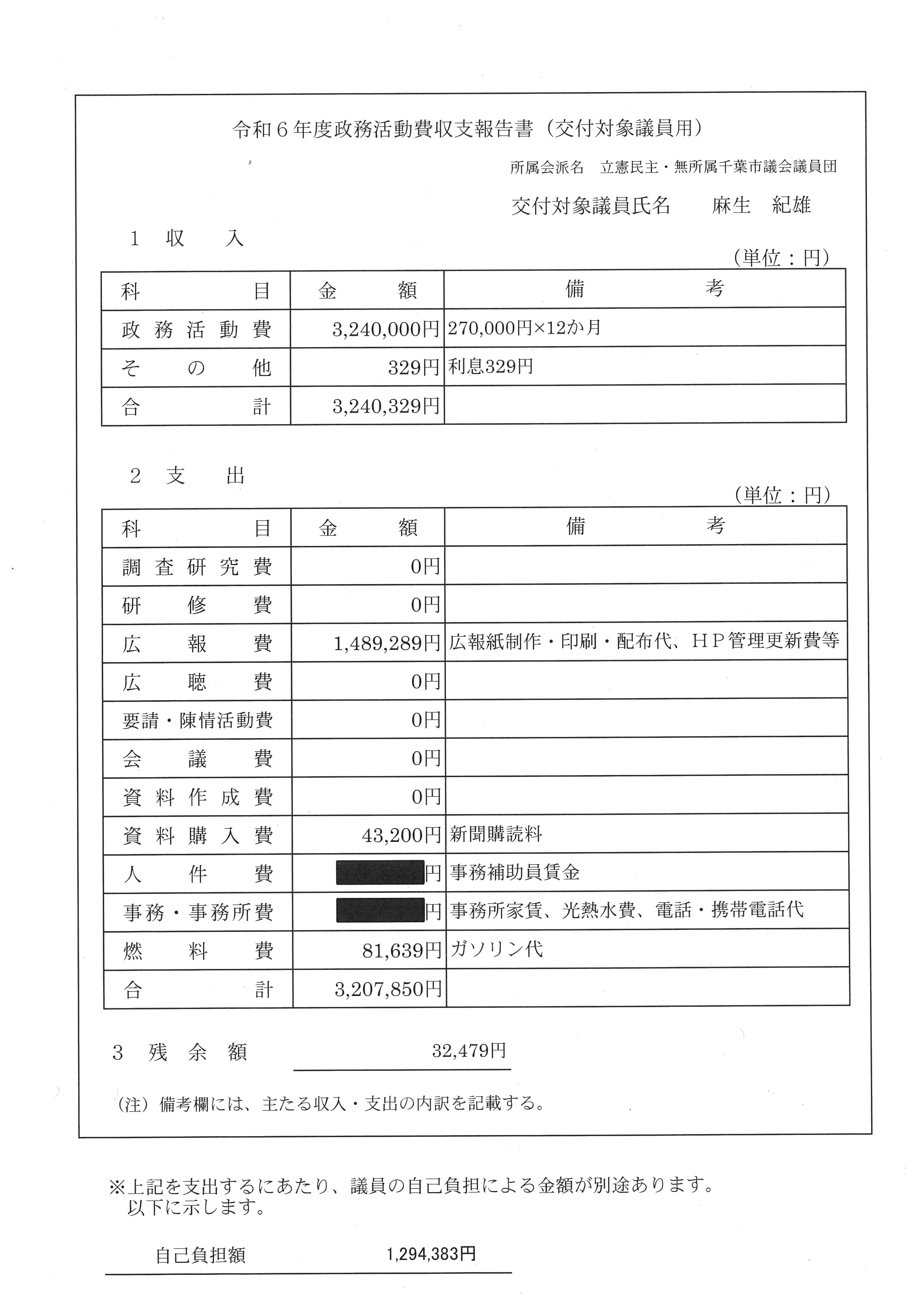 千葉市議会トップページ > 広報・情報公開 > 政務活動費 > 令和6年度交付分(政務活動費収支報告書)