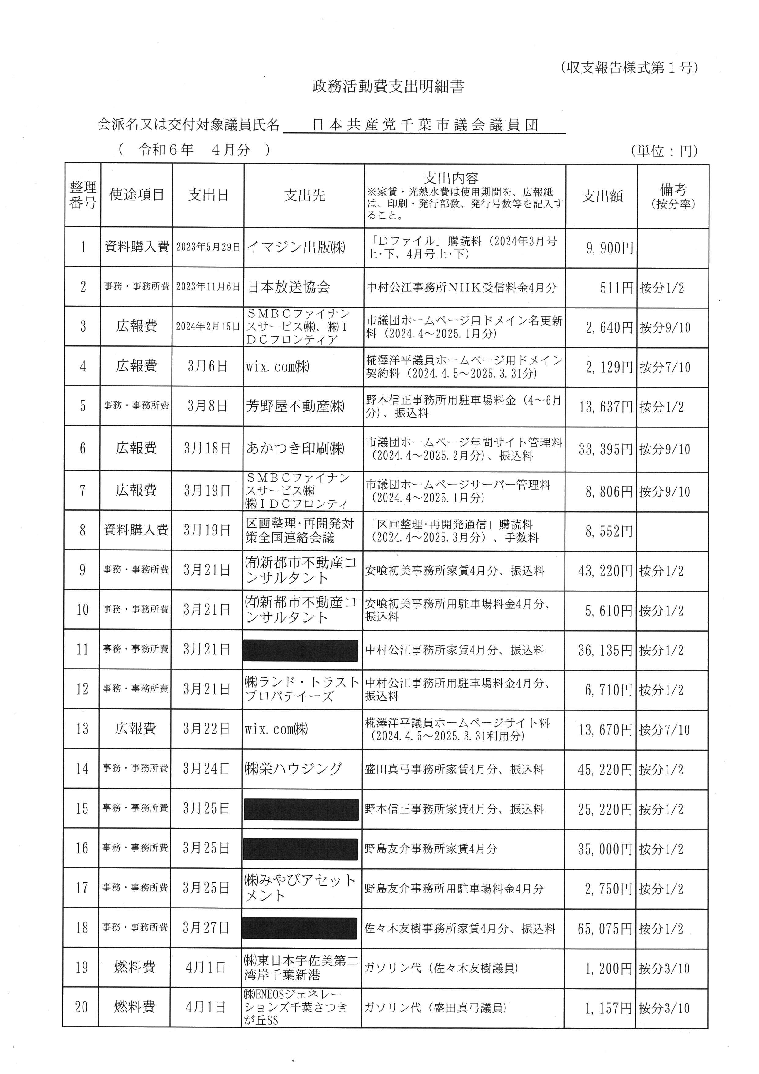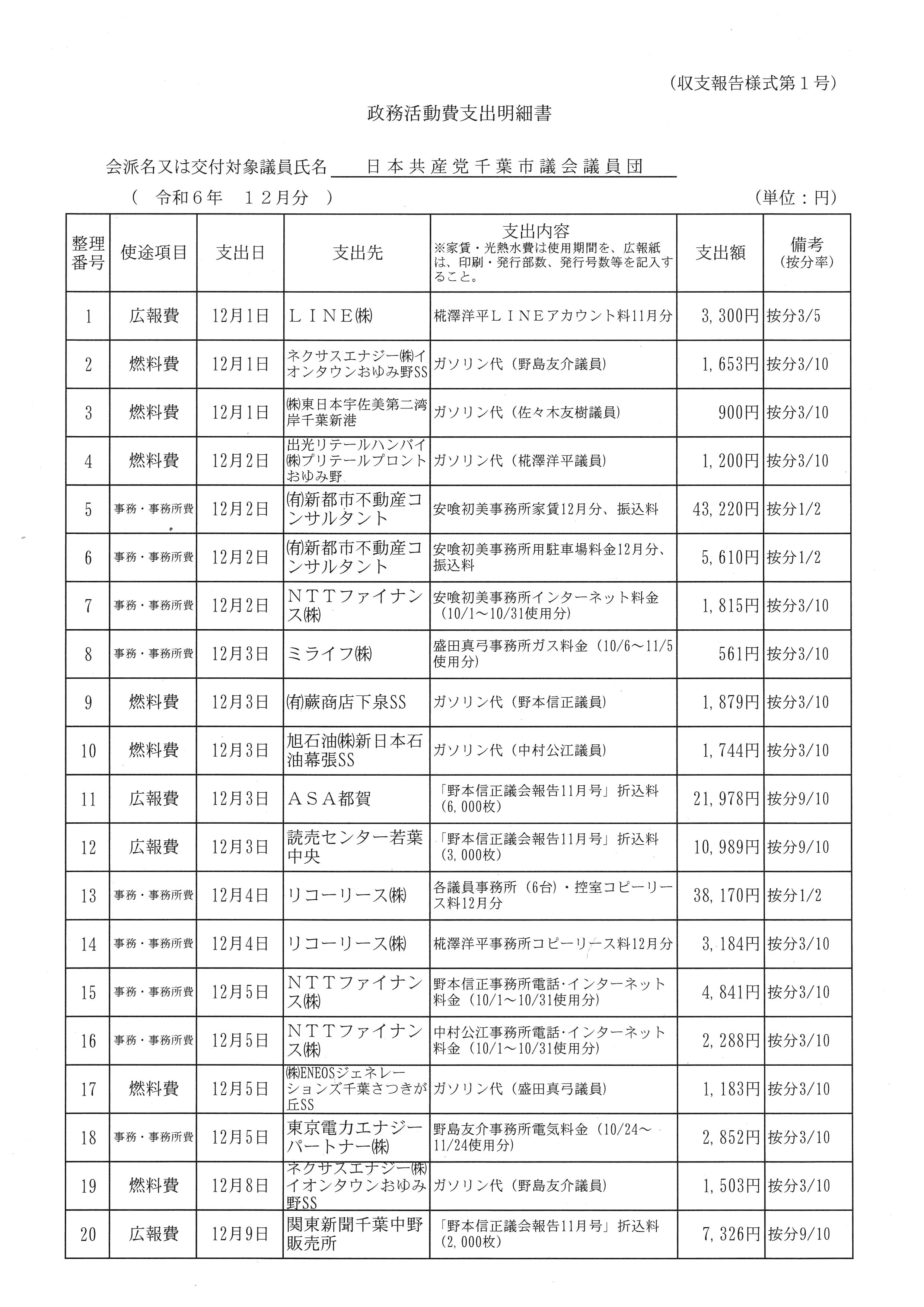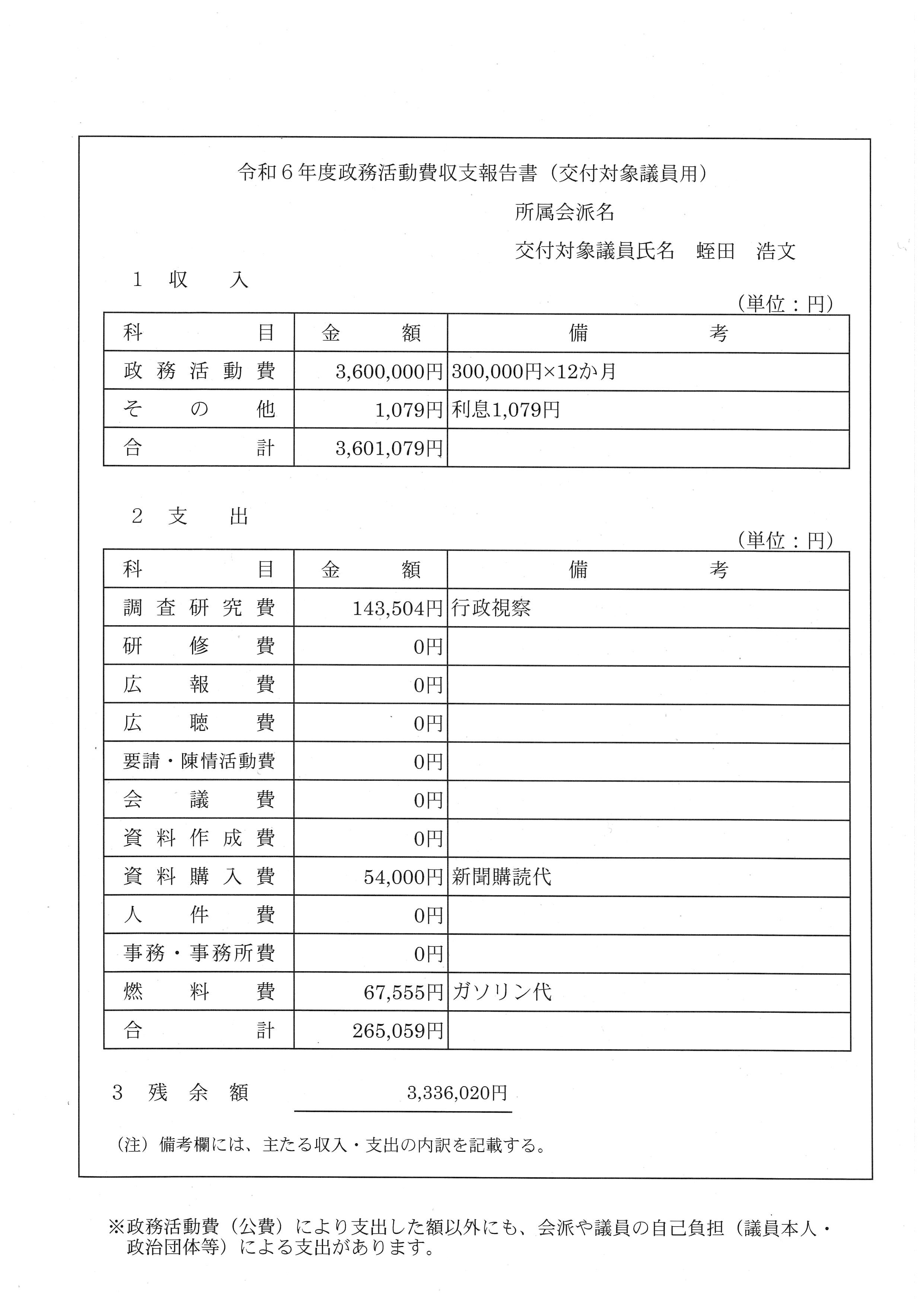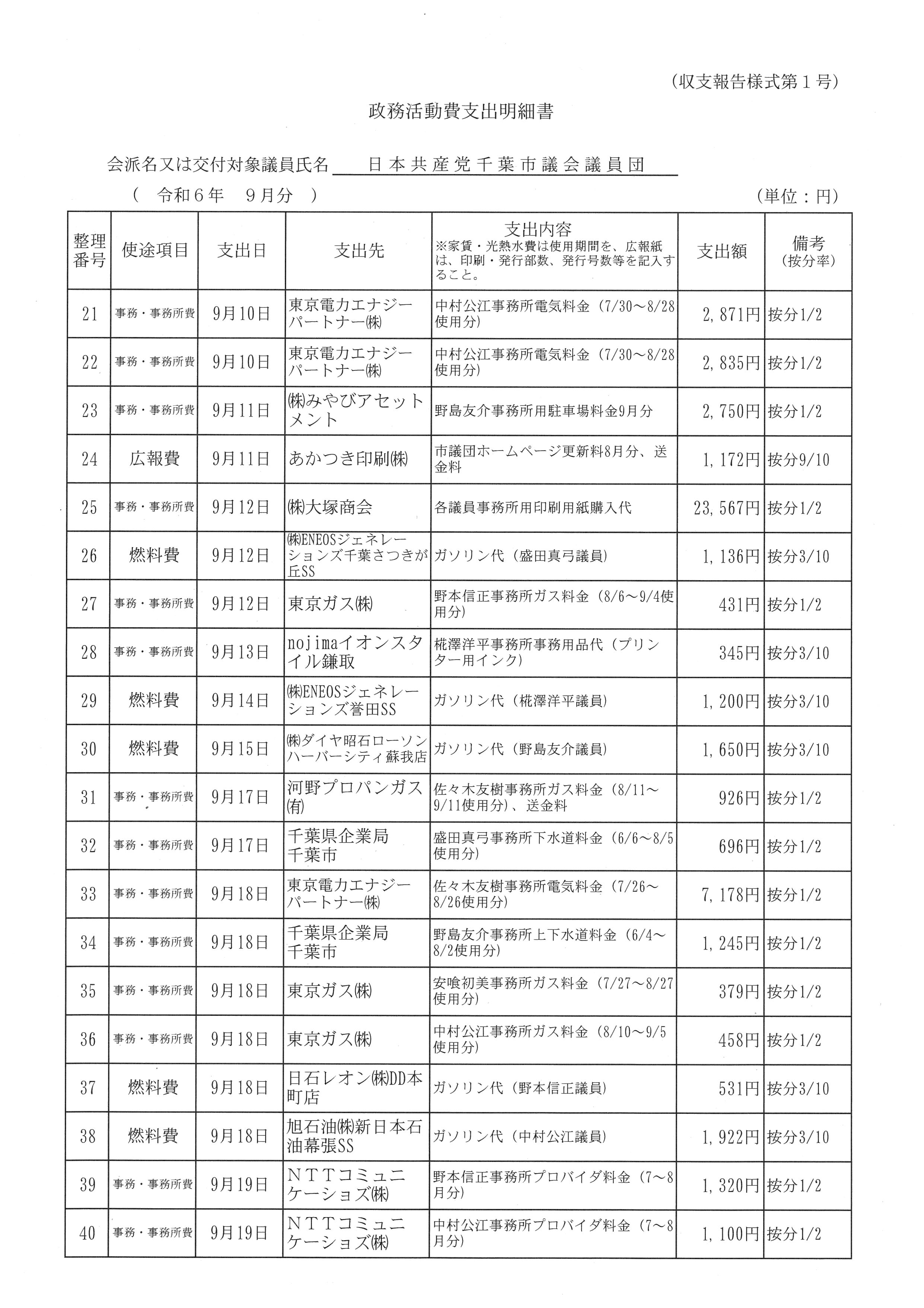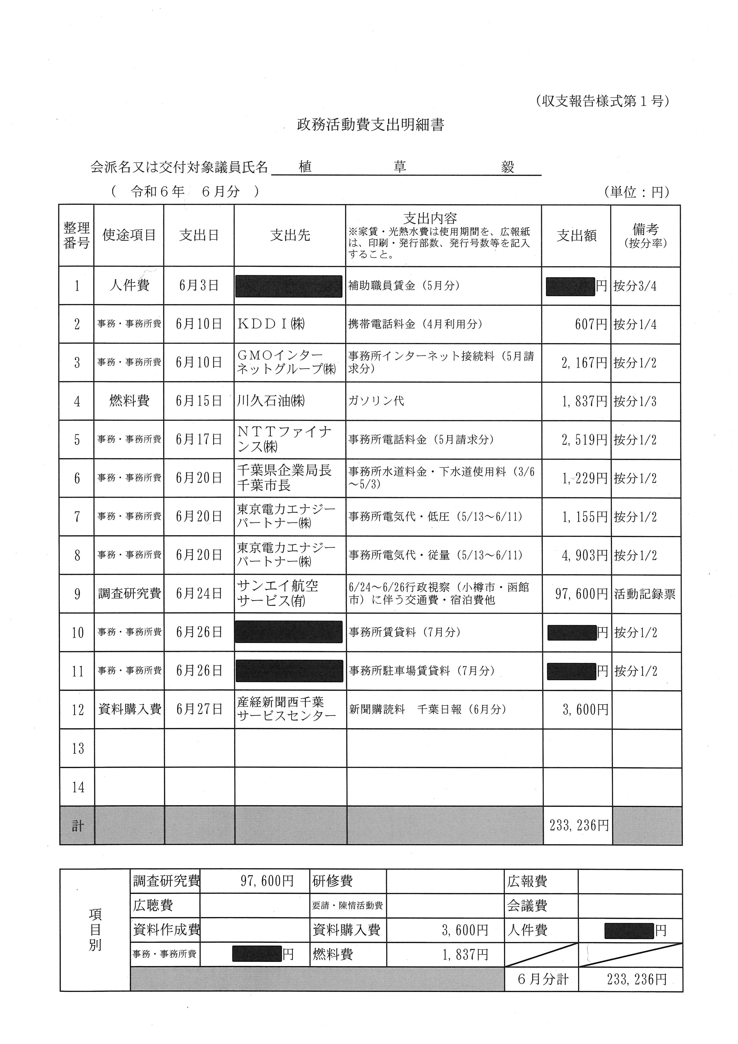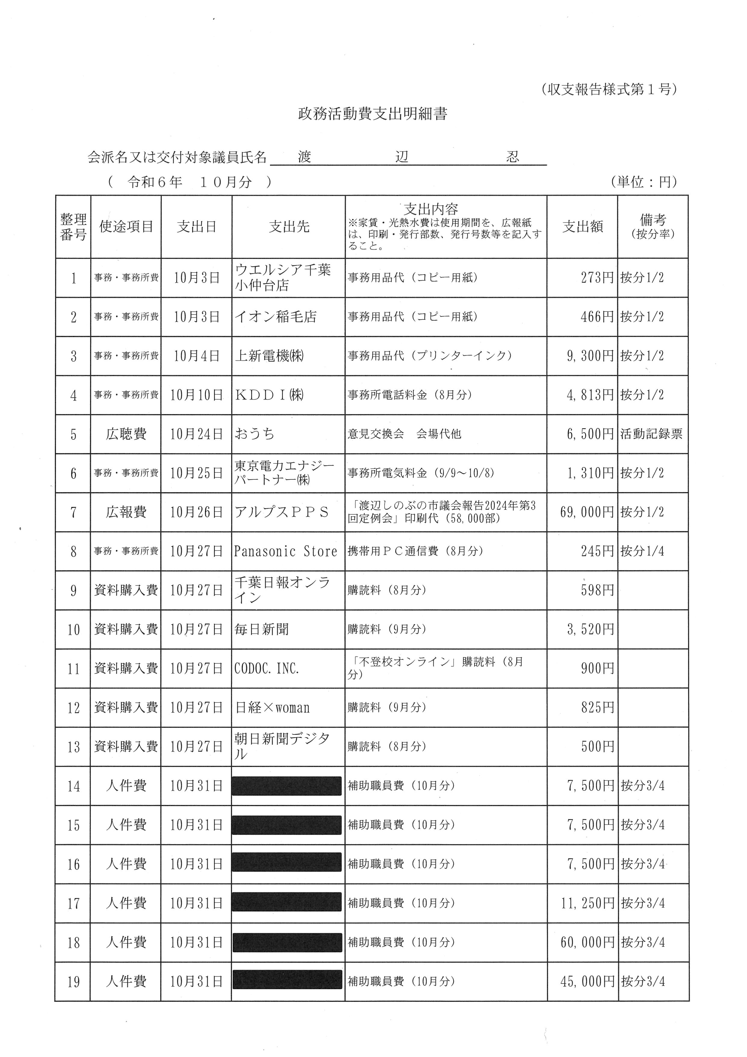 千葉市議会トップページ > 広報・情報公開 > 政務活動費 > 令和6年度交付分(政務活動費収支報告書)