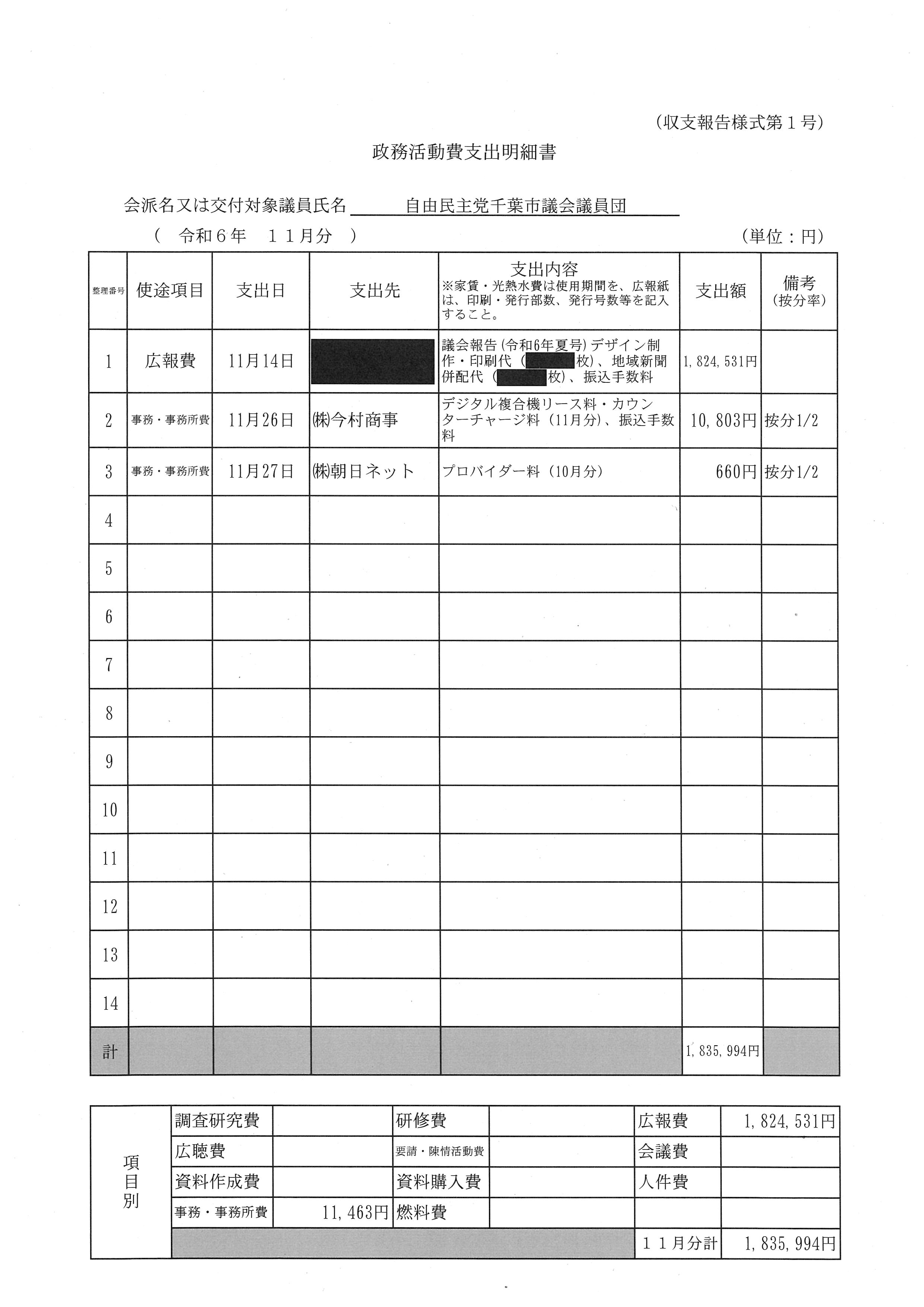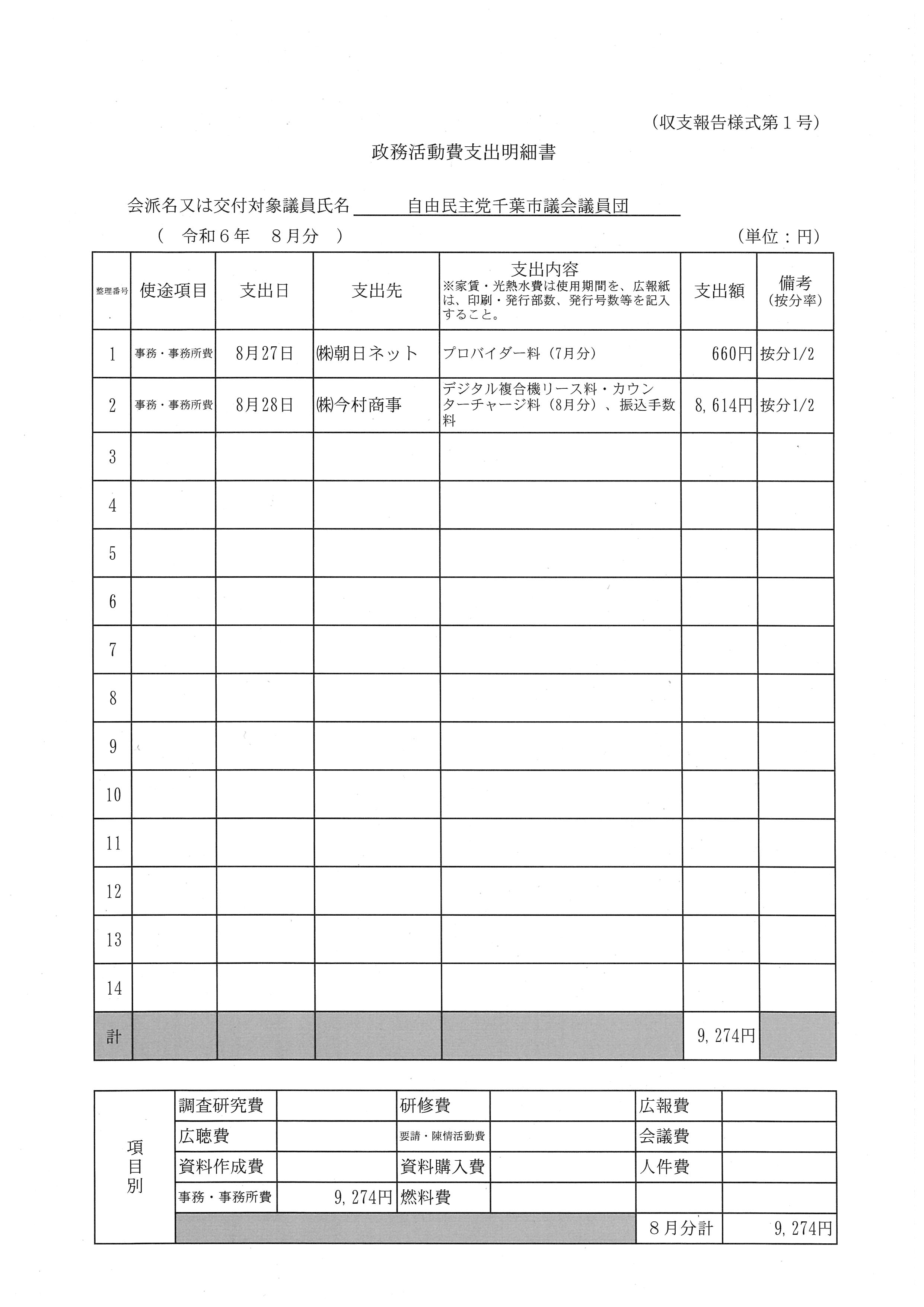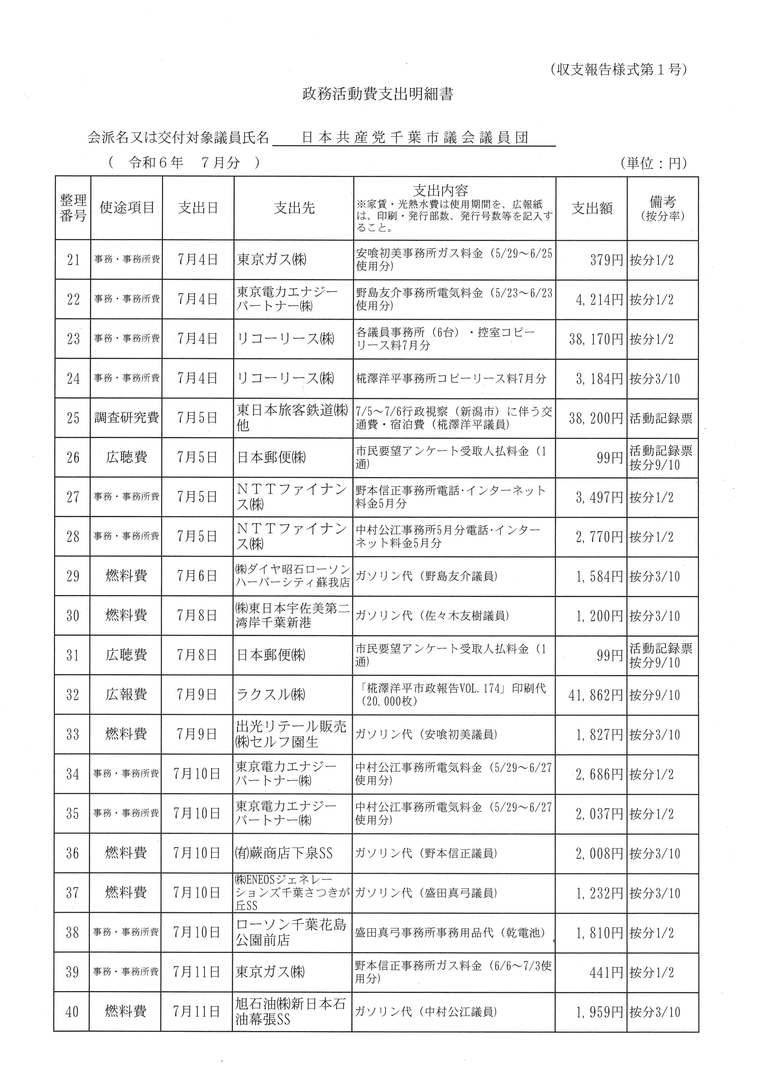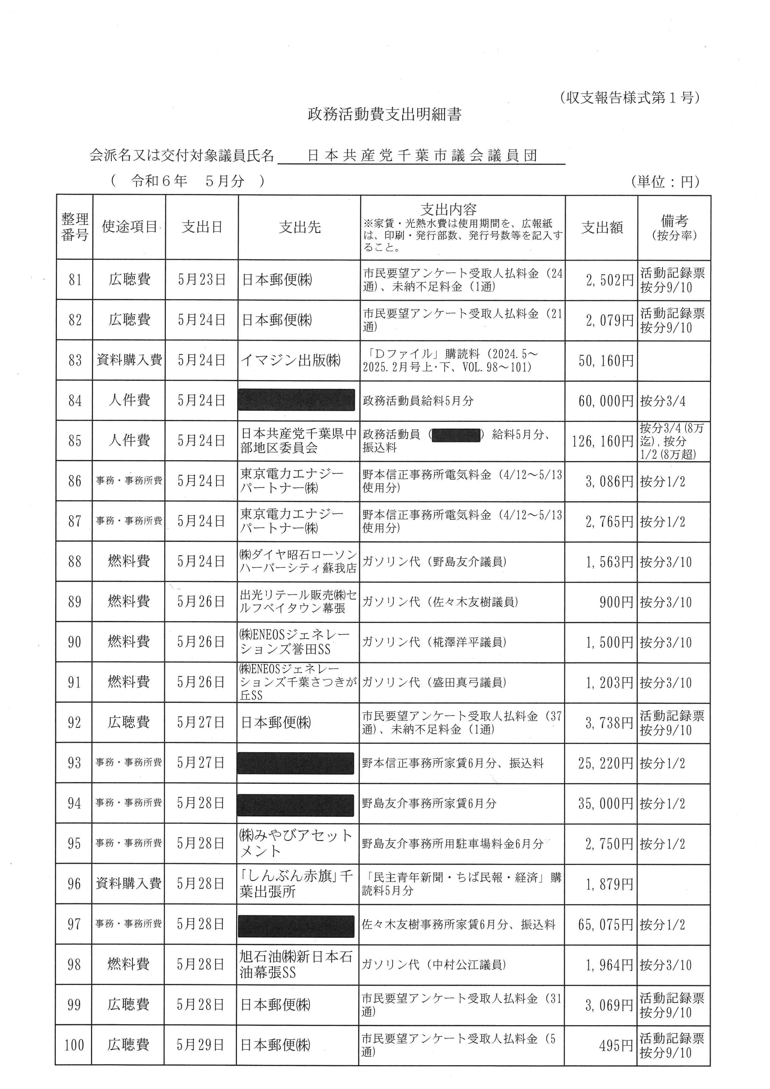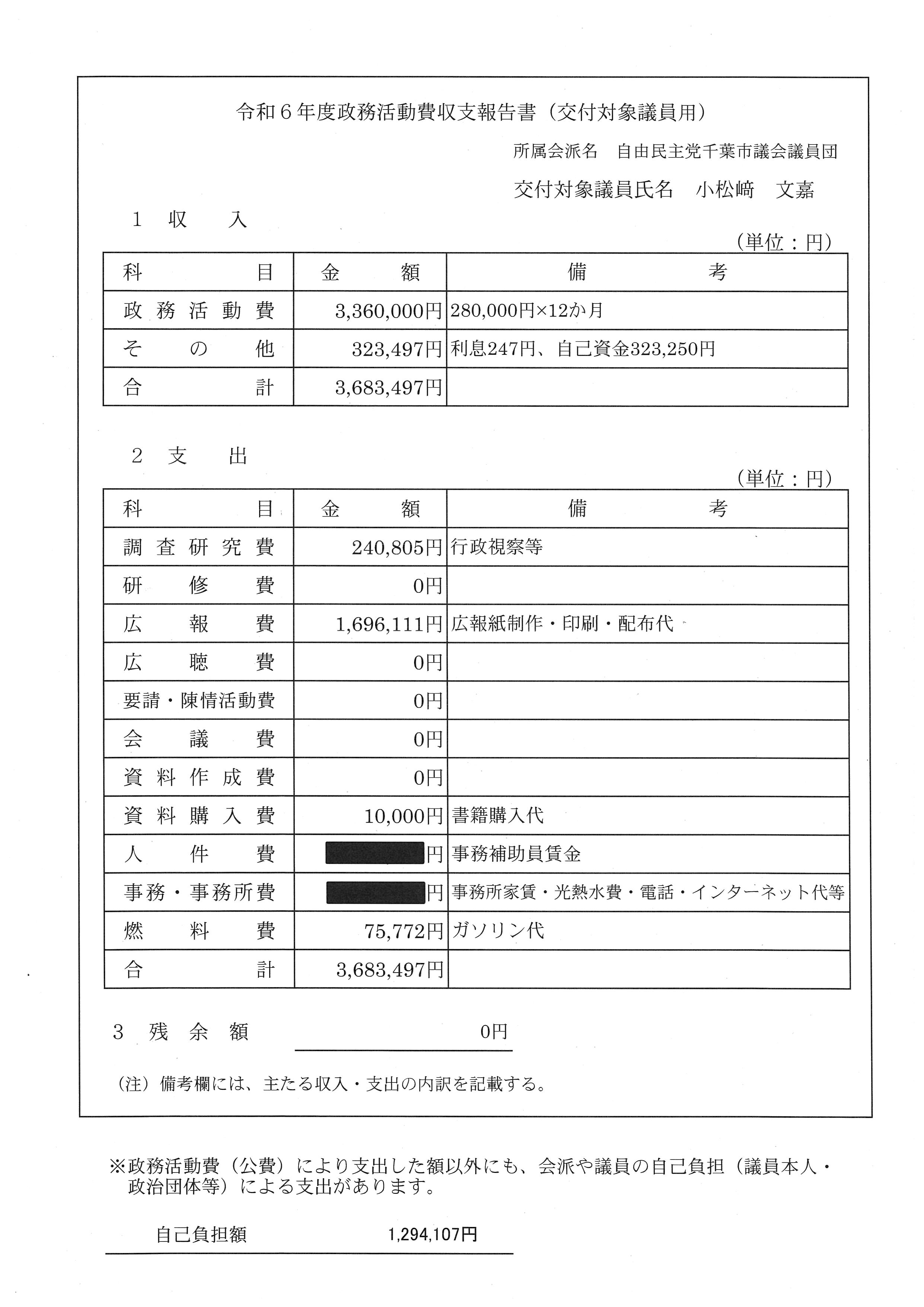千葉市議会トップページ > 広報・情報公開 > 政務活動費 > 令和6年度交付分(政務活動費収支報告書)