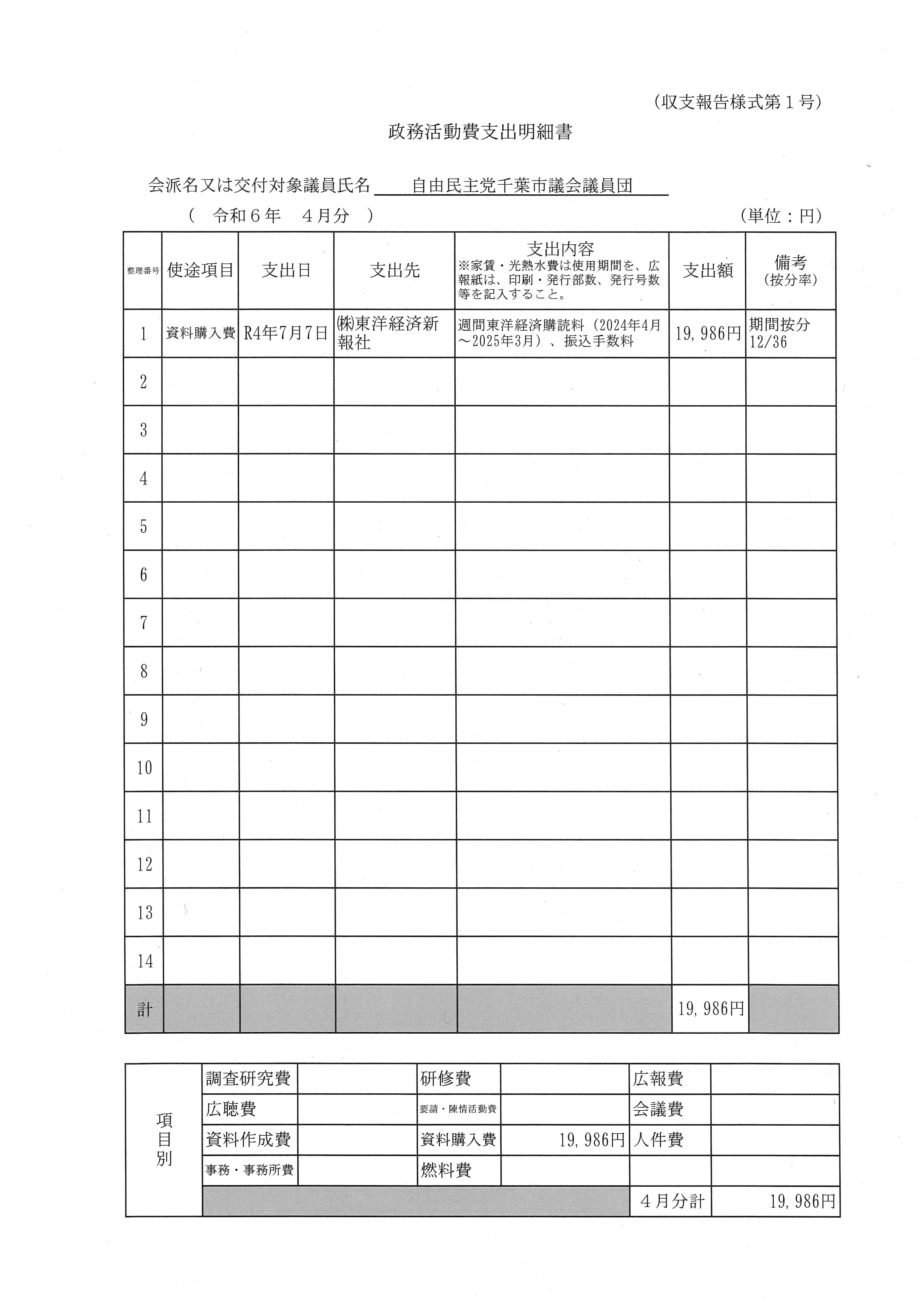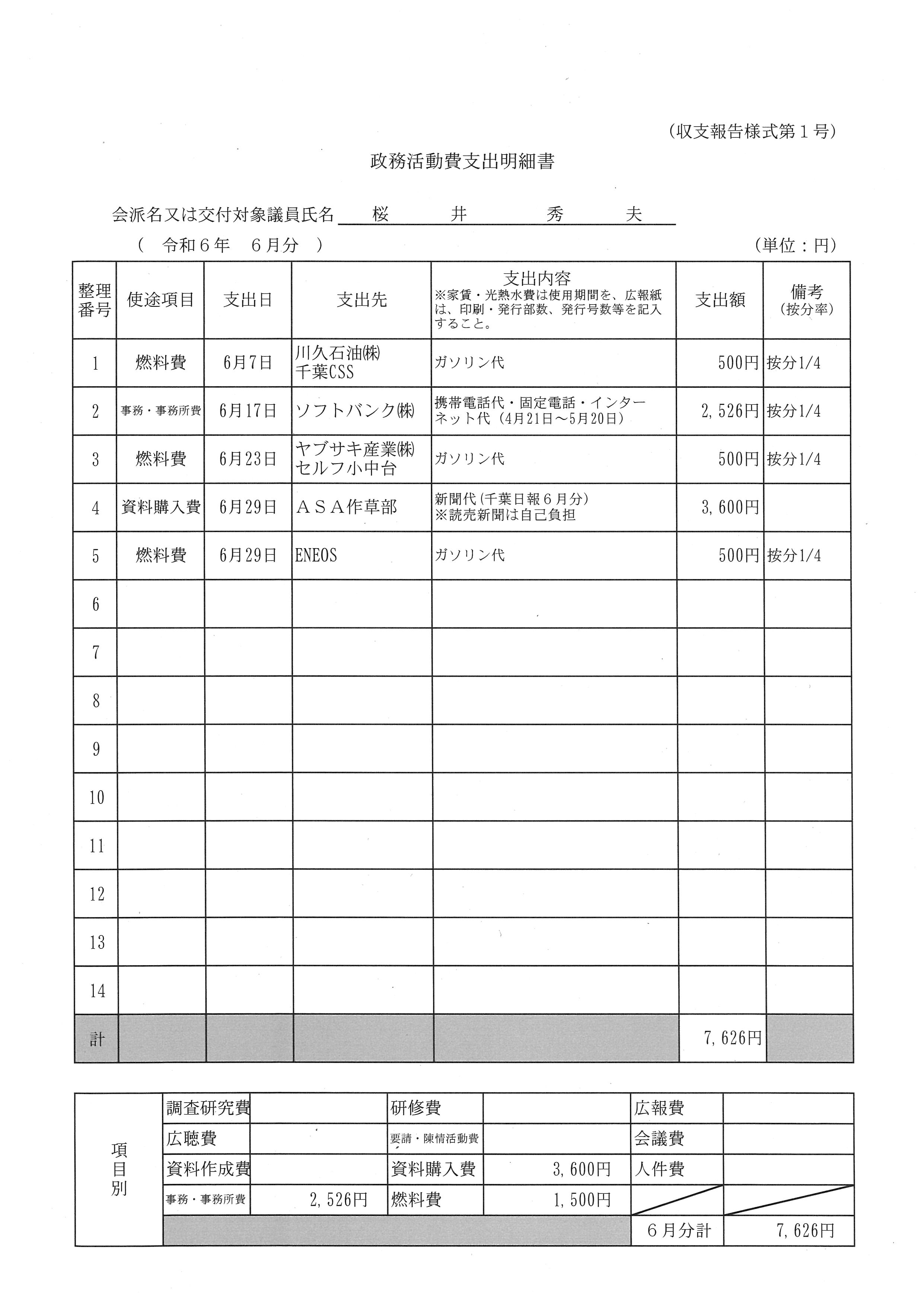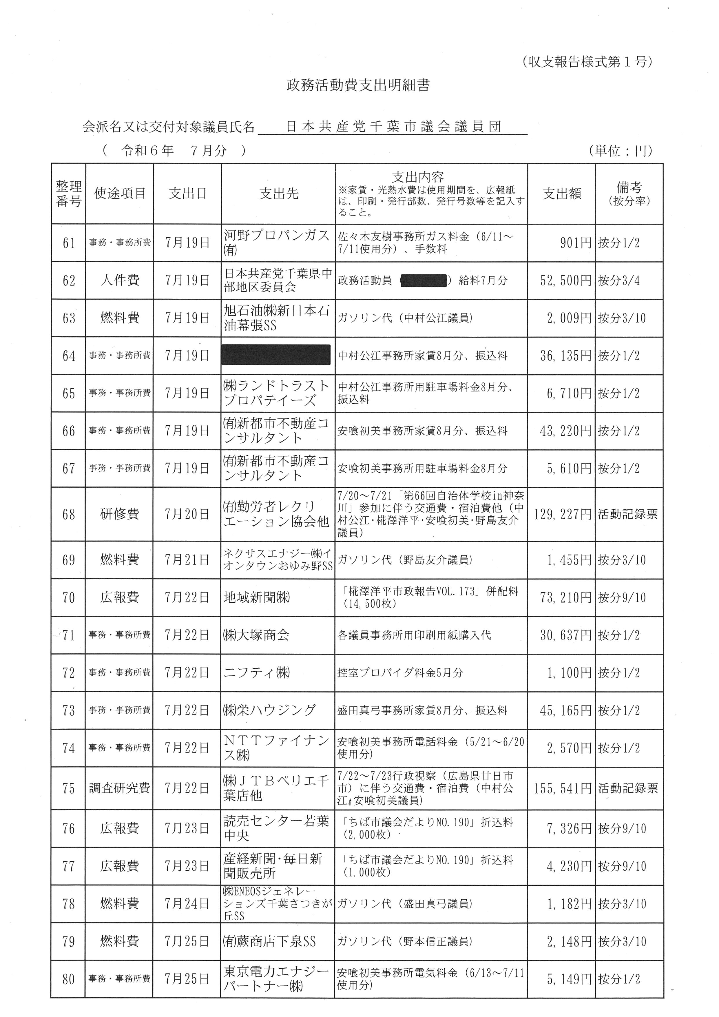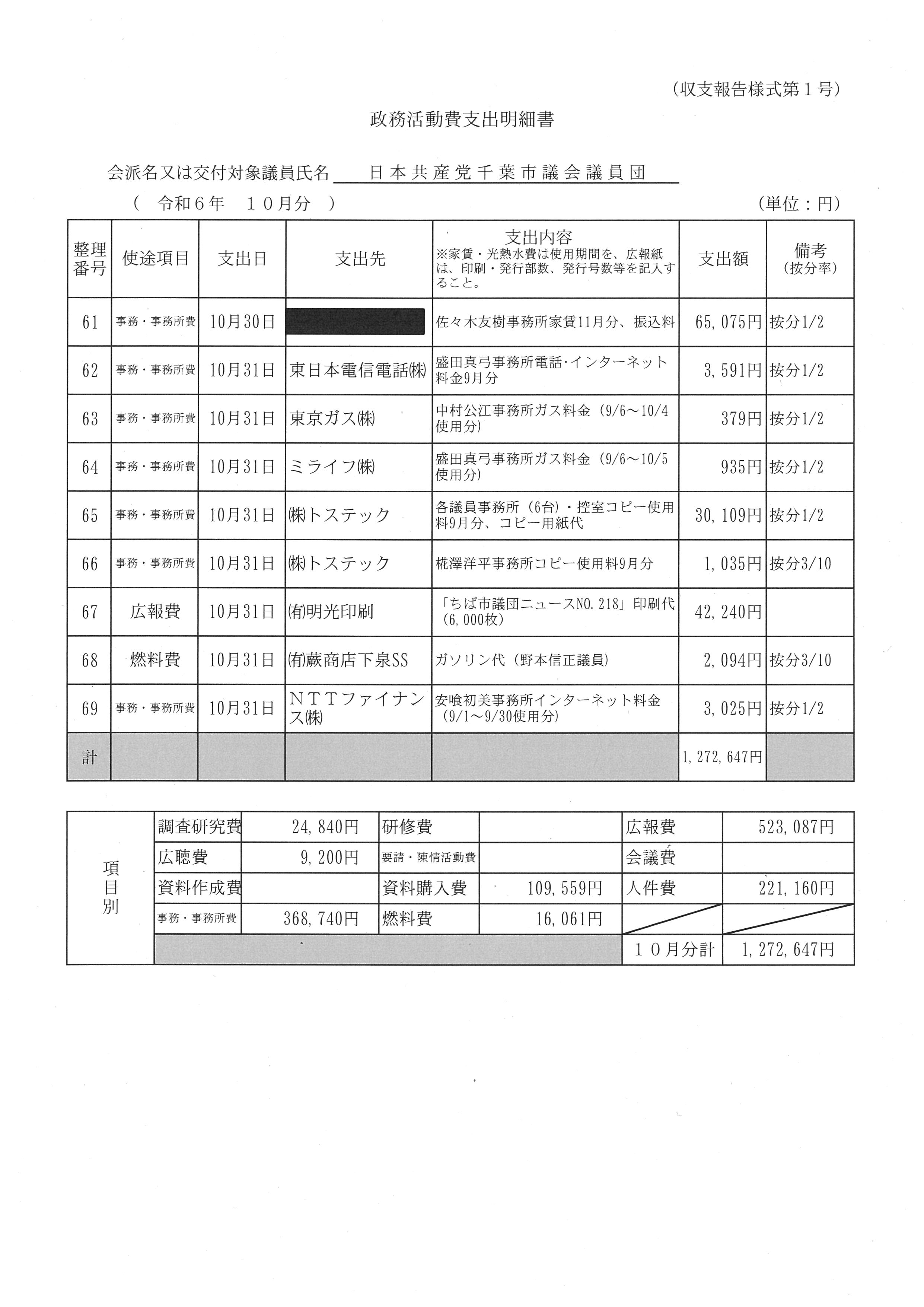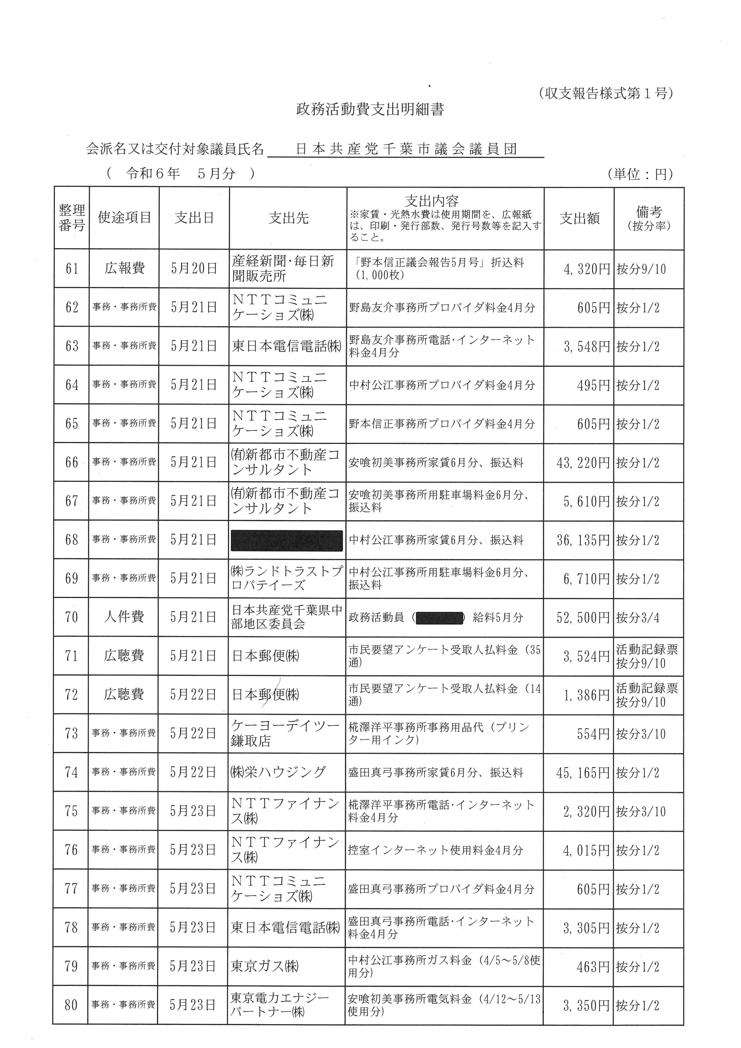千葉市議会トップページ > 広報・情報公開 > 政務活動費 > 令和6年度交付分(政務活動費収支報告書)