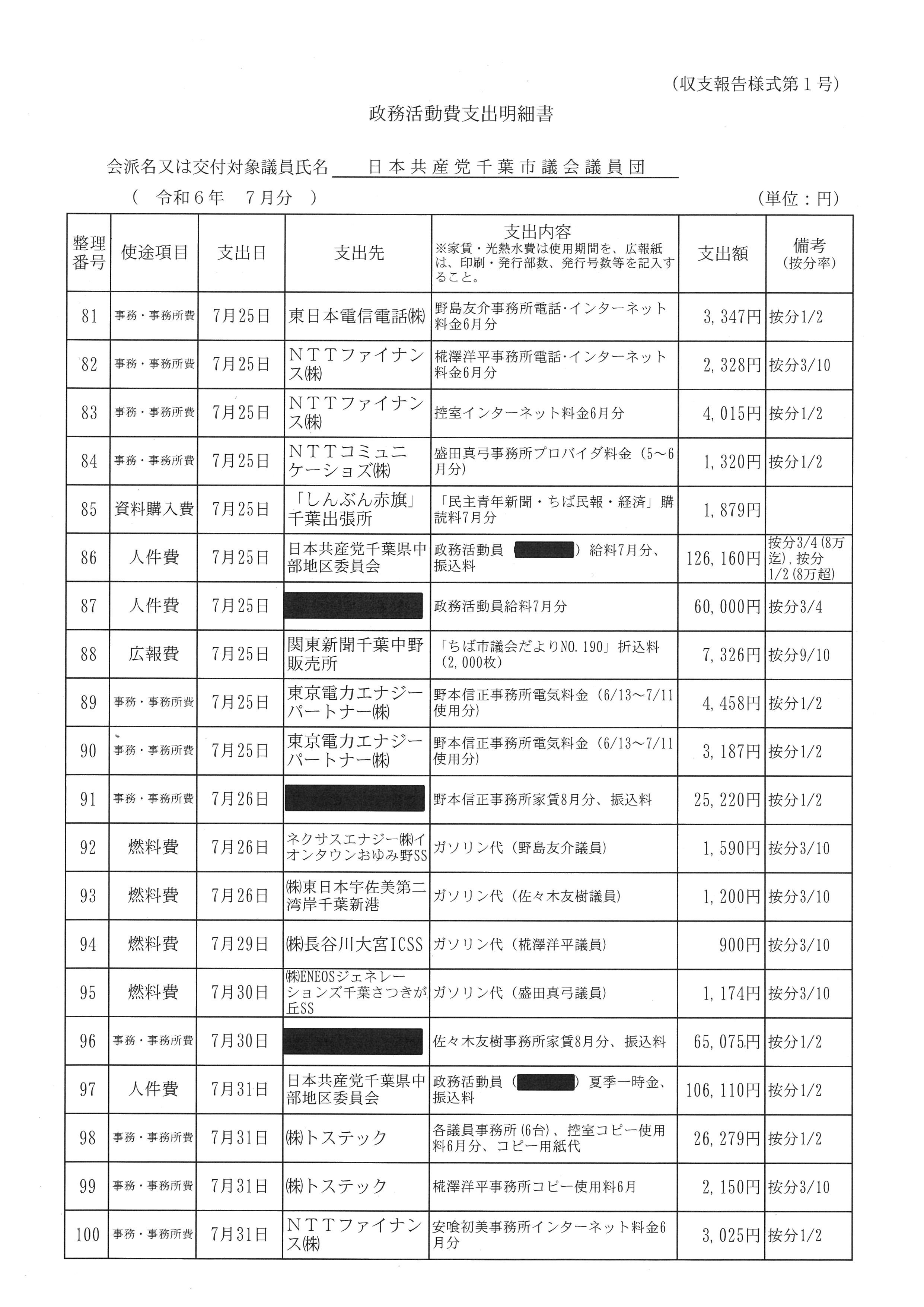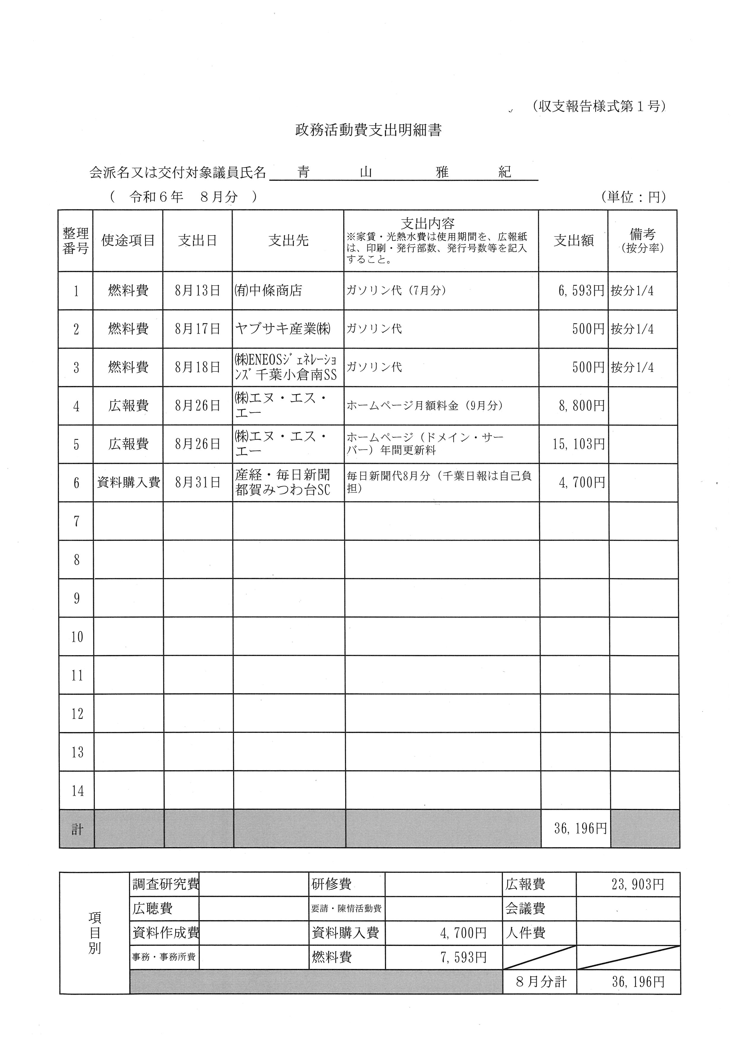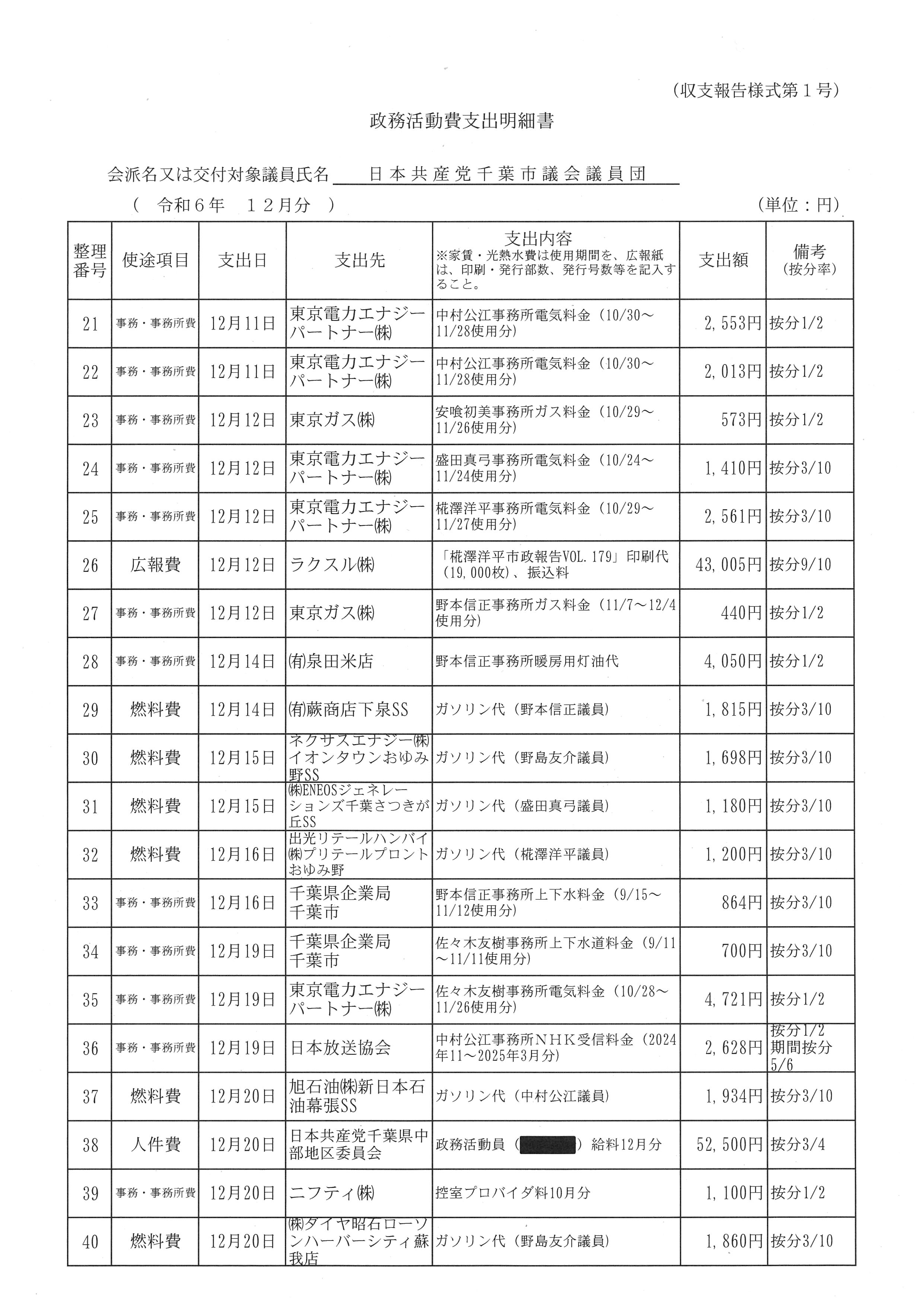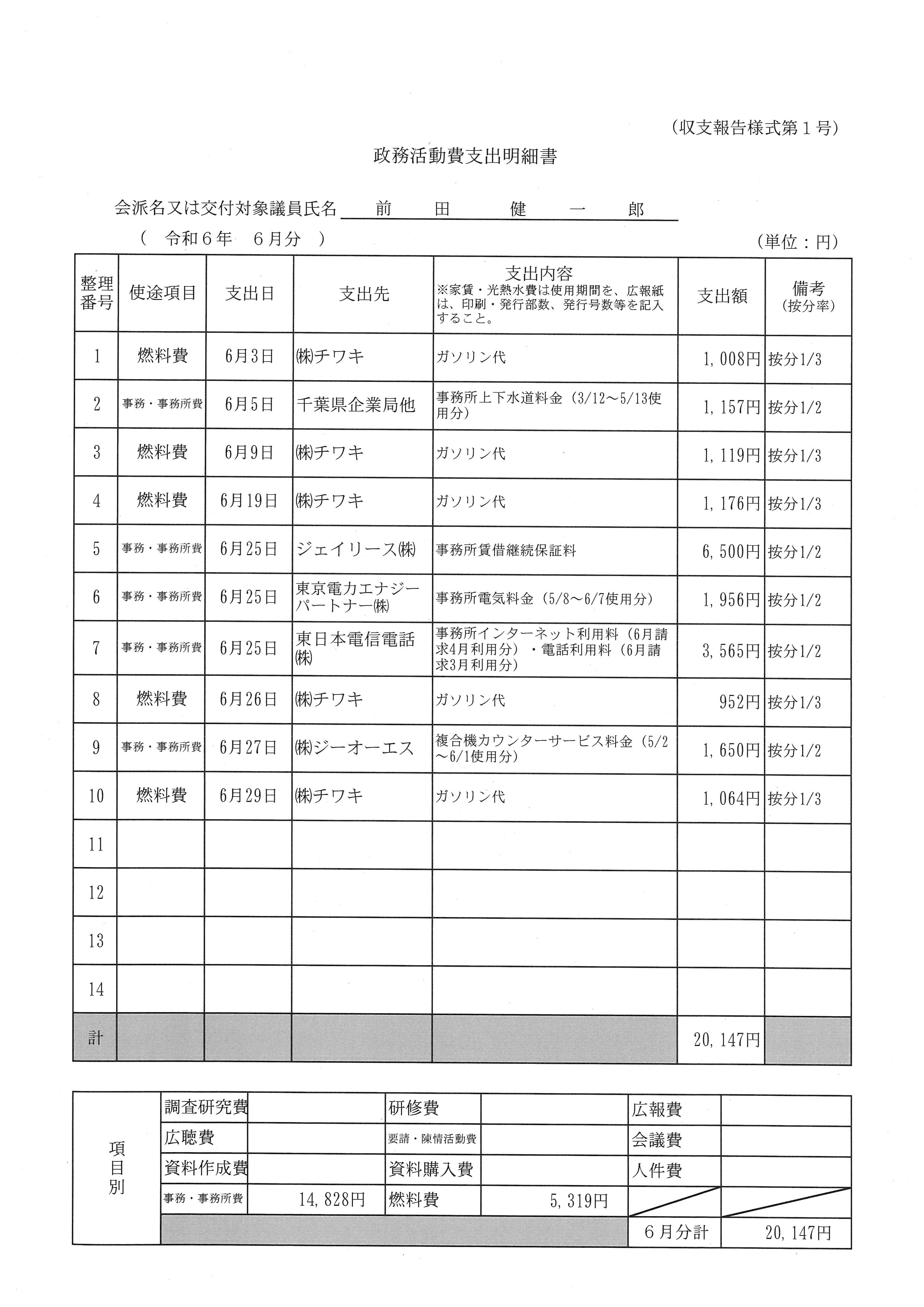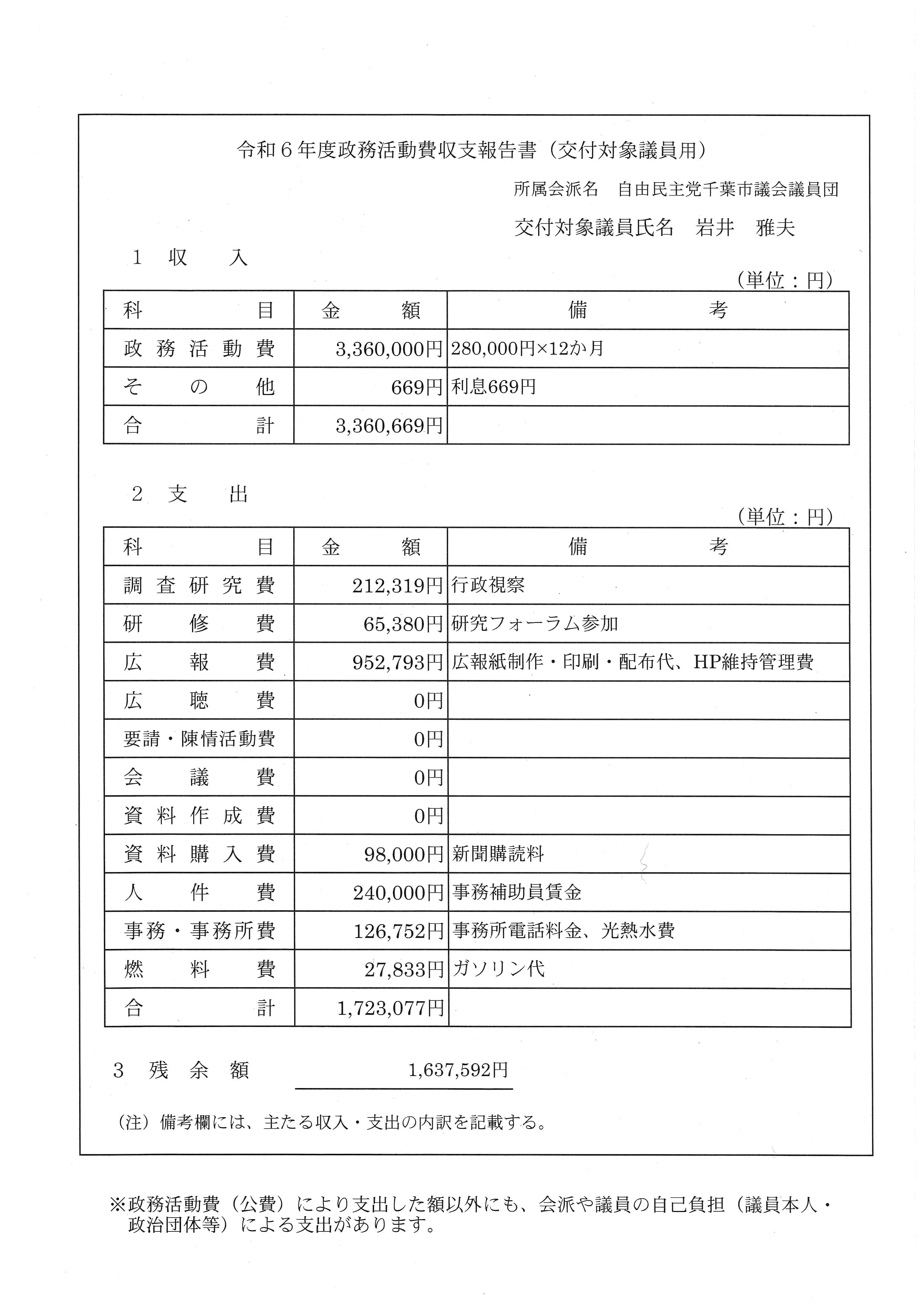 千葉市議会トップページ > 広報・情報公開 > 政務活動費 > 令和6年度交付分(政務活動費収支報告書)