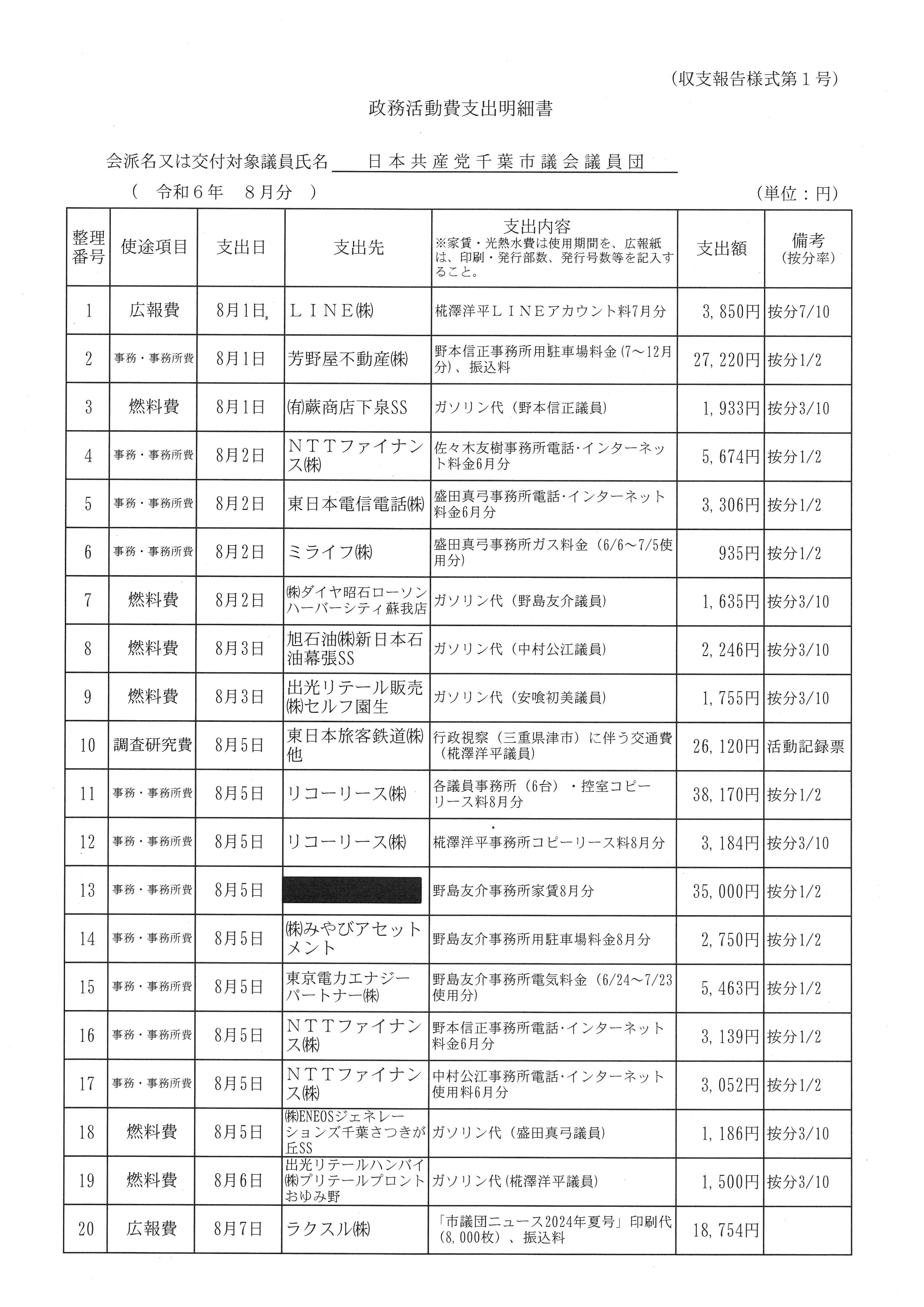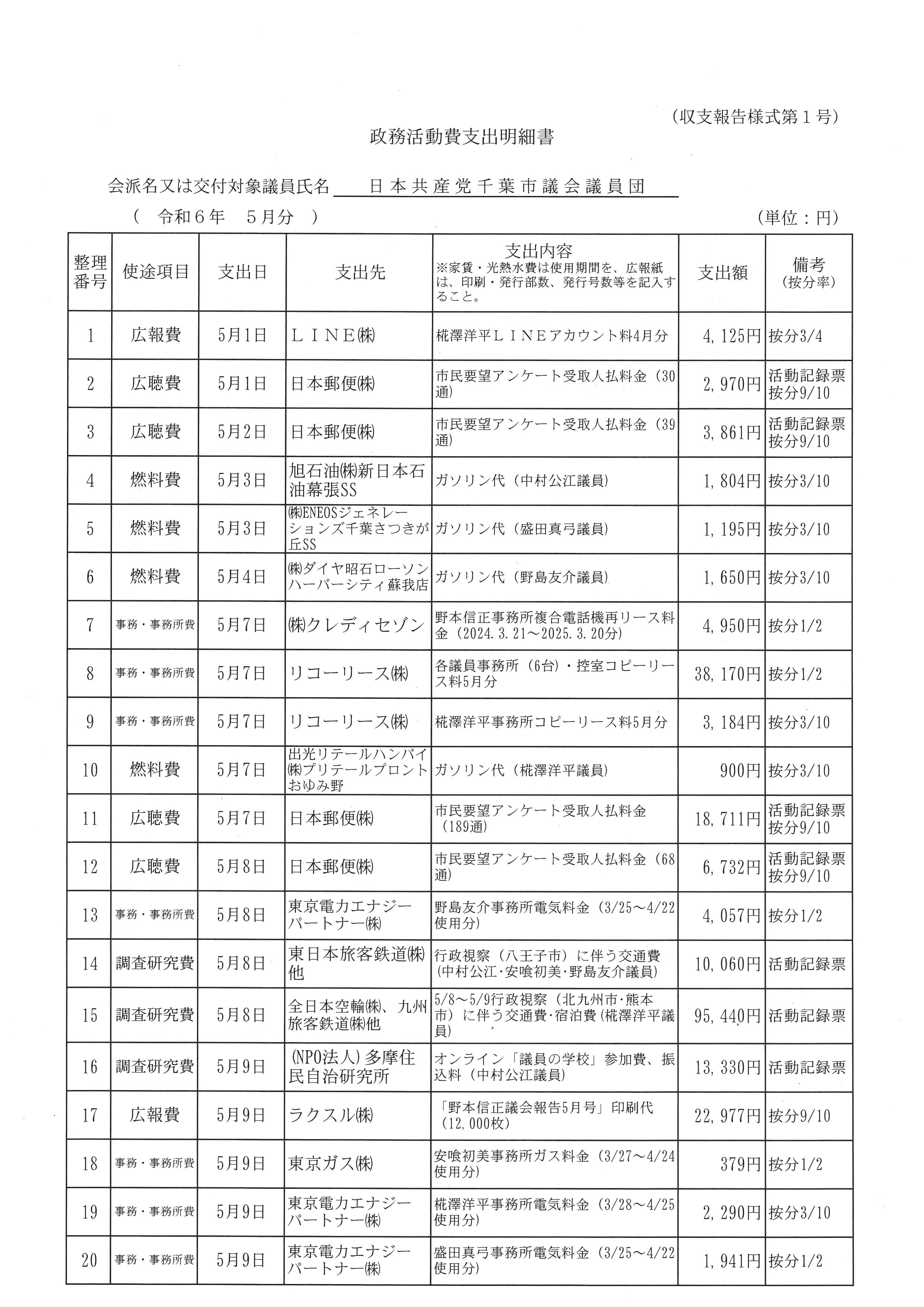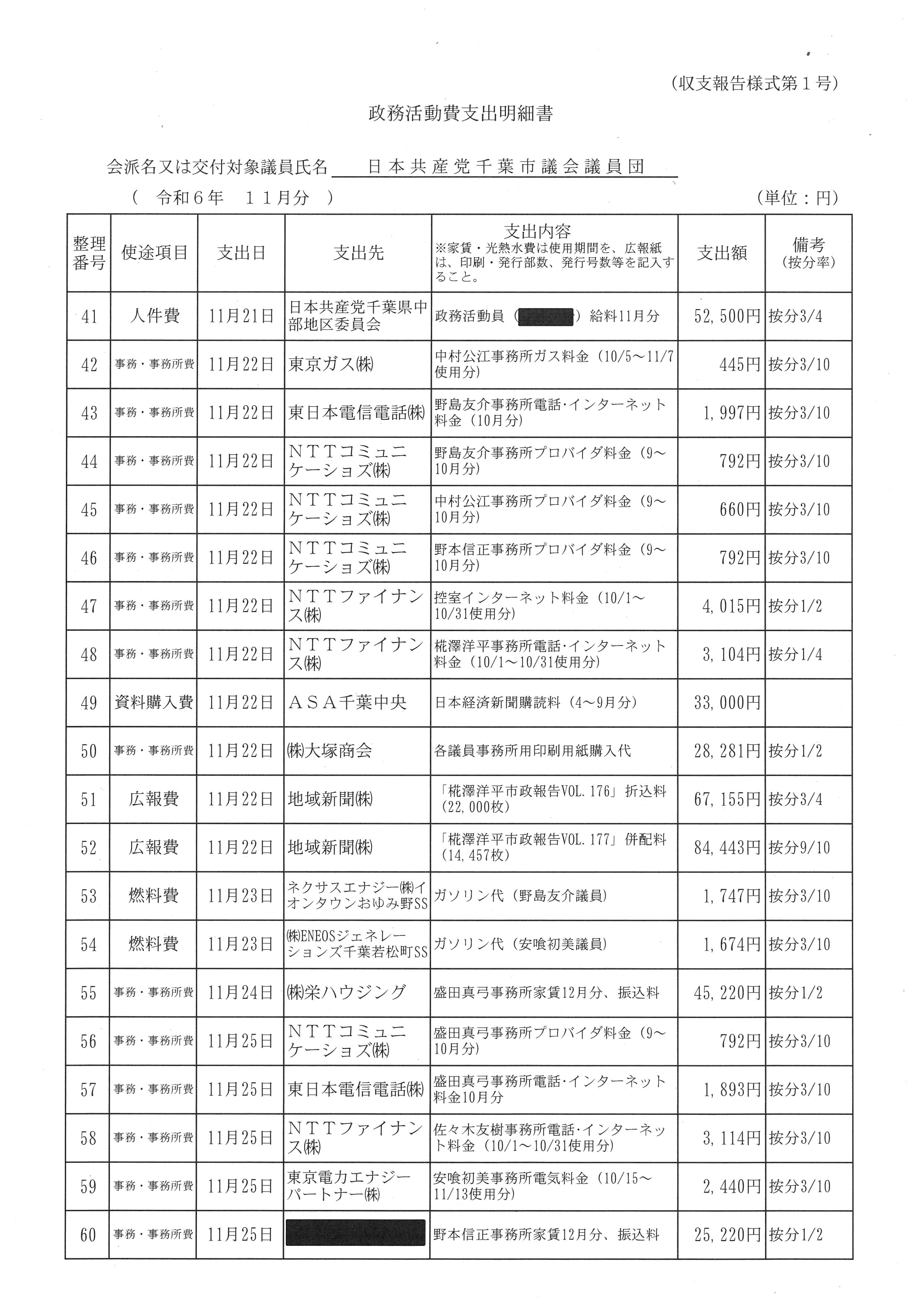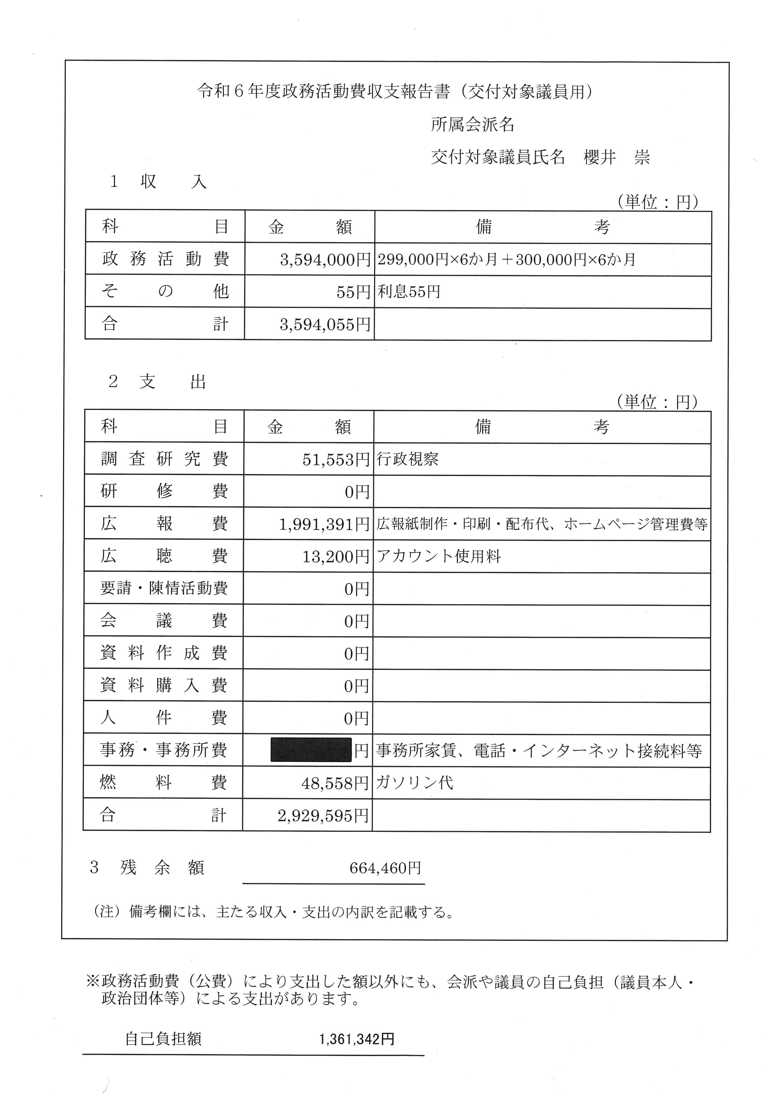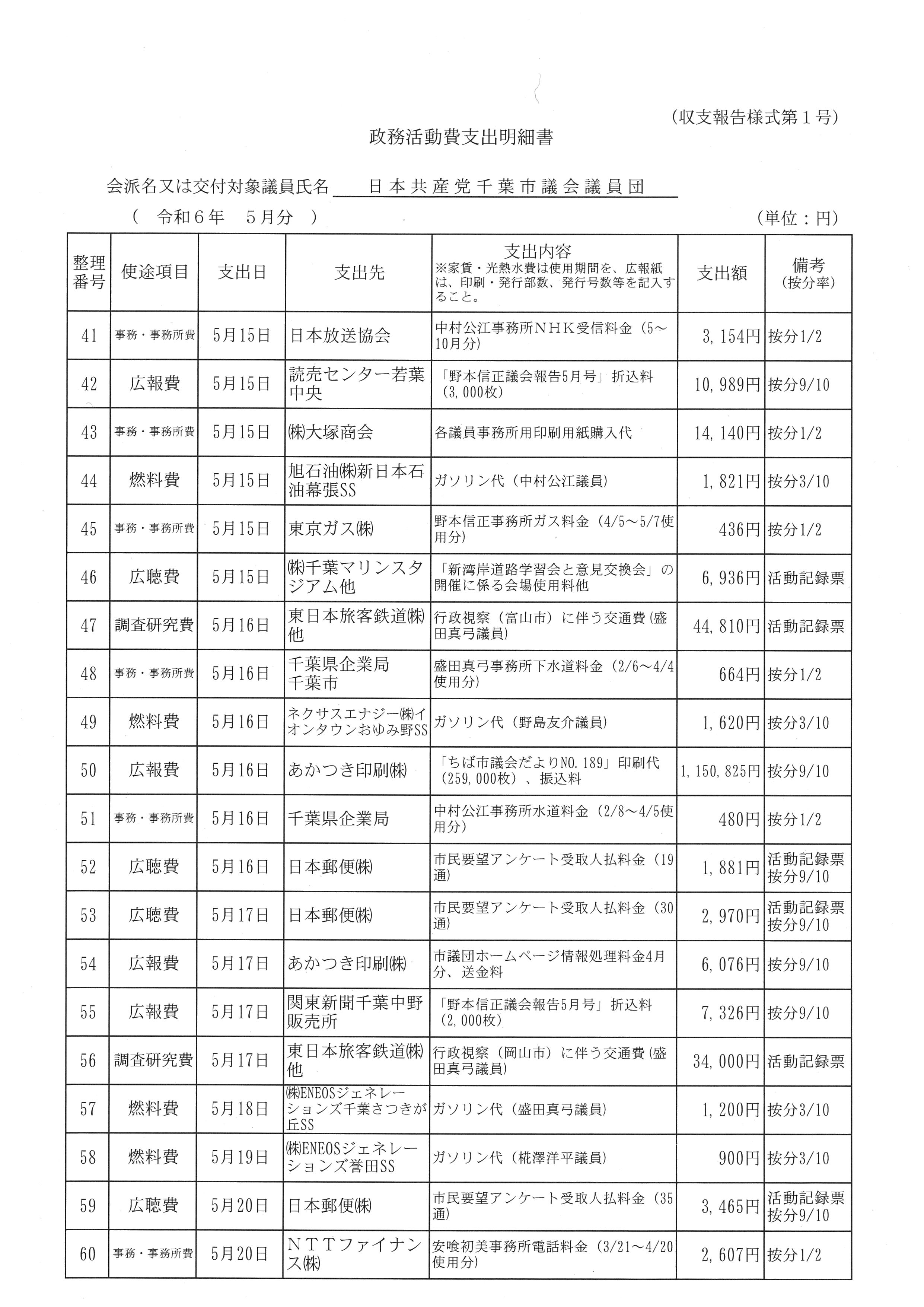 千葉市議会トップページ > 広報・情報公開 > 政務活動費 > 令和6年度交付分(政務活動費収支報告書)