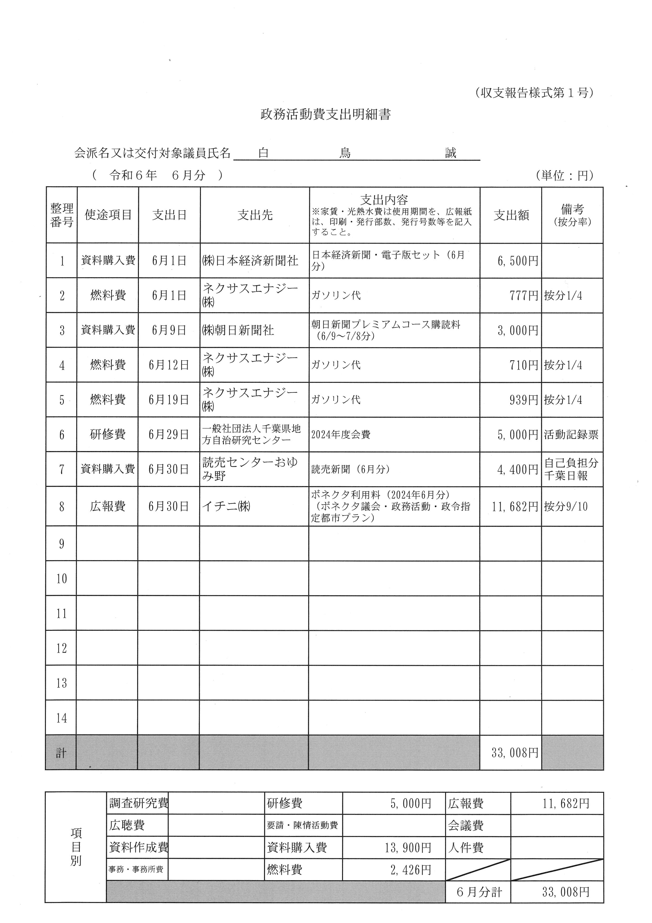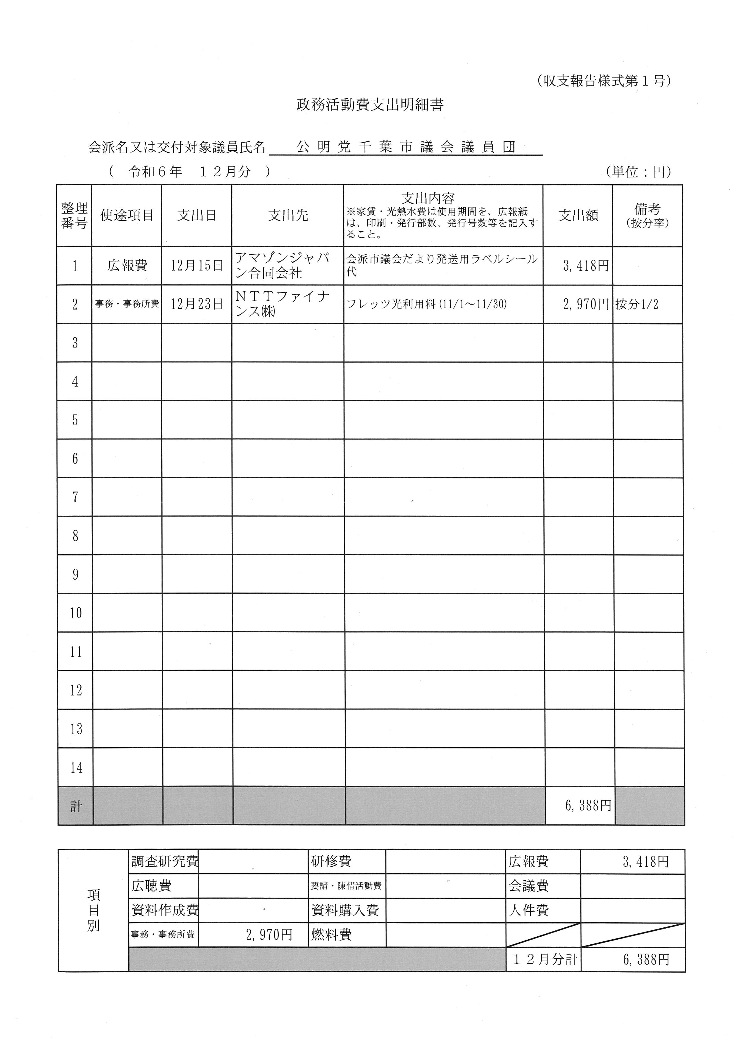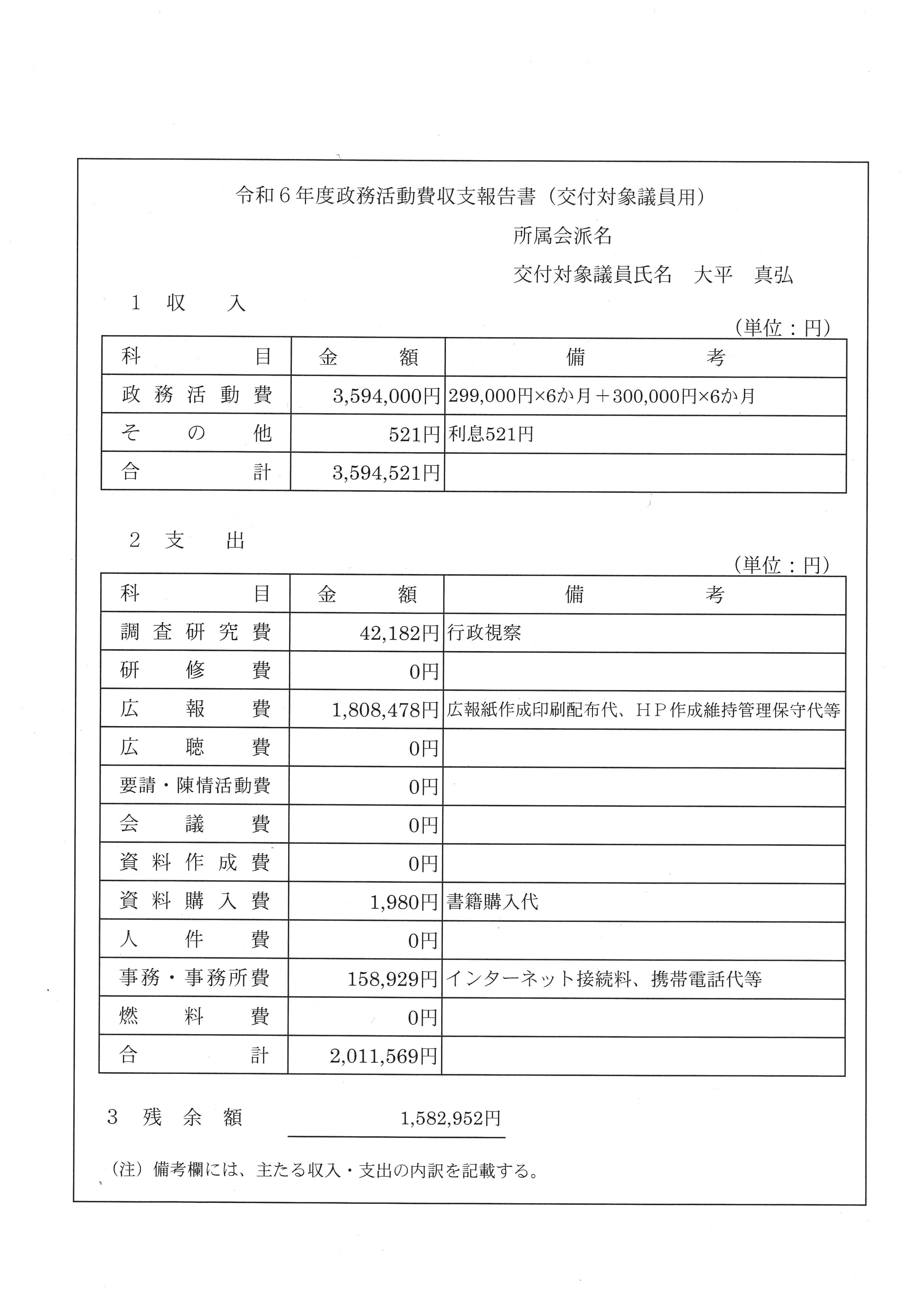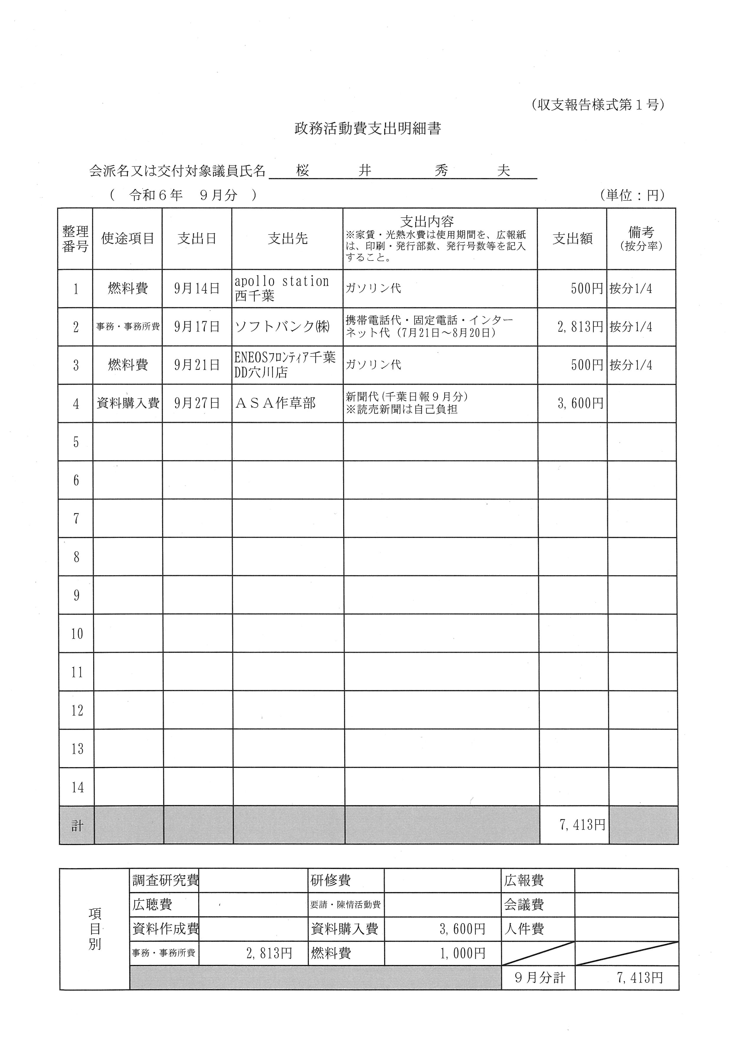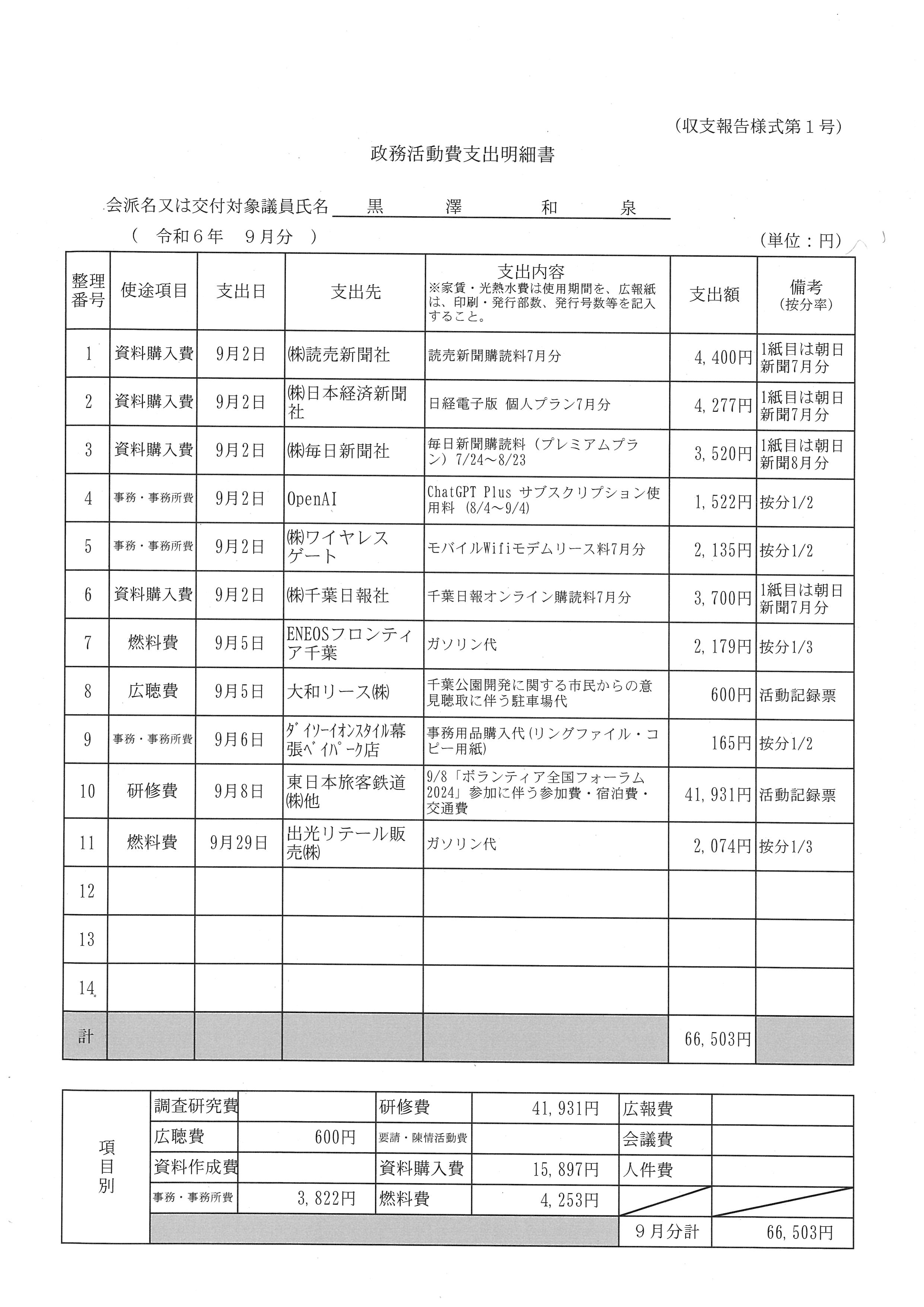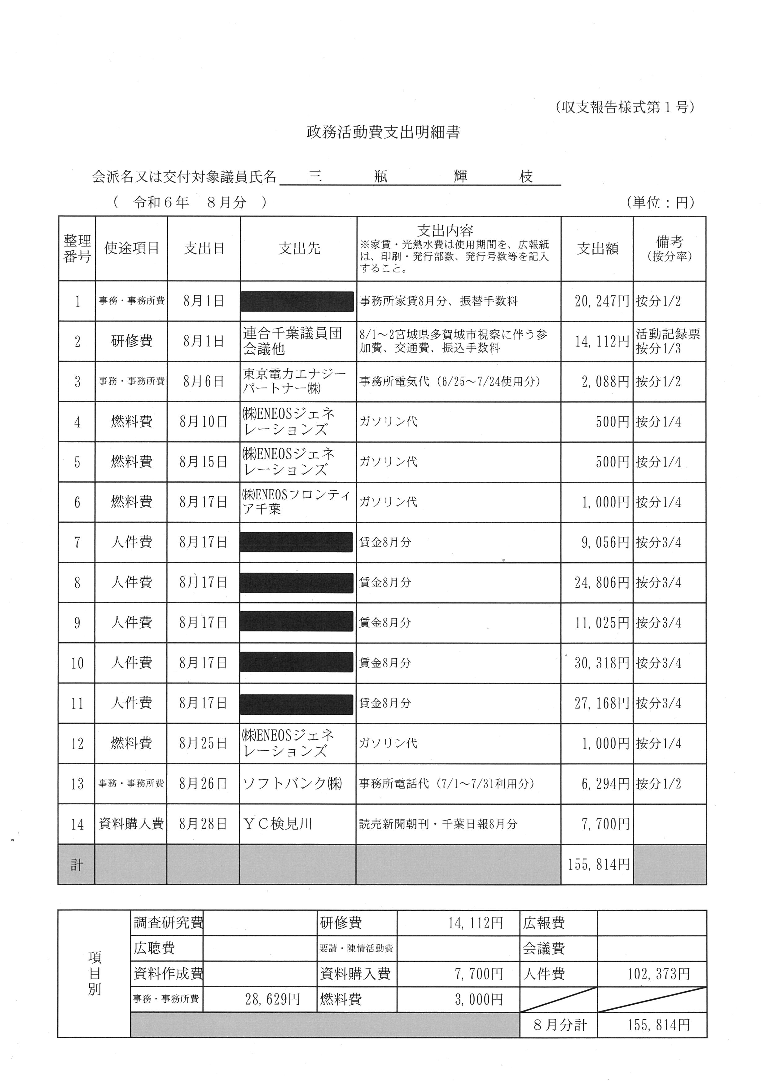 千葉市議会トップページ > 広報・情報公開 > 政務活動費 > 令和6年度交付分(政務活動費収支報告書)