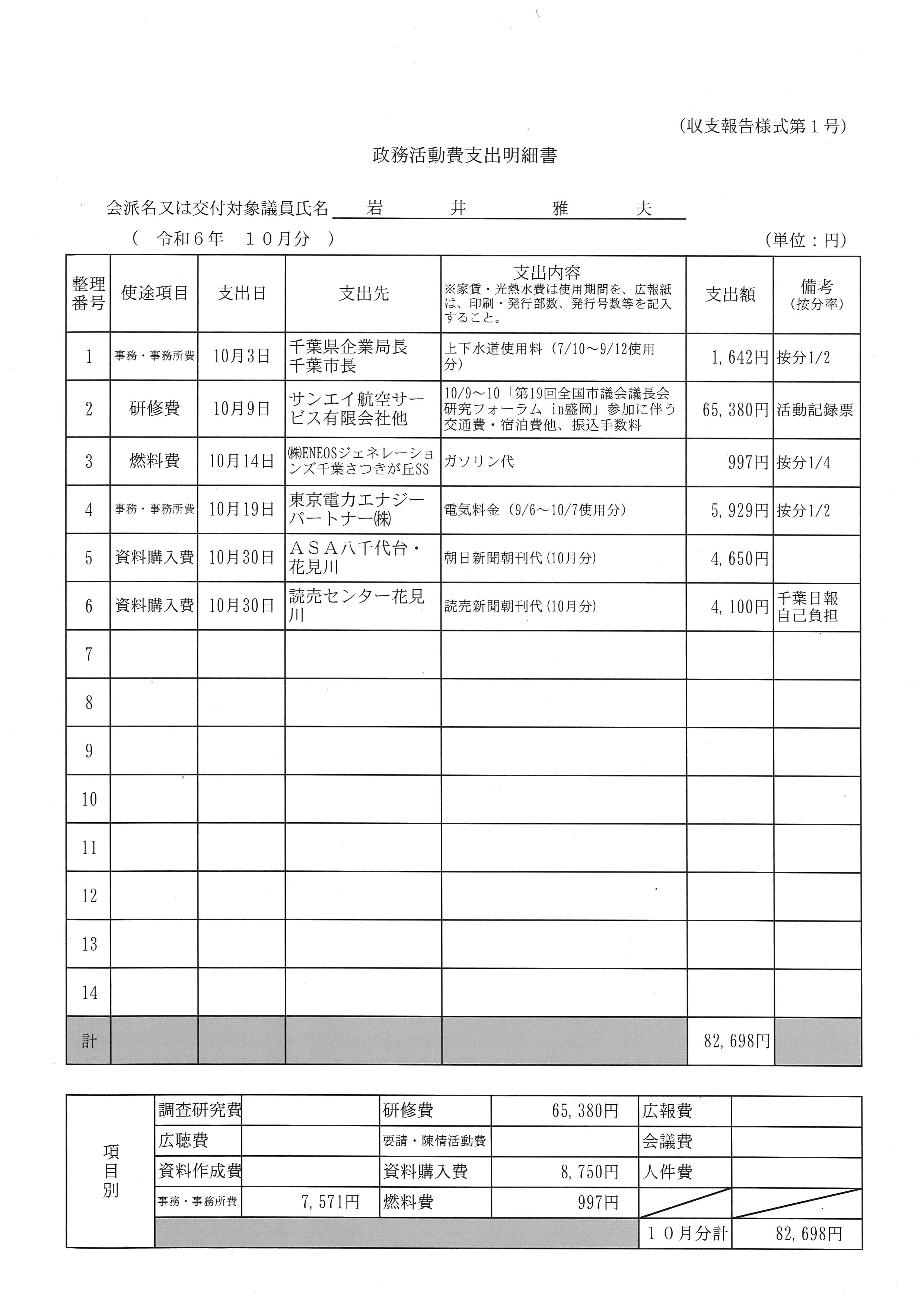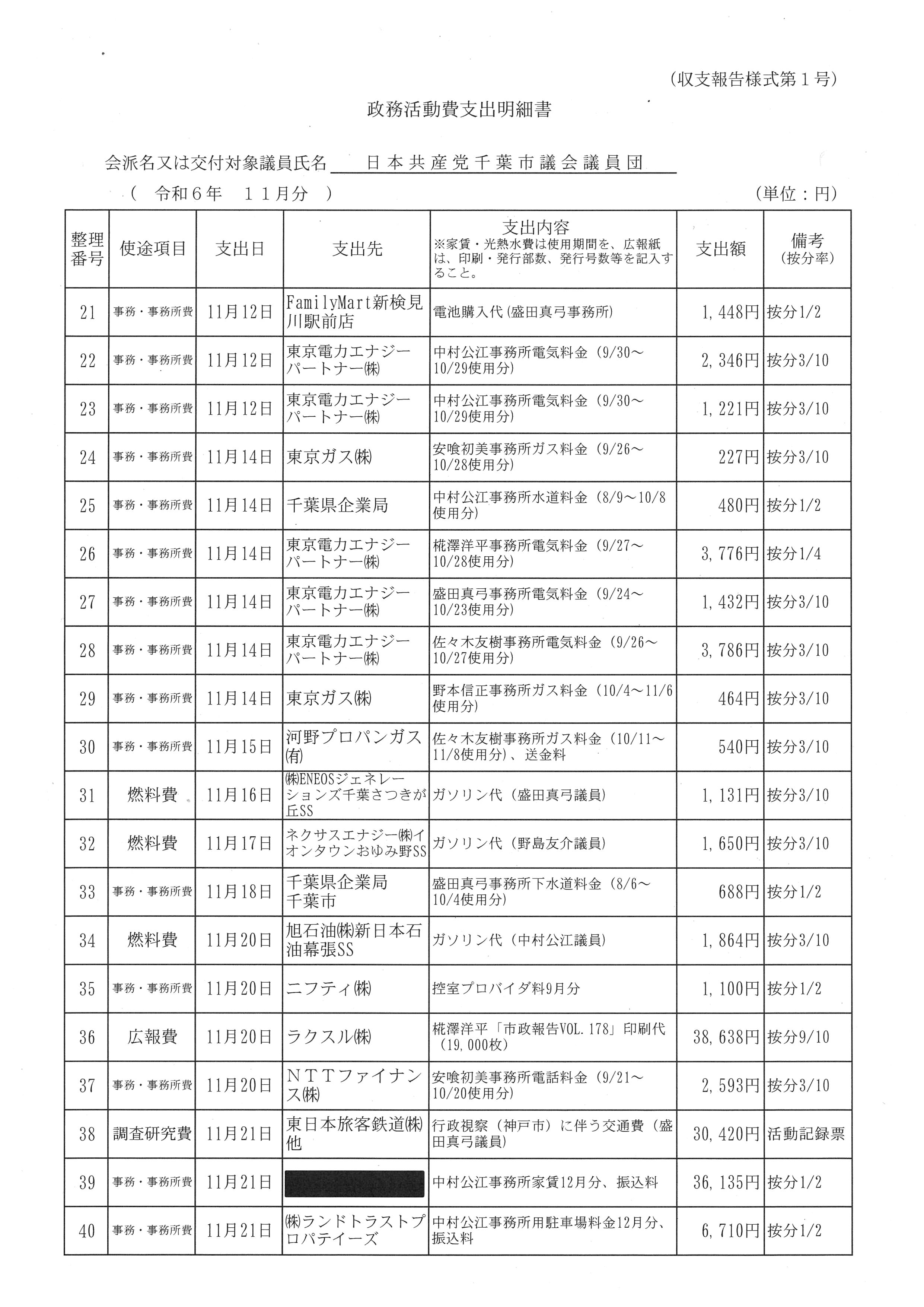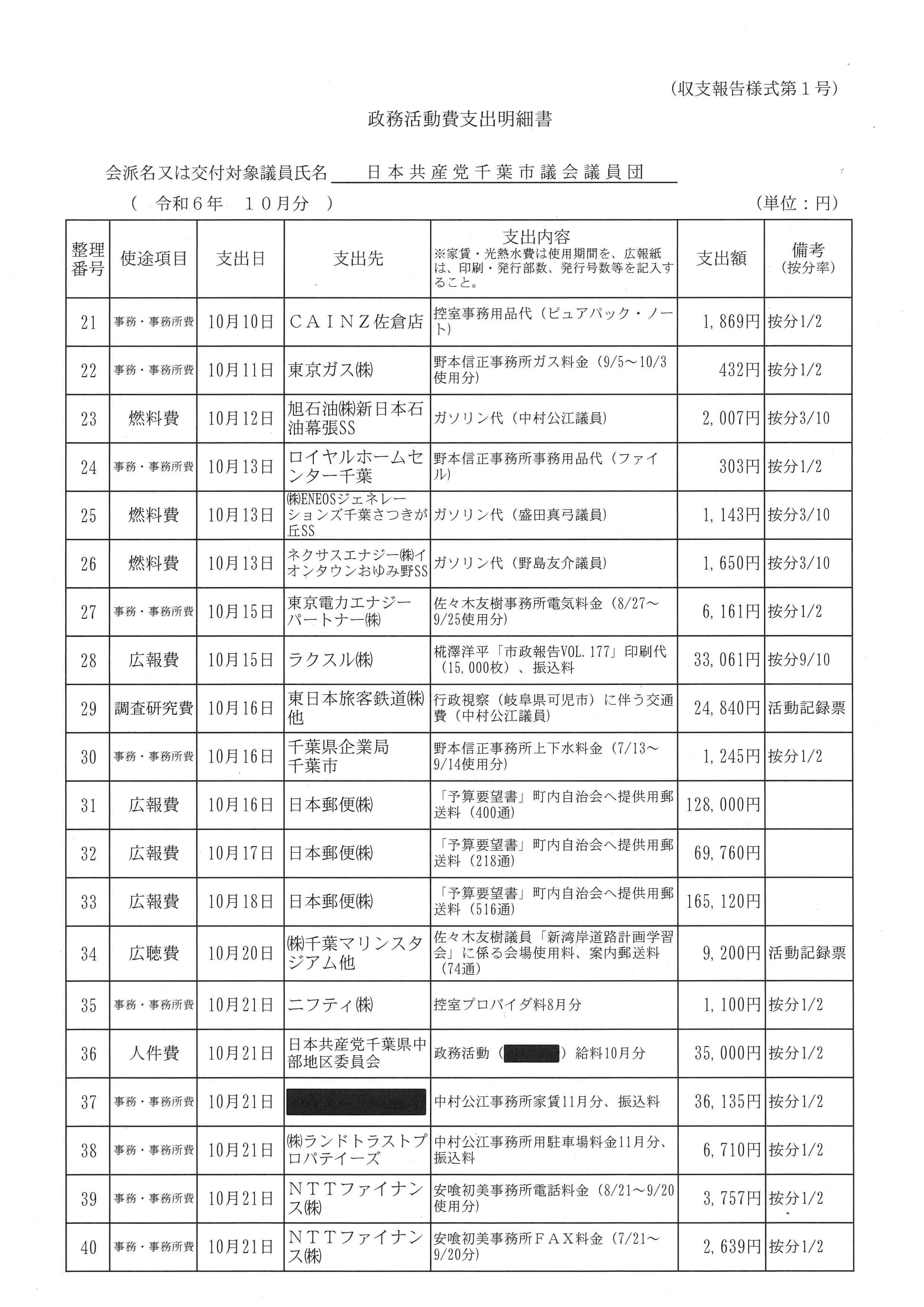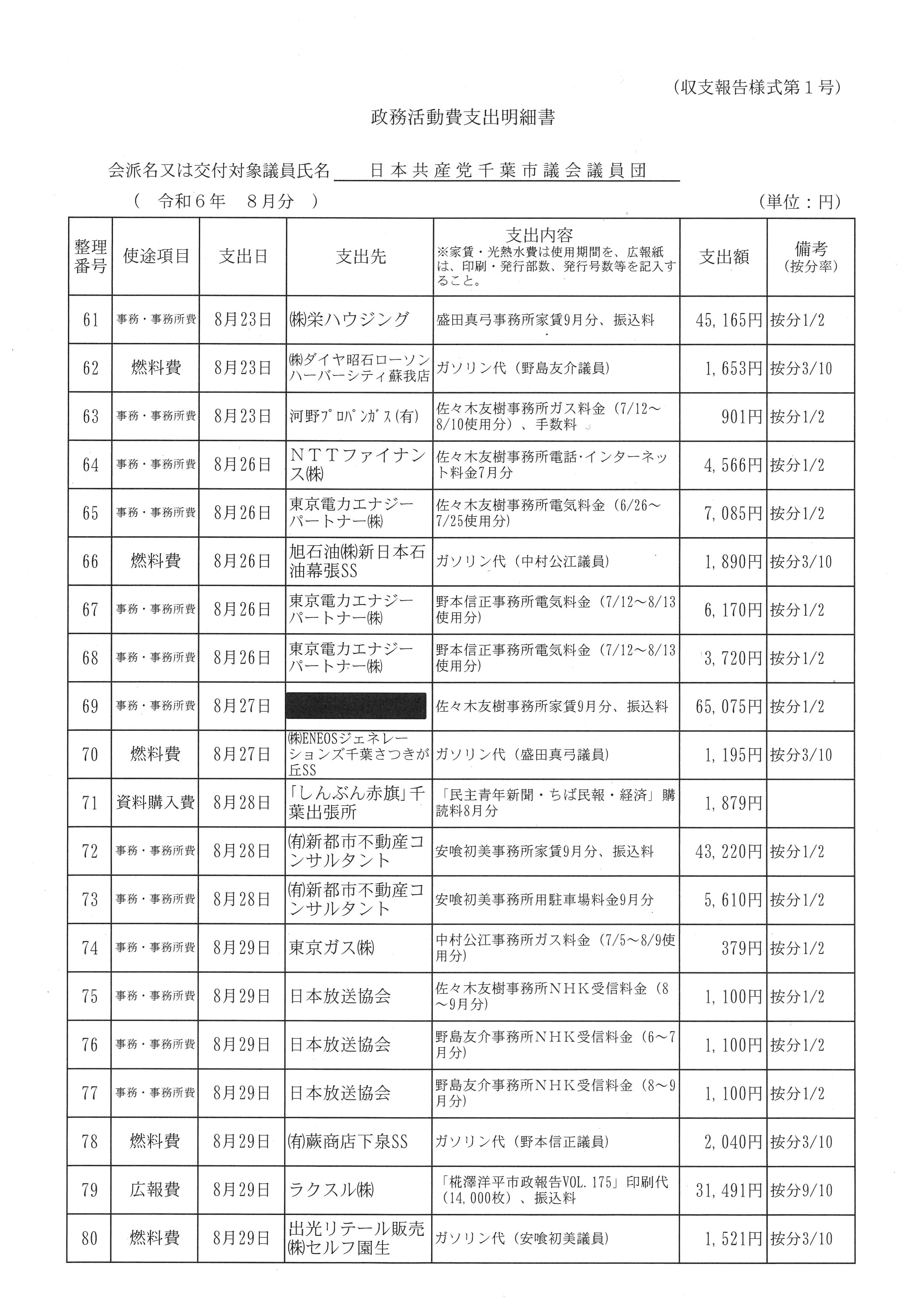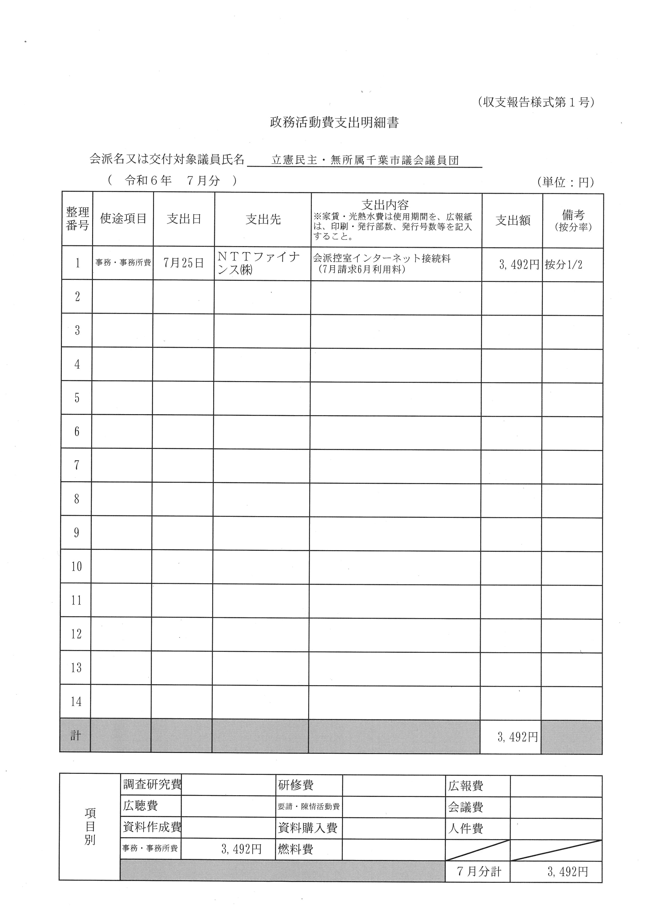 千葉市議会トップページ > 広報・情報公開 > 政務活動費 > 令和6年度交付分(政務活動費収支報告書)