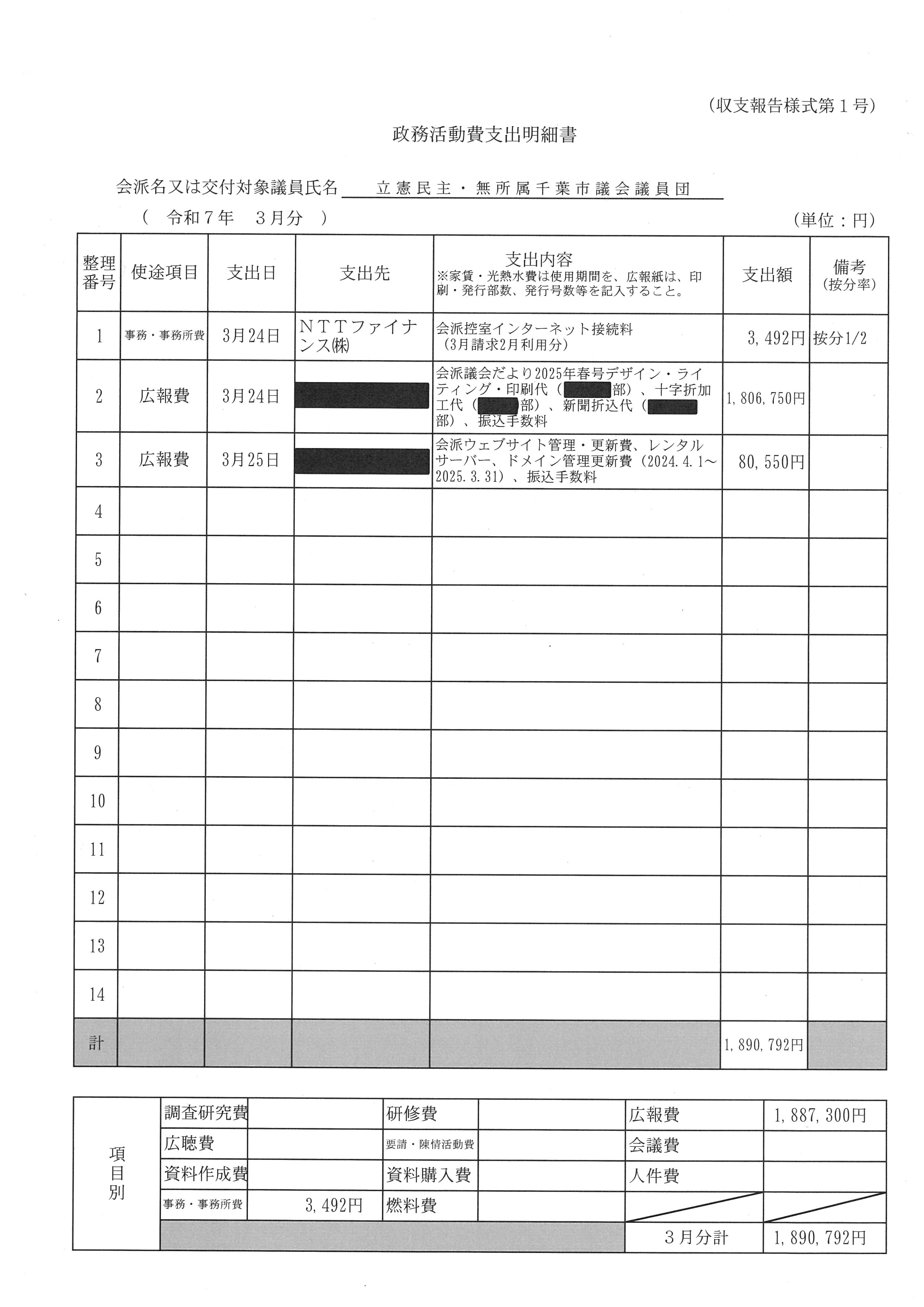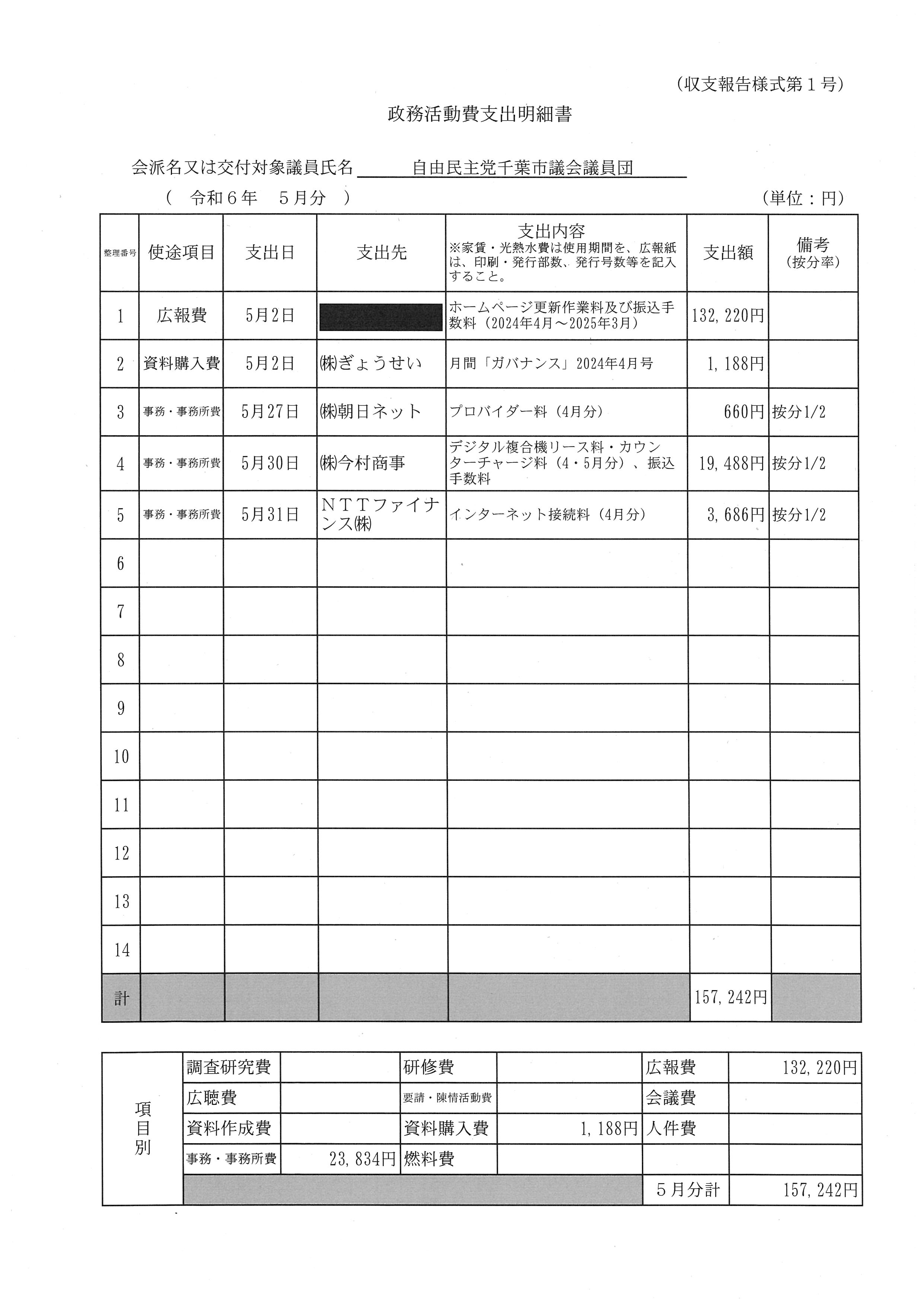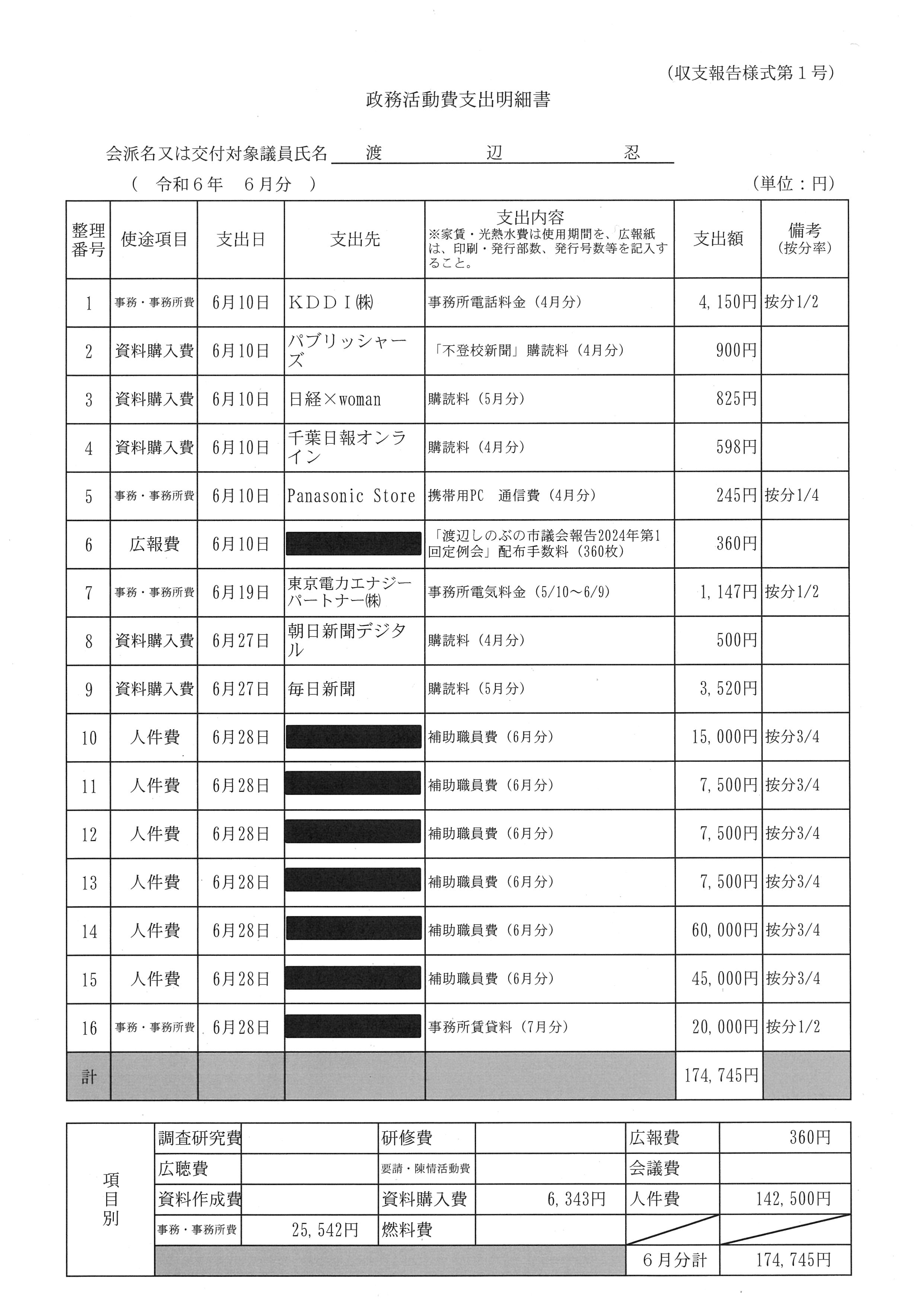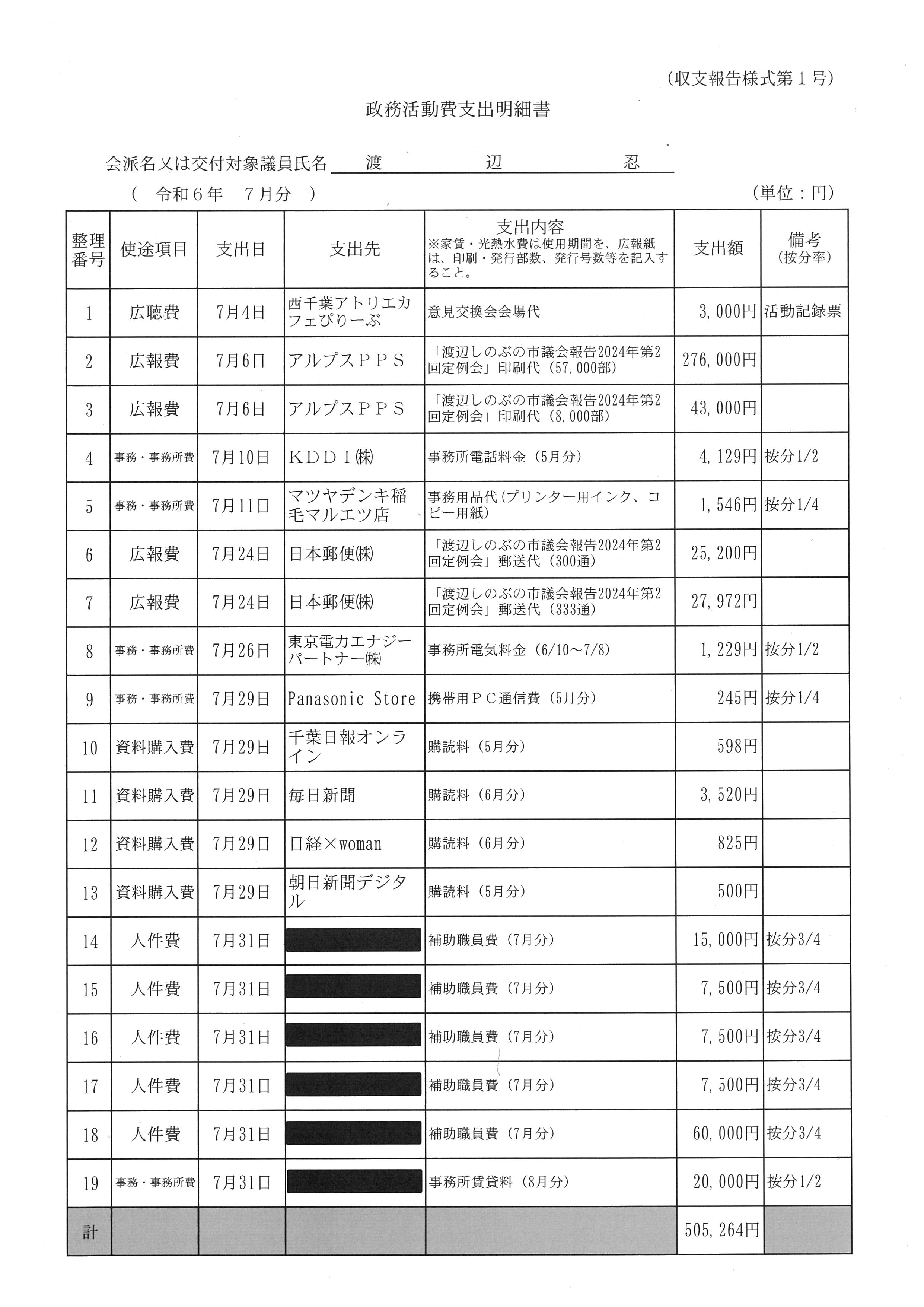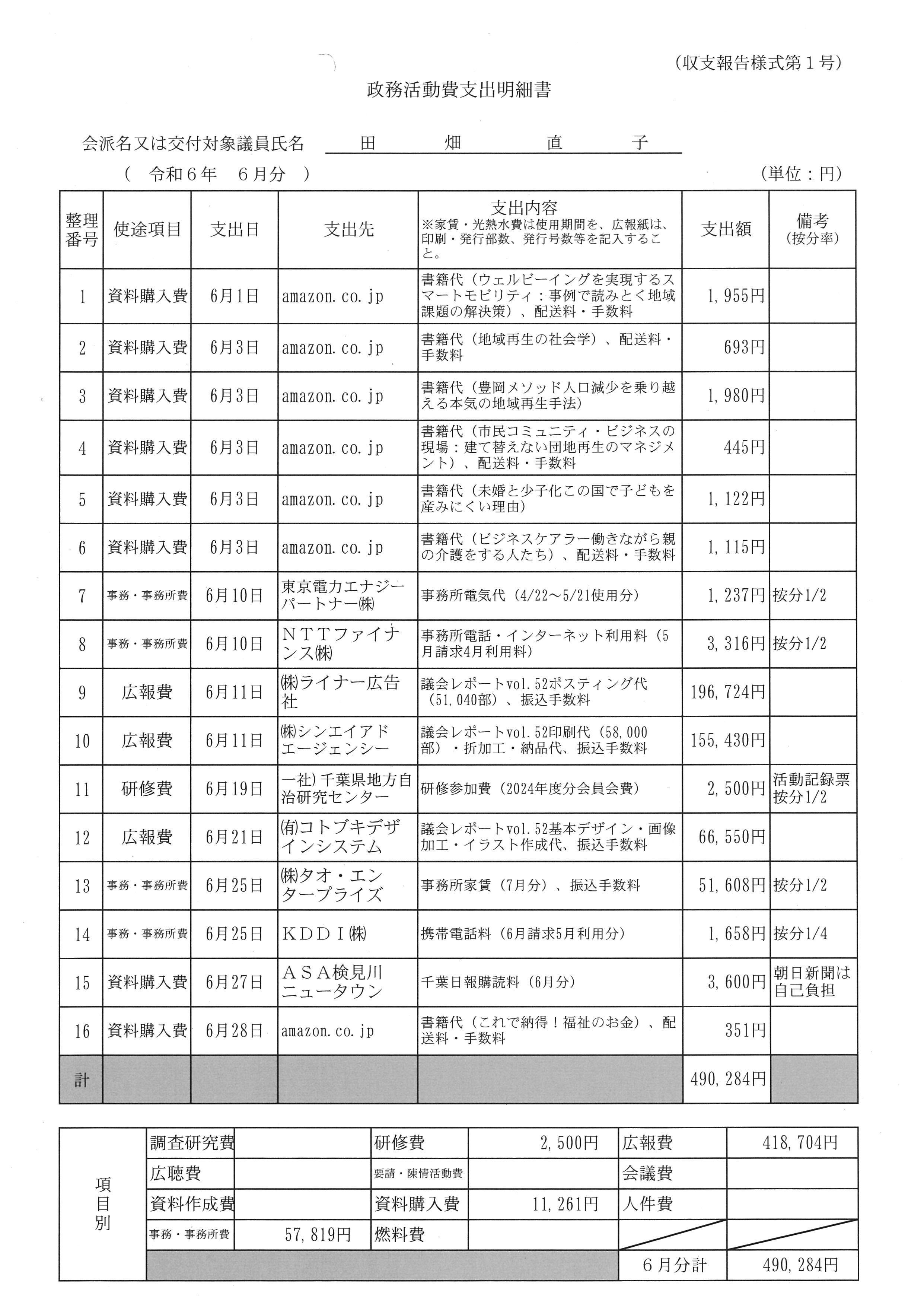千葉市議会トップページ > 広報・情報公開 > 政務活動費 > 令和6年度交付分(政務活動費収支報告書)