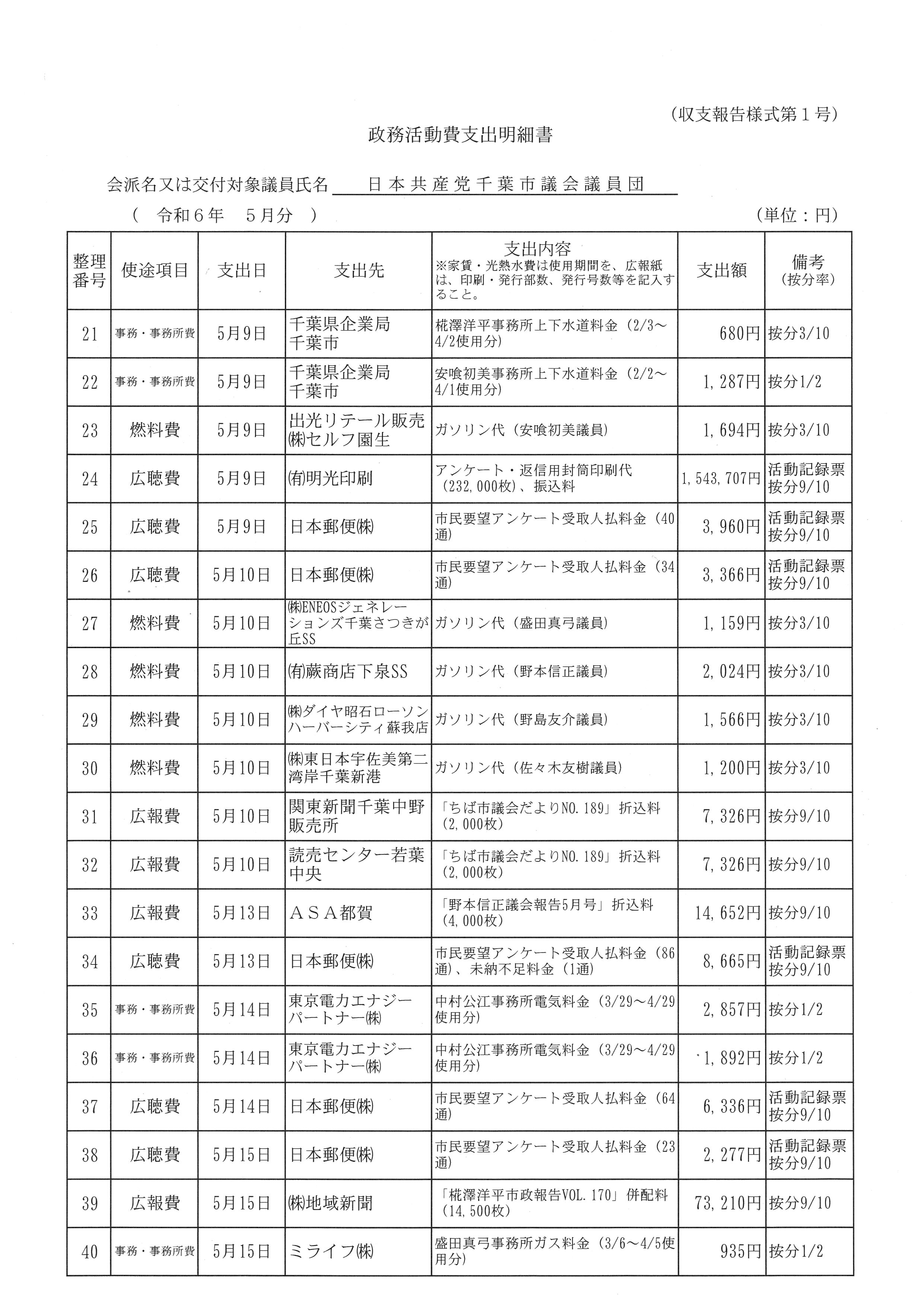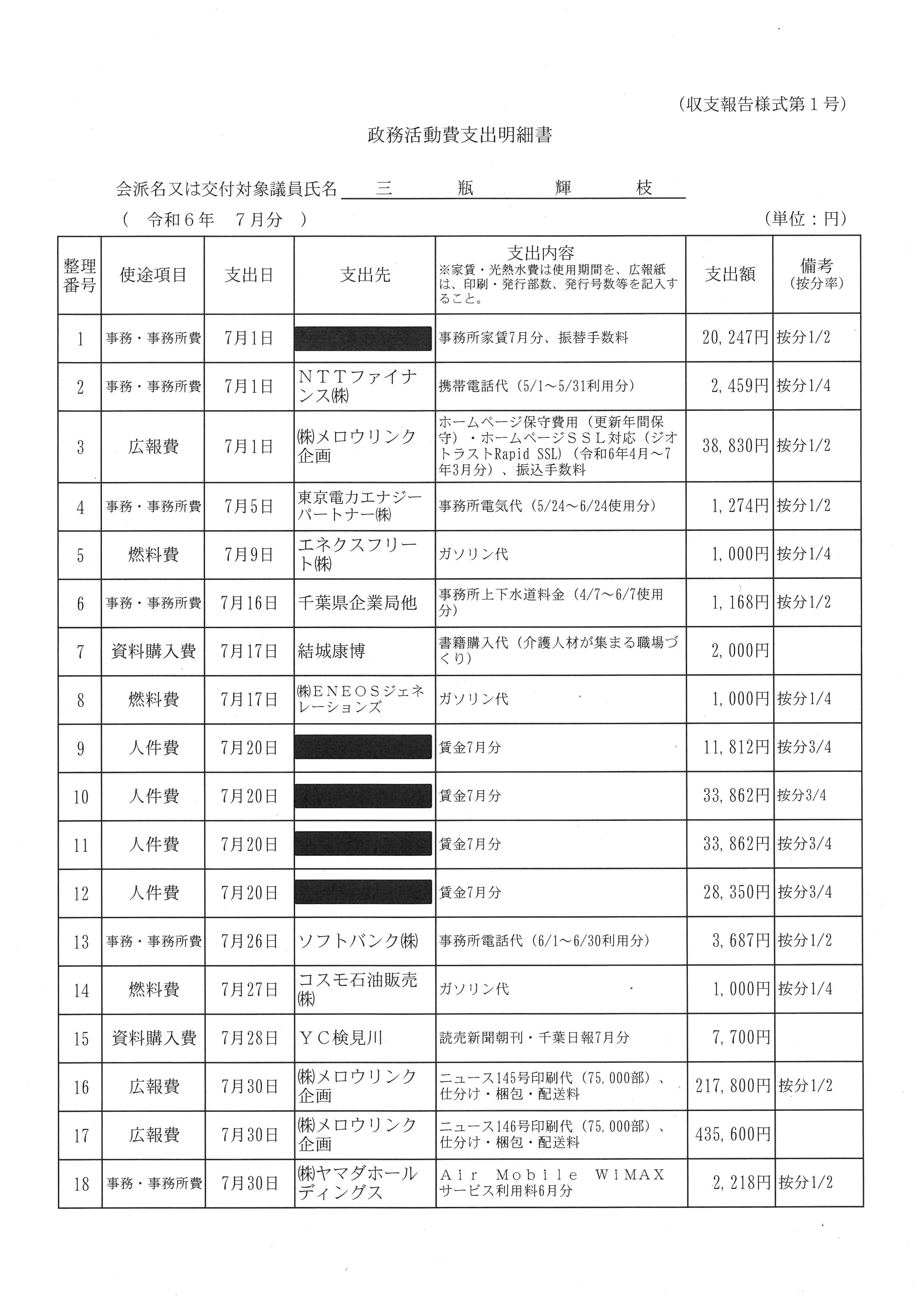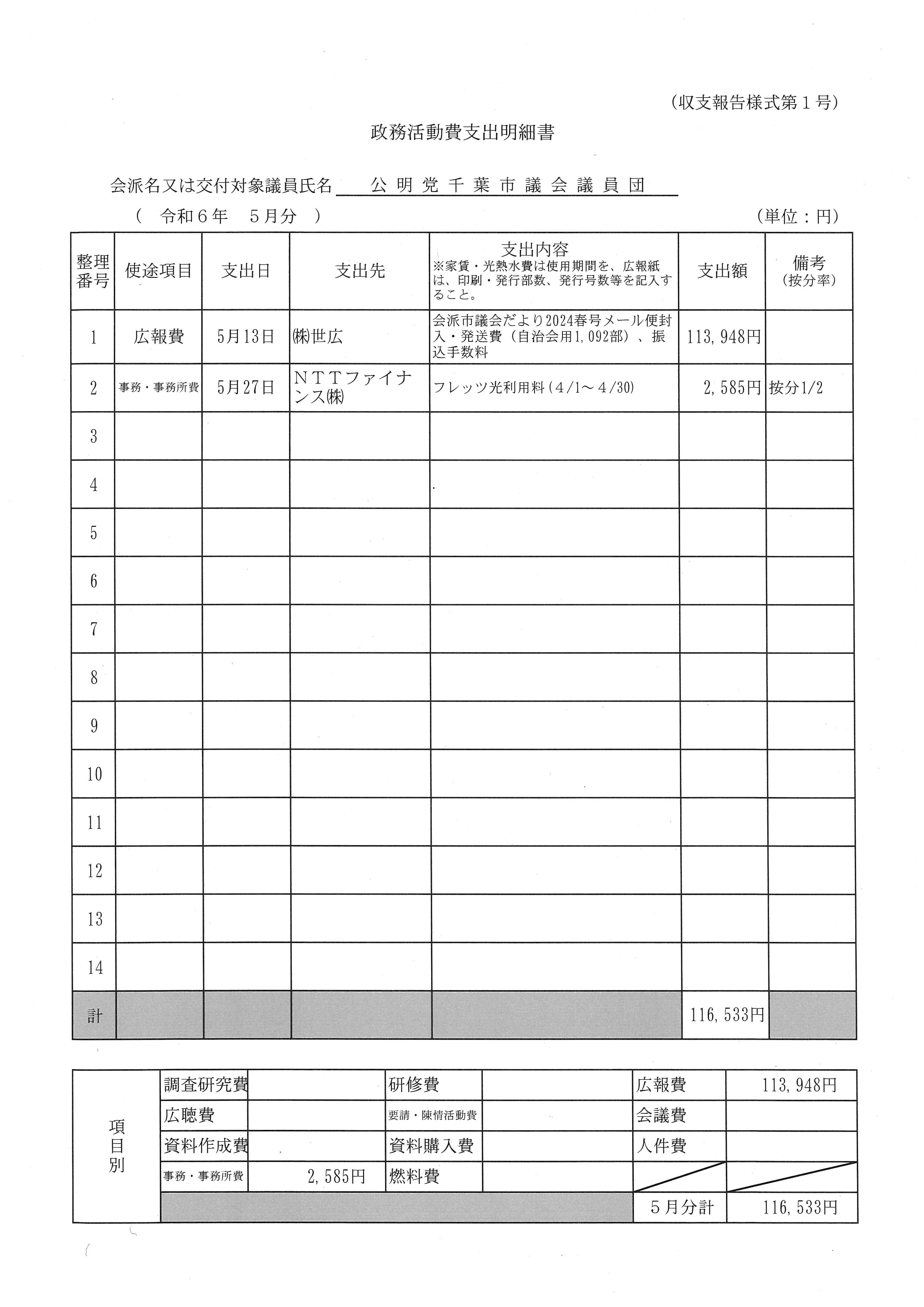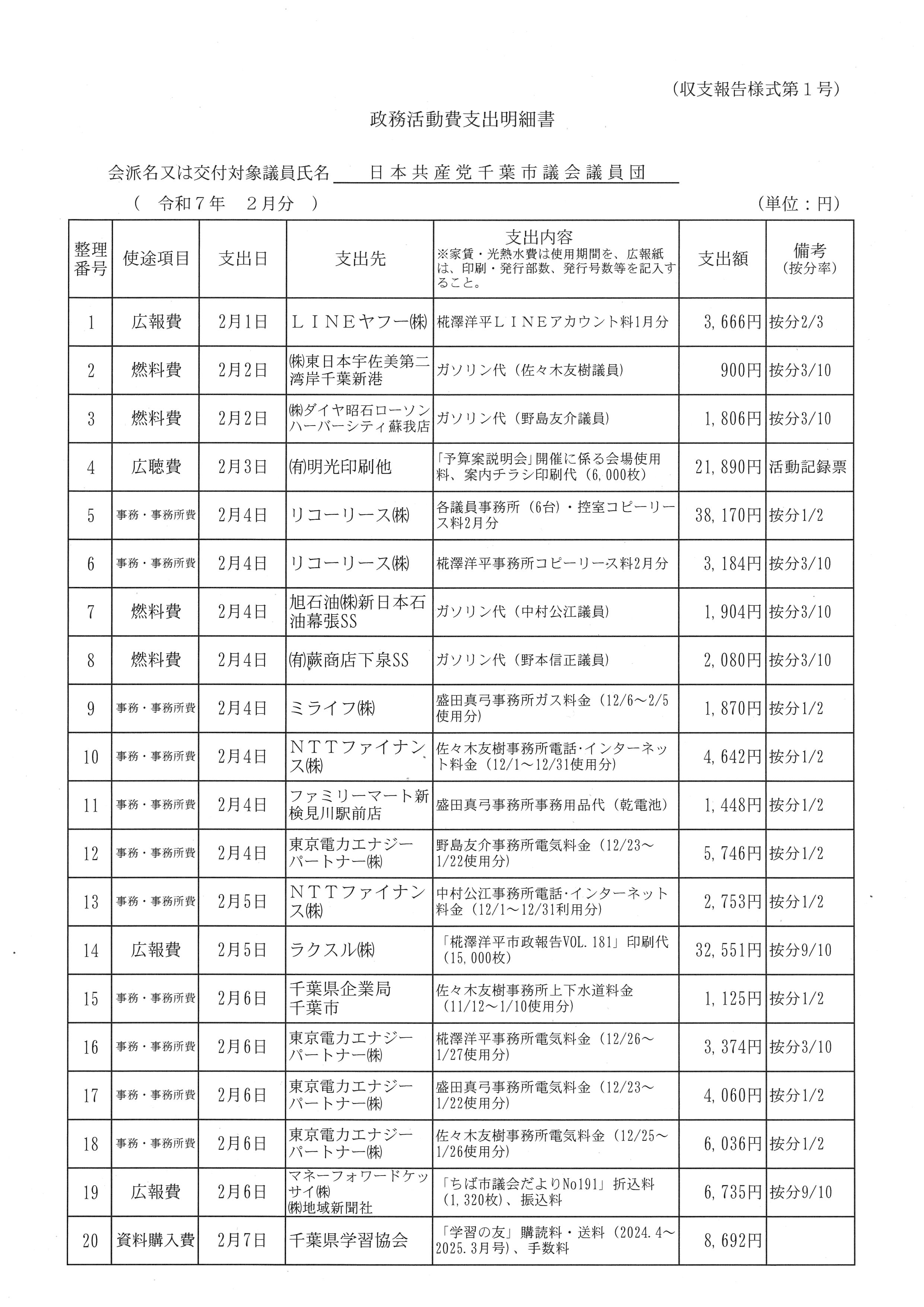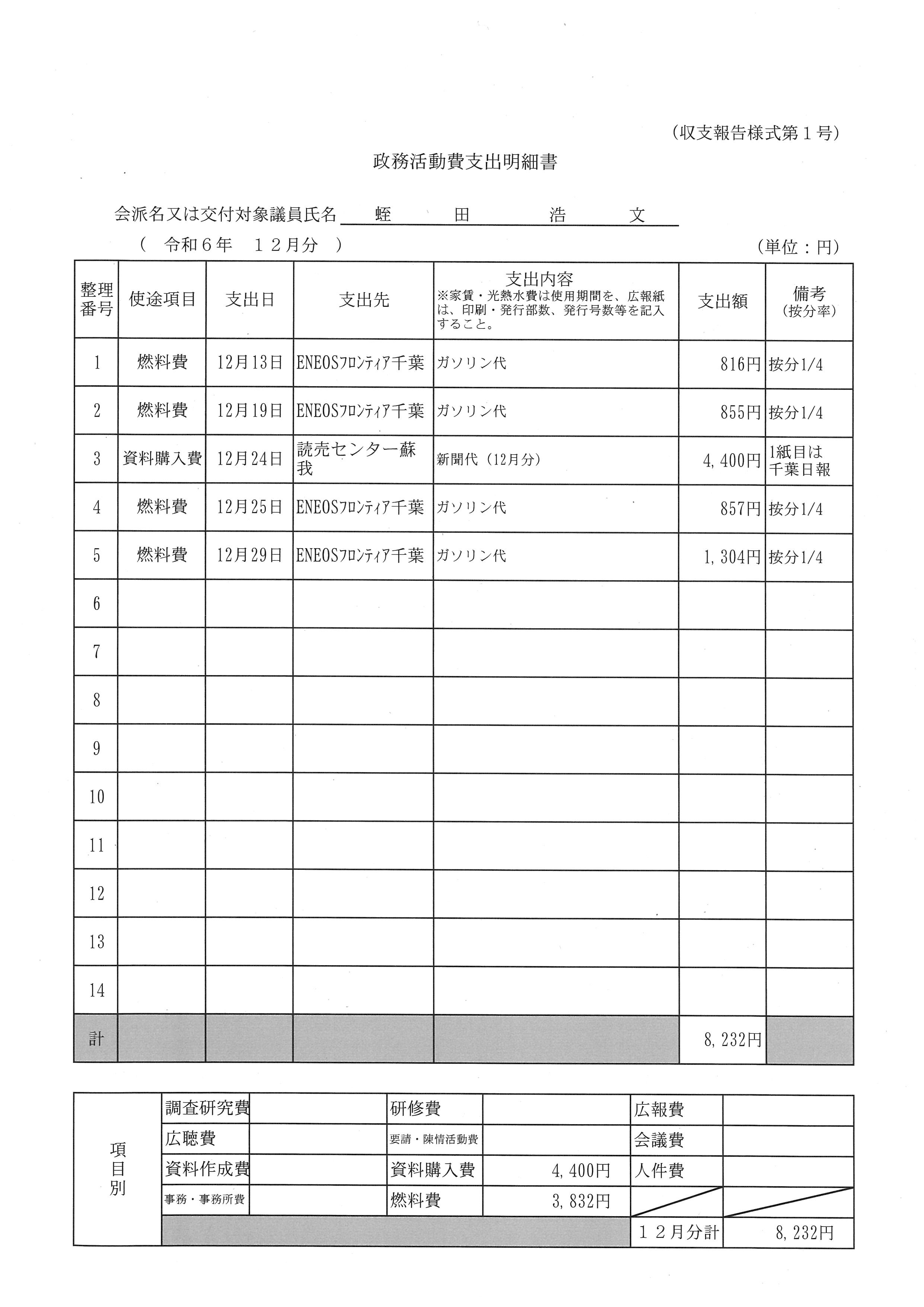 千葉市議会トップページ > 広報・情報公開 > 政務活動費 > 令和6年度交付分(政務活動費収支報告書)