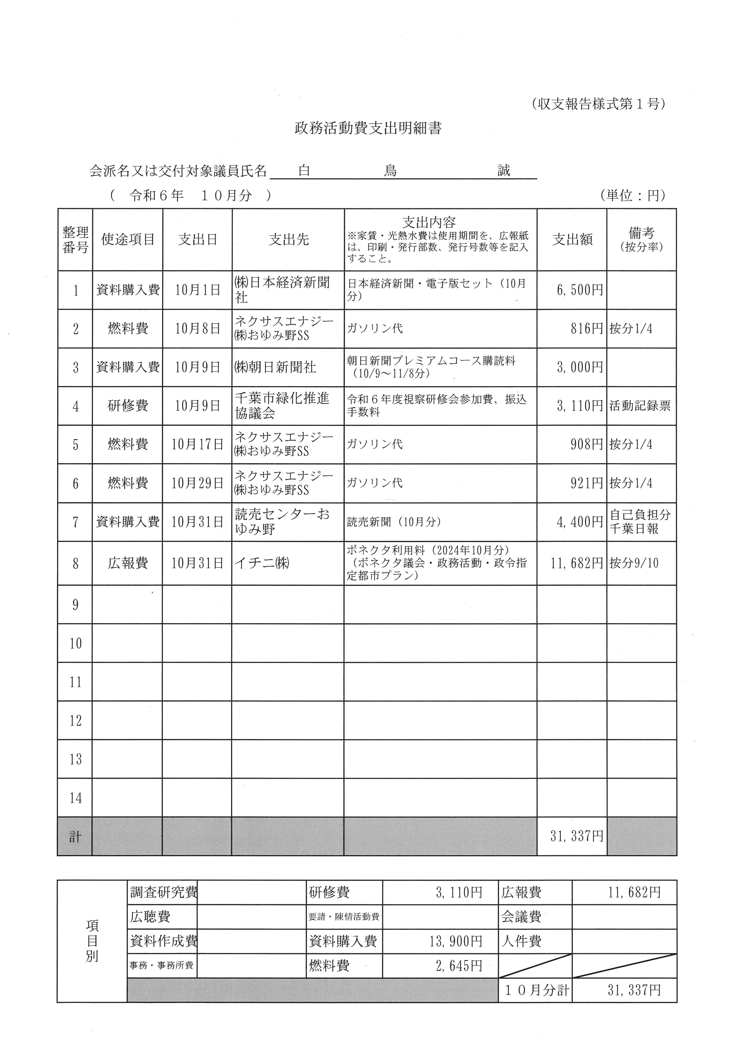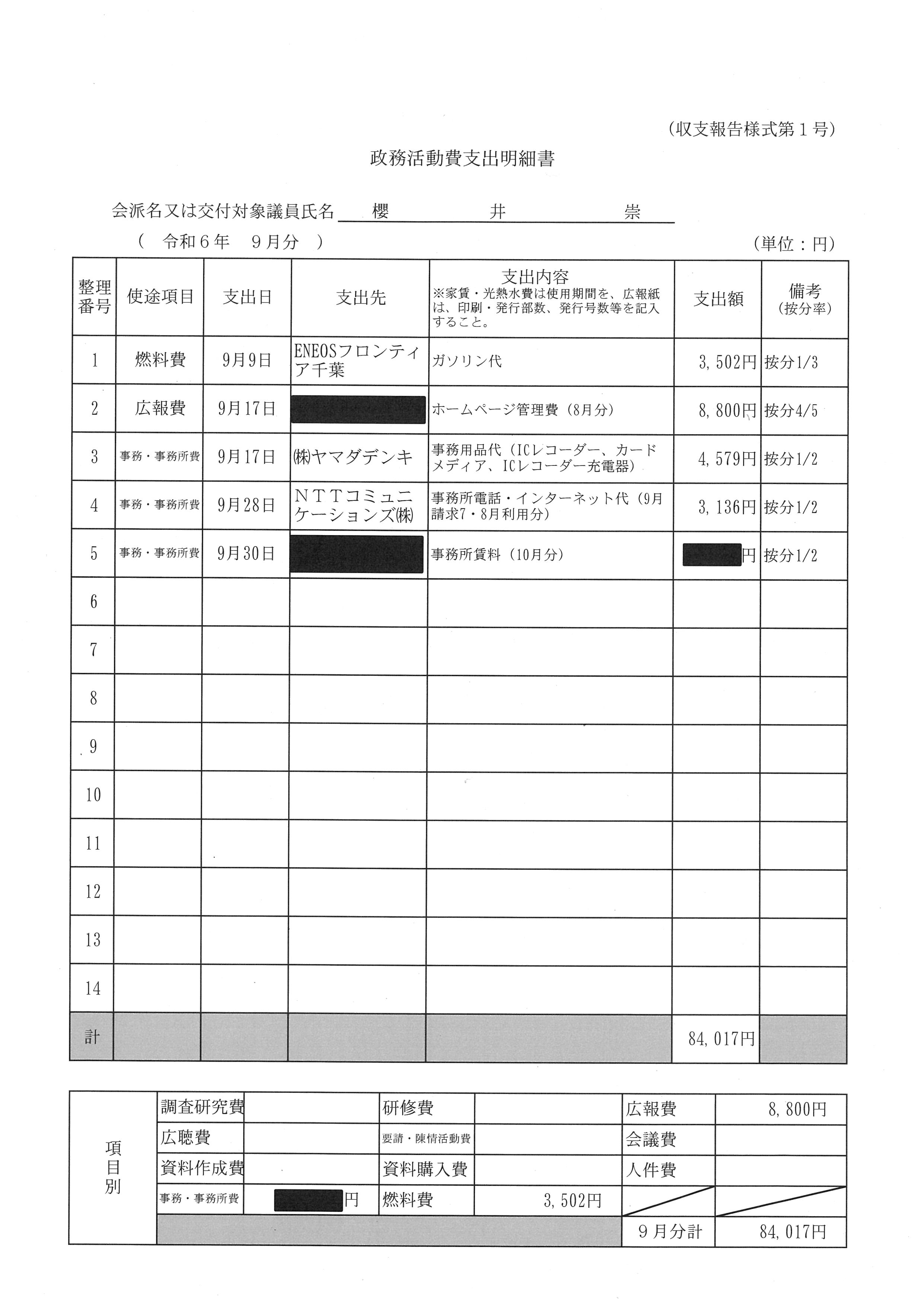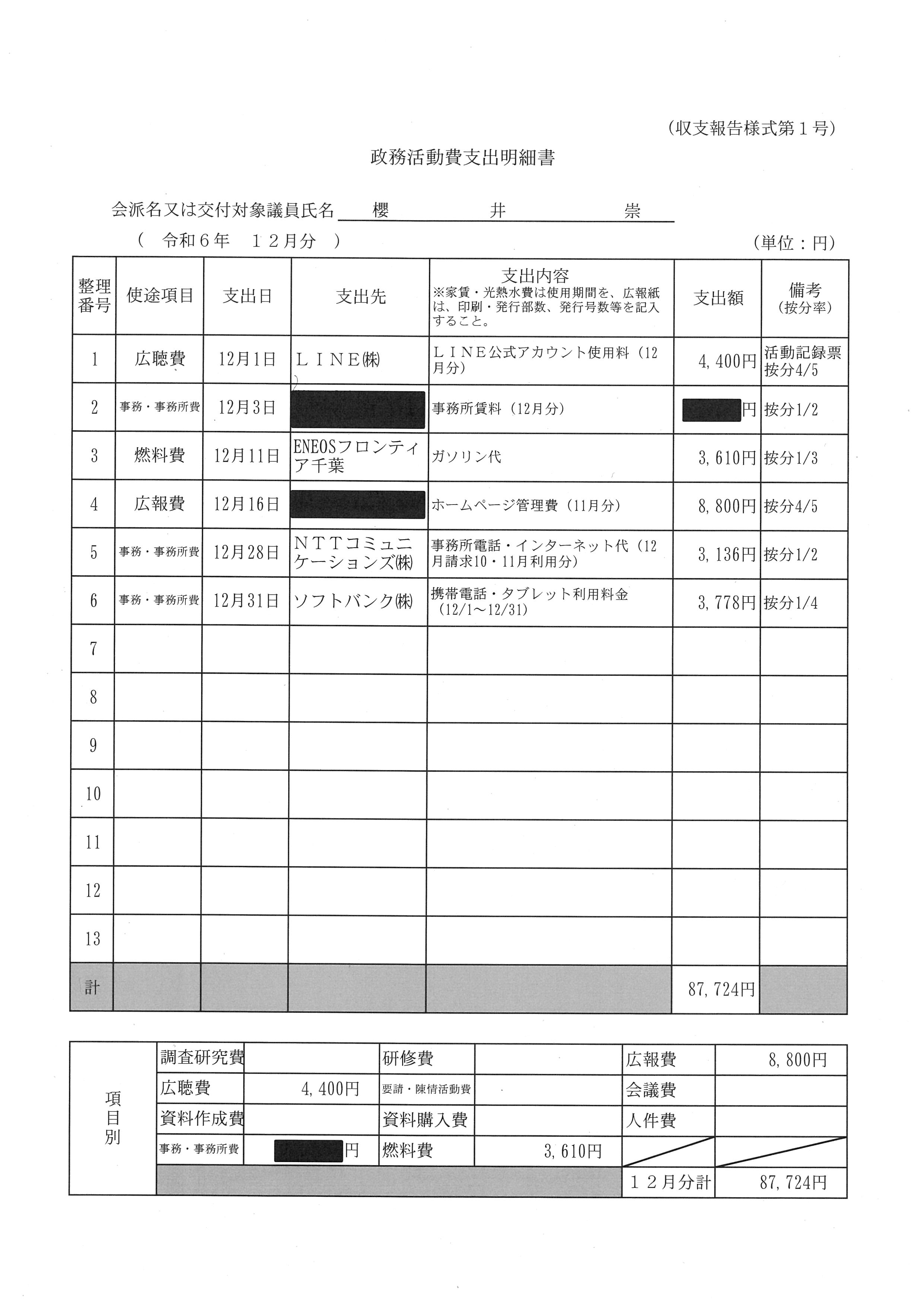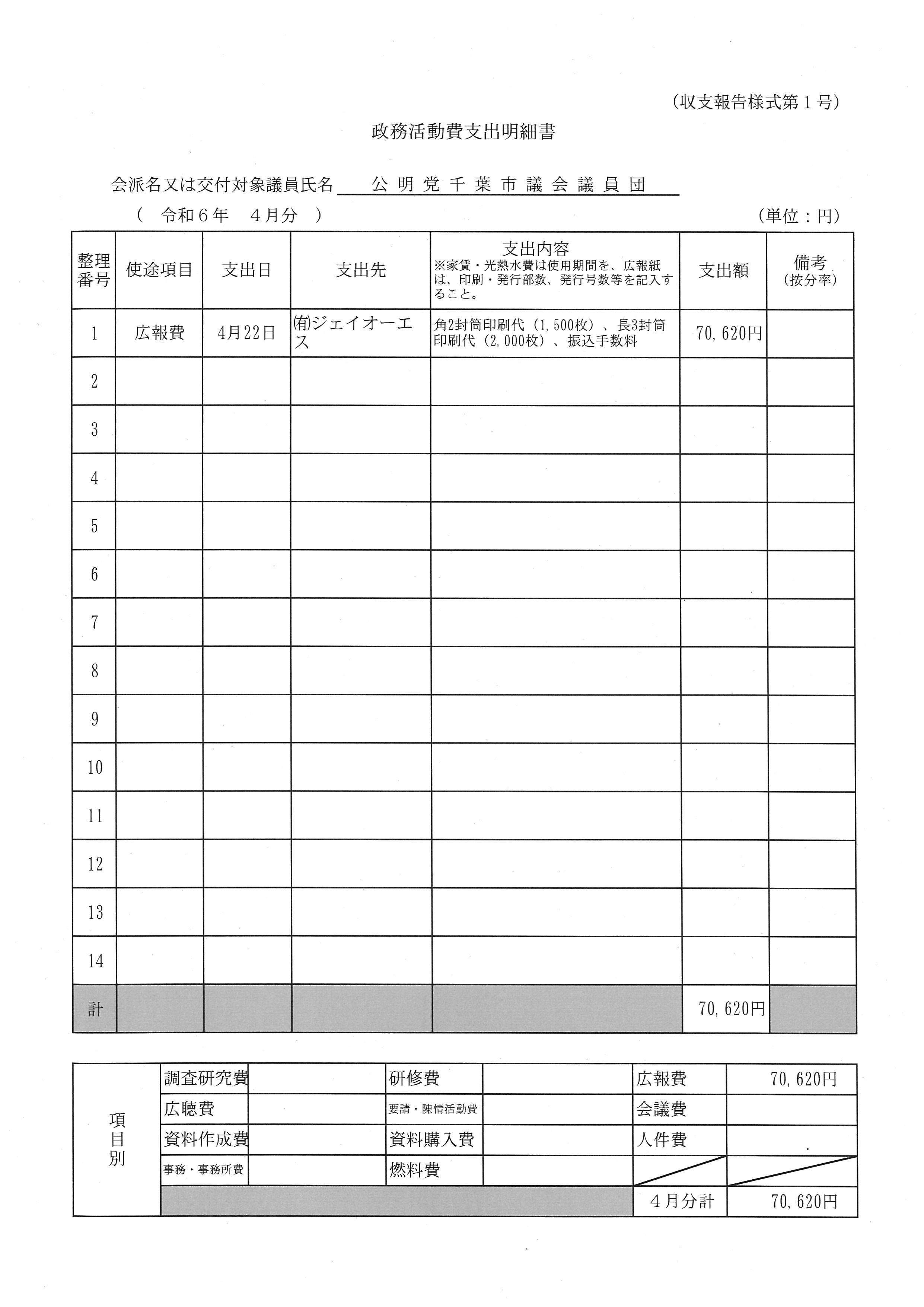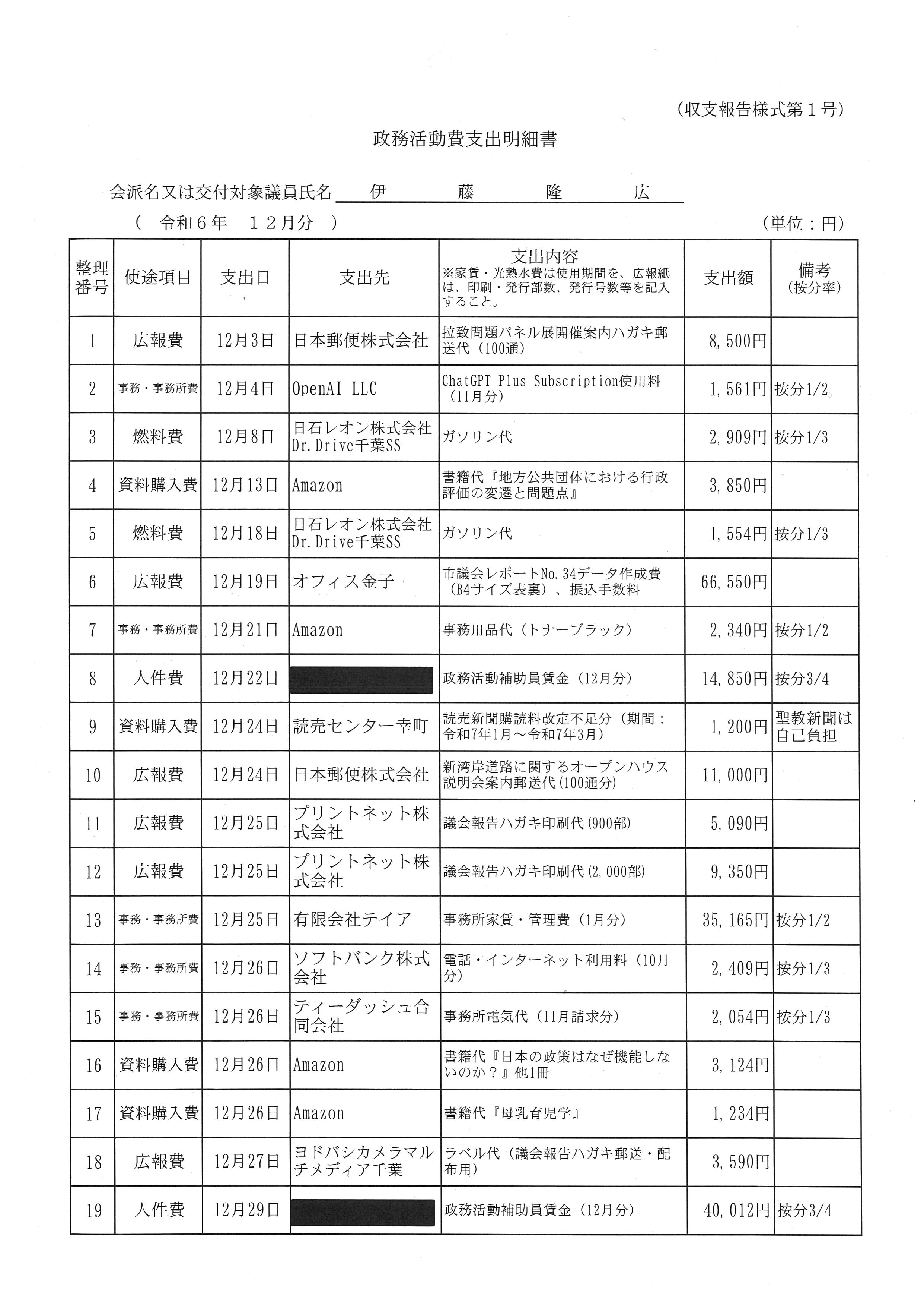 千葉市議会トップページ > 広報・情報公開 > 政務活動費 > 令和6年度交付分(政務活動費収支報告書)