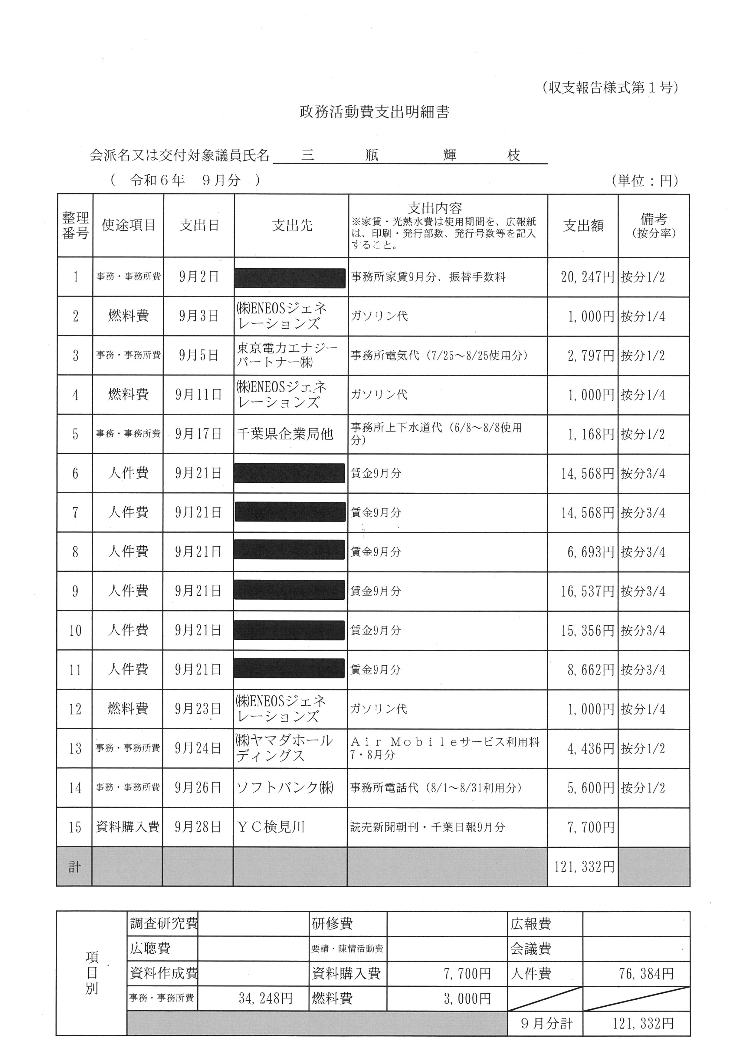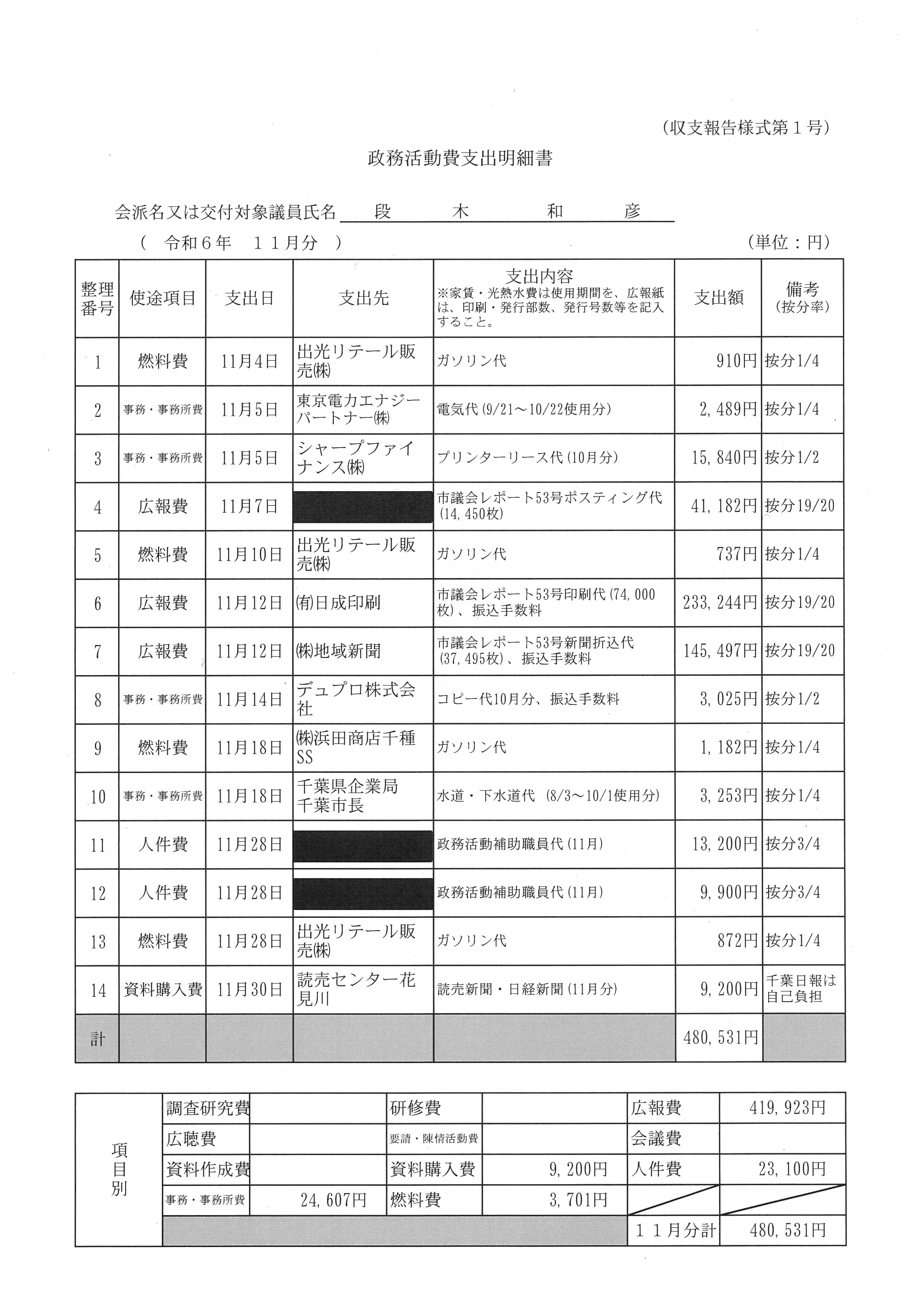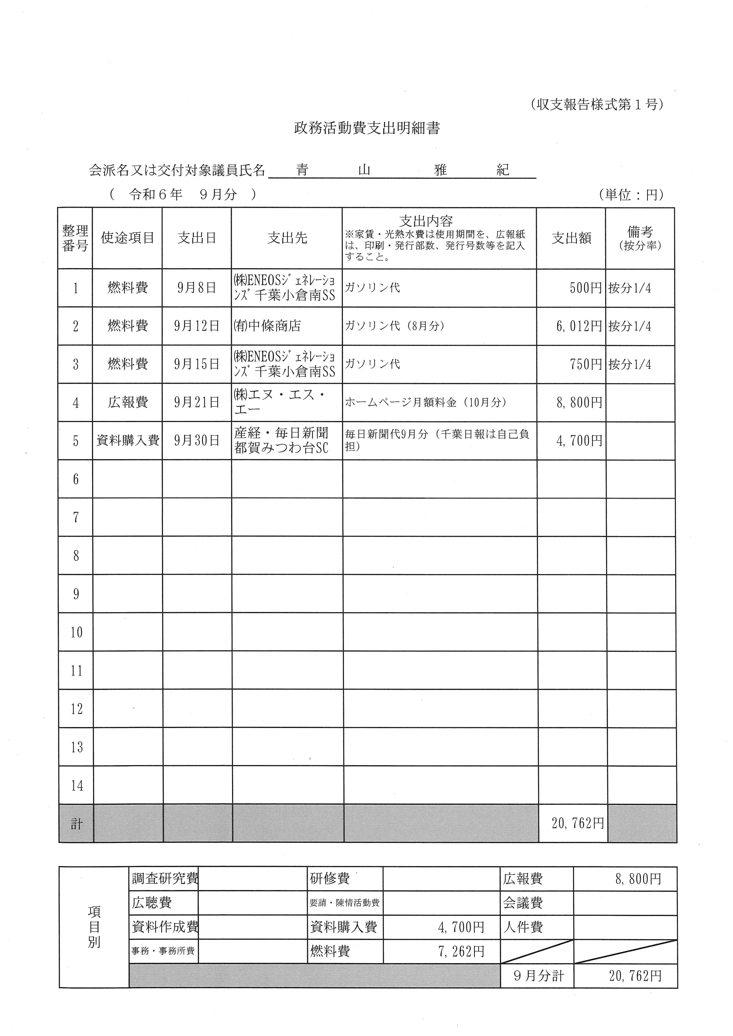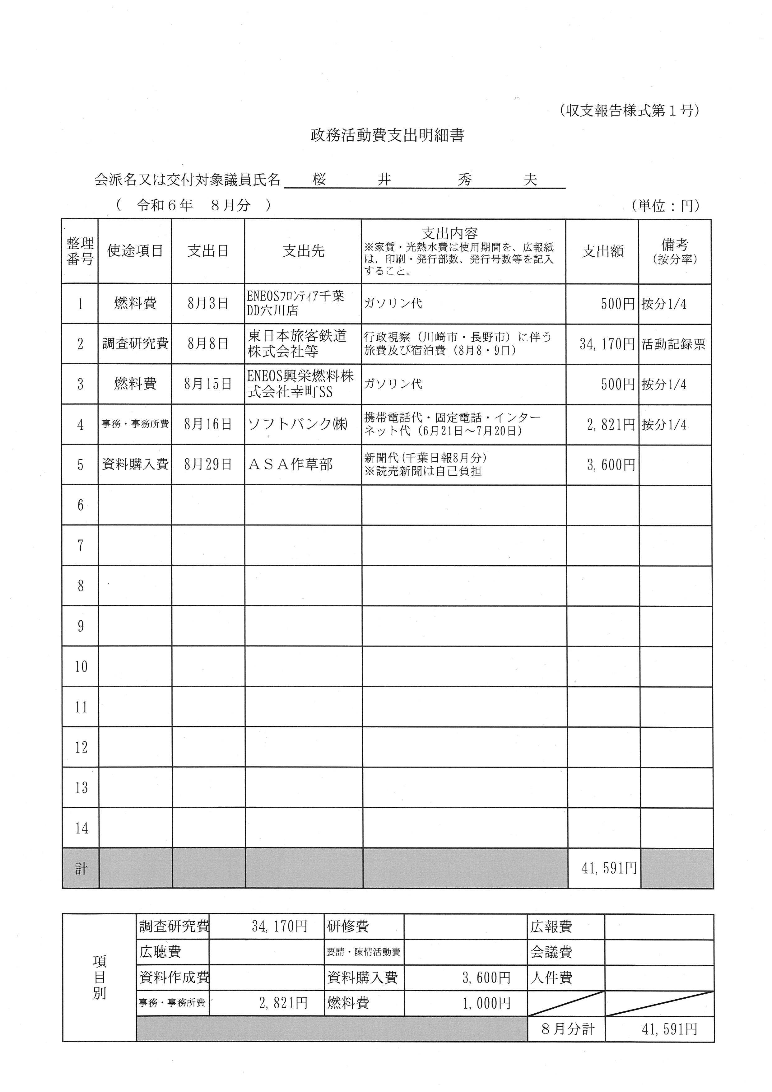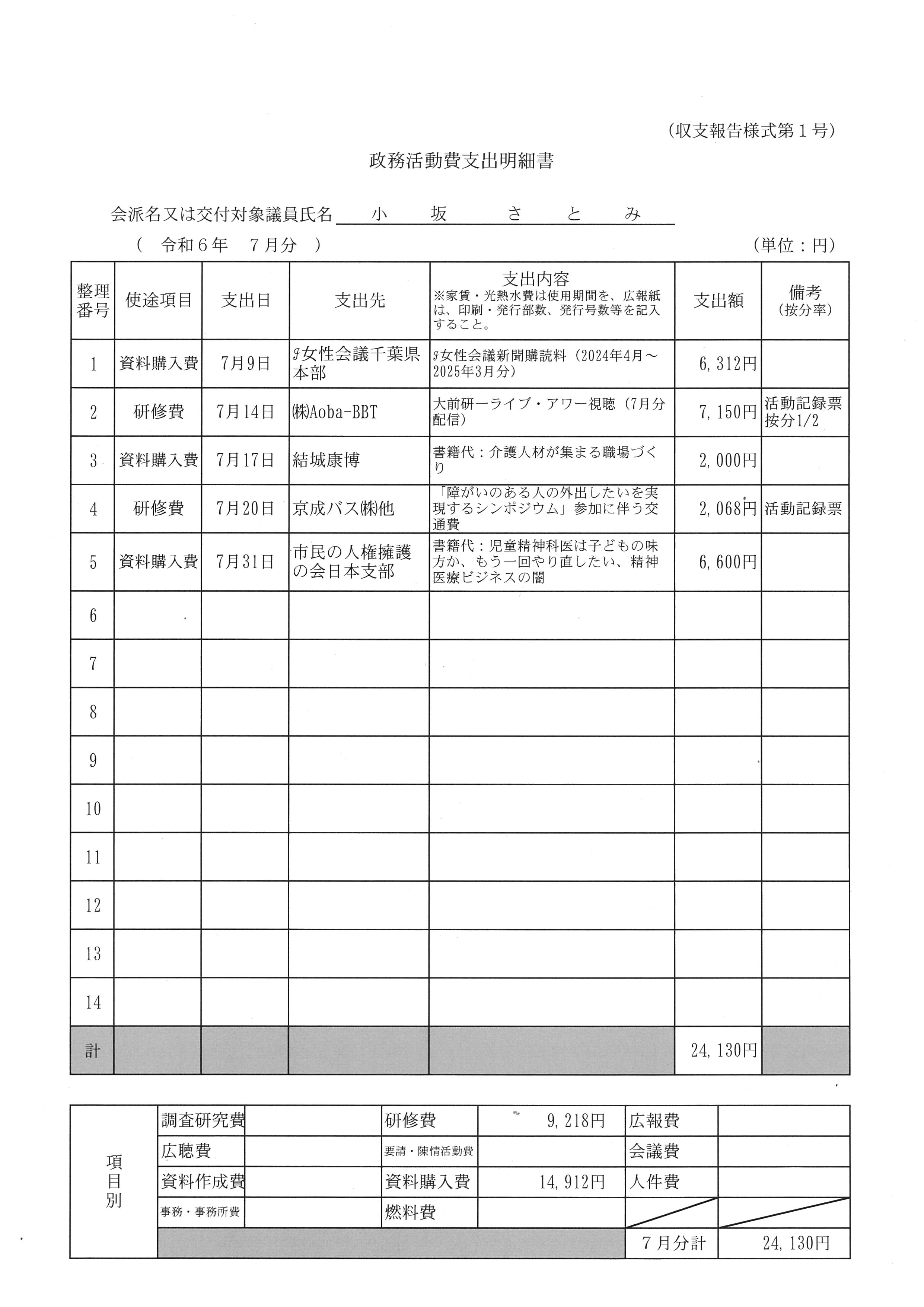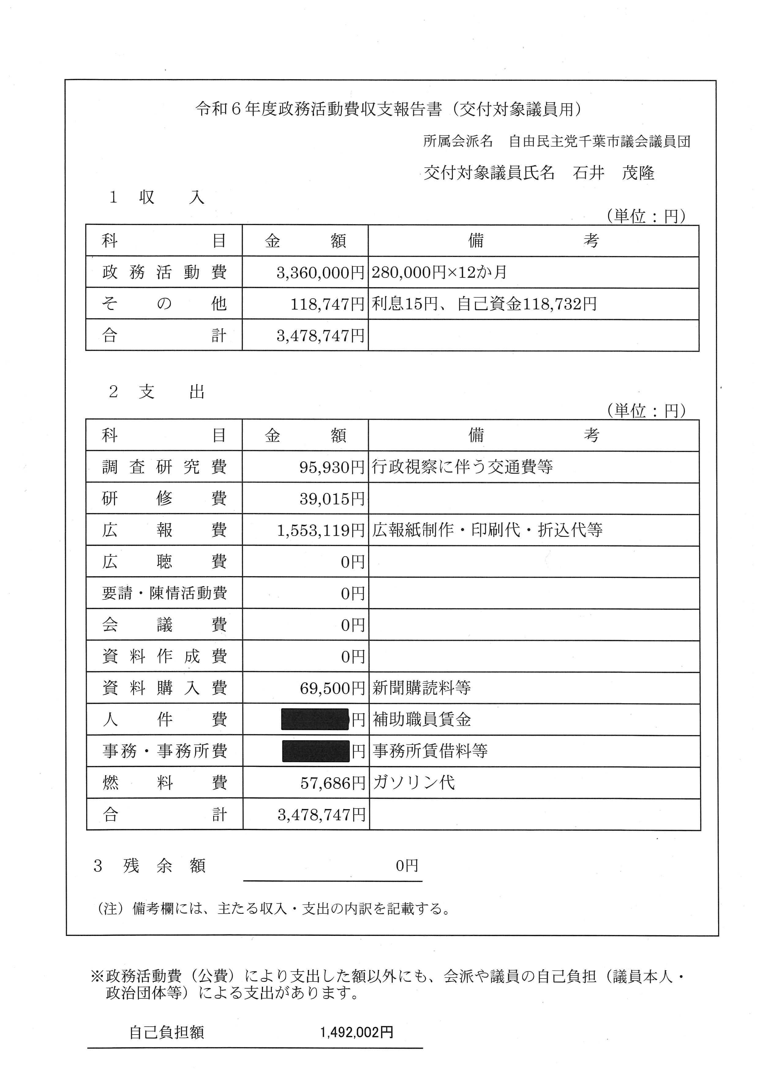 千葉市議会トップページ > 広報・情報公開 > 政務活動費 > 令和6年度交付分(政務活動費収支報告書)