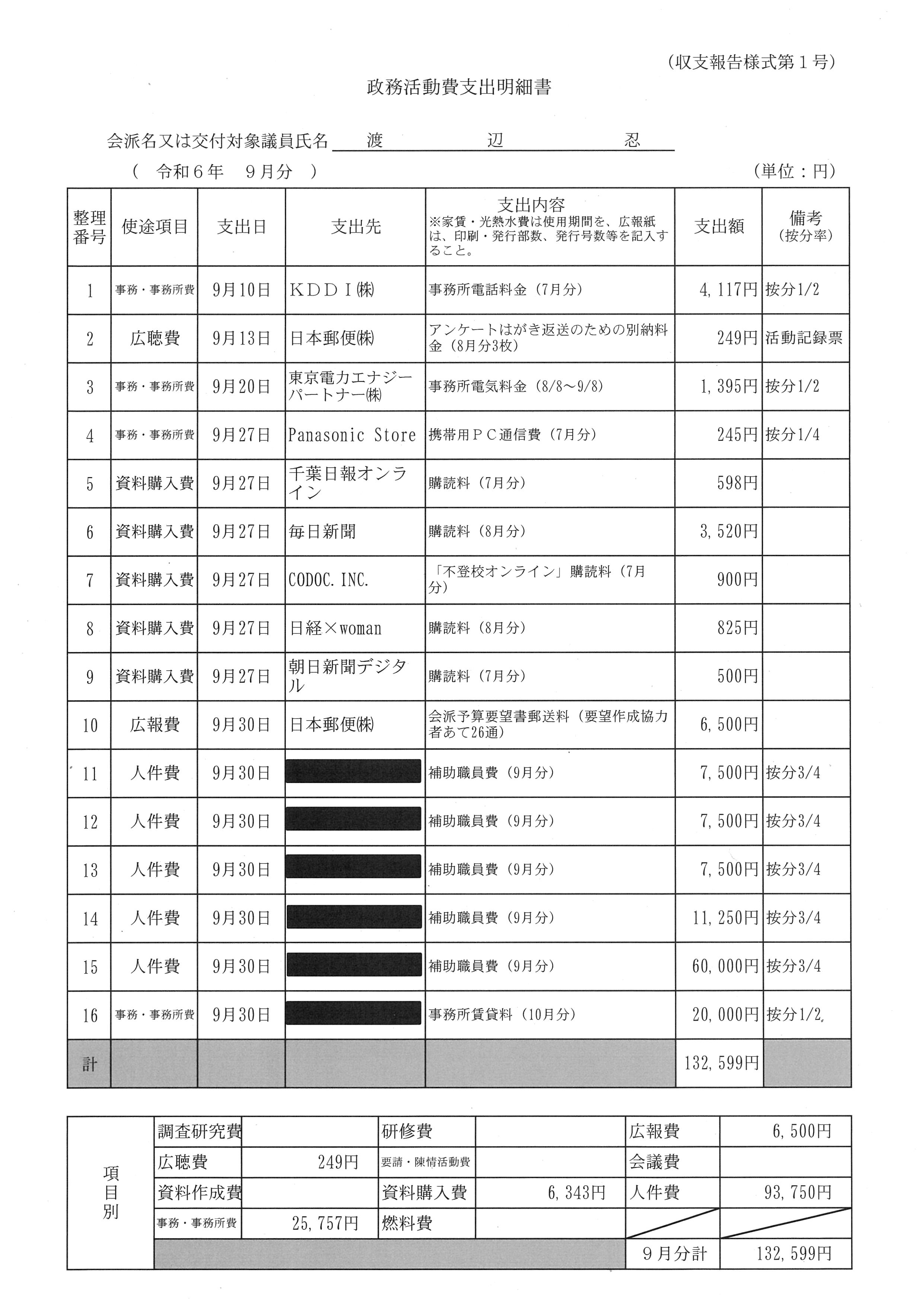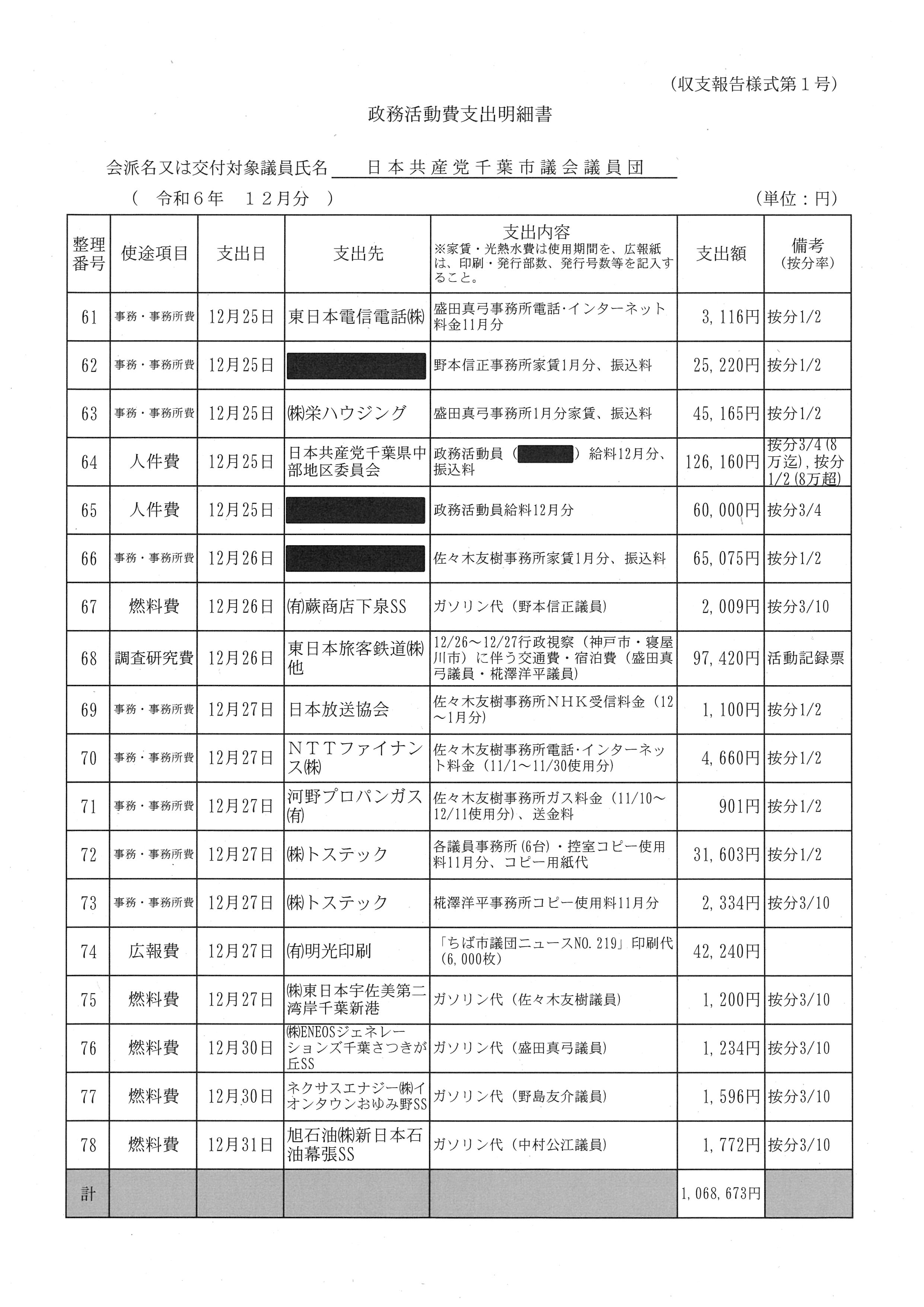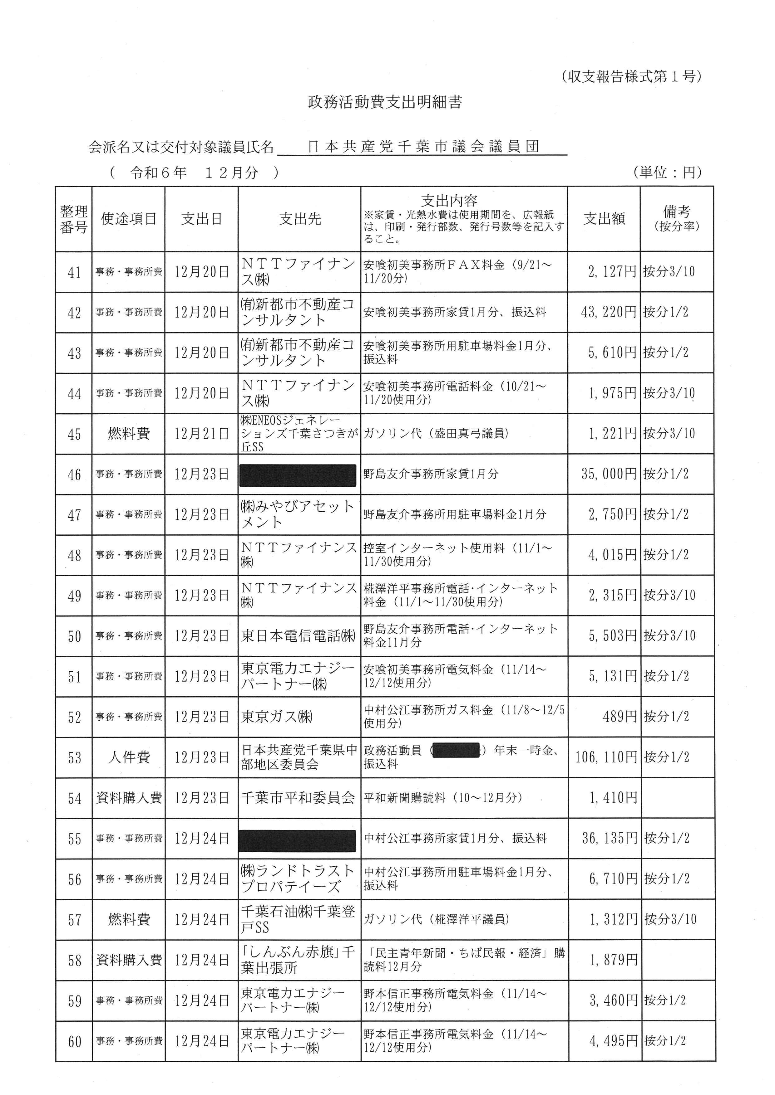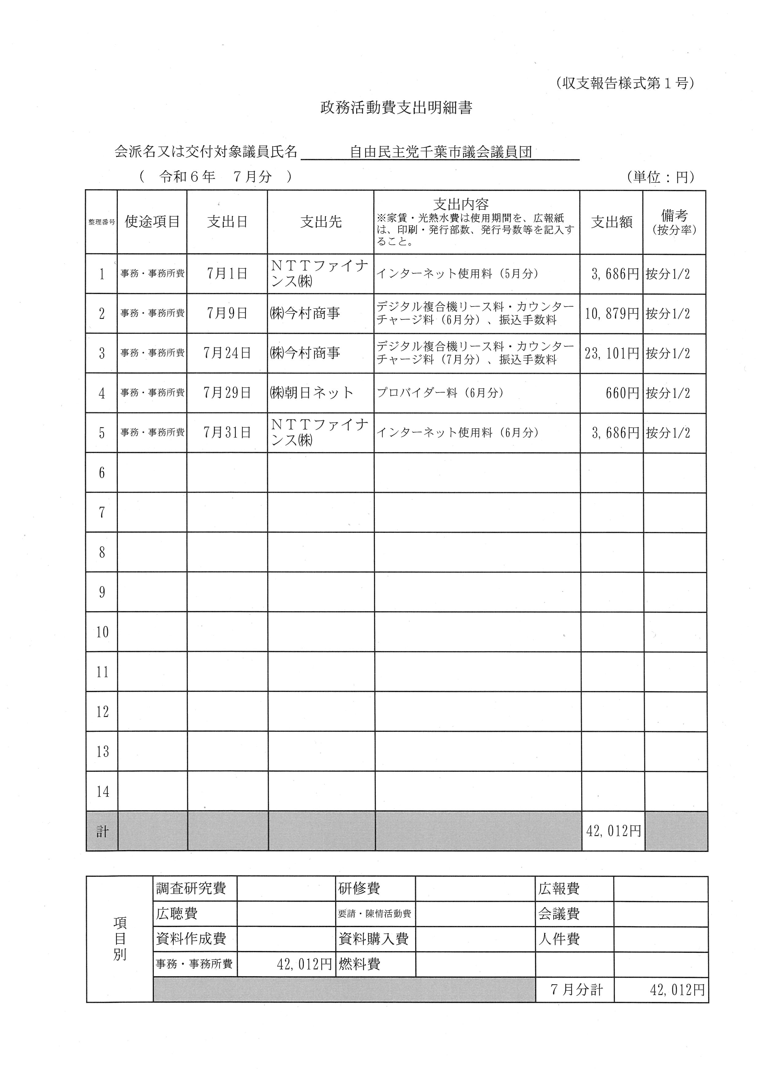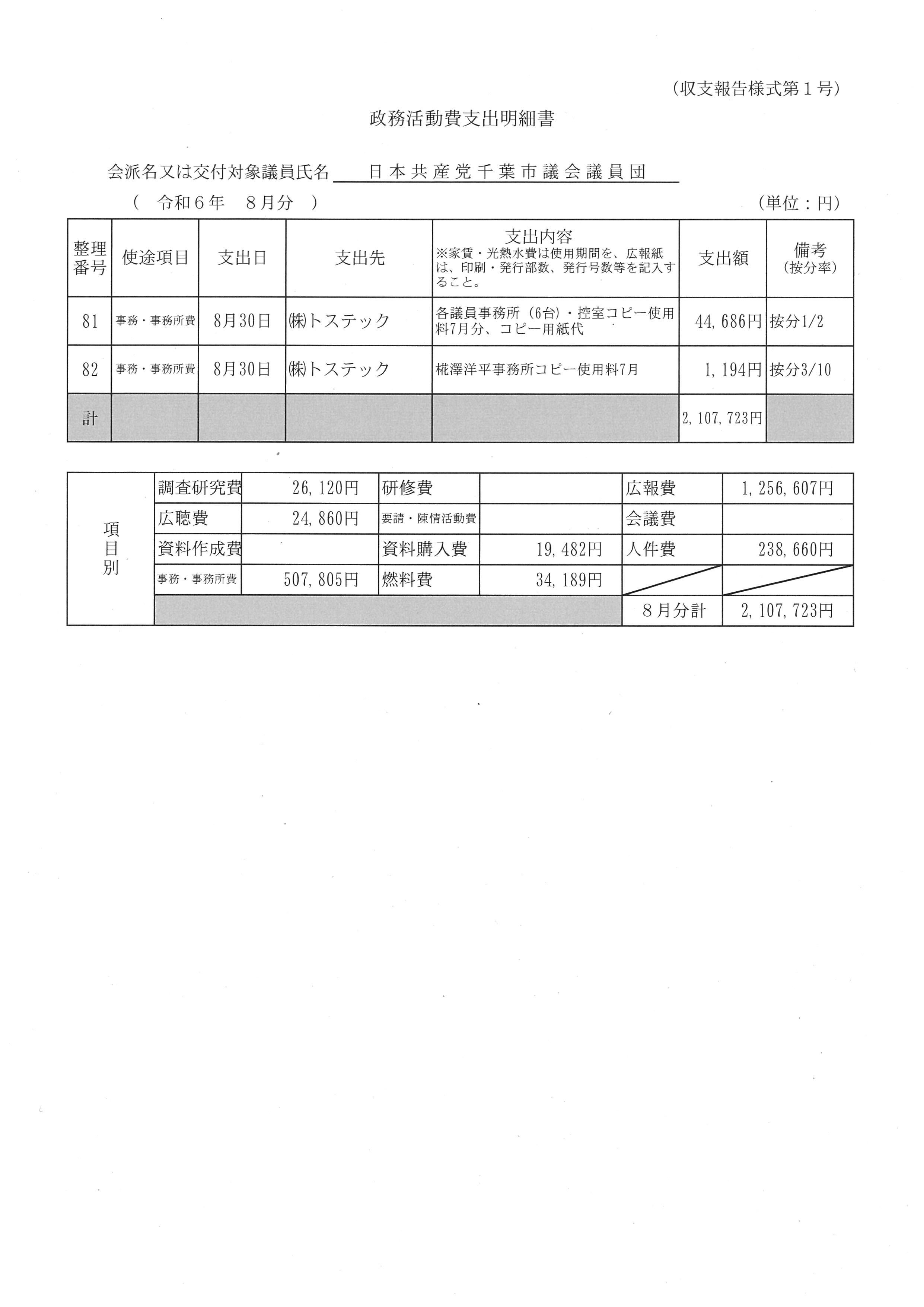 千葉市議会トップページ > 広報・情報公開 > 政務活動費 > 令和6年度交付分(政務活動費収支報告書)