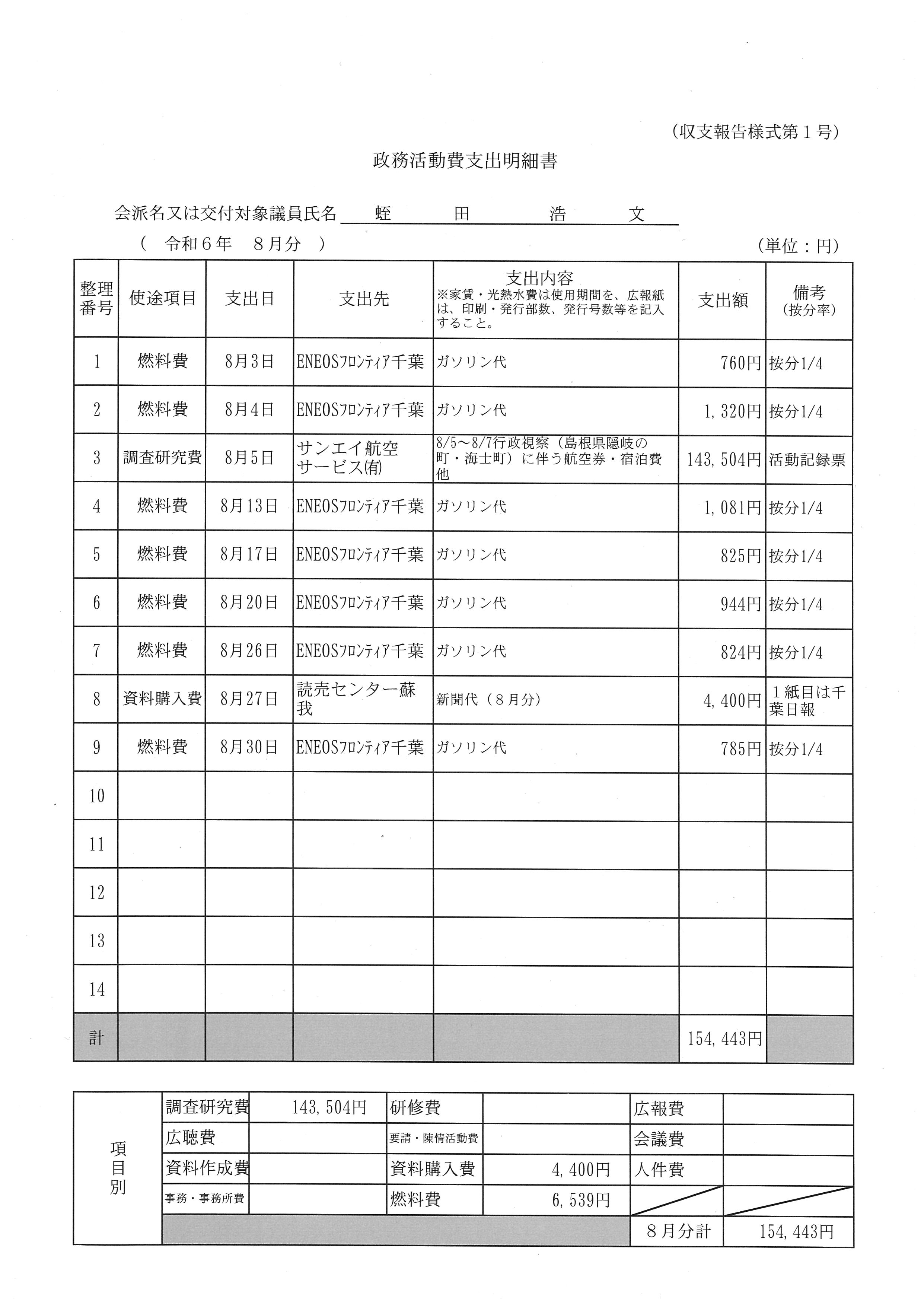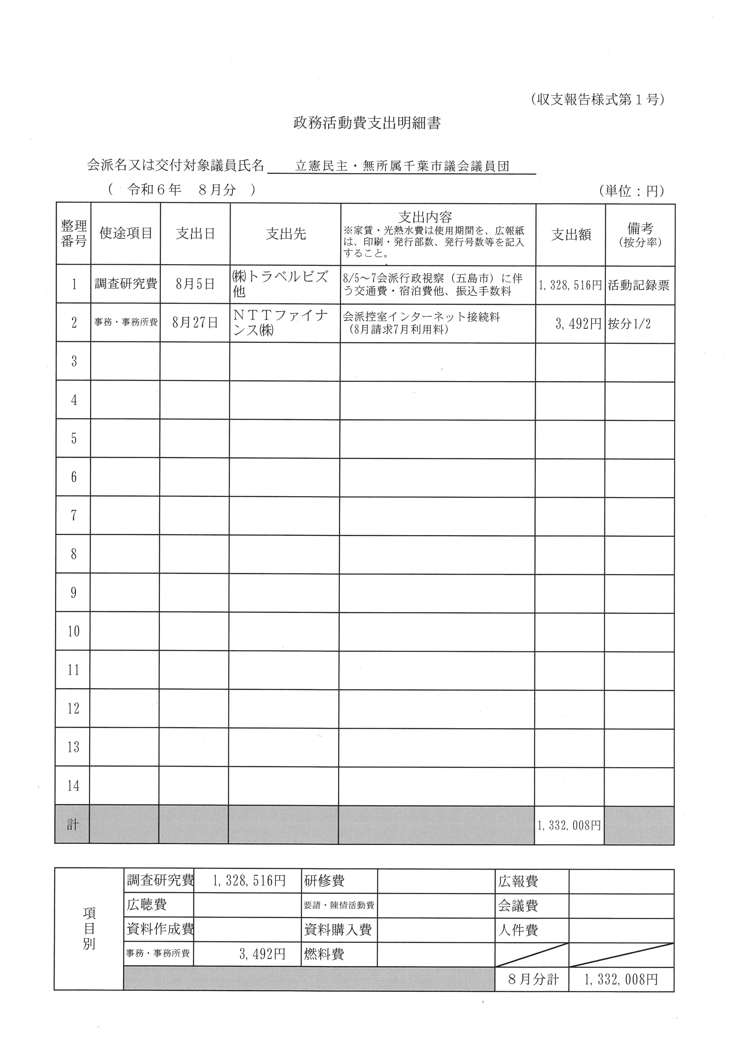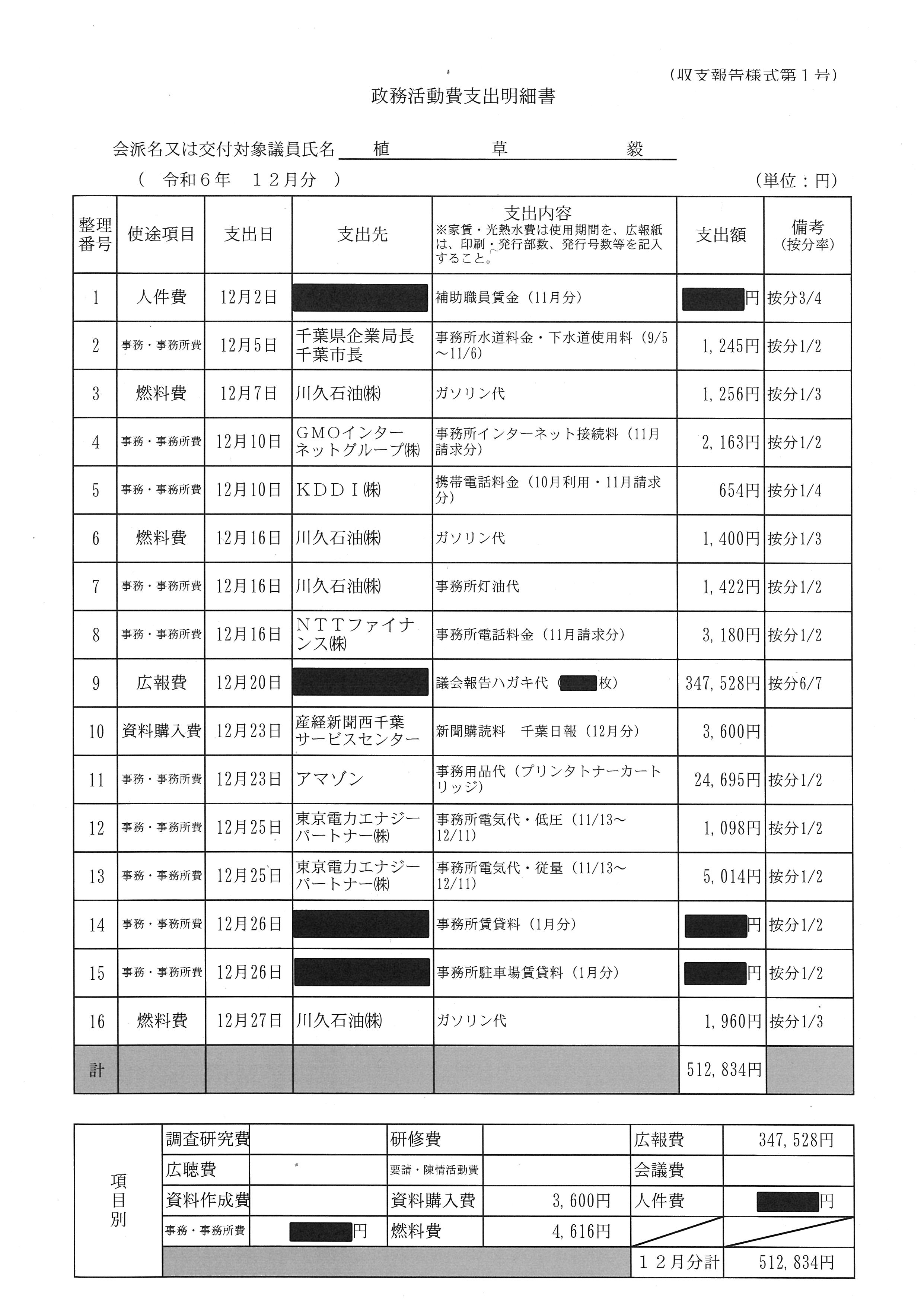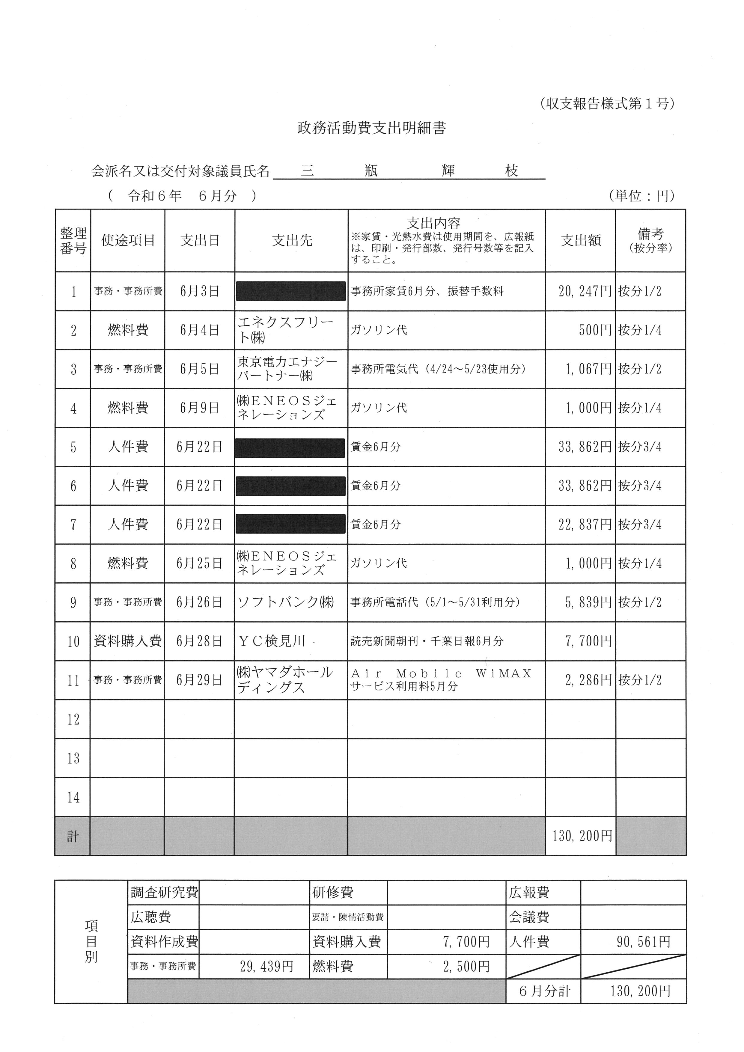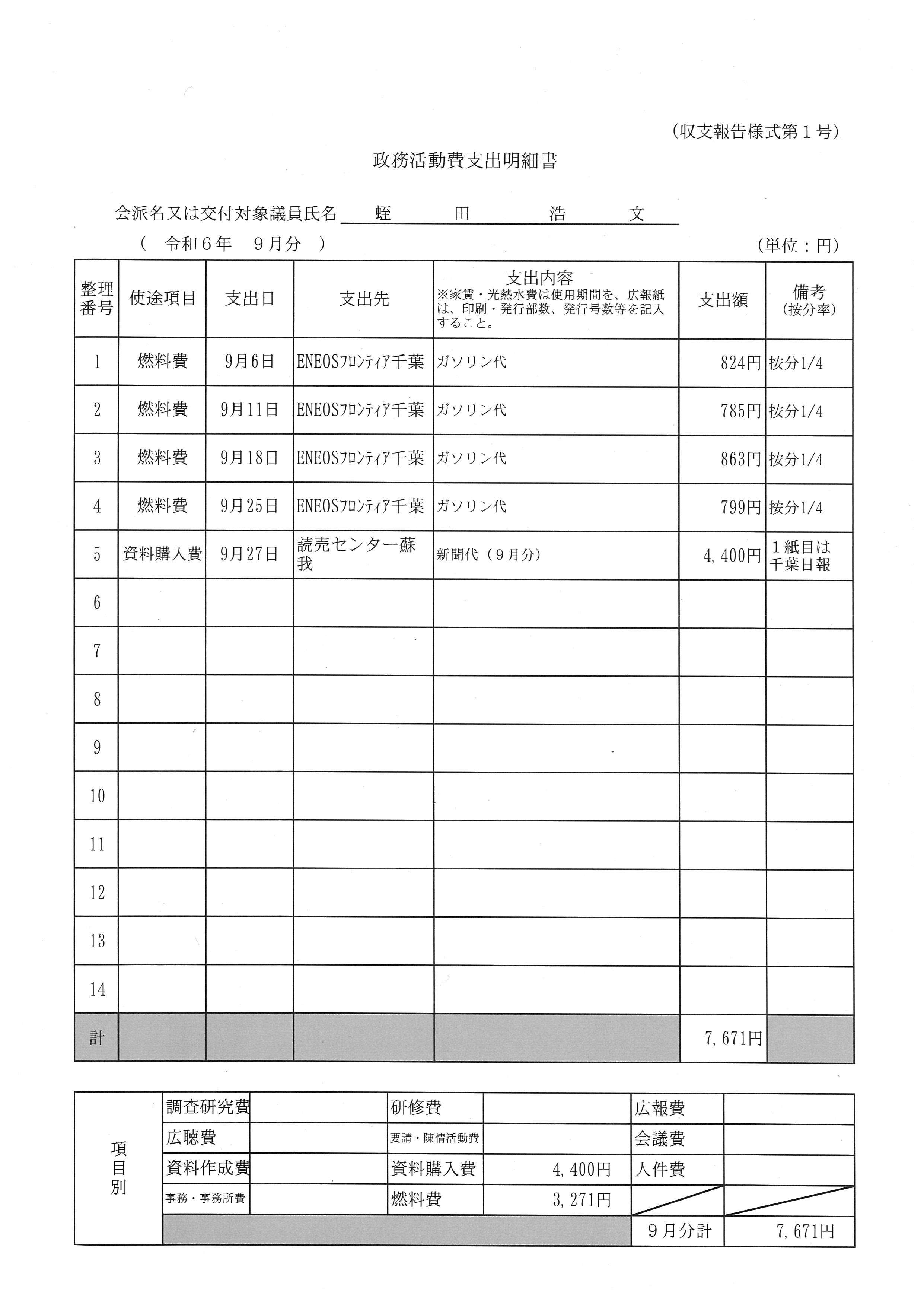 千葉市議会トップページ > 広報・情報公開 > 政務活動費 > 令和6年度交付分(政務活動費収支報告書)