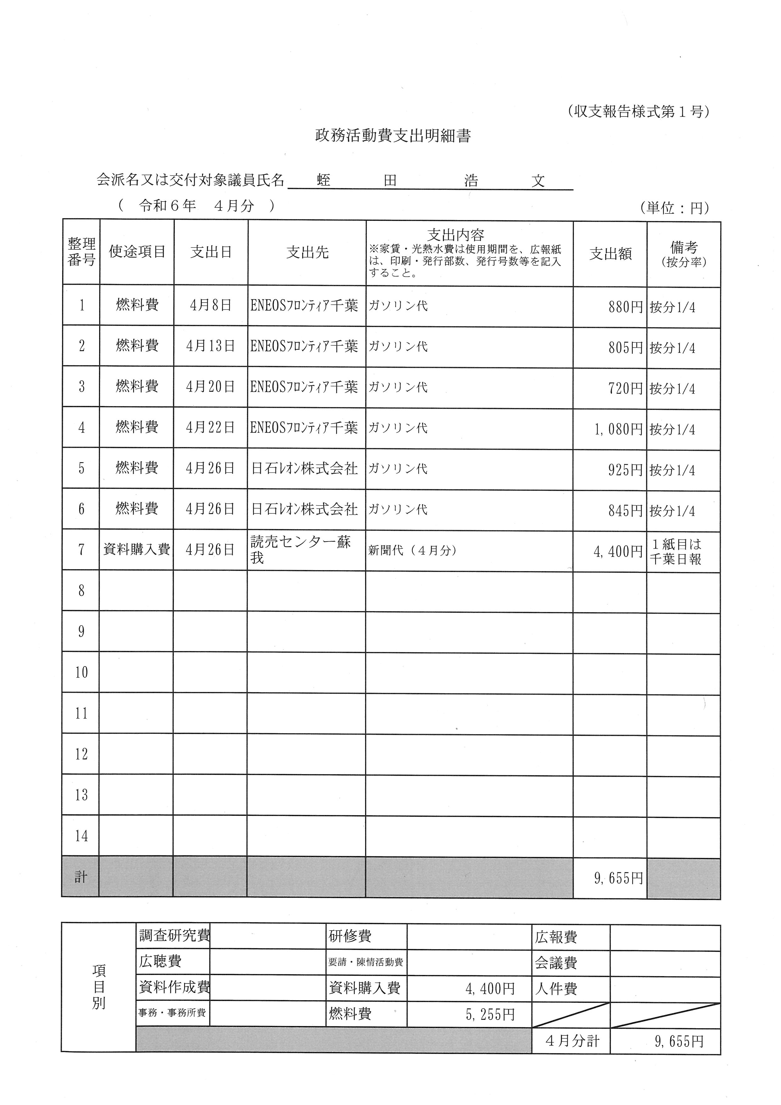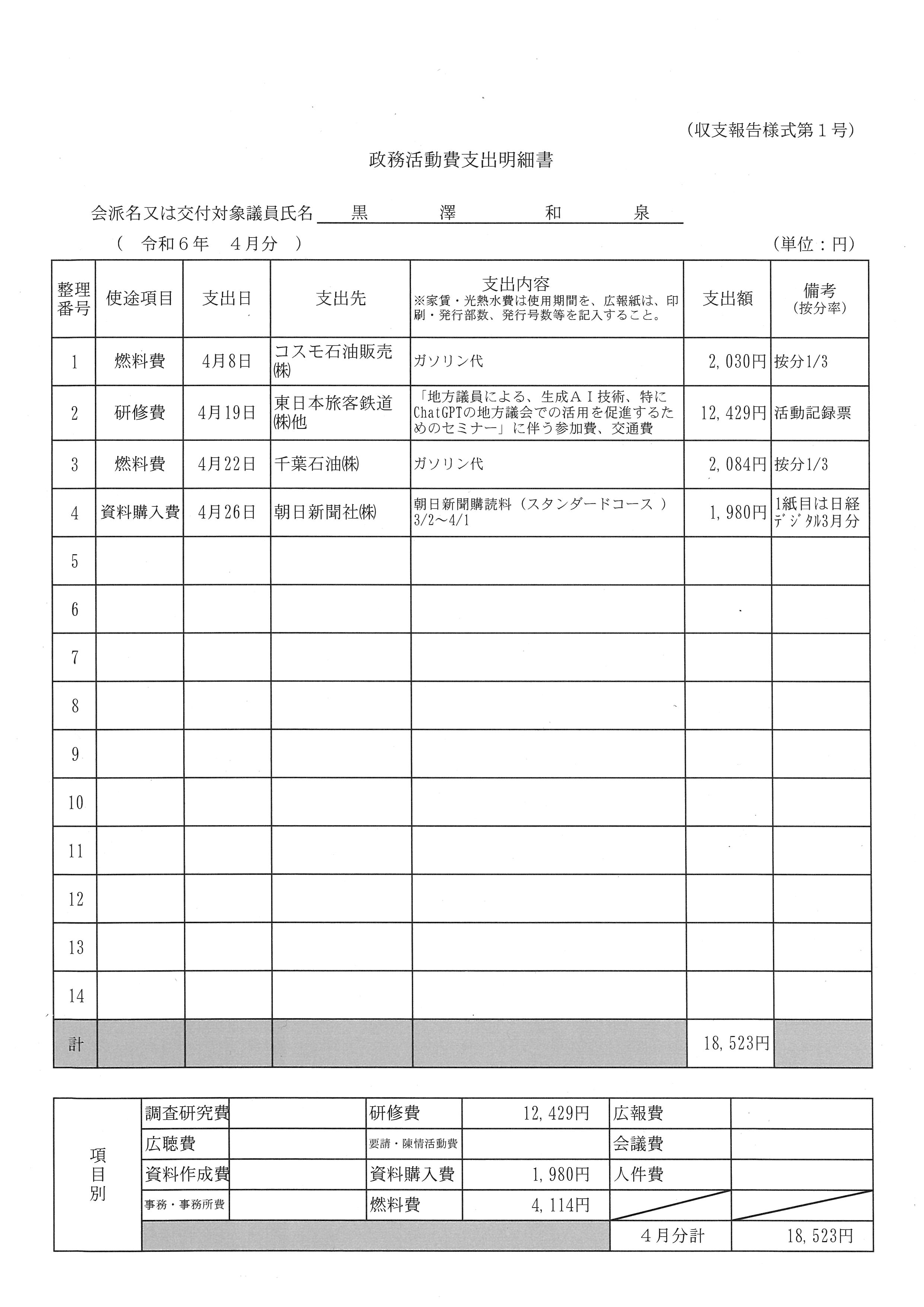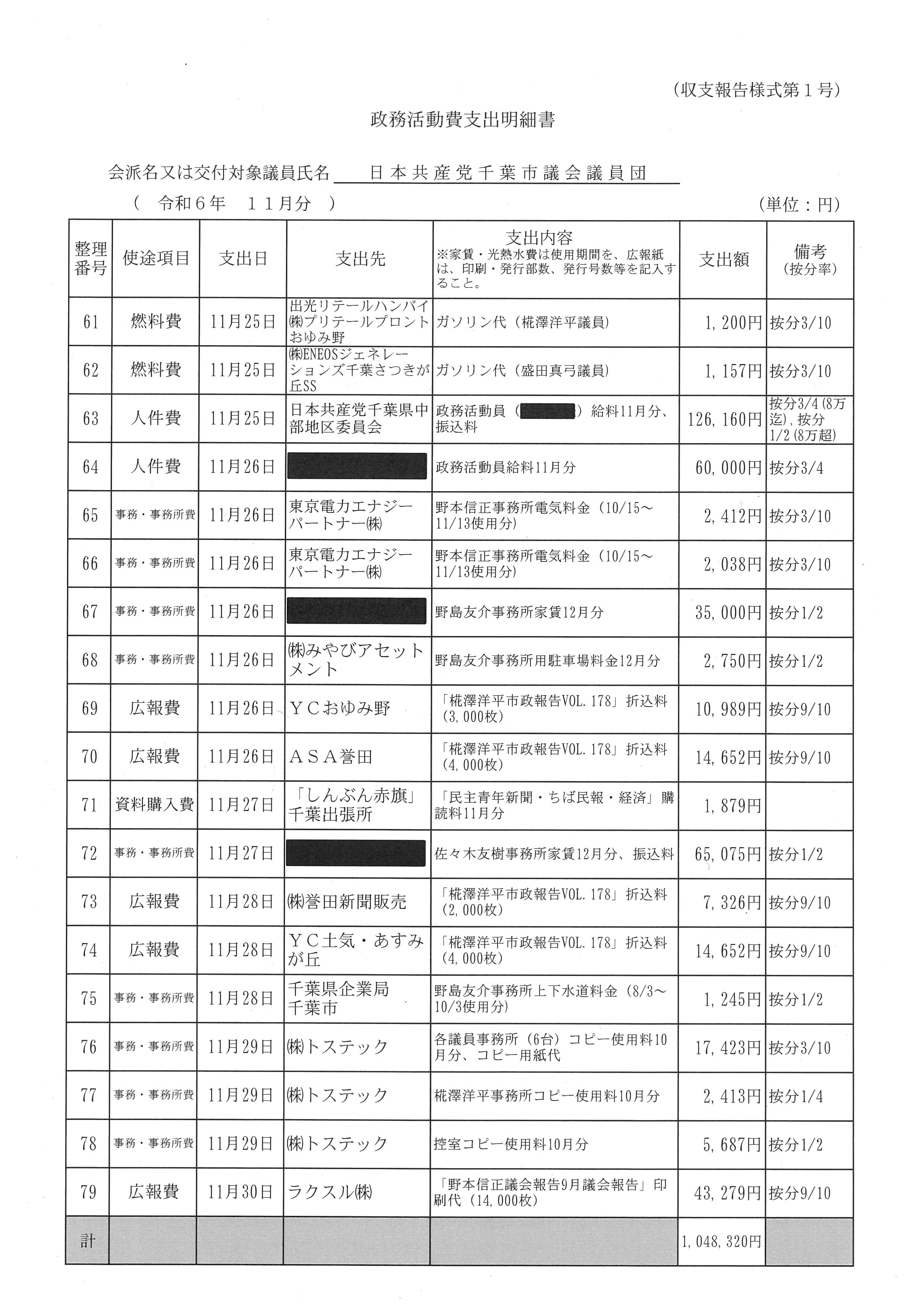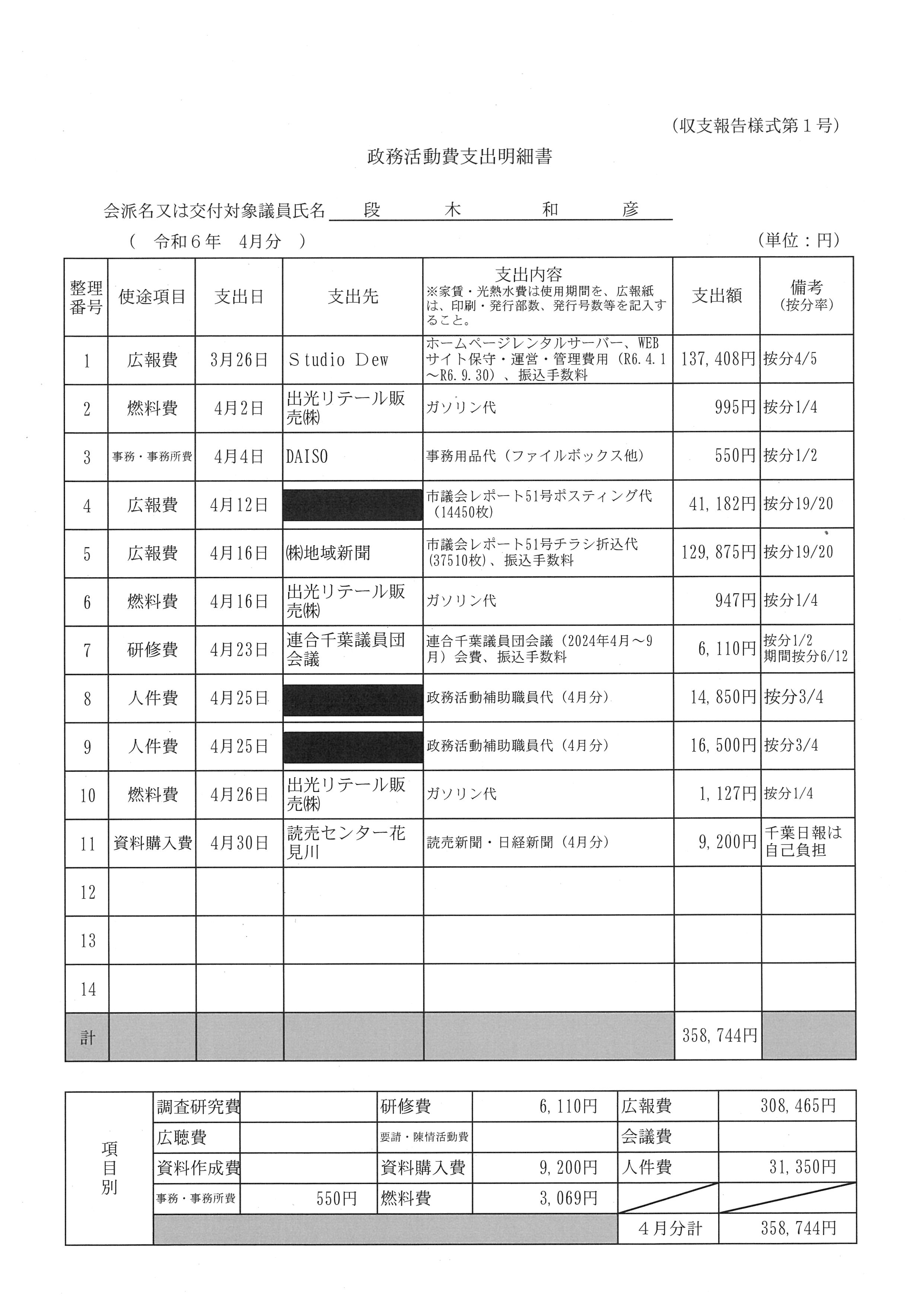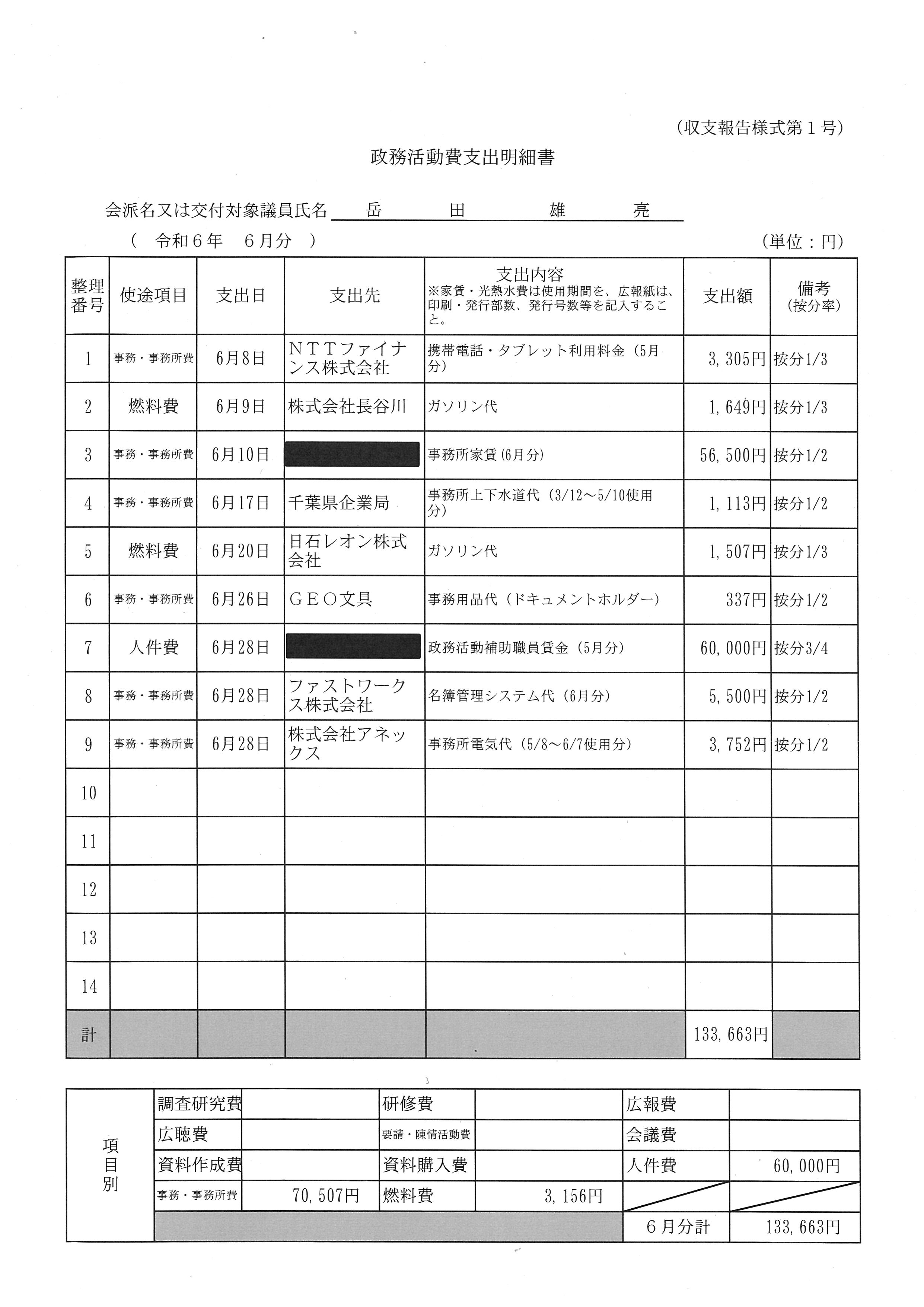 千葉市議会トップページ > 広報・情報公開 > 政務活動費 > 令和6年度交付分(政務活動費収支報告書)
