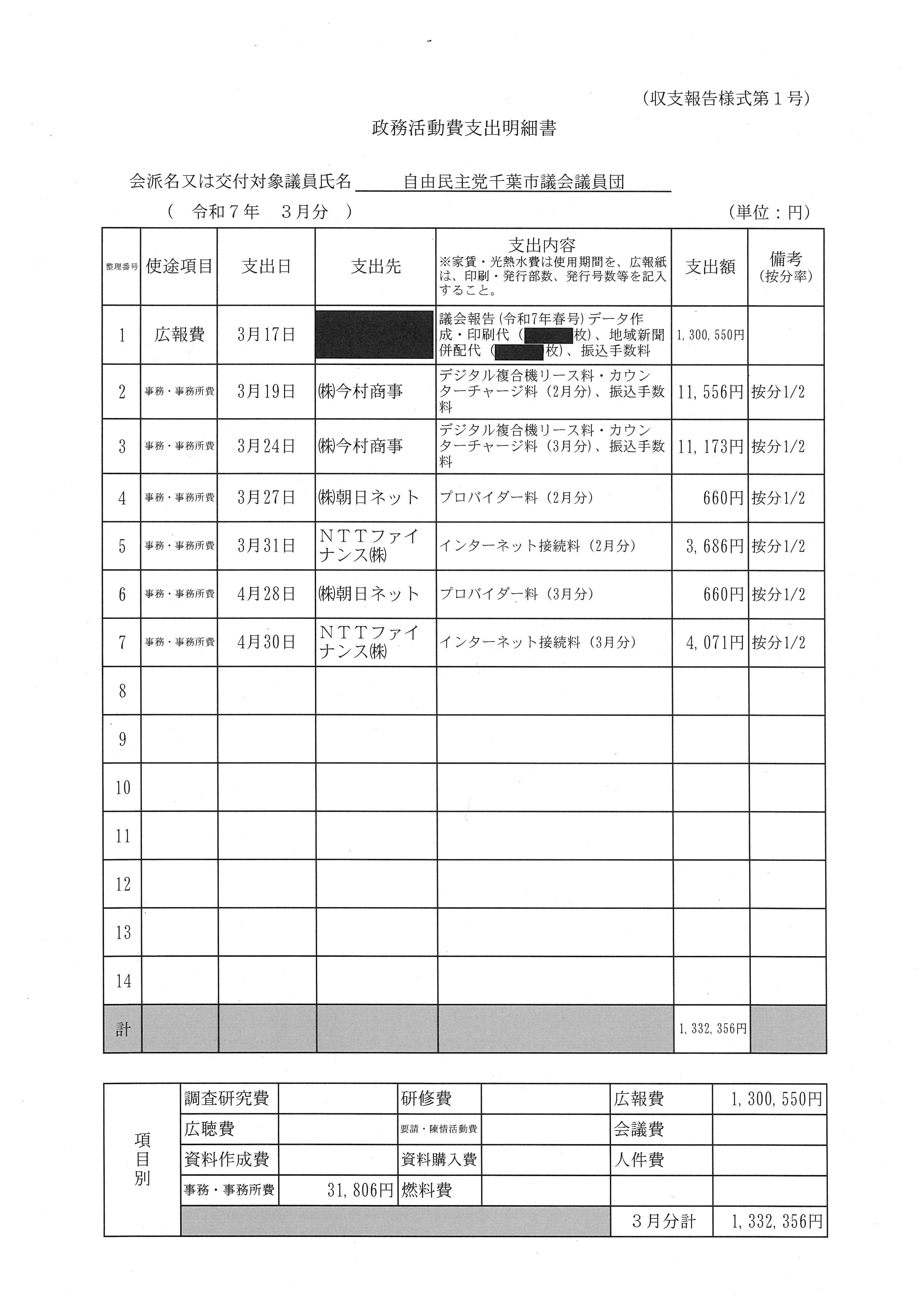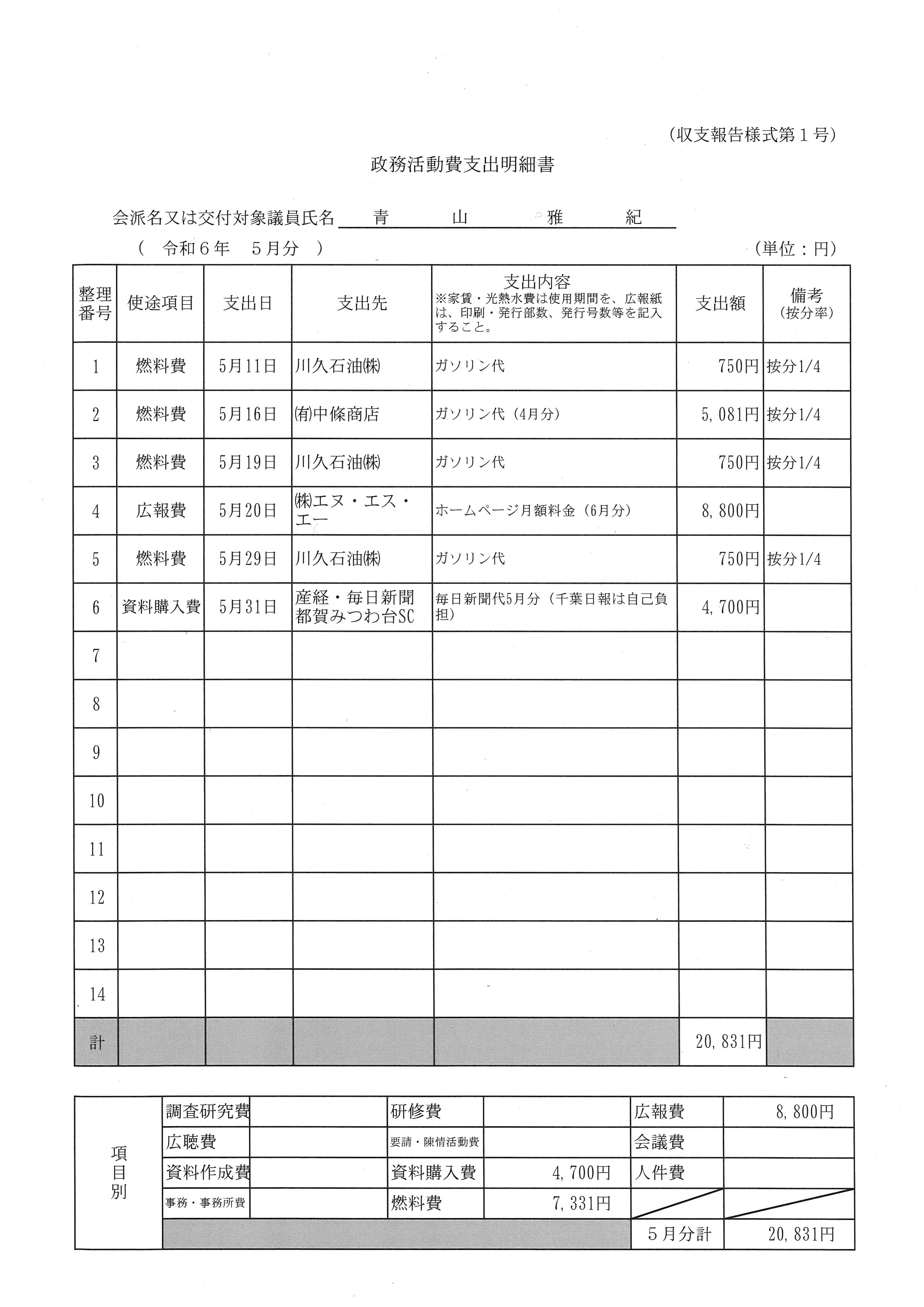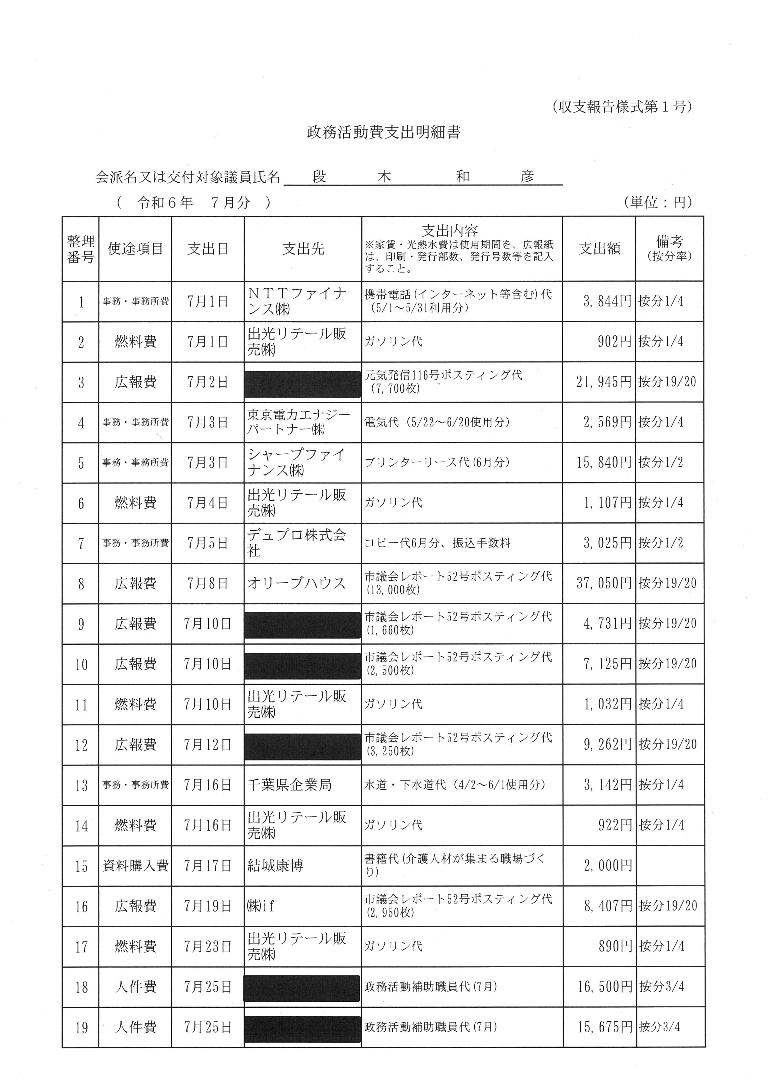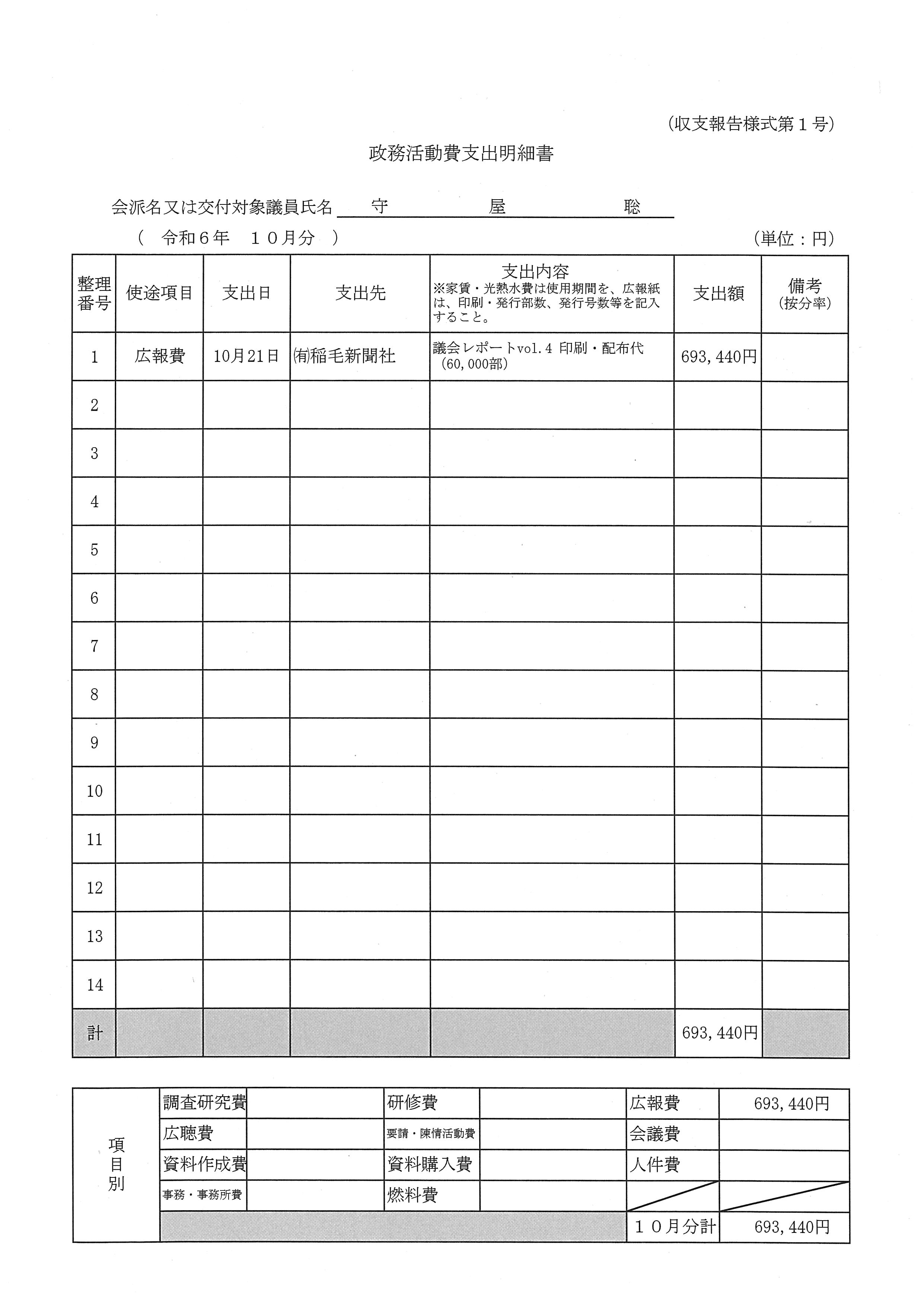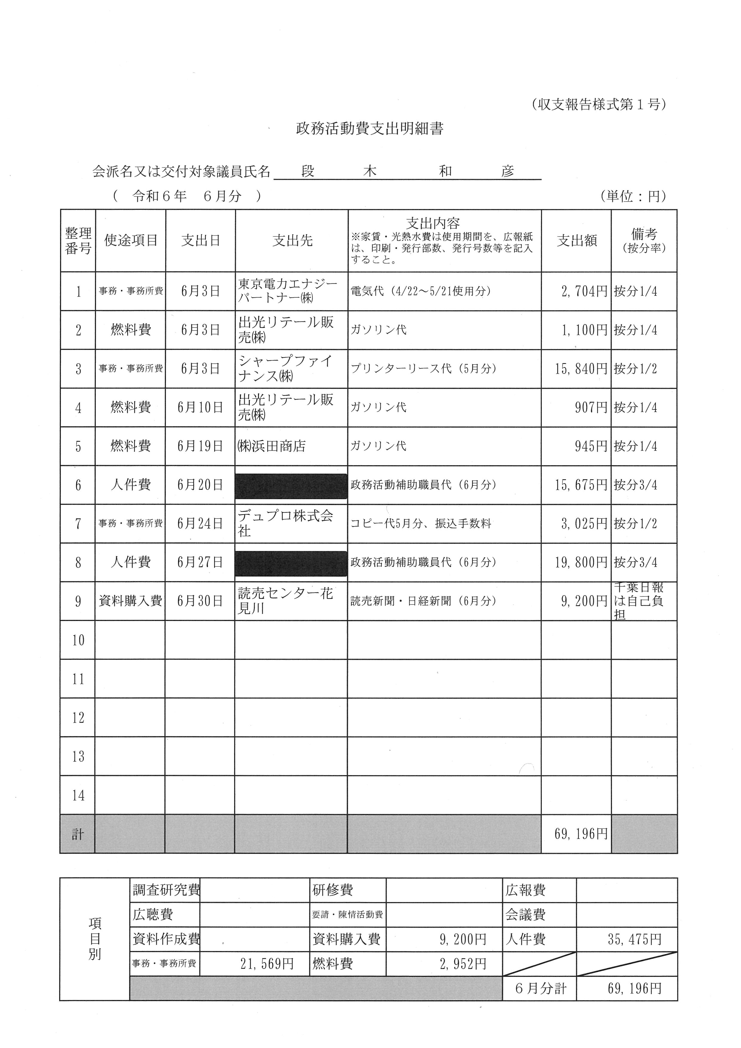 千葉市議会トップページ > 広報・情報公開 > 政務活動費 > 令和6年度交付分(政務活動費収支報告書)